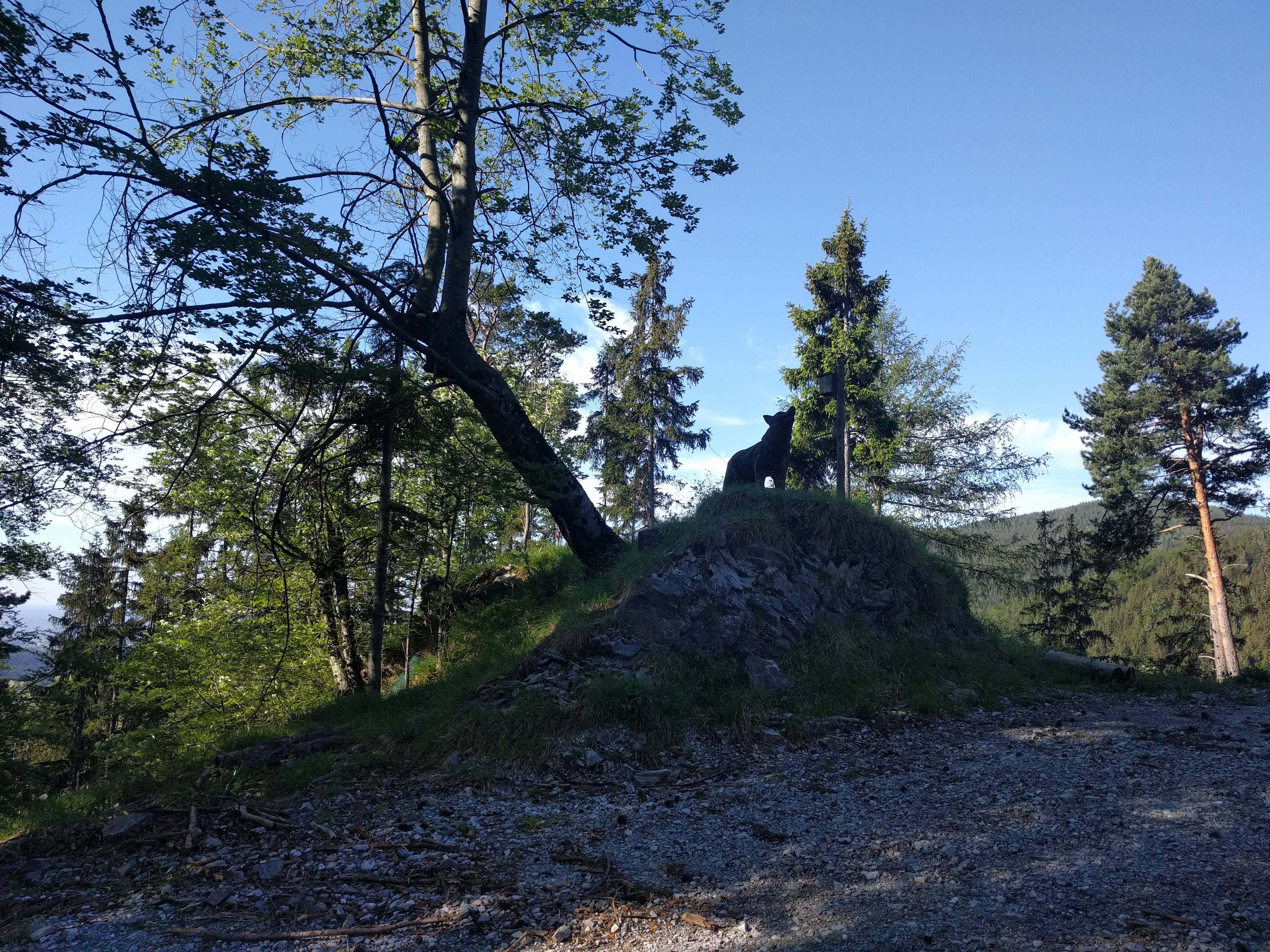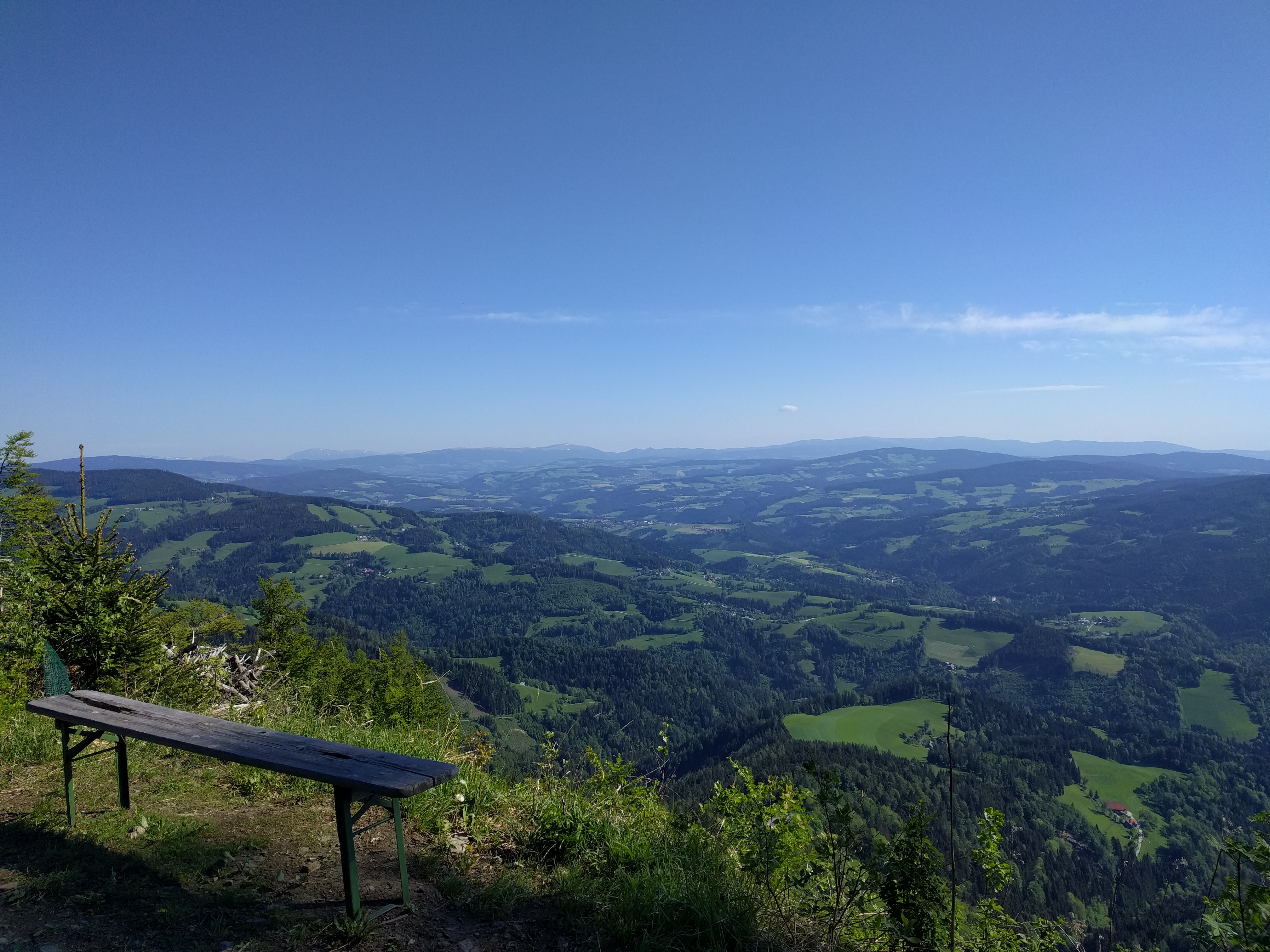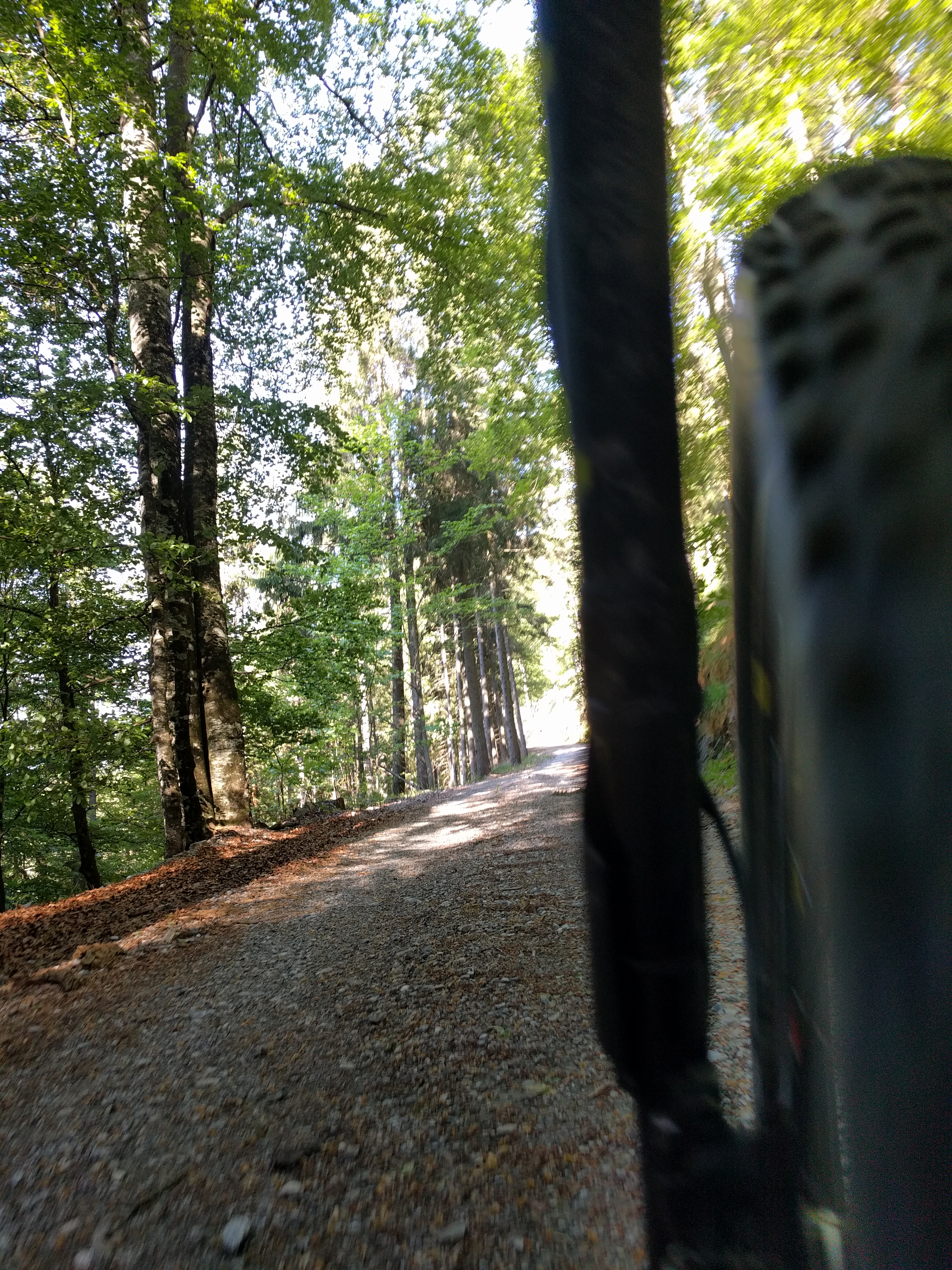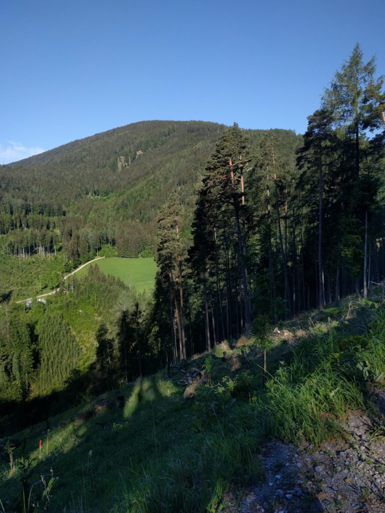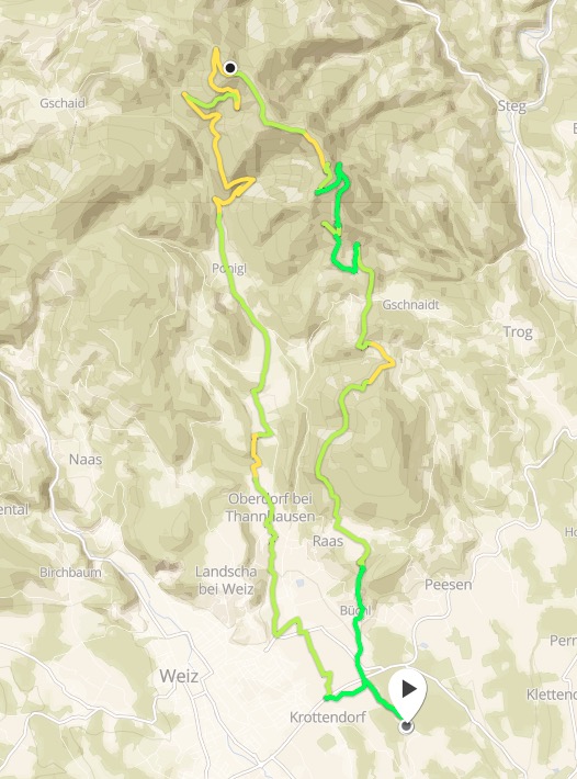 Ich bin über die herrschaftlichen Gründe, beim Forsthaus in Ponigl vorbei gleich rechts hinauf Richtung Jagdhütte. Vorbei am „Wolf“ zum Zetz. Runter dann den ersten Teil über die Forststrasse und dann ein Stück auf dem Steig und ein kurzer Verhacker bei einer der Forststrassen, weil dort holzgeschlägert wurde. Also wieder zurück auf den Steig hinunter zum Wittgruberhof. Von dort um den den Raas (nicht zum Gipfel) und nicht gleich runter ins Tal sondern über den büchler Kalvarienberg die steilste Strasse zurück nach Büchl und heim. Eine feine Abfahrts-Variante wie sich herausstellte, wenn man vom ganz steilen Asphalt-Stück absieht. Da werde ich das nächste Mal Richtung Thanhausen runterfahren, das macht mehr Spass.