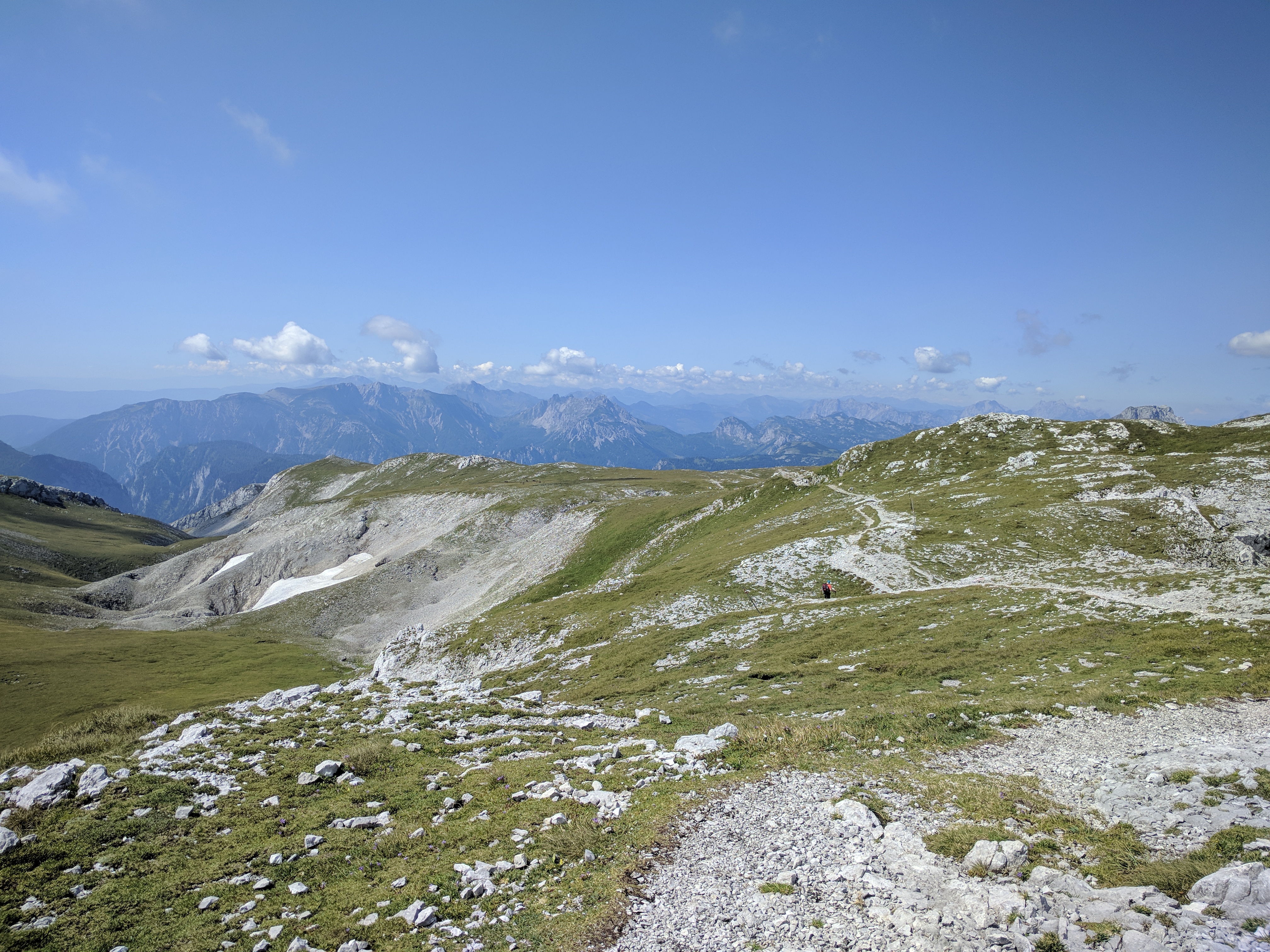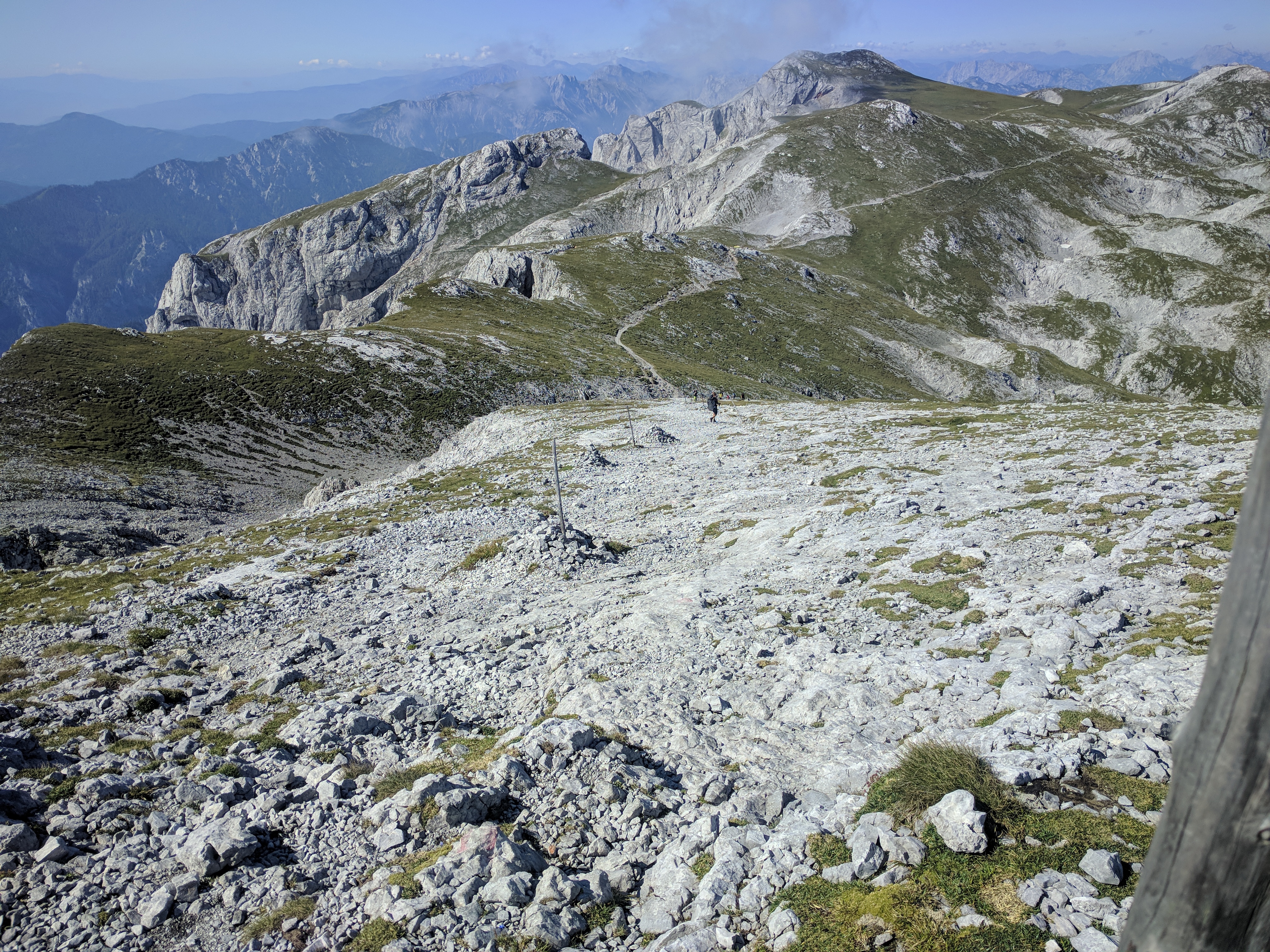 Nach dem Hutkogel geht es steil und schottrig hinunter in das Ochsenreichkar und von dort die letzten 500 Höhenmeter hinauf zum Schiestlhaus. Das Tragen hinauf geht viel besser als gedacht, aber es kostet Kraft. So machen wir auf knapp 2000 Meter am Bergrücken nochmal eine ausgiebige Rast, trinken Kaffee und essen Bens herrliche Butter-Käse-Brote mit Hartwürstel. Oben am Kamm setzt sich eine Gams hin und beobachet uns. Wir füllen unsere Energiereserven mit Sonnenergie, Genuss und Ruhe, dann gehts weiter.