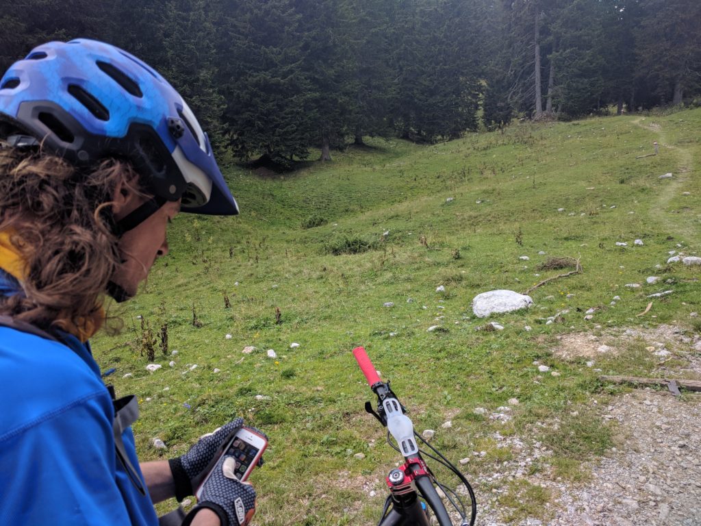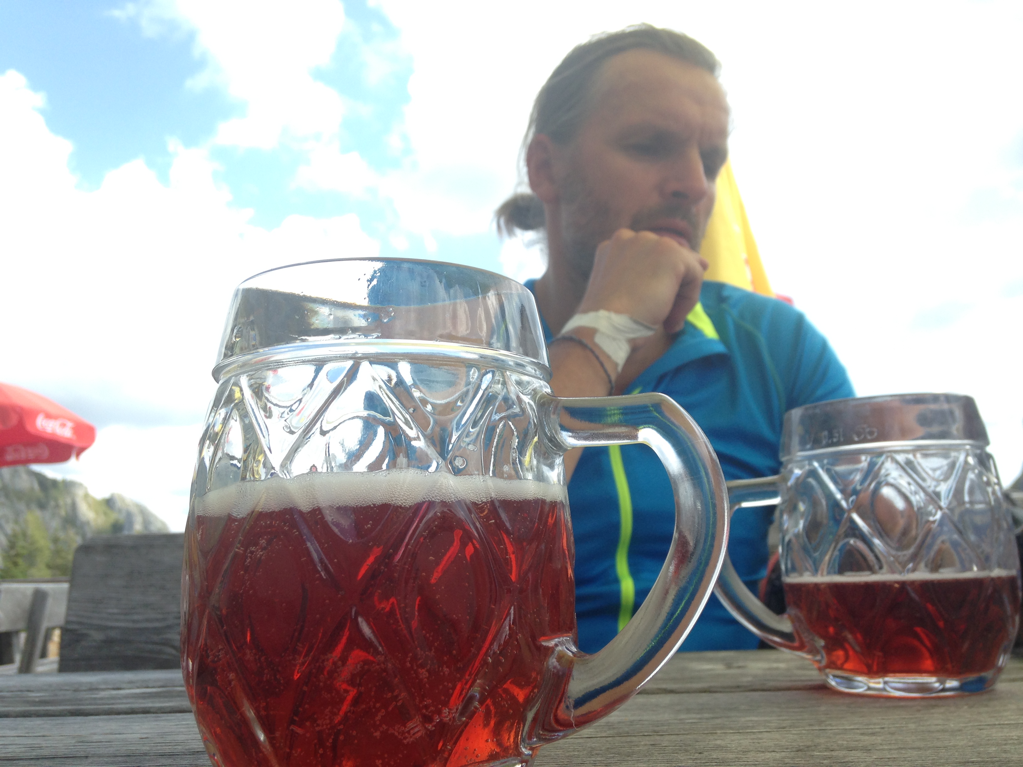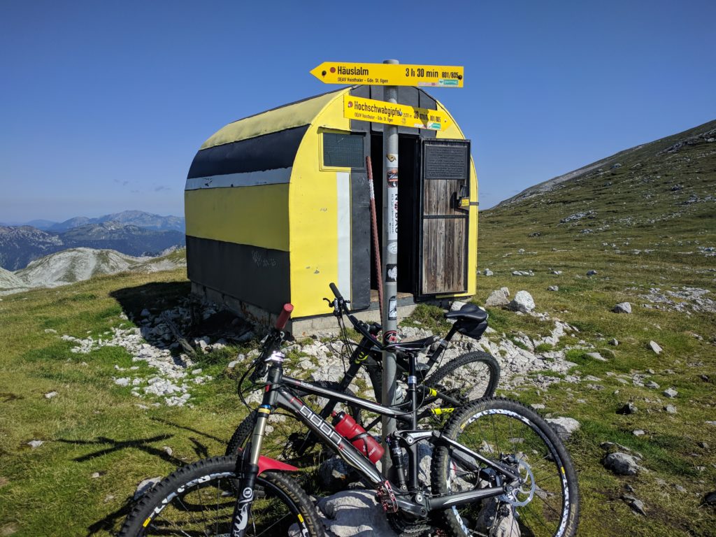 Bei der Häuslalm empfängt uns die Zivilisation wieder. „Passts auf, dass euch die Jäger nicht erwischen“ … Bisher waren alle Reaktionen auf die Räder am Berg mit Augenzwinkern und positv, die Stimmung ändert sich ein wenig. Nach einem alkoholfreien Radler fahren wir hinüber zur Sonnschienalm und wählen wieder den Wanderweg.