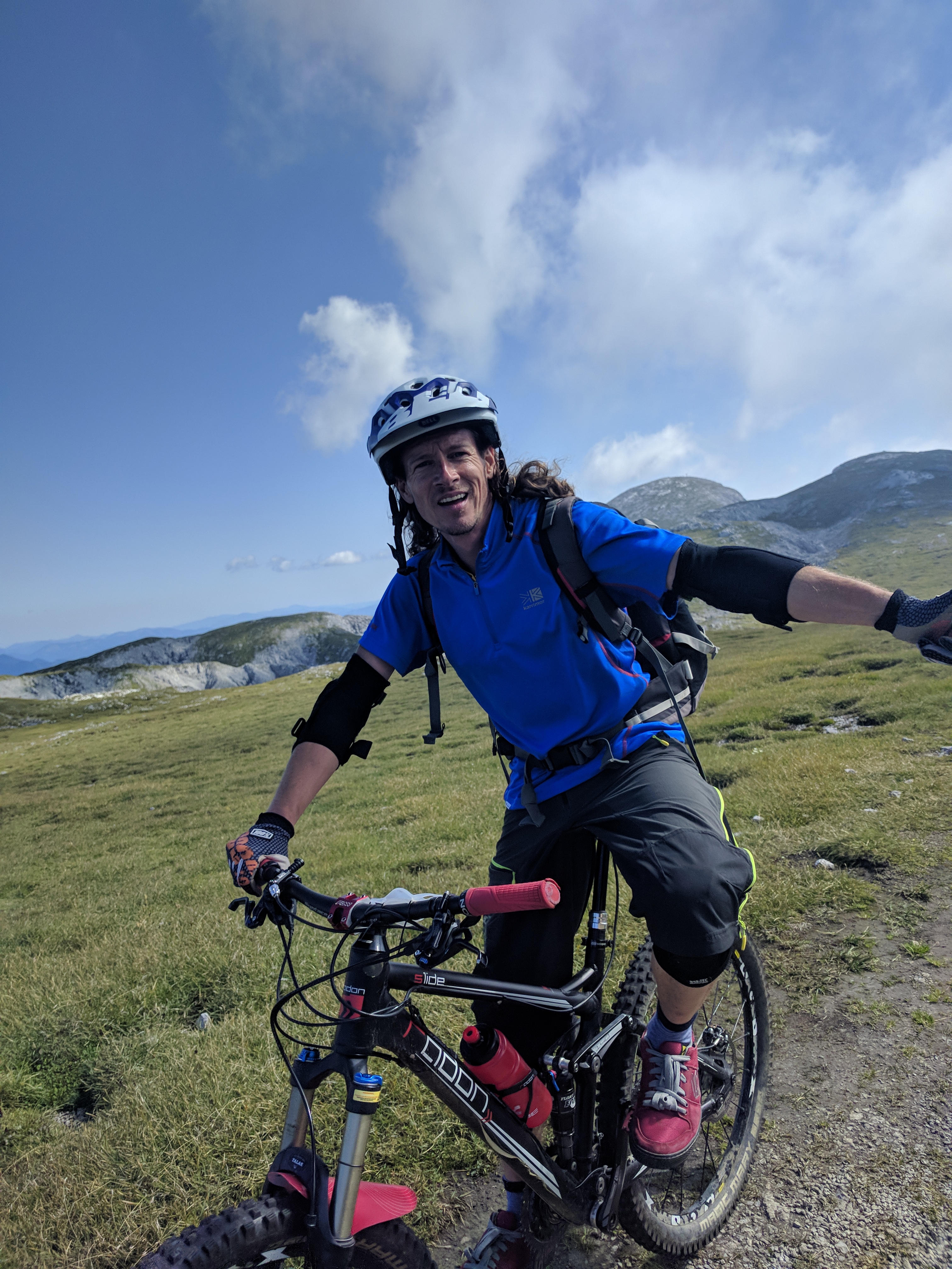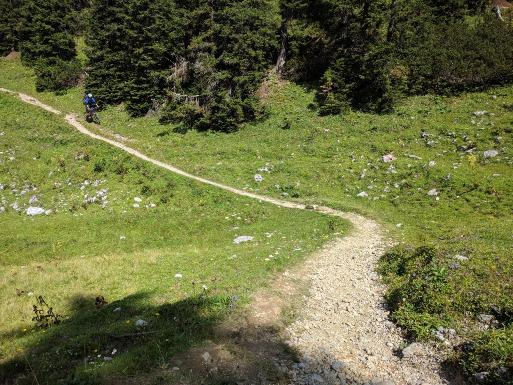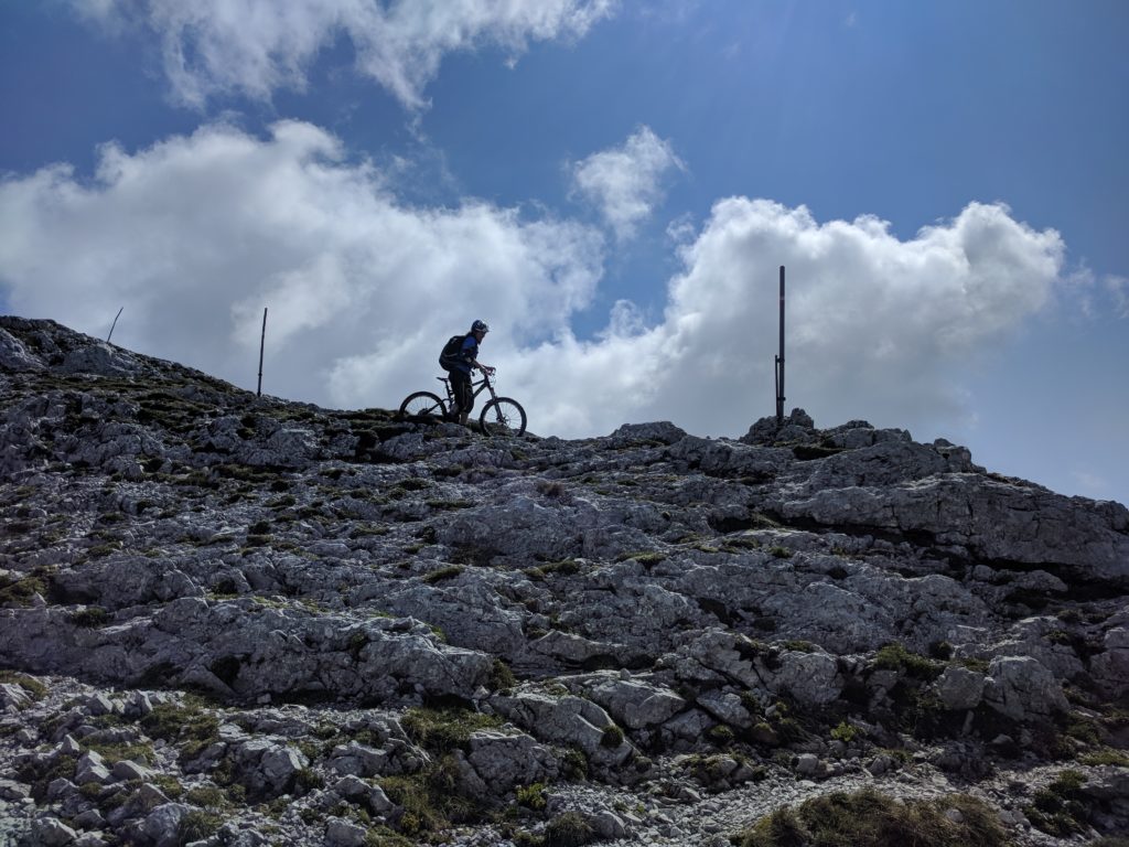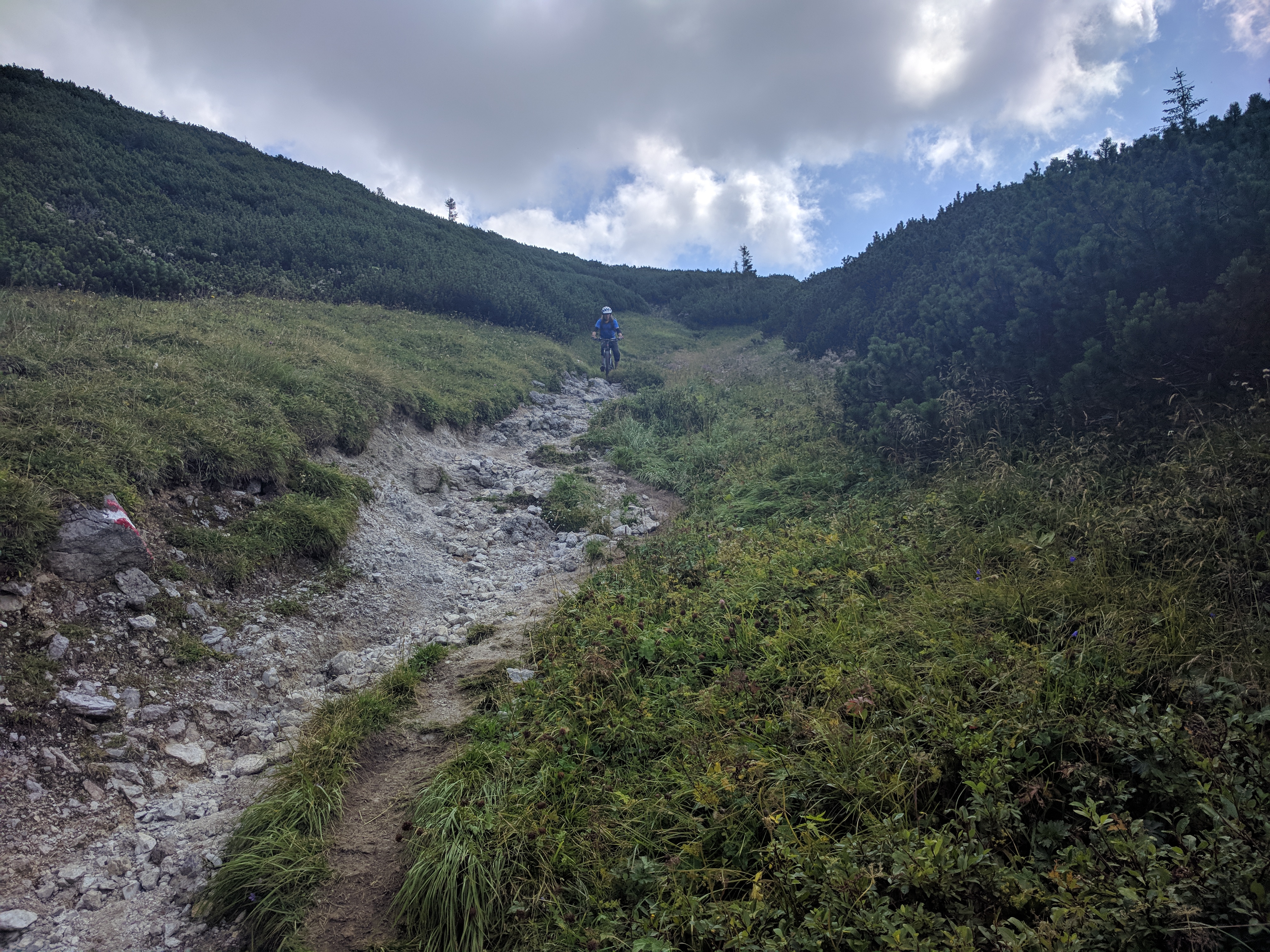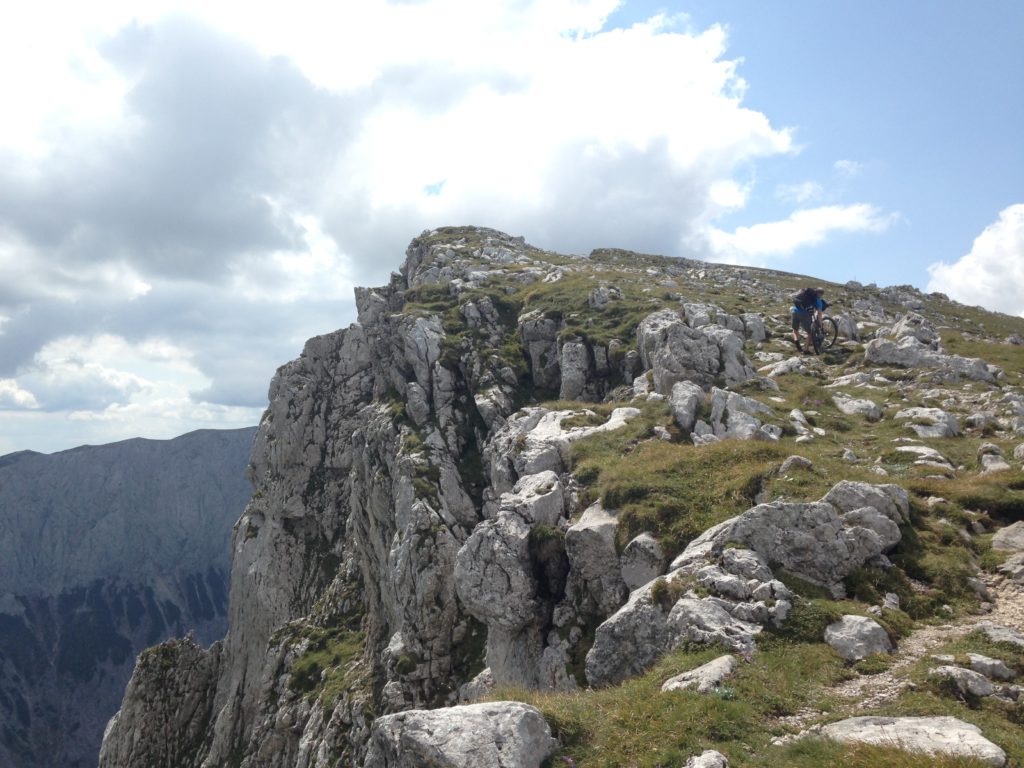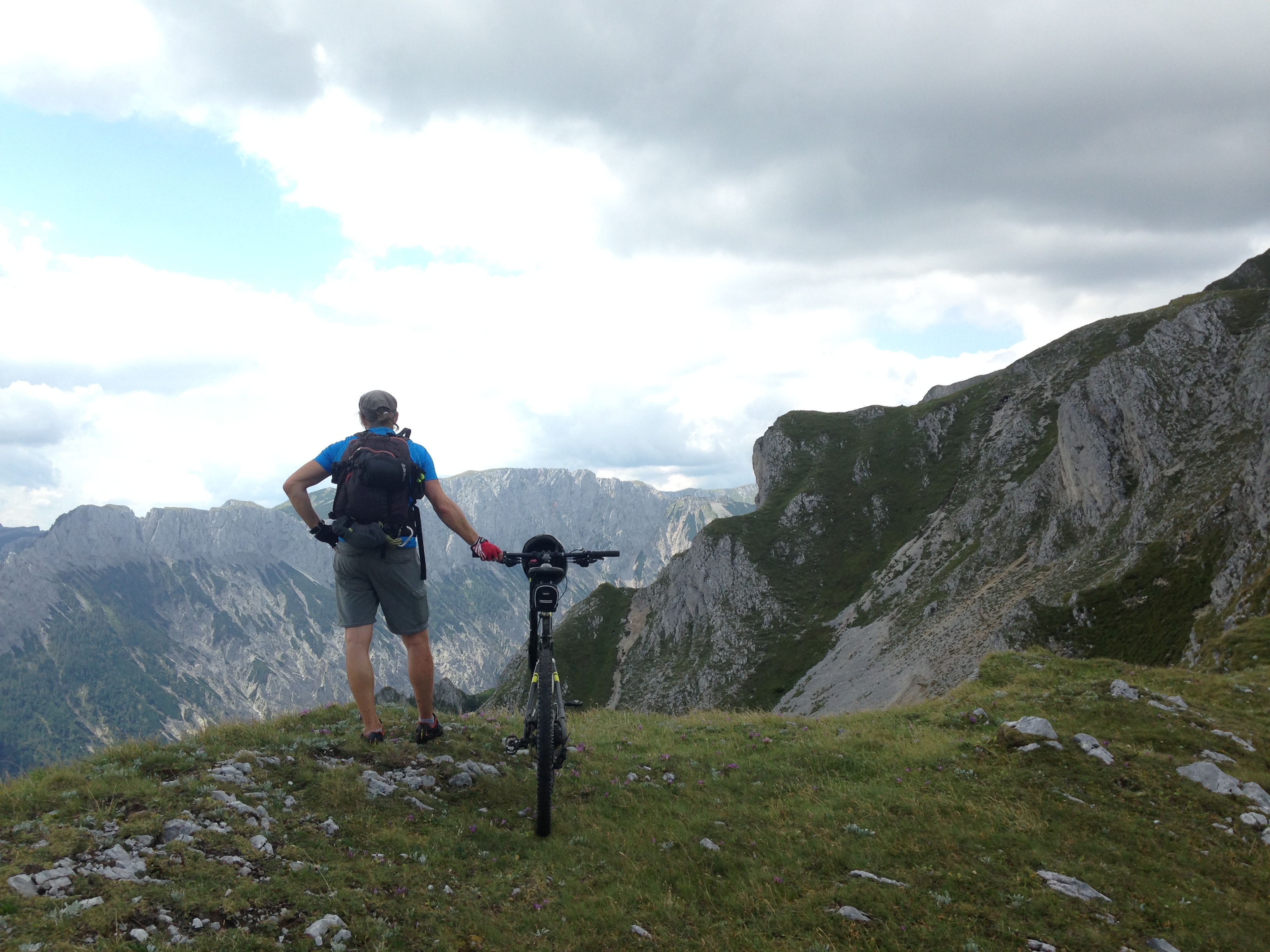 Von dort geht es über die genialen Trails hinüber bis zum Häuslgraben. Den Großteil fahren wir und haben eine Menge Spass. Es ist enorm was sich mit der gestrigen Erfahrung entwickelt hat: Steiler rauf, steiler runter, mehr Kontrolle und jede Menge Lust auf mehr. Wieder sehen wir eine Menge Steinböcke und geniessen das Panorama.