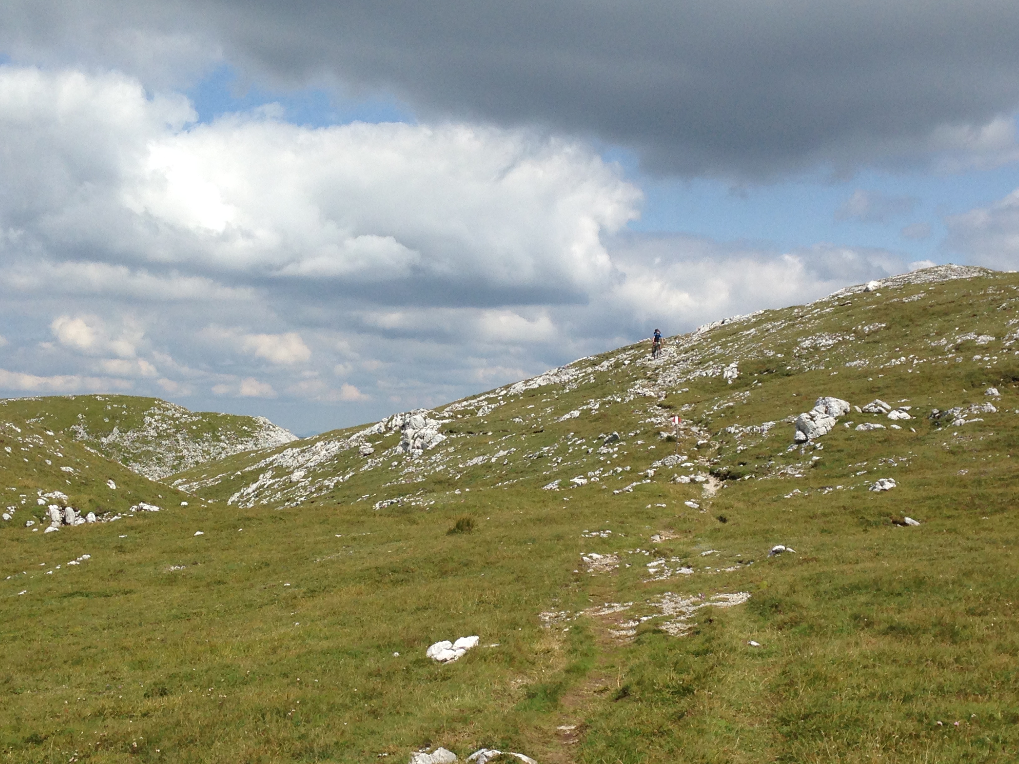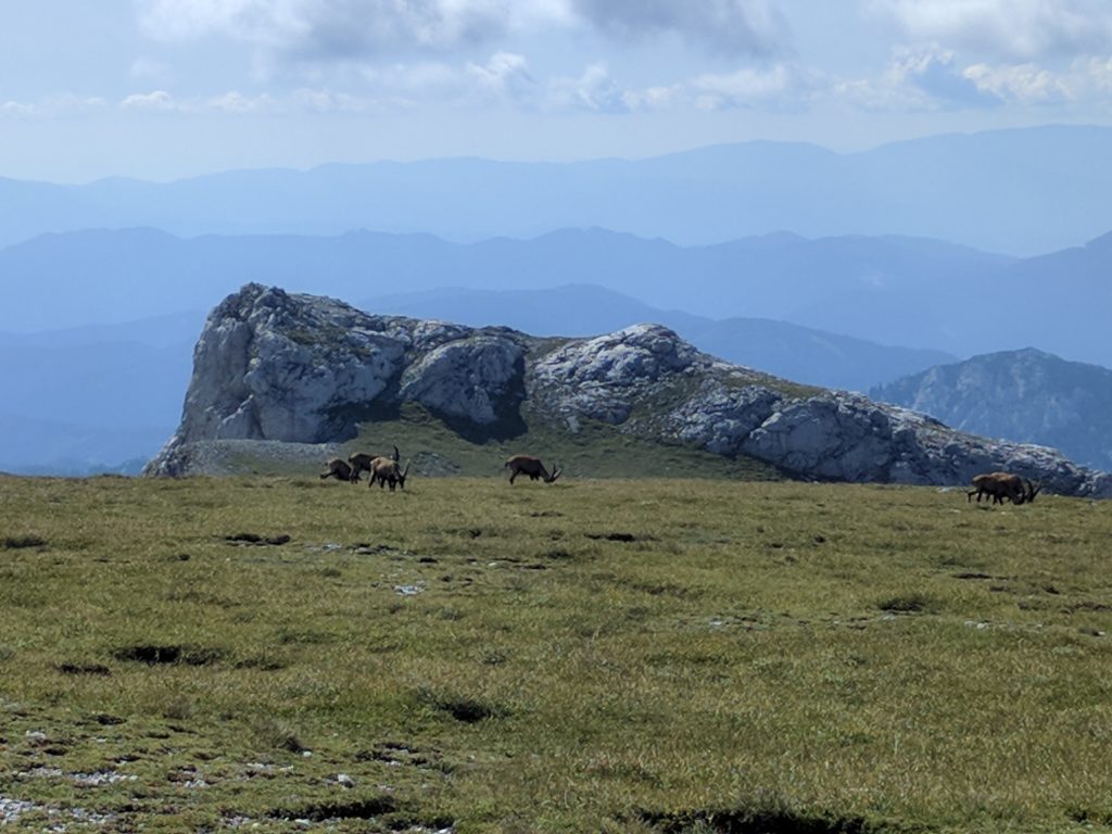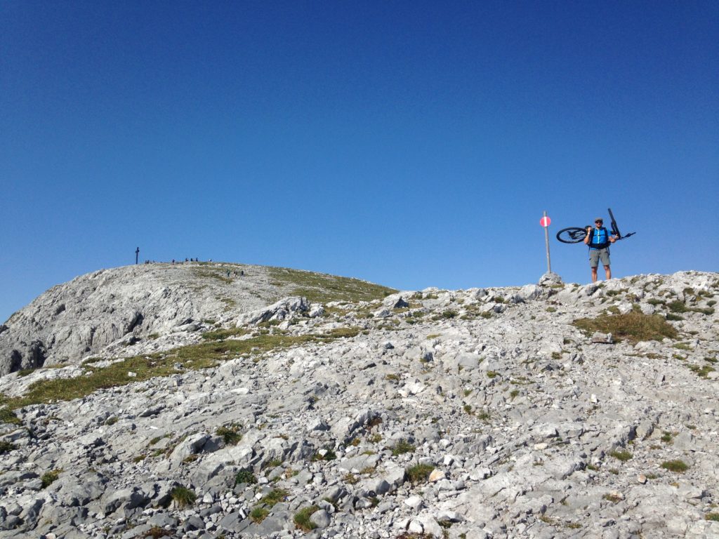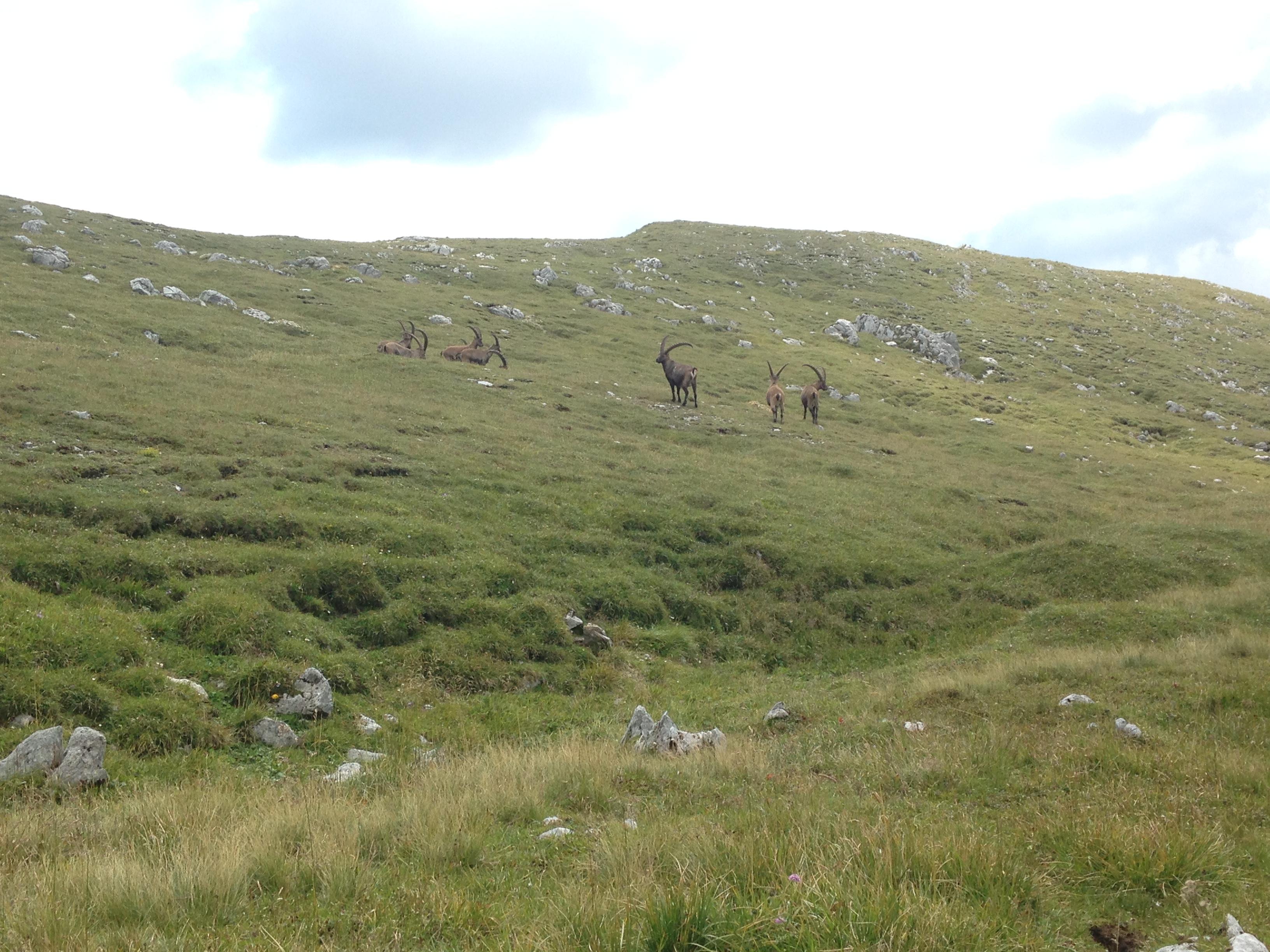 Von dort geht es in langezogenen Auf- und Abstiegen vorbei an der Hohen Weichsel und am Ringkamp. Auf dem Weg finden wir noch die Kühe, die der Senner von der Graualm schon vermisst und schreiben ihm ein SMS ;-). Ich bin voll motiviert und versuche bis zum Anschlag hochzufahren, was enorm Kraft kostet und mir eine heftigen Krampf im Oberschenkel beschert, der eine Pause zwischen Steinböcken und im herrlichen Panorarma des Hochschwabs mit sich bringt.