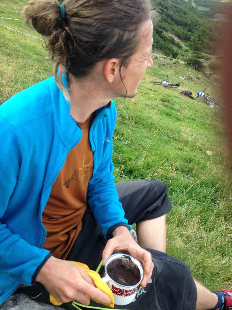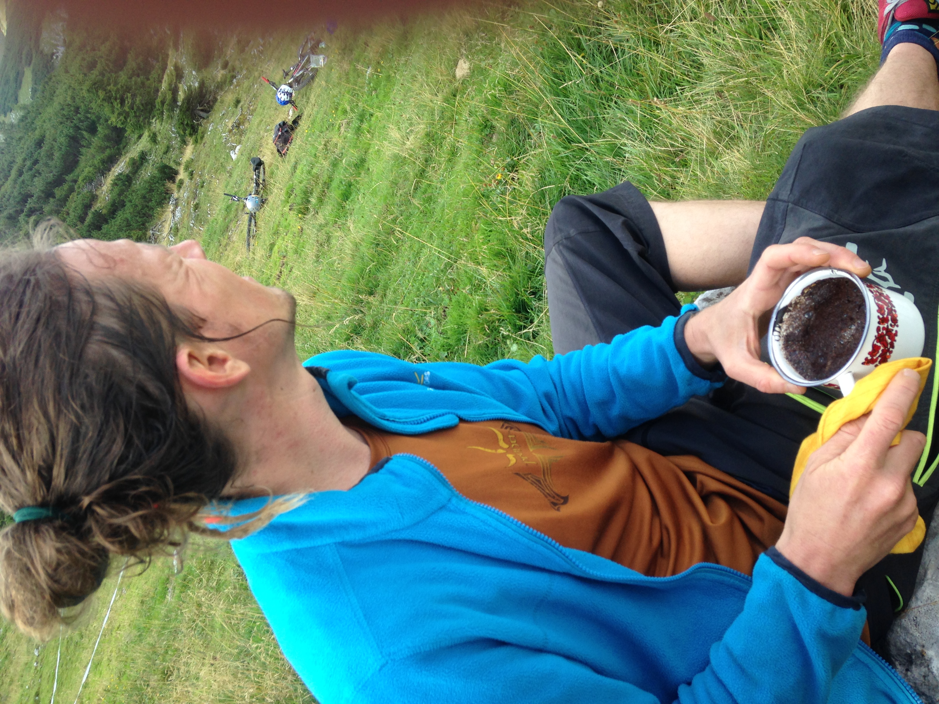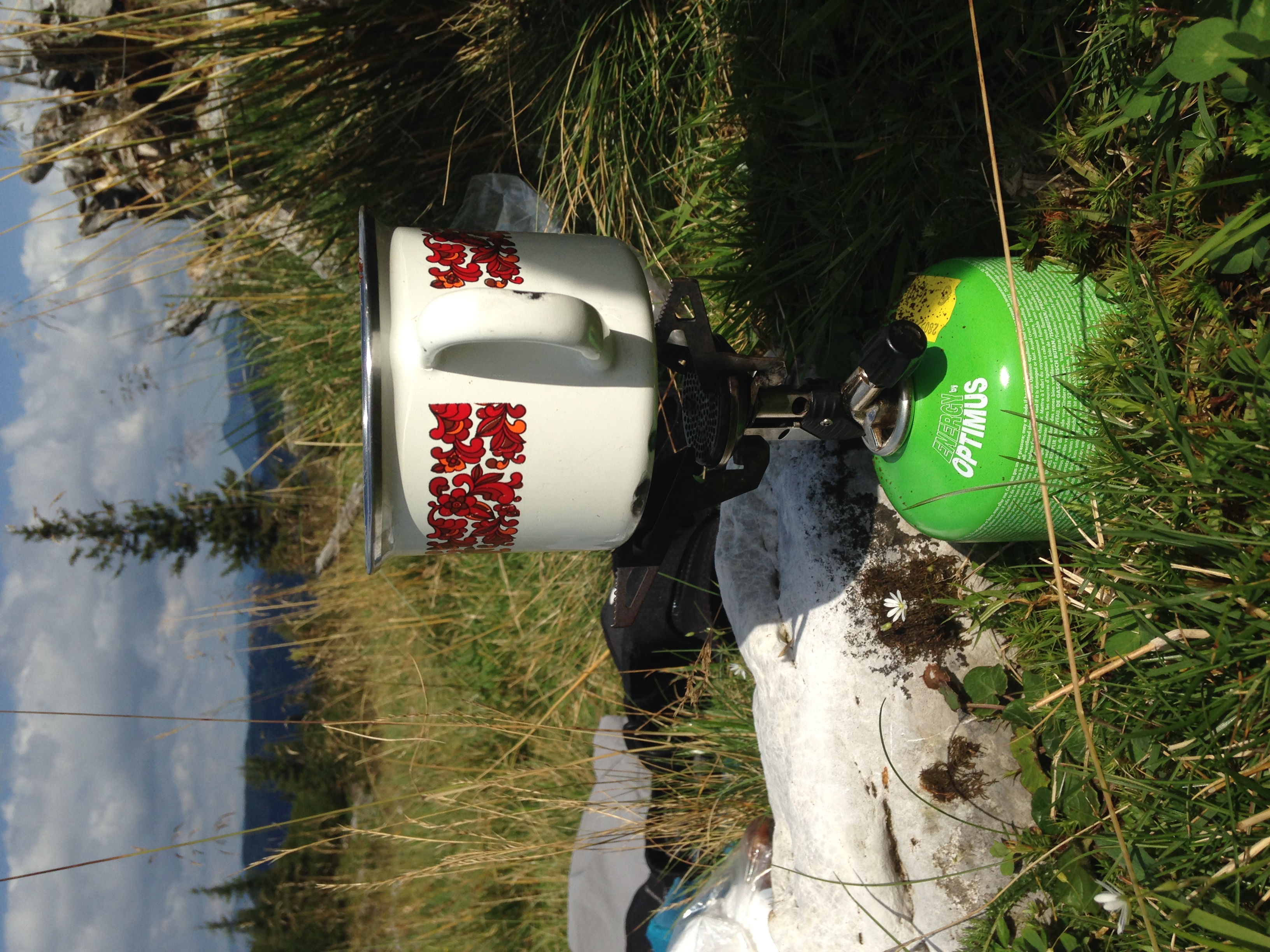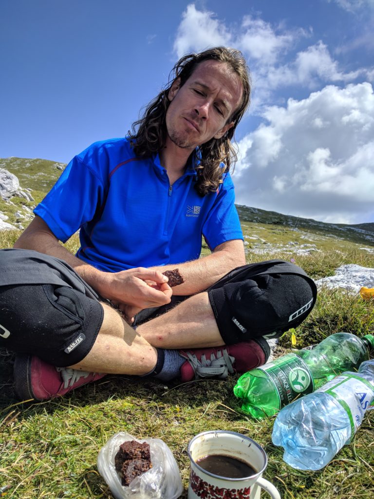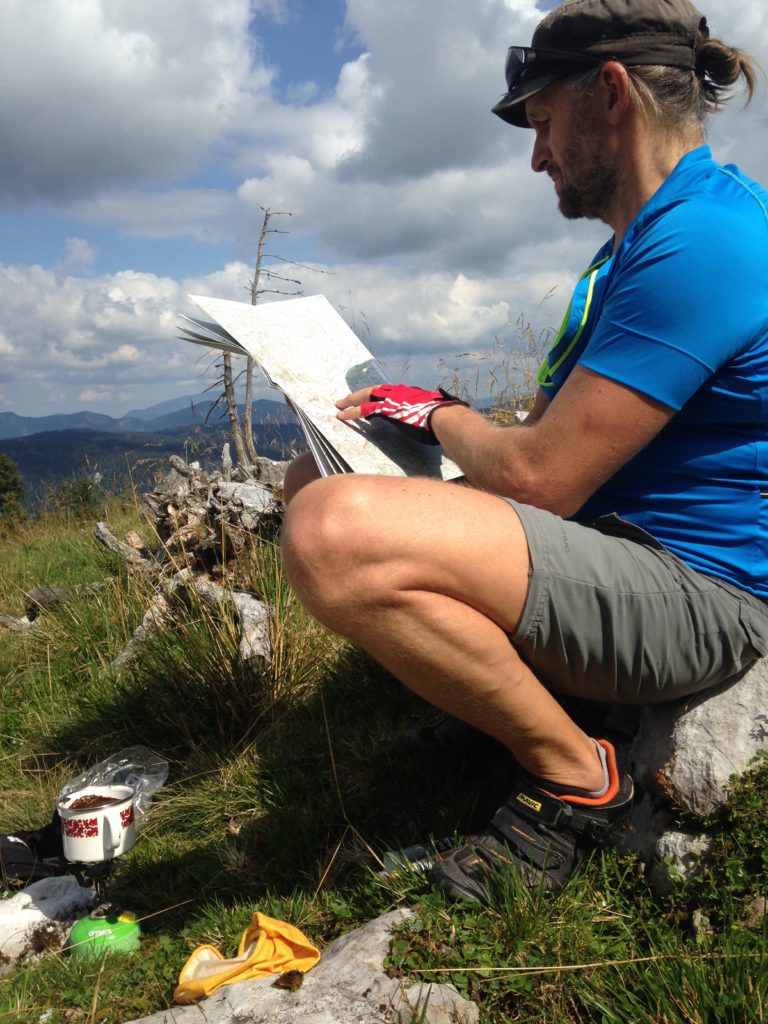 Kurz vor dem Prinzensteig machen wir einen erste Rast und Ben serviert frischen türkischen Kaffee und wir essen beste selbstgemachte Müslikekse (von Marie-Theres). Dann geht es die ersten Tragepassagen durch die beengenden Latschen hinauf zum Grat.