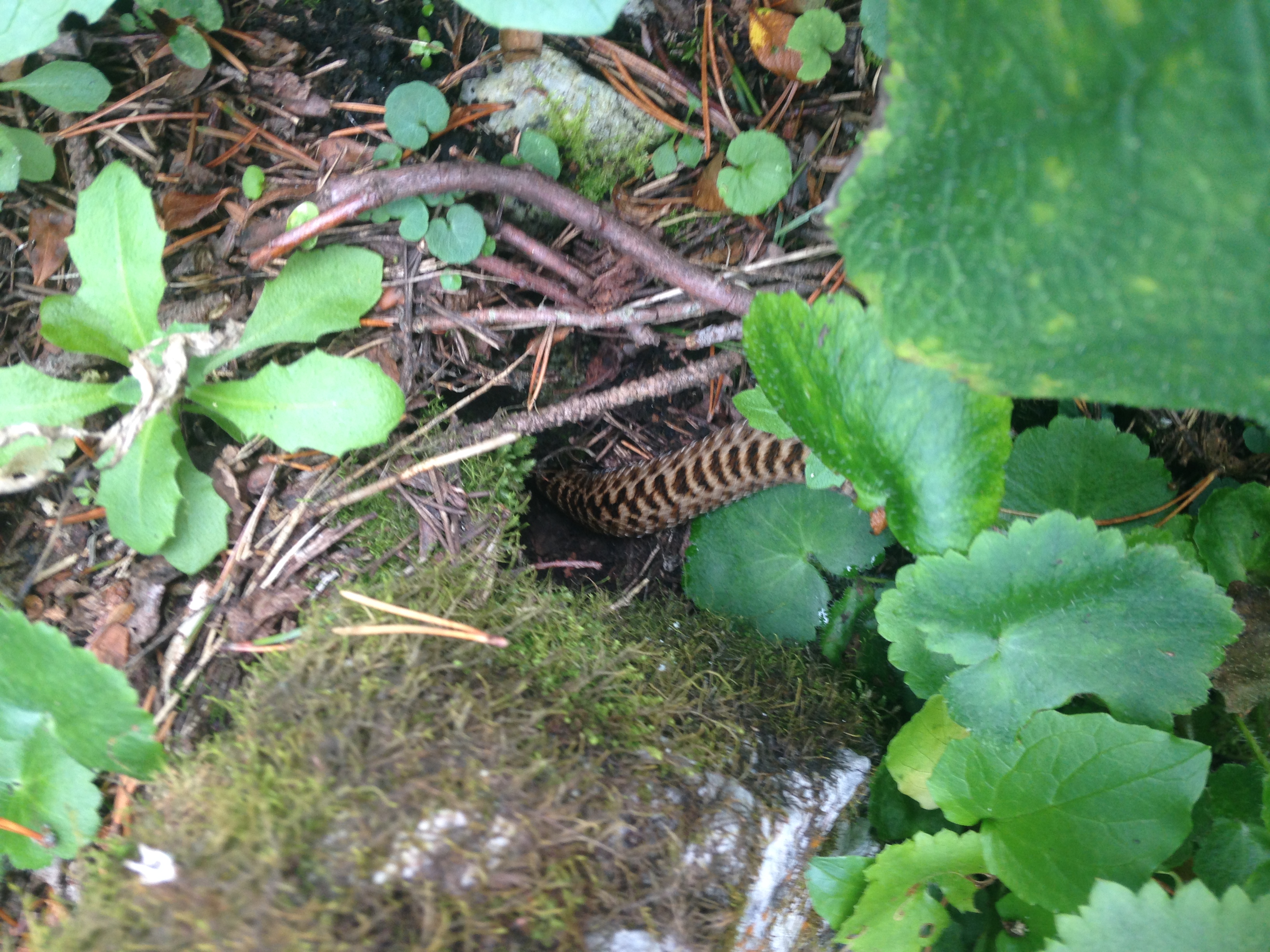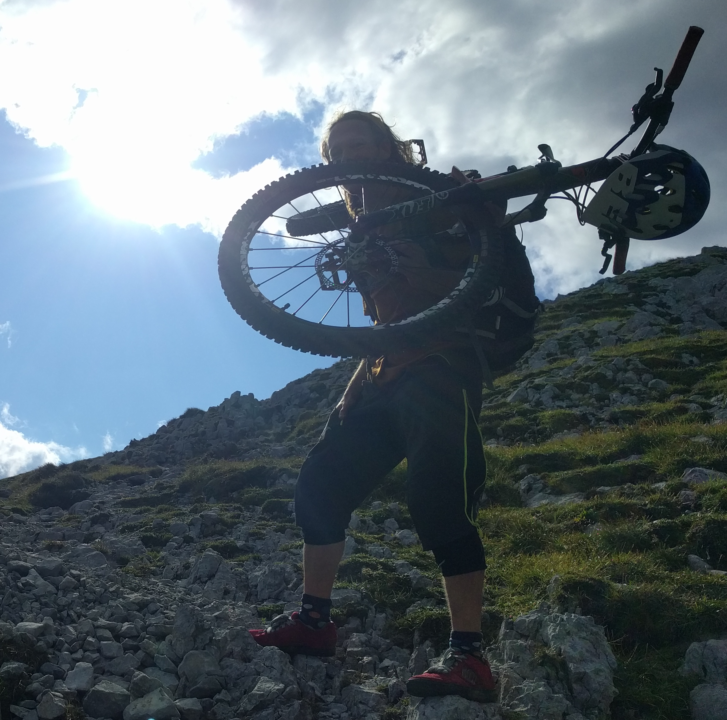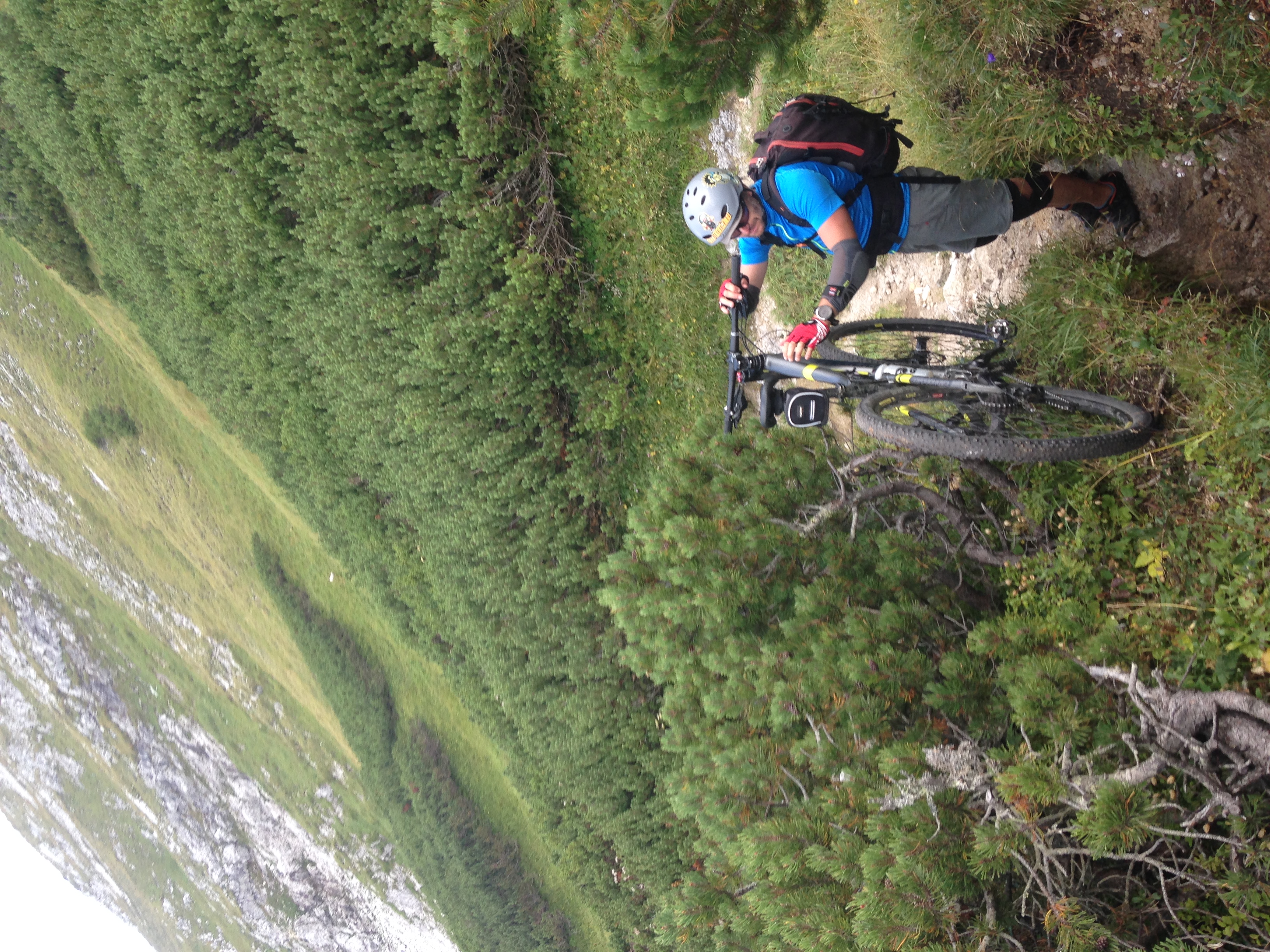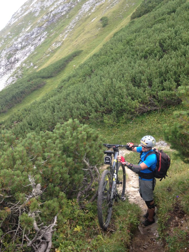 Hinunter zur Häuslalm geht es über den immer wieder steilen und engen Pfad, tragen, schieben, fahren… hindurch zwischen Felsen, Latschen, Dolinen. Wir treffen auf eine Kreuzotter am Weg.