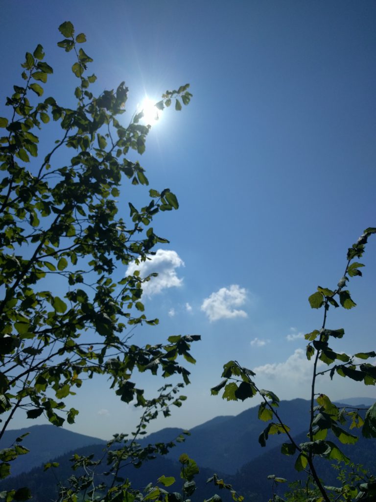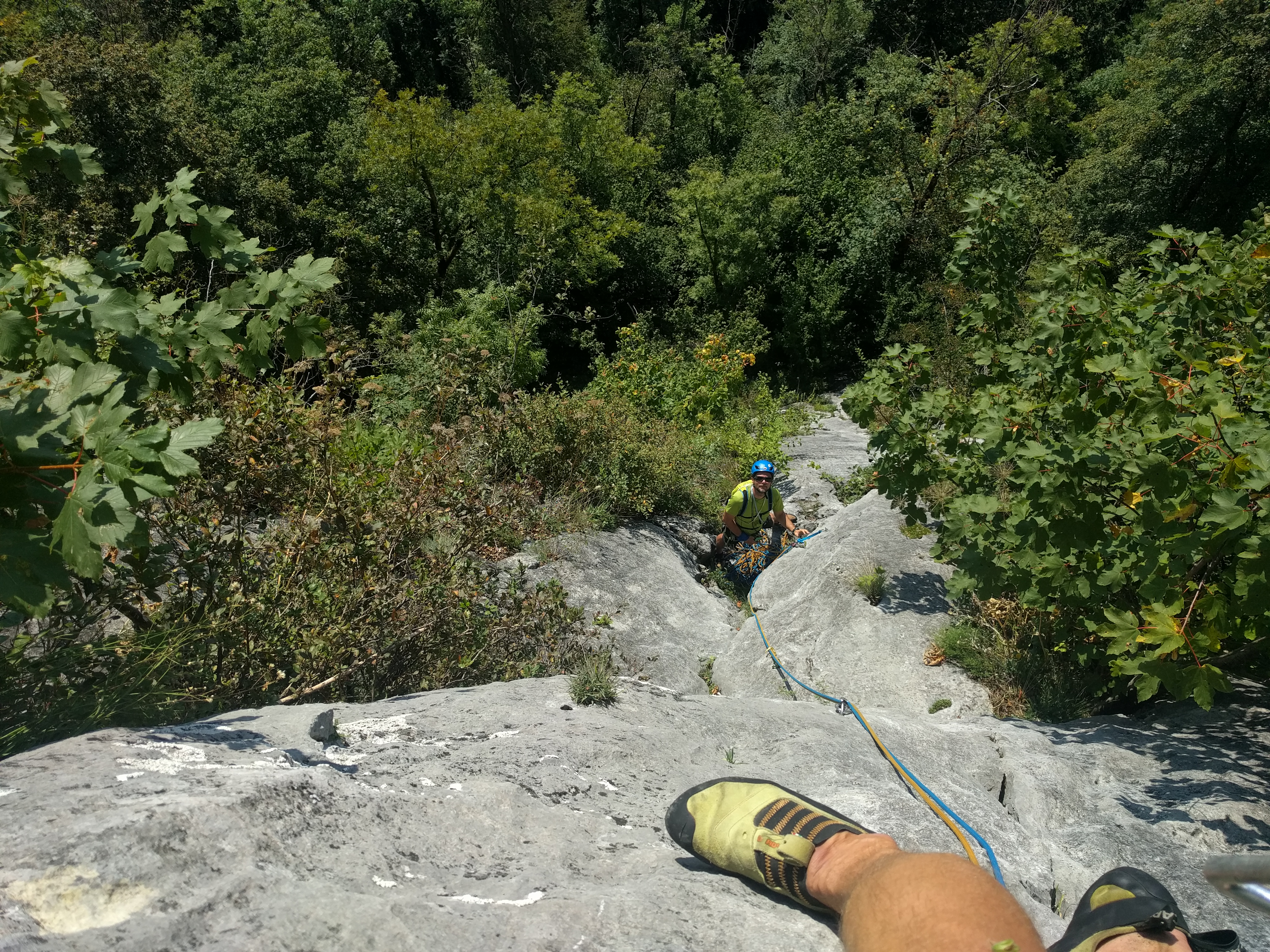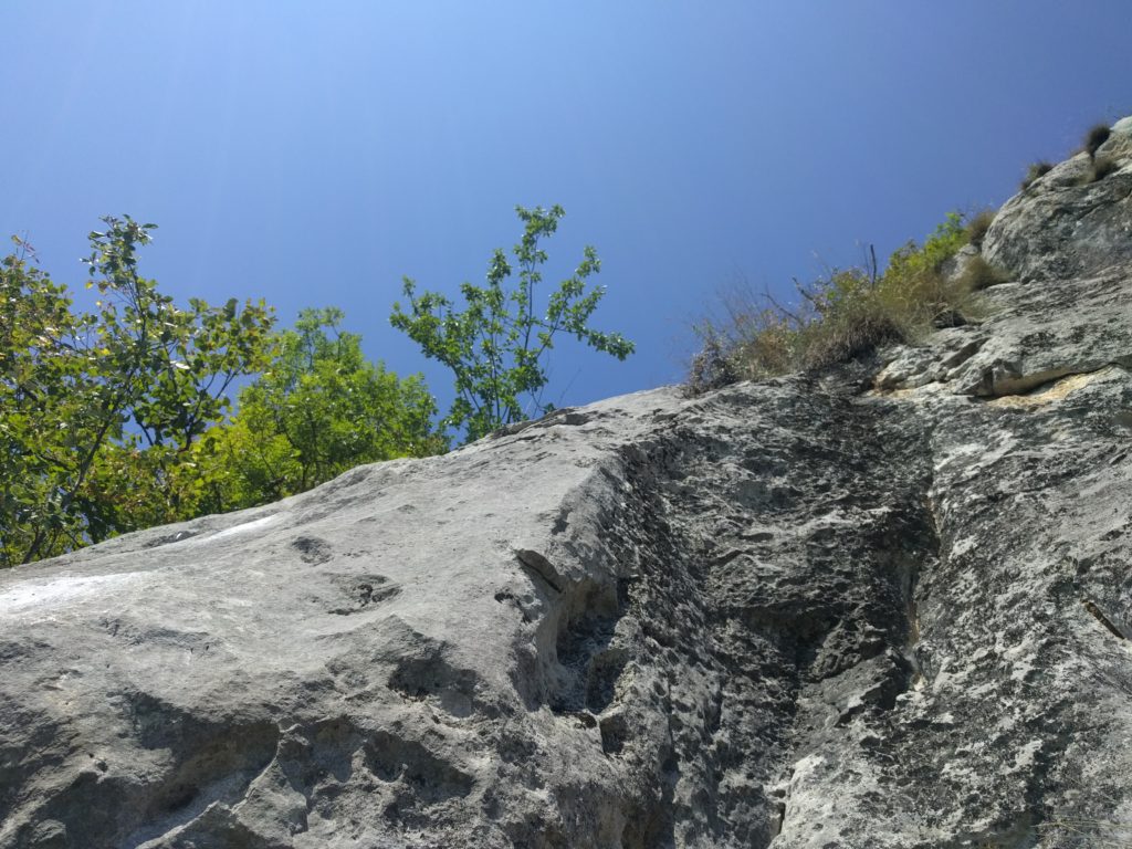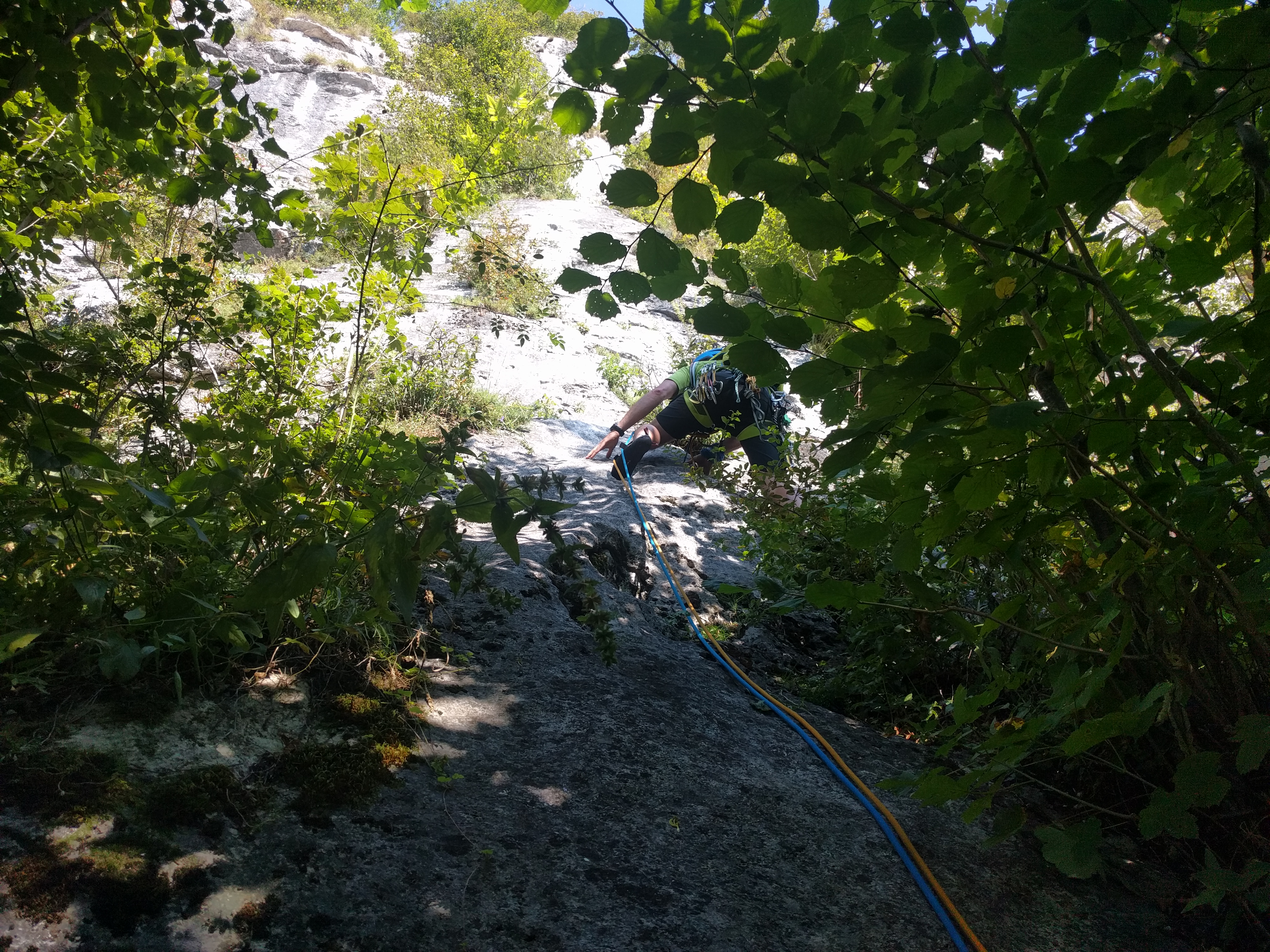 Das Wetter passt einfach nicht zu dem was wir vorhaben und tun! Und das obwohl die Sonnne scheint, der Himmel blau ist und die Temperaturen perfekt sind für einen Badetag, wir sind eindeutig am falschen Ort. Der helle Fels und die südseitige Ausrrichtung haben uns in den ersten Längen die Schweisstropfen vom Helm übers Gesicht und auf den Fels rinnen lassen. Und am zweiten Stand haben wir den Entschluss gefasst abzuseilen und den noch recht einfachen Weg nach unten anzutreten. Der Rest der Tour geht immer südseitig durch die Wand, die Bewaldung ist oben nicht mehr vorhanden, eine Hitzeschlacht stünde bevor! Das Abseilen hat gut funktioniert ohne Seilhänger und ärgere Kratzereien durchs Unterholz, das im Einstiegsbereich reichlich vorhanden ist.