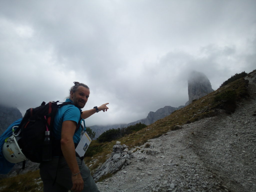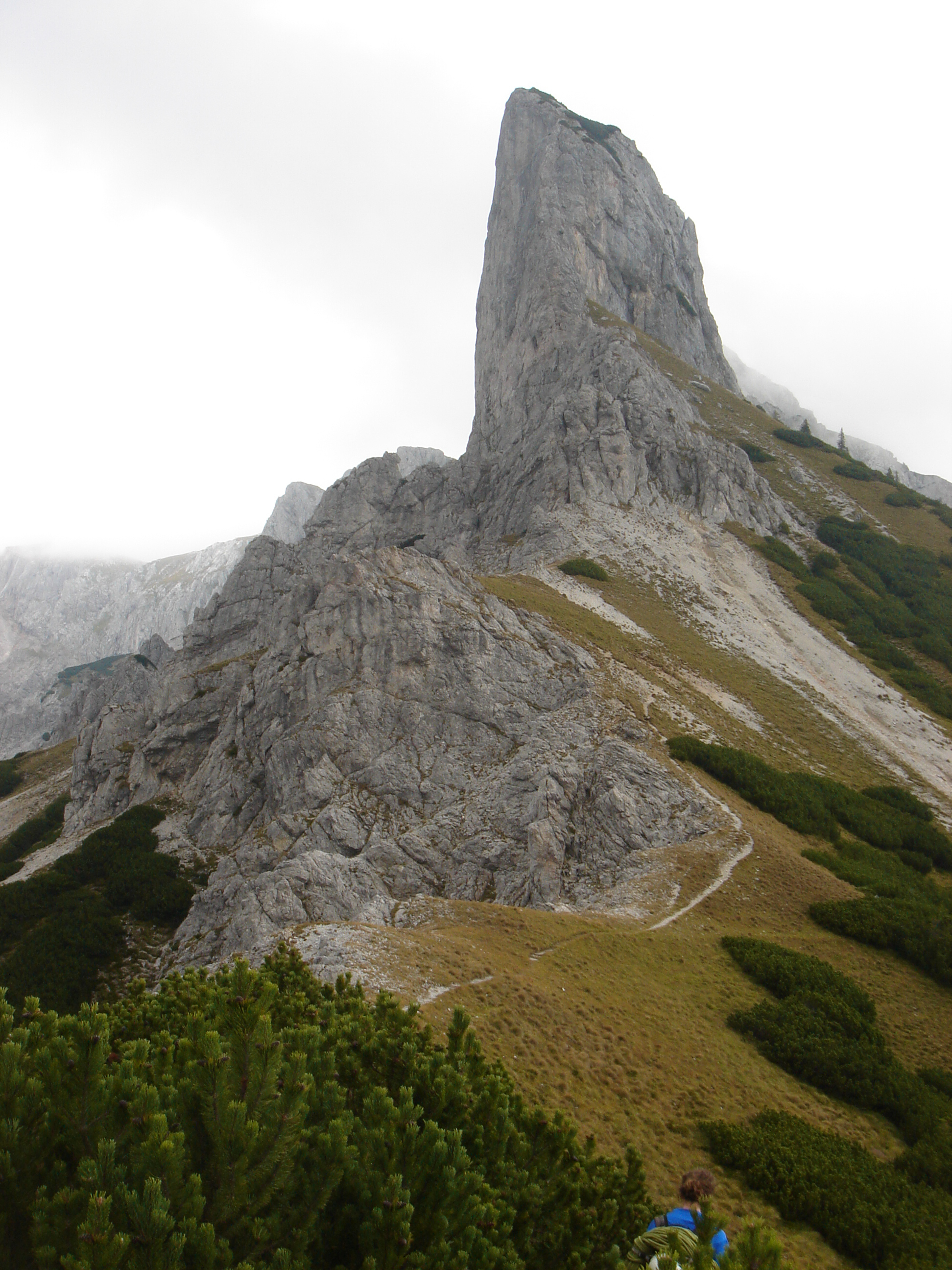 Am Ende der ersten Schulwoche, nach zwei gefeierten Nächten fahren Ben und ich ein weiteres Mal zum Hochschwab. Diesmal gehts über den Westgrat auf den Kleinen und Großen Festlbeilstein. Das Wetter schaut gut aus, auch wenn ich in der Früh beim Wegfahren noch skeptisch bin. Beim Bodenbauer starten wir den zwei stündigen Aufstieg. Doch zuerst sehen wir mal fast nur Wolken. Sowohl der Hochschwab, also auch der Festlbeilstein bleiben beim ganzen Aufstieg in Wolken gehüllt. Irgendwann kommt dann zumindest der Buchbergkogel heraus und beim Näherkommen sehen wir auch den Festlbeilstein das erste Mal in seiner imposanten und beeindruckenden Form. Steil – in fast alle Richtungen und freistehend. Das Ambiente ist vom Besten, still ist es und rauh. Von der anderen Talseite lachen die Wasserrillen des Beilsteins herüber und die Südwand spielt Verstecken. Auf der Nordseite fällt das Gelände steil ins Rauchtal hinuter ab und gibt schon jetzt ordendliche Tiefblicke frei. Beim Einstieg gibt es einen Kaffee und dann gehts los.