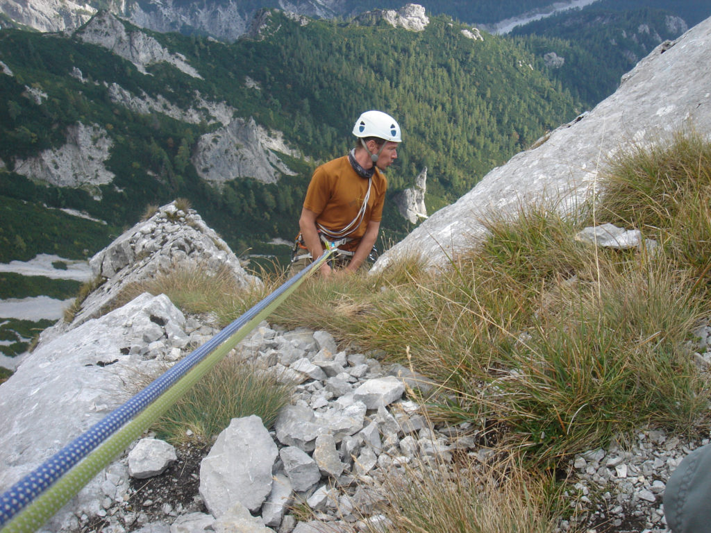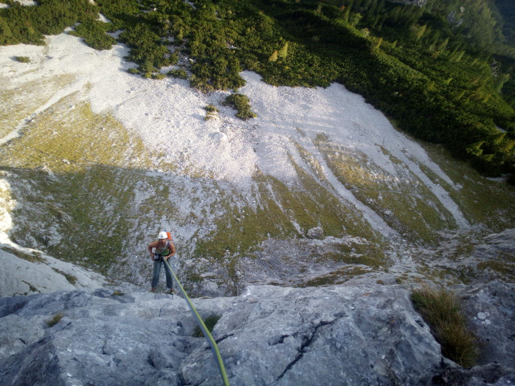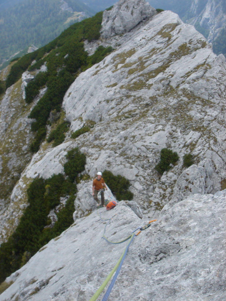 Unglaublich wo hier ein Vierer raufgehen soll und wirklich sind die zweite und dritte Länge richtig steil, gut gesichert zwar aber es „pfeift“ gleich mal ordenlich runter. Über den Gipfel des Kleinen Festlbeilsteins geht es dann hinüber/hinunter zum Großen. Die vierte Kletterlänge ist wieder steil, der Felsen sehr kompakt und herrlich. Dann geht es über den Grat zum Gipfel. Nach einer Rast in der Sonne, die uns seit dem Einstieg anlacht, seilen wir uns über die Südwand ab. Die Abseilpiste ist perfekt und wir nehmen, wie empfohlen, den ersten, den dritten und fünften Stand. Der zweite liegt als einziger auf einer flachen Platte, bei der es beim Abziehen des Seils zu Schwierigkeiten kommen könnte. Mit viel Luft unterm Hintern geht es abwärts und nach vierzig Minuten abseilen steigen wir zurück zum Bodenbauer ab.