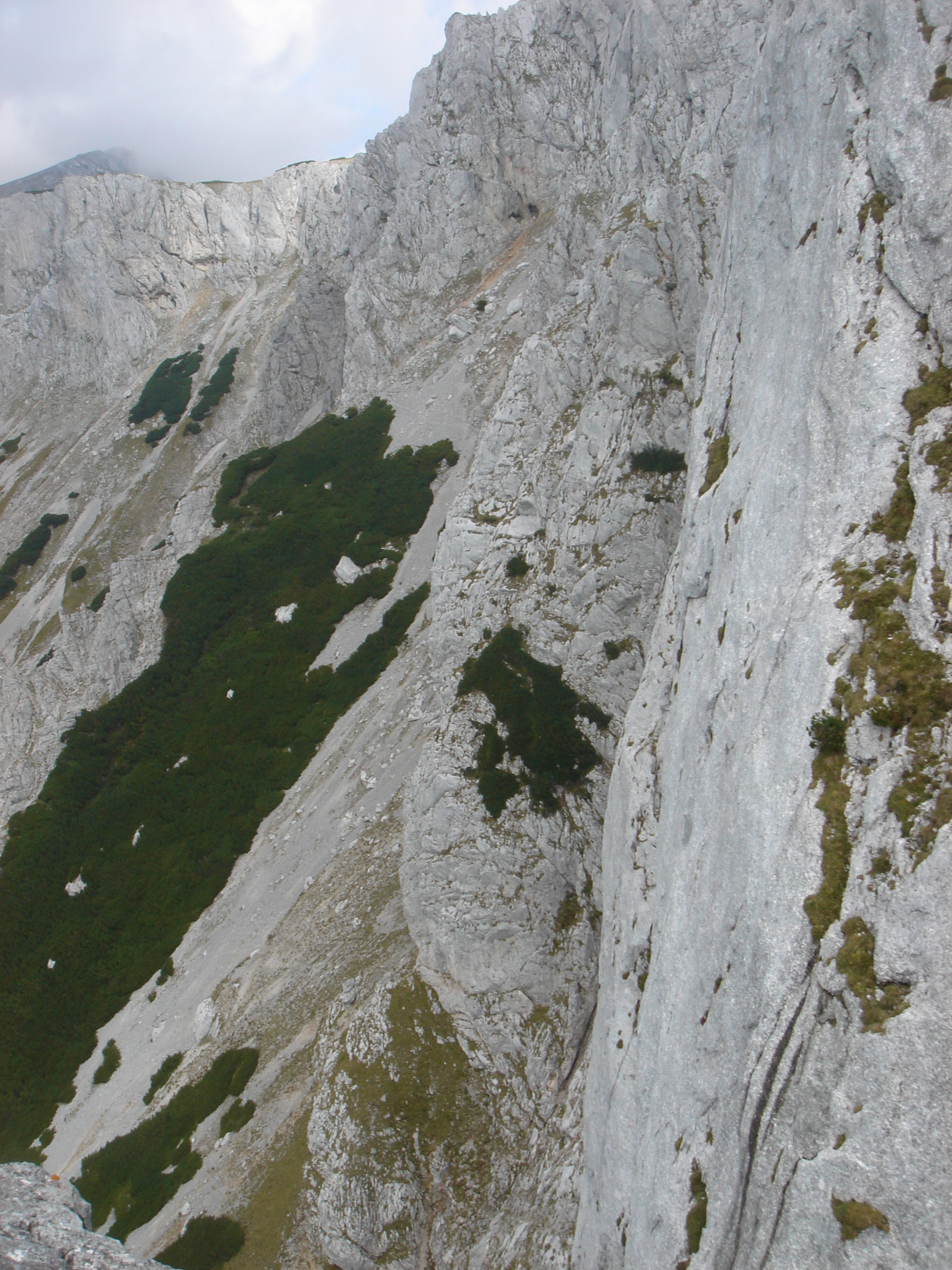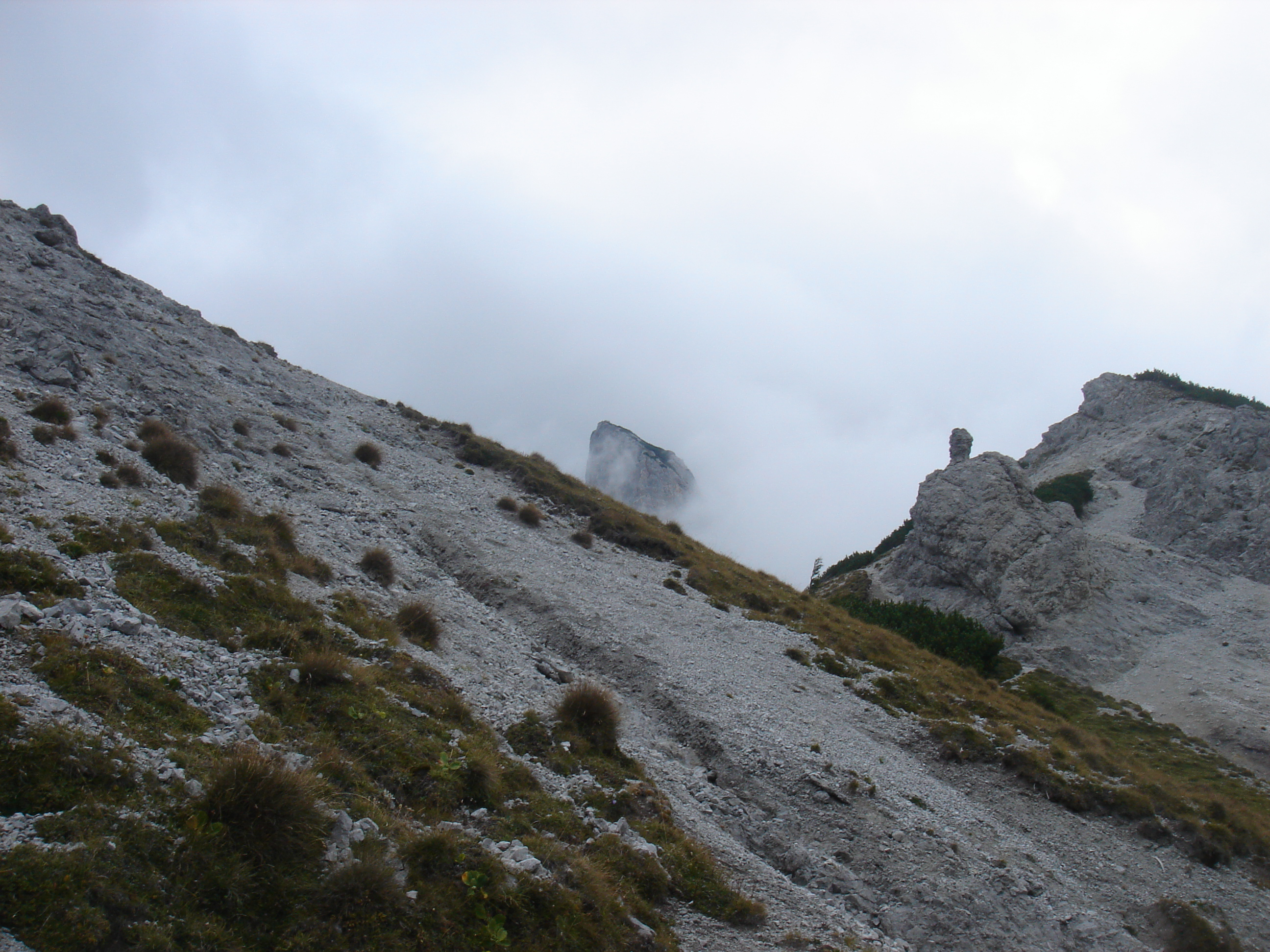 Am Ende der ersten Schulwoche, nach zwei gefeierten Nächten fahren Ben und ich ein weiteres Mal zum Hochschwab. Diesmal gehts über den Westgrat auf den Kleinen und Großen Festlbeilstein. Das Wetter schaut gut aus, auch wenn ich in der Früh beim Wegfahren noch skeptisch bin. Beim Bodenbauer starten wir den zwei stündigen Aufstieg. Doch zuerst sehen wir mal fast nur Wolken. Sowohl der Hochschwab, also auch der Festlbeilstein bleiben beim ganzen Aufstieg in Wolken gehüllt. Irgendwann kommt dann zumindest der Buchbergkogel heraus und beim Näherkommen sehen wir auch den Festlbeilstein das erste Mal in seiner imposanten und beeindruckenden Form. Steil – in fast alle Richtungen und freistehend. Das Ambiente ist vom Besten, still ist es und rauh. Von der anderen Talseite lachen die Wasserrillen des Beilsteins herüber und die Südwand spielt Verstecken. Auf der Nordseite fällt das Gelände steil ins Rauchtal hinuter ab und gibt schon jetzt ordendliche Tiefblicke frei. Beim Einstieg gibt es einen Kaffee und dann gehts los.
