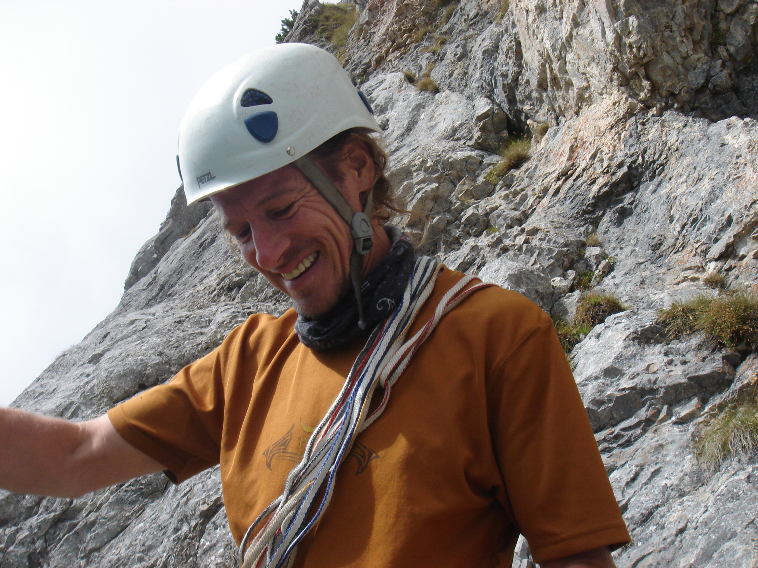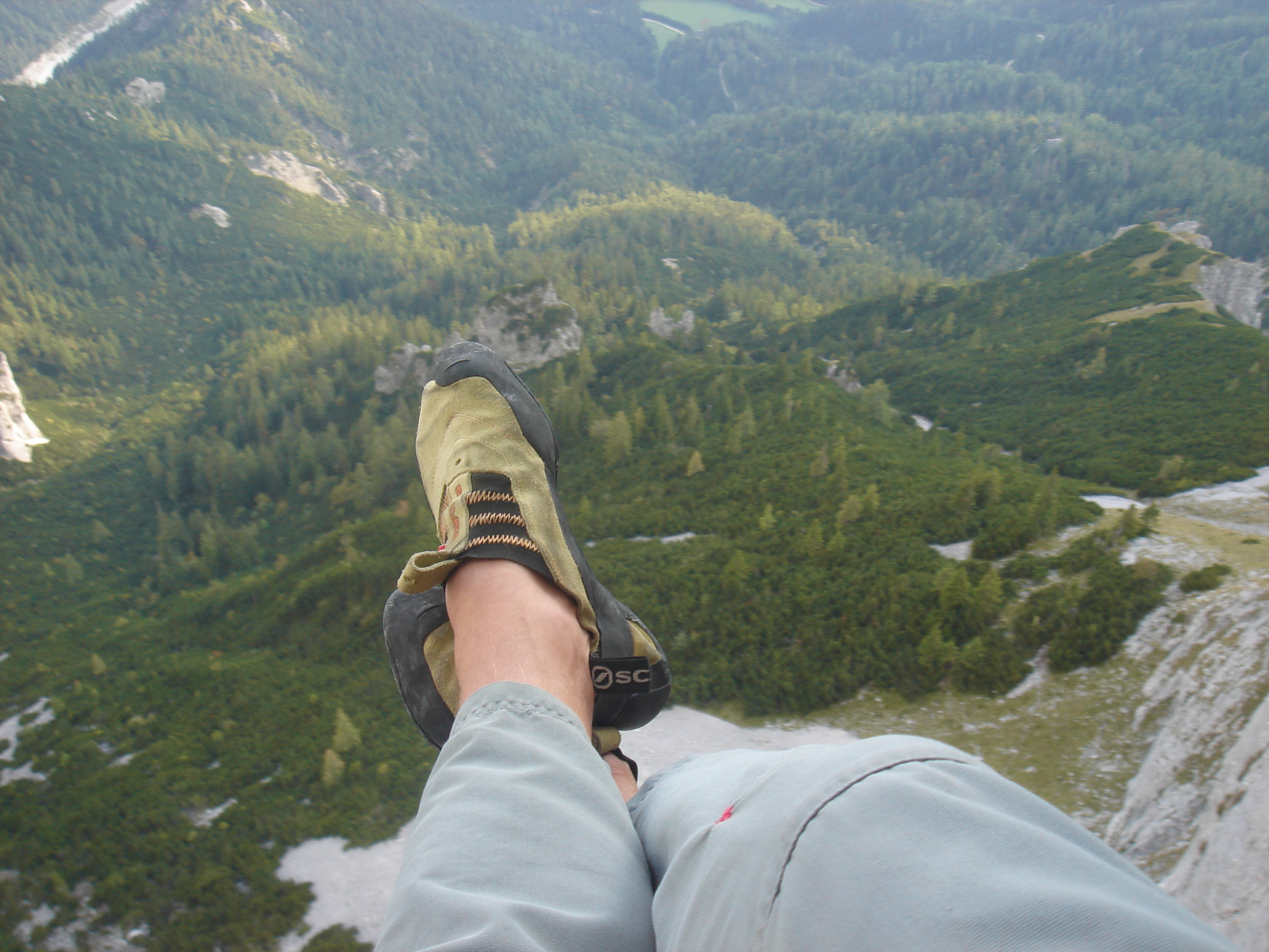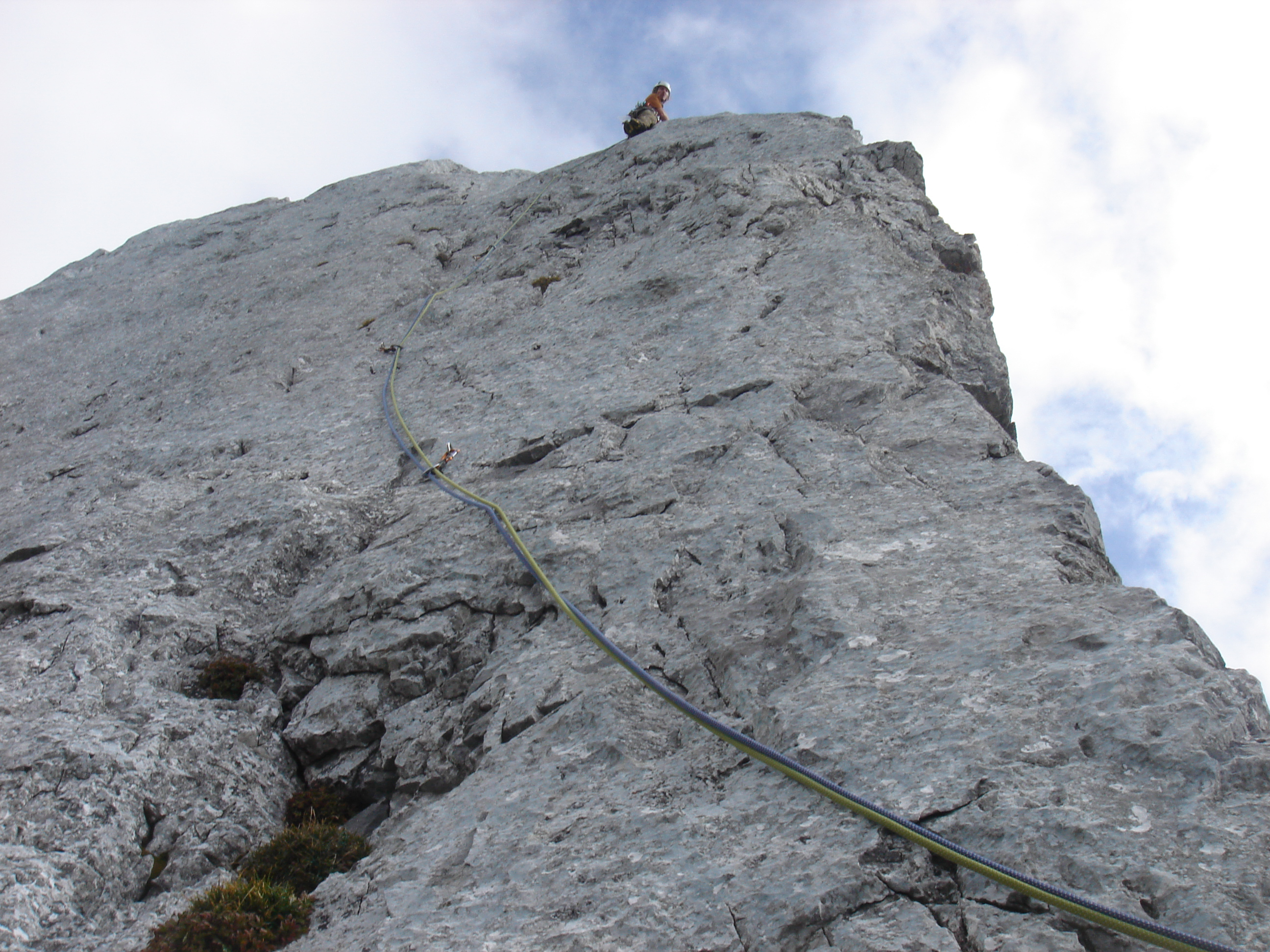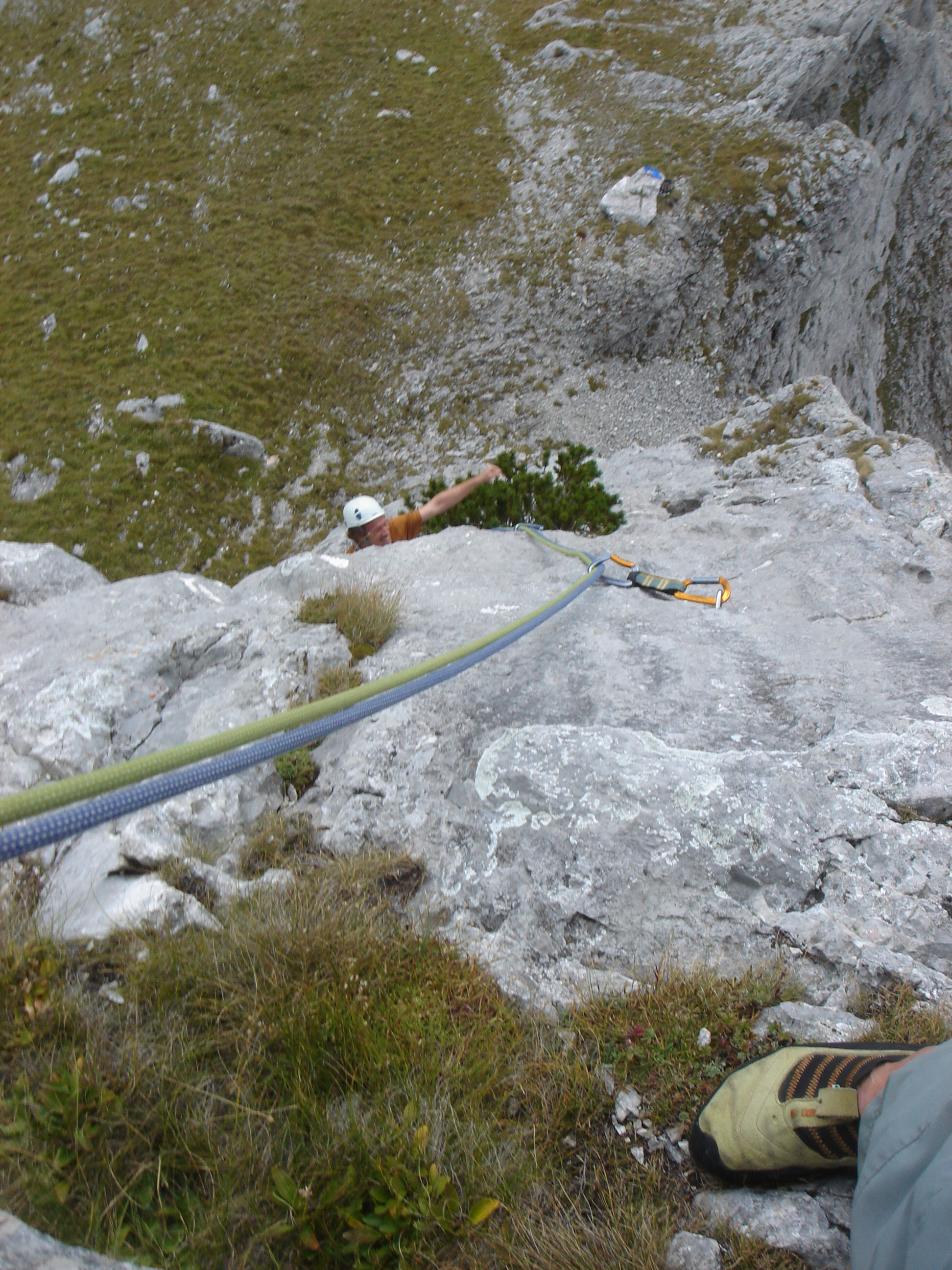 Unglaublich wo hier ein Vierer raufgehen soll und wirklich sind die zweite und dritte Länge richtig steil, gut gesichert zwar aber es „pfeift“ gleich mal ordenlich runter. Über den Gipfel des Kleinen Festlbeilsteins geht es dann hinüber/hinunter zum Großen. Die vierte Kletterlänge ist wieder steil, der Felsen sehr kompakt und herrlich. Dann geht es über den Grat zum Gipfel. Nach einer Rast in der Sonne, die uns seit dem Einstieg anlacht, seilen wir uns über die Südwand ab. Die Abseilpiste ist perfekt und wir nehmen, wie empfohlen, den ersten, den dritten und fünften Stand. Der zweite liegt als einziger auf einer flachen Platte, bei der es beim Abziehen des Seils zu Schwierigkeiten kommen könnte. Mit viel Luft unterm Hintern geht es abwärts und nach vierzig Minuten abseilen steigen wir zurück zum Bodenbauer ab.