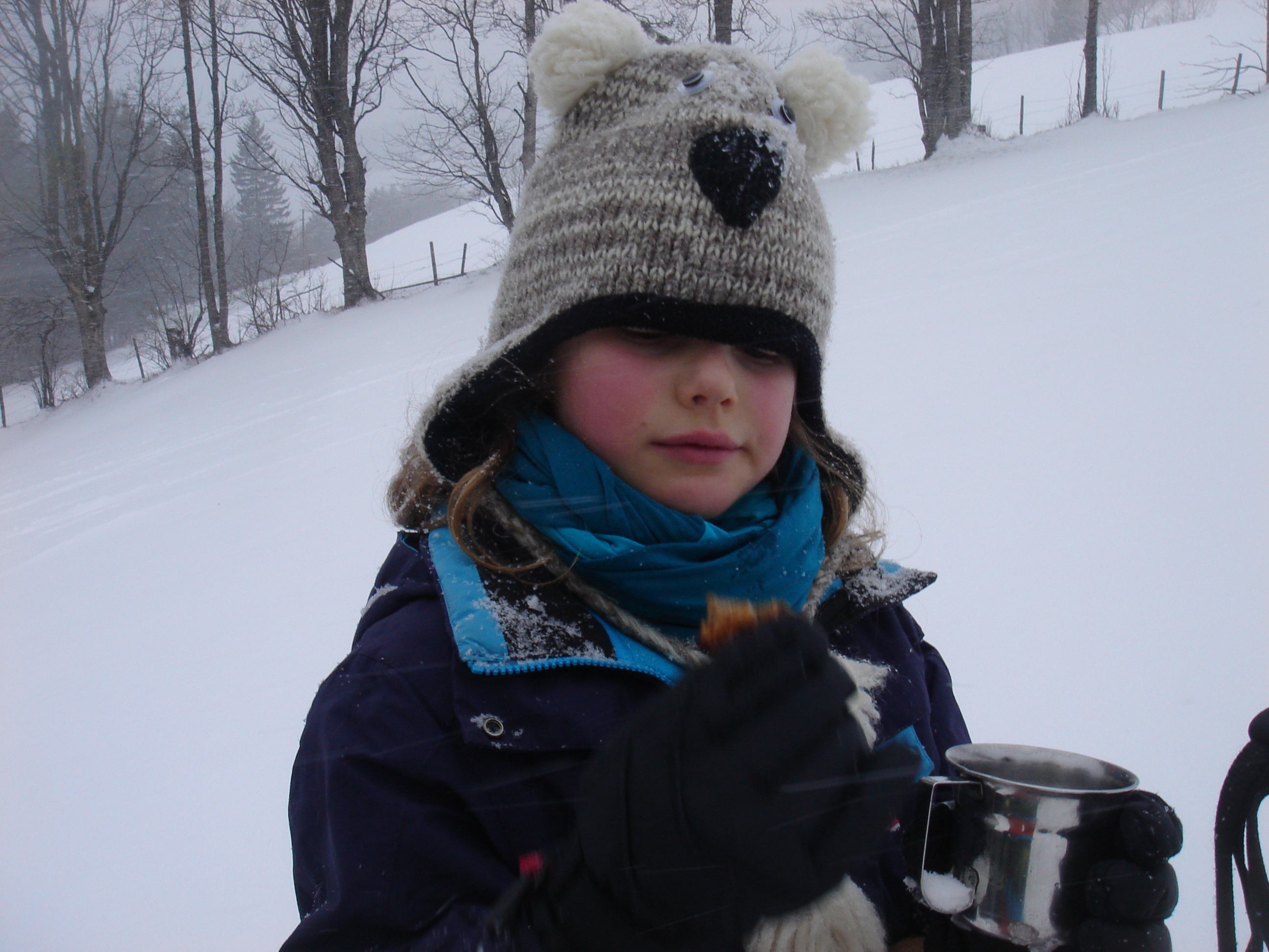 Der Nordwind hat bis ins Tal hinunter durchgegriffen und zum Teil sind die Böen richtig heftig. Gut eingemummt und warm angezogen ist das ab alles kein Problem und so ziehen wir gemütlich und genüsslich die 300 Höhenmeter hinauf. Dazwischen gibt es ein paar kleine Pausen, selbstgemachte Müsliriegel und warmen Chai. Oben halten wir uns im Windschatten der Bäume nicht allzulange auf. Richtig gemütlich ist es am Waldrand auch nicht.