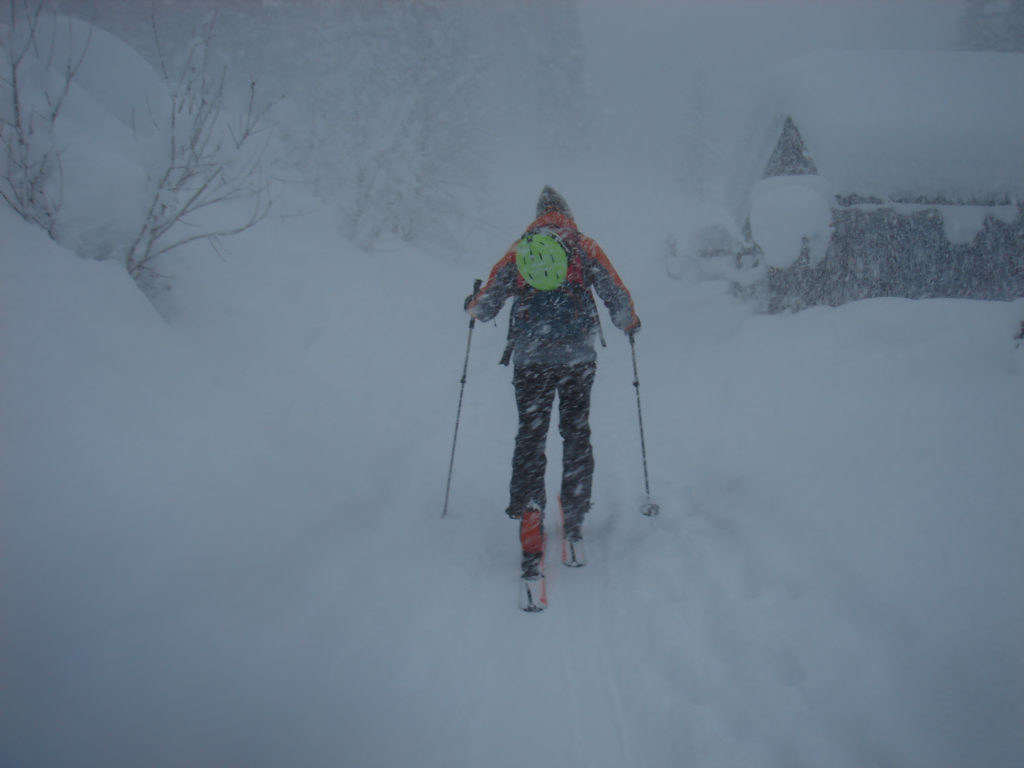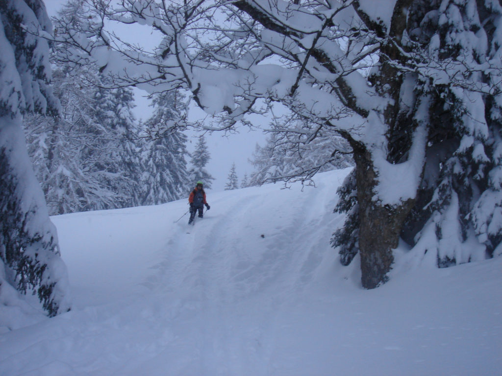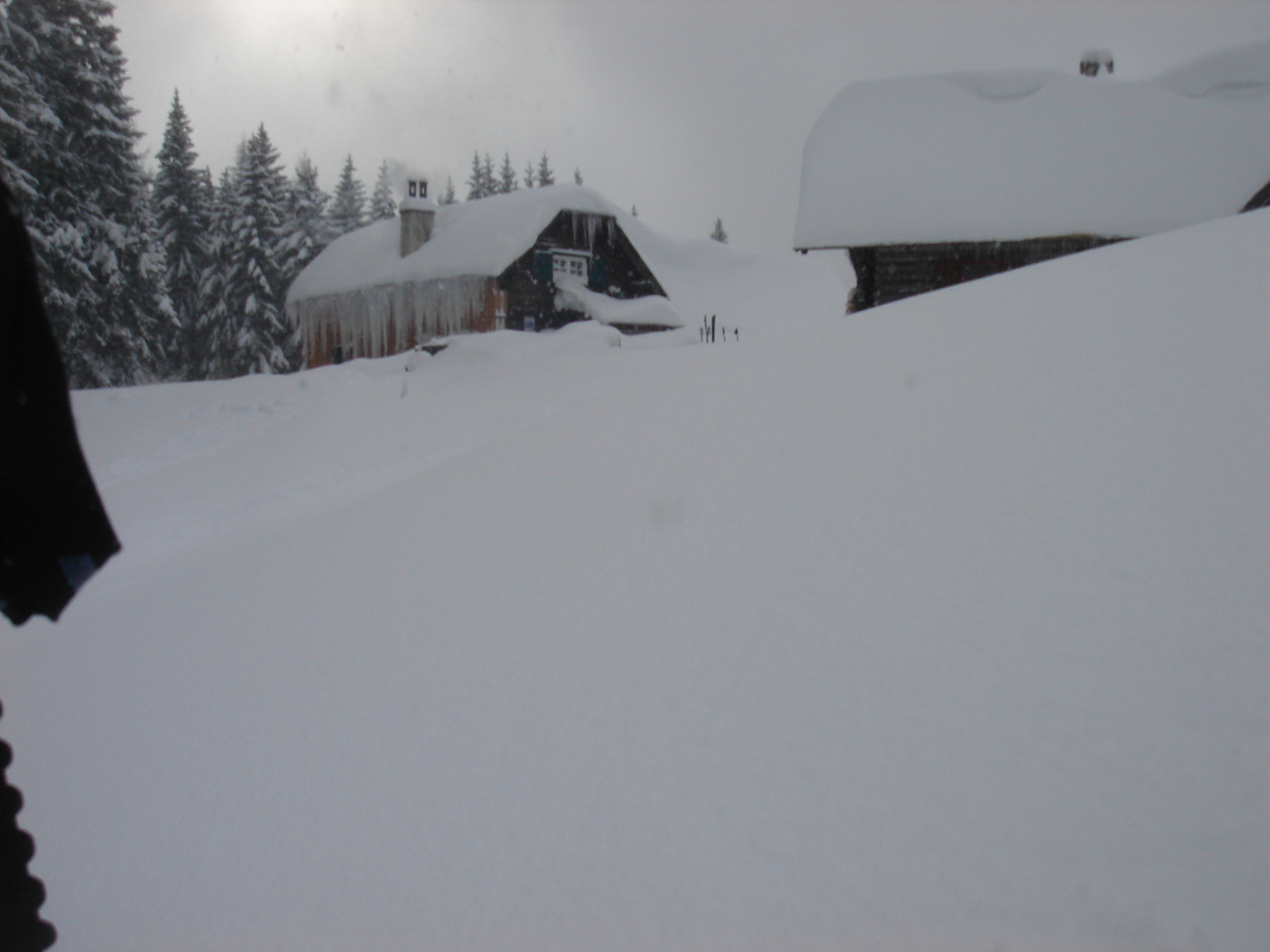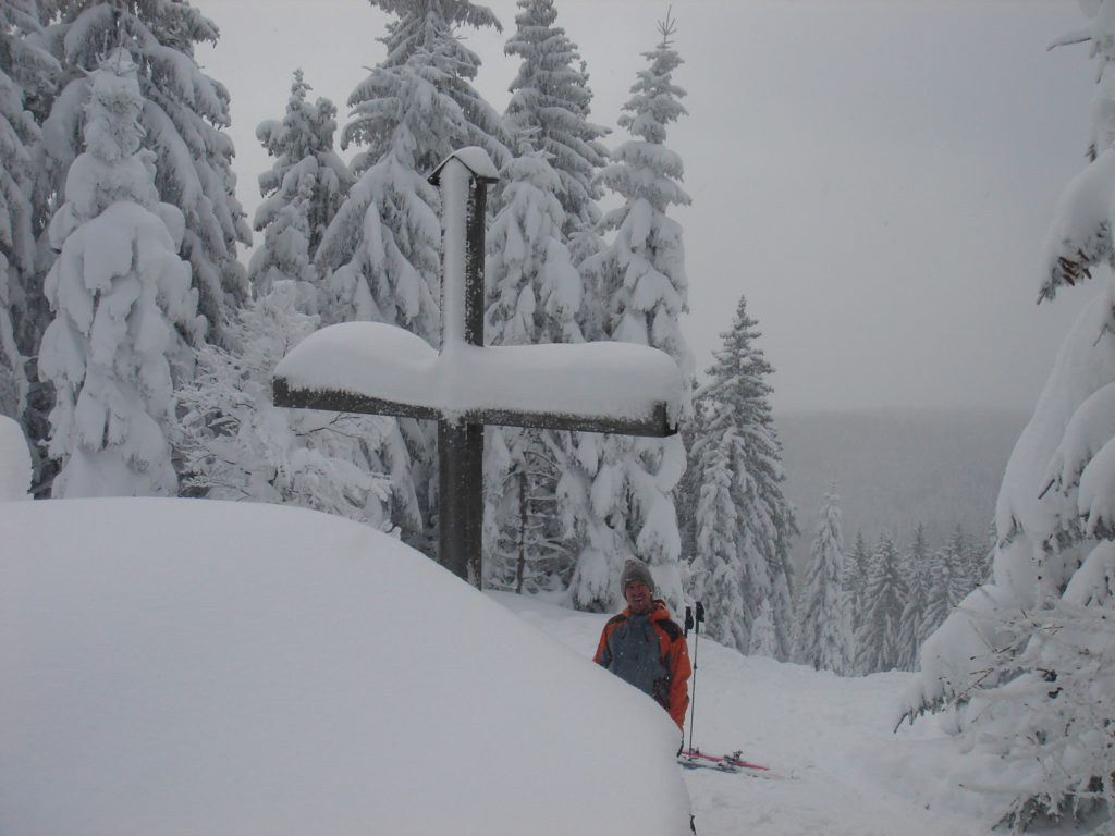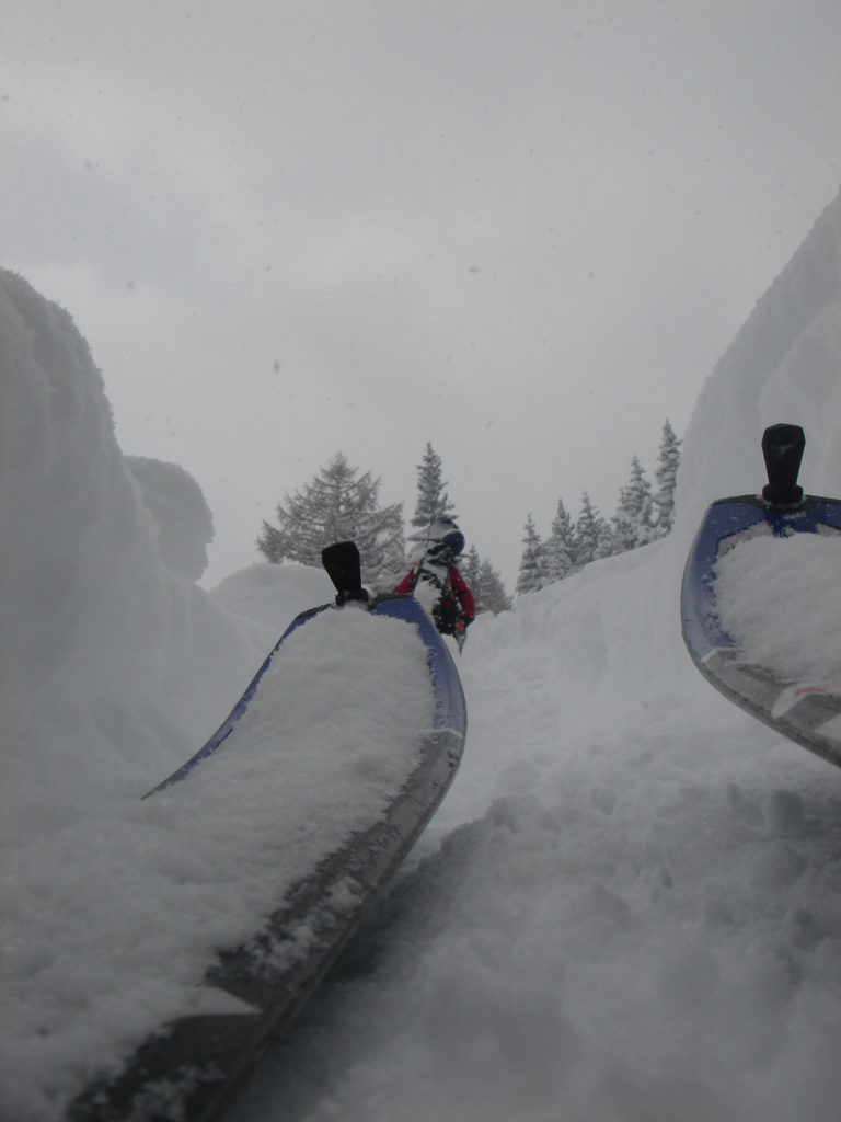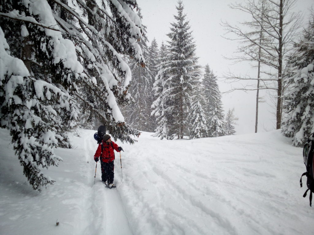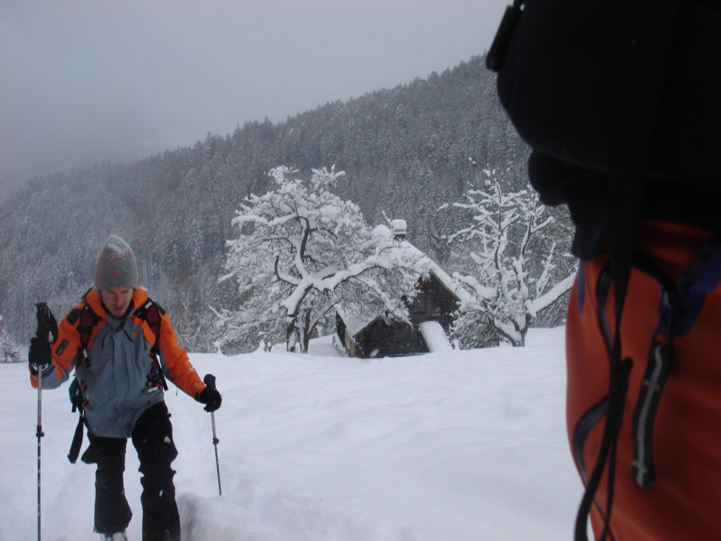 Ein paar sichere Skitouren gibt es in der Steiermark auch bei einer Fünfer-Lawinenwarnstufe. Dazu gehört auch der Kreuzschober bei Mürzzuschlag, eine Tour, die die Einheimischen nur noch unter der Woche (und dann ganz früh) gehen, weil sonst der Ansturm zu gross ist. Wir, Ben, Dom und ich wagen es heute. Es schneit, was sonst, das tut es jetzt in der Gegend schon seit einer Woche. Der Parkplatz beim Gehöft im Eichhorntal ist gut geräumt und kostet 2,5 Euro. Die Schneelage auch im Tal ist beachtlich, im Laufe der Tour soll sie deutlich höher werden. Am Parkplatz sind gut 15 Autos, doppelt so viele haben gut Platz und die ersten kommen bereits ins Tal. Talaufwärts geht es neben der Strasse zu einem weiteren Bauern und dann über feine Wiesen weiter. Dazwischen sind ein paar kurze Hohlwege/Forststrassen die bald wieder in recht schmale Wiesenhänge übergehen. Es wirkt wie ein altes Skigebiet, dass sich da Richtung Gipfel zieht. Dazwischen umgehen und überklettern wir zwei umgestürtze Bäume und dann wird es kurz vor der Kaarl-Hütte ein wenig flacher. Der frische Pulverschnee liegt hier deutlich über einem Meter. Die Hütte ist am Wochenende bewirtschaftet und schaut mit den meterlangen Eiszapfen idylisch aus. Wir kriegen heute nichts und so geht es noch hundert Meter bis zum Gipfel und meine Ambitionen zu spuren enden kurz nach der Hütte. Zu viel Schnee, zu steil, zu anstrengend. Es schneit und schneit, dazwischen haben wir sogar kurz mal den blauen Himmel gesehen und immer wieder die Sonne hinter den Wolken und jetzt fallen wieder dicke Flocken. Wir machen eine gute Rast bei der Wächte beim Gipfelkreuz: Tee, selbstgemachten Lebkuchen und Müsliriegel und Pocket Coffee. Ein erfahrener Tourengeher stellt ein Kerzerl für einen verstorbenen Skitourenkollegen auf, (ob wir das auch mal füreinander machen werden?) Und dann gehts durch den hüfthohen zerfahrenen Tiefschnee Richtung Tal. Für Dom mit den Schneeschuhen und dem Board endet hier aber die Plagerei nicht. Das Flachstück bei der Kaarlhütte ist mit dem Snowboard heute nicht zu fahren und einmal versunken wird es richtig anstrengend weiterzukommen. Mit den Skiern geht es uns besser. Wir kommen in der Spur und mit Schwung gut voran. Die Wiesen sind super zu fahren, weil der Pulver selbst dort wo er zusammengeschoben ist so weich und fluffig ist. Die Schneequalität bleibt bis unten bestens. Ben und ich graben noch ein Schneeprofil und bewundern fast 50 cm weichen leichten Pulver auf 20 cm gebundenem Schnee, keine verharschten Schichtgrenzen, nur unten gibt es eine auskristalisierte Bodenschicht. Nach fast vier Stunden sind wir wieder wohlbehalten am Parkplatz.