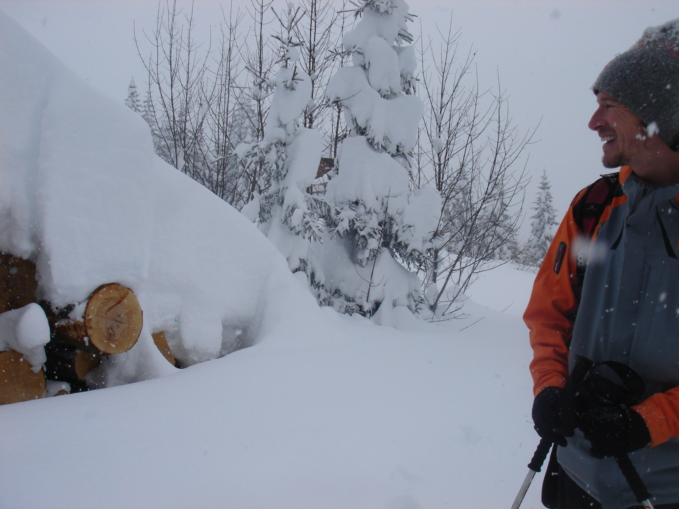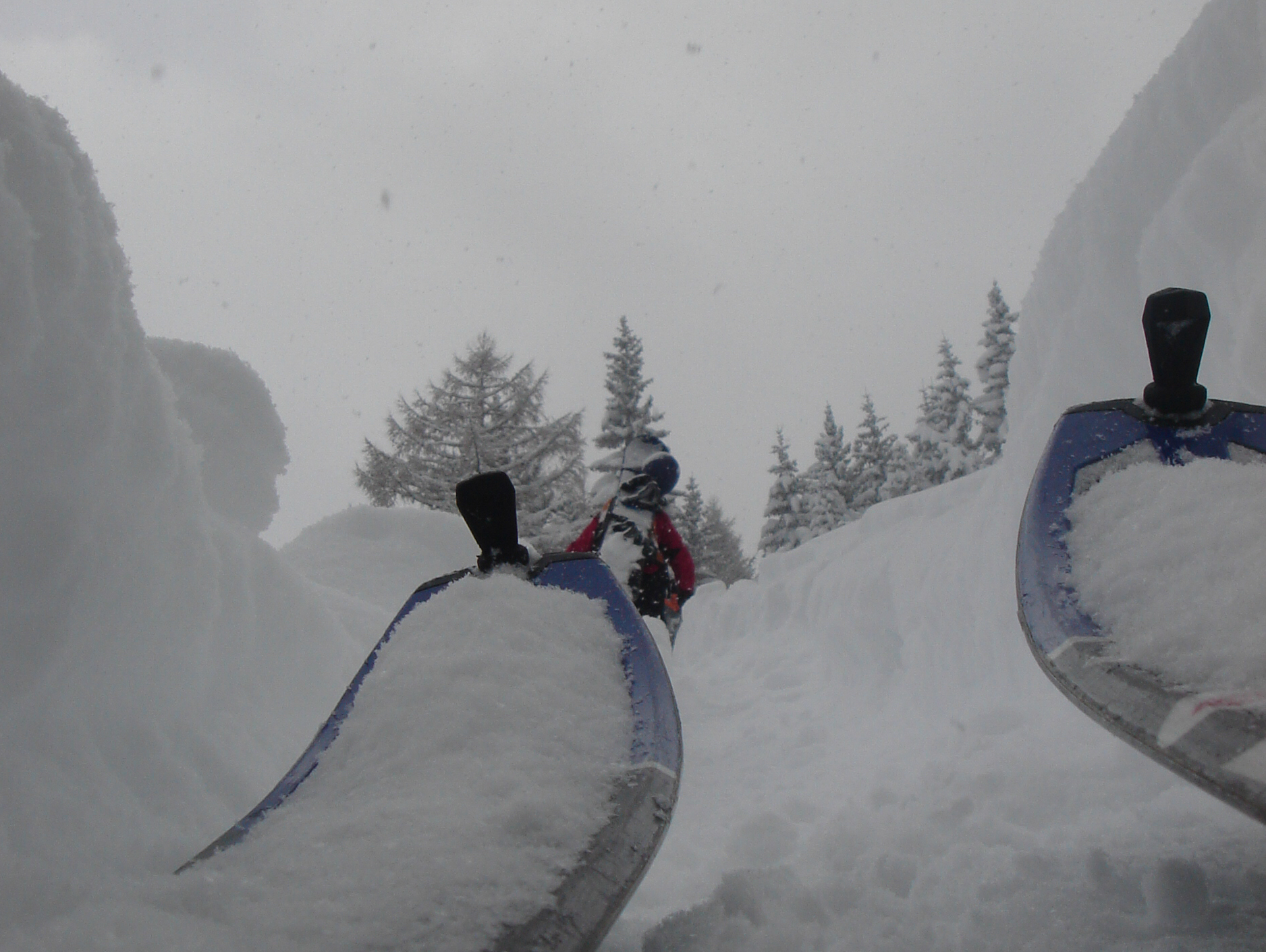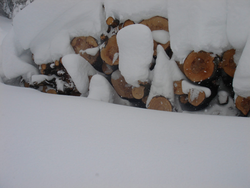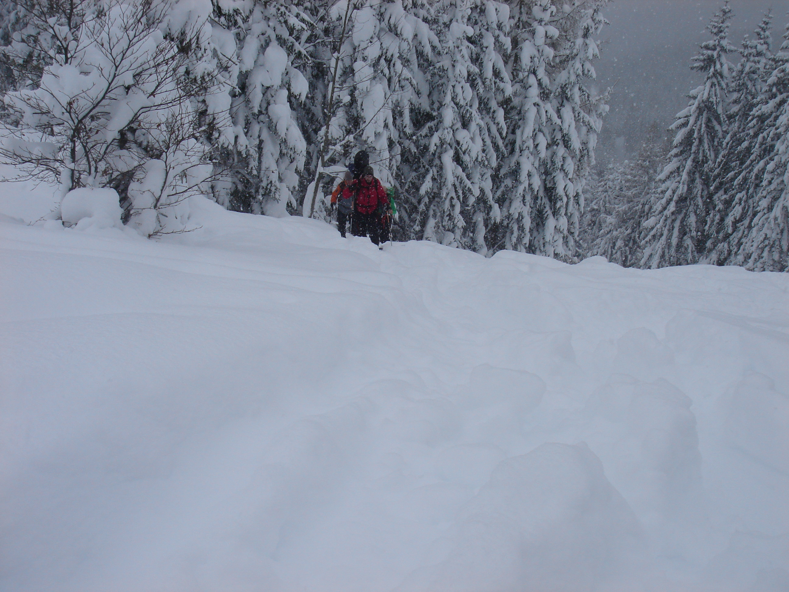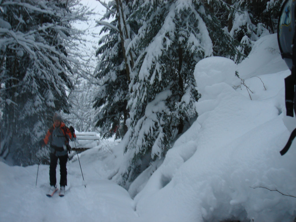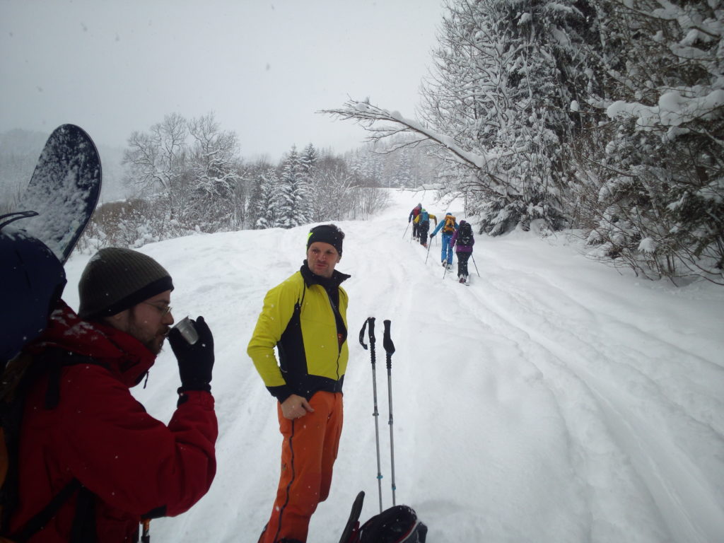 Ein paar sichere Skitouren gibt es in der Steiermark auch bei einer Fünfer-Lawinenwarnstufe. Dazu gehört auch der Kreuzschober bei Mürzzuschlag, eine Tour, die die Einheimischen nur noch unter der Woche (und dann ganz früh) gehen, weil sonst der Ansturm zu gross ist. Wir, Ben, Dom und ich wagen es heute. Es schneit, was sonst, das tut es jetzt in der Gegend schon seit einer Woche. Der Parkplatz beim Gehöft im Eichhorntal ist gut geräumt und kostet 2,5 Euro. Die Schneelage auch im Tal ist beachtlich, im Laufe der Tour soll sie deutlich höher werden. Am Parkplatz sind gut 15 Autos, doppelt so viele haben gut Platz und die ersten kommen bereits ins Tal. Talaufwärts geht es neben der Strasse zu einem weiteren Bauern und dann über feine Wiesen weiter. Dazwischen sind ein paar kurze Hohlwege/Forststrassen die bald wieder in recht schmale Wiesenhänge übergehen. Es wirkt wie ein altes Skigebiet, dass sich da Richtung Gipfel zieht. Dazwischen umgehen und überklettern wir zwei umgestürtze Bäume und dann wird es kurz vor der Kaarl-Hütte ein wenig flacher. Der frische Pulverschnee liegt hier deutlich über einem Meter. Die Hütte ist am Wochenende bewirtschaftet und schaut mit den meterlangen Eiszapfen idylisch aus. Wir kriegen heute nichts und so geht es noch hundert Meter bis zum Gipfel und meine Ambitionen zu spuren enden kurz nach der Hütte. Zu viel Schnee, zu steil, zu anstrengend. Es schneit und schneit, dazwischen haben wir sogar kurz mal den blauen Himmel gesehen und immer wieder die Sonne hinter den Wolken und jetzt fallen wieder dicke Flocken. Wir machen eine gute Rast bei der Wächte beim Gipfelkreuz: Tee, selbstgemachten Lebkuchen und Müsliriegel und Pocket Coffee. Ein erfahrener Tourengeher stellt ein Kerzerl für einen verstorbenen Skitourenkollegen auf, (ob wir das auch mal füreinander machen werden?) Und dann gehts durch den hüfthohen zerfahrenen Tiefschnee Richtung Tal. Für Dom mit den Schneeschuhen und dem Board endet hier aber die Plagerei nicht. Das Flachstück bei der Kaarlhütte ist mit dem Snowboard heute nicht zu fahren und einmal versunken wird es richtig anstrengend weiterzukommen. Mit den Skiern geht es uns besser. Wir kommen in der Spur und mit Schwung gut voran. Die Wiesen sind super zu fahren, weil der Pulver selbst dort wo er zusammengeschoben ist so weich und fluffig ist. Die Schneequalität bleibt bis unten bestens. Ben und ich graben noch ein Schneeprofil und bewundern fast 50 cm weichen leichten Pulver auf 20 cm gebundenem Schnee, keine verharschten Schichtgrenzen, nur unten gibt es eine auskristalisierte Bodenschicht. Nach fast vier Stunden sind wir wieder wohlbehalten am Parkplatz.