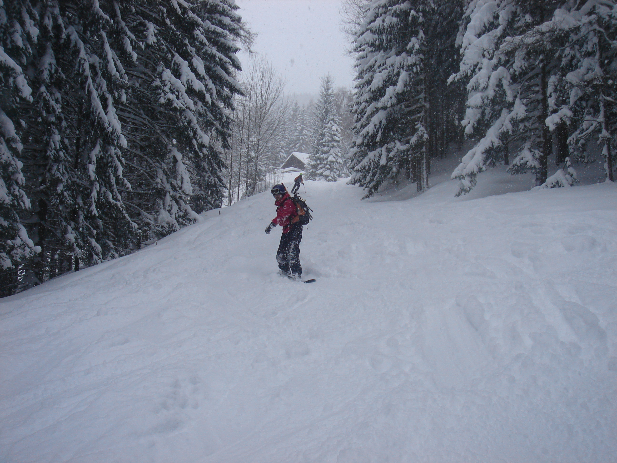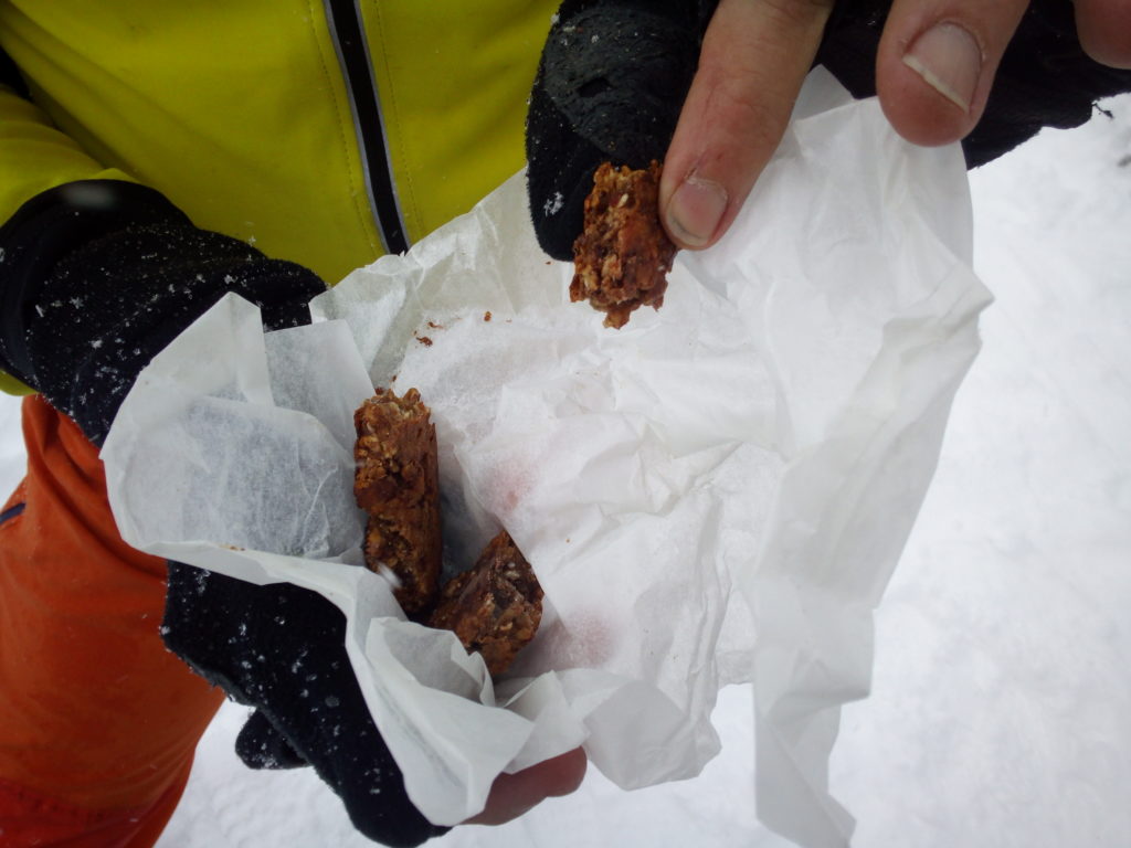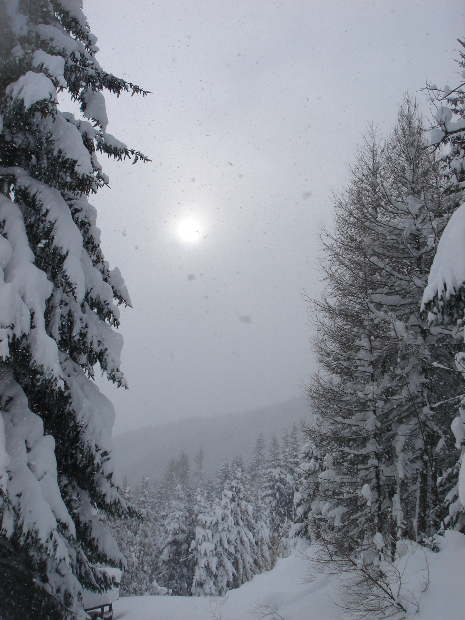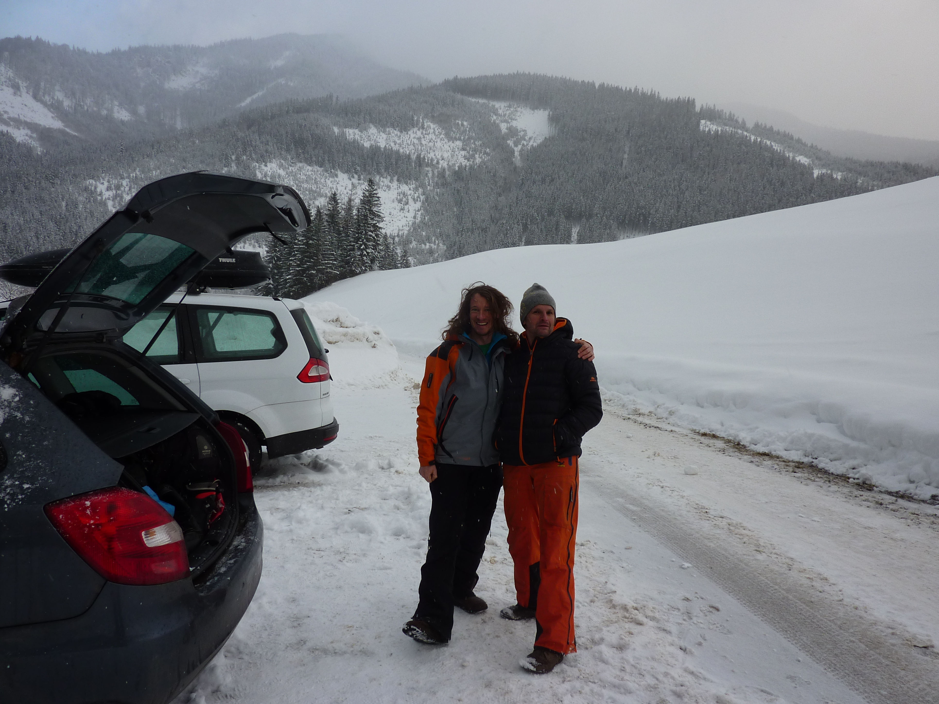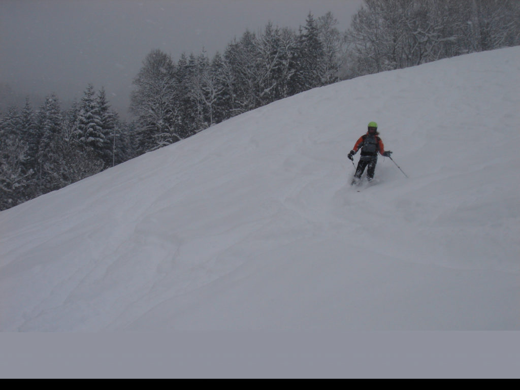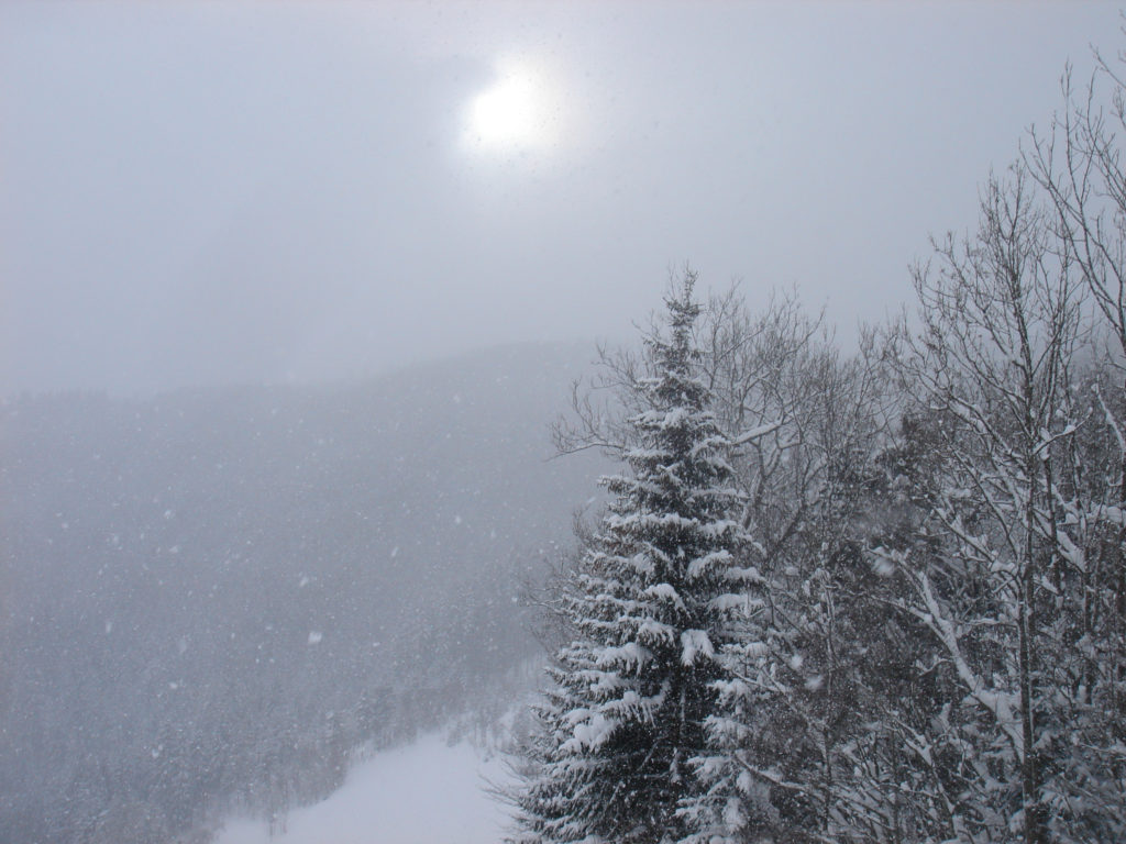 Ein paar sichere Skitouren gibt es in der Steiermark auch bei einer Fünfer-Lawinenwarnstufe. Dazu gehört auch der Kreuzschober bei Mürzzuschlag, eine Tour, die die Einheimischen nur noch unter der Woche (und dann ganz früh) gehen, weil sonst der Ansturm zu gross ist. Wir, Ben, Dom und ich wagen es heute. Es schneit, was sonst, das tut es jetzt in der Gegend schon seit einer Woche. Der Parkplatz beim Gehöft im Eichhorntal ist gut geräumt und kostet 2,5 Euro. Die Schneelage auch im Tal ist beachtlich, im Laufe der Tour soll sie deutlich höher werden. Am Parkplatz sind gut 15 Autos, doppelt so viele haben gut Platz und die ersten kommen bereits ins Tal. Talaufwärts geht es neben der Strasse zu einem weiteren Bauern und dann über feine Wiesen weiter. Dazwischen sind ein paar kurze Hohlwege/Forststrassen die bald wieder in recht schmale Wiesenhänge übergehen. Es wirkt wie ein altes Skigebiet, dass sich da Richtung Gipfel zieht. Dazwischen umgehen und überklettern wir zwei umgestürtze Bäume und dann wird es kurz vor der Kaarl-Hütte ein wenig flacher. Der frische Pulverschnee liegt hier deutlich über einem Meter. Die Hütte ist am Wochenende bewirtschaftet und schaut mit den meterlangen Eiszapfen idylisch aus. Wir kriegen heute nichts und so geht es noch hundert Meter bis zum Gipfel und meine Ambitionen zu spuren enden kurz nach der Hütte. Zu viel Schnee, zu steil, zu anstrengend. Es schneit und schneit, dazwischen haben wir sogar kurz mal den blauen Himmel gesehen und immer wieder die Sonne hinter den Wolken und jetzt fallen wieder dicke Flocken. Wir machen eine gute Rast bei der Wächte beim Gipfelkreuz: Tee, selbstgemachten Lebkuchen und Müsliriegel und Pocket Coffee. Ein erfahrener Tourengeher stellt ein Kerzerl für einen verstorbenen Skitourenkollegen auf, (ob wir das auch mal füreinander machen werden?) Und dann gehts durch den hüfthohen zerfahrenen Tiefschnee Richtung Tal. Für Dom mit den Schneeschuhen und dem Board endet hier aber die Plagerei nicht. Das Flachstück bei der Kaarlhütte ist mit dem Snowboard heute nicht zu fahren und einmal versunken wird es richtig anstrengend weiterzukommen. Mit den Skiern geht es uns besser. Wir kommen in der Spur und mit Schwung gut voran. Die Wiesen sind super zu fahren, weil der Pulver selbst dort wo er zusammengeschoben ist so weich und fluffig ist. Die Schneequalität bleibt bis unten bestens. Ben und ich graben noch ein Schneeprofil und bewundern fast 50 cm weichen leichten Pulver auf 20 cm gebundenem Schnee, keine verharschten Schichtgrenzen, nur unten gibt es eine auskristalisierte Bodenschicht. Nach fast vier Stunden sind wir wieder wohlbehalten am Parkplatz.