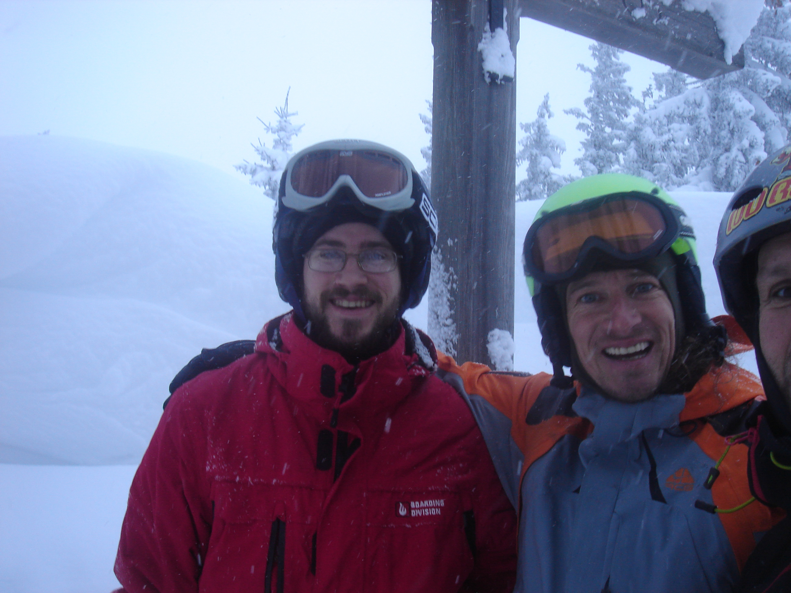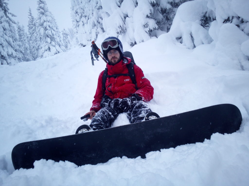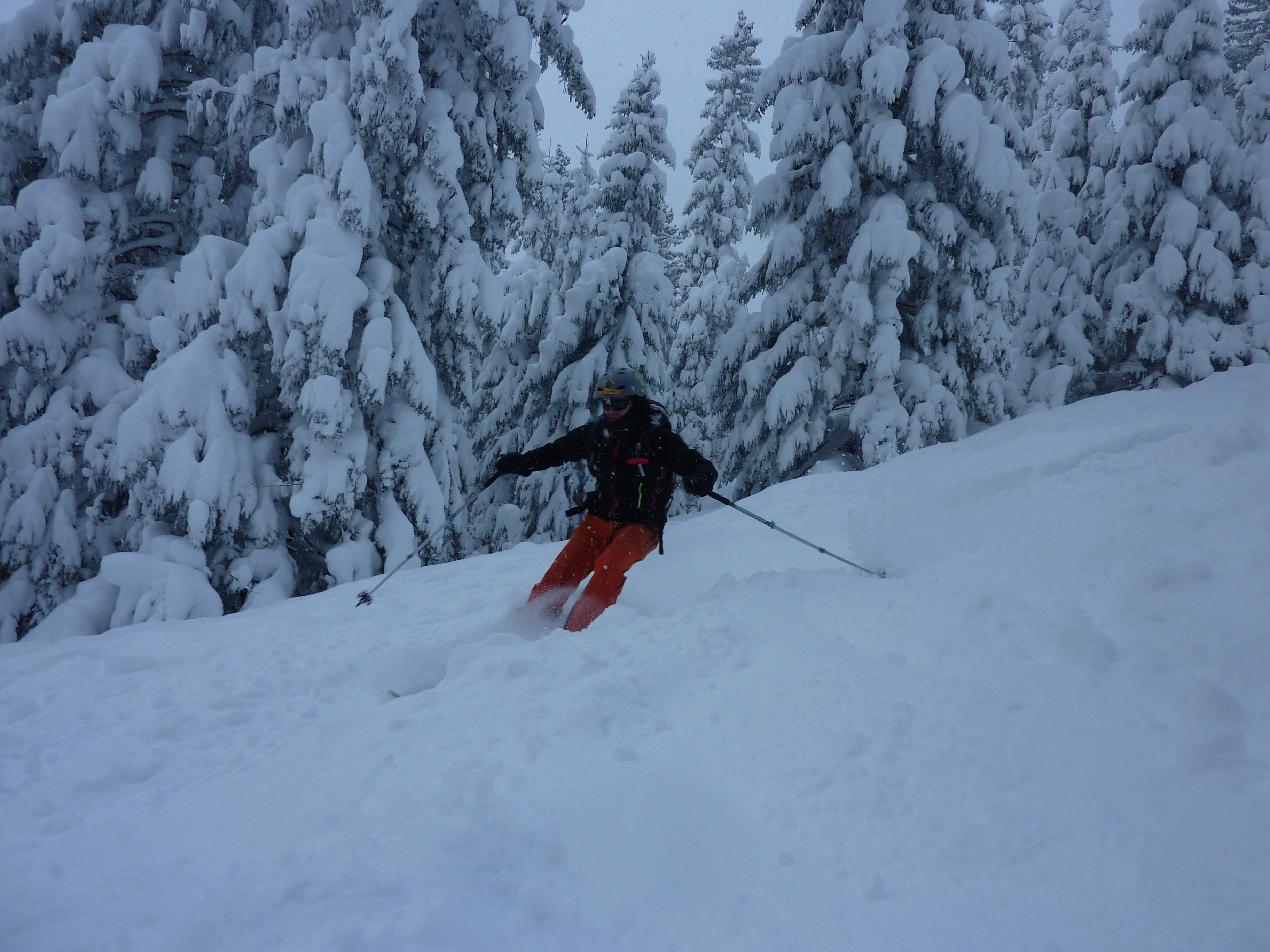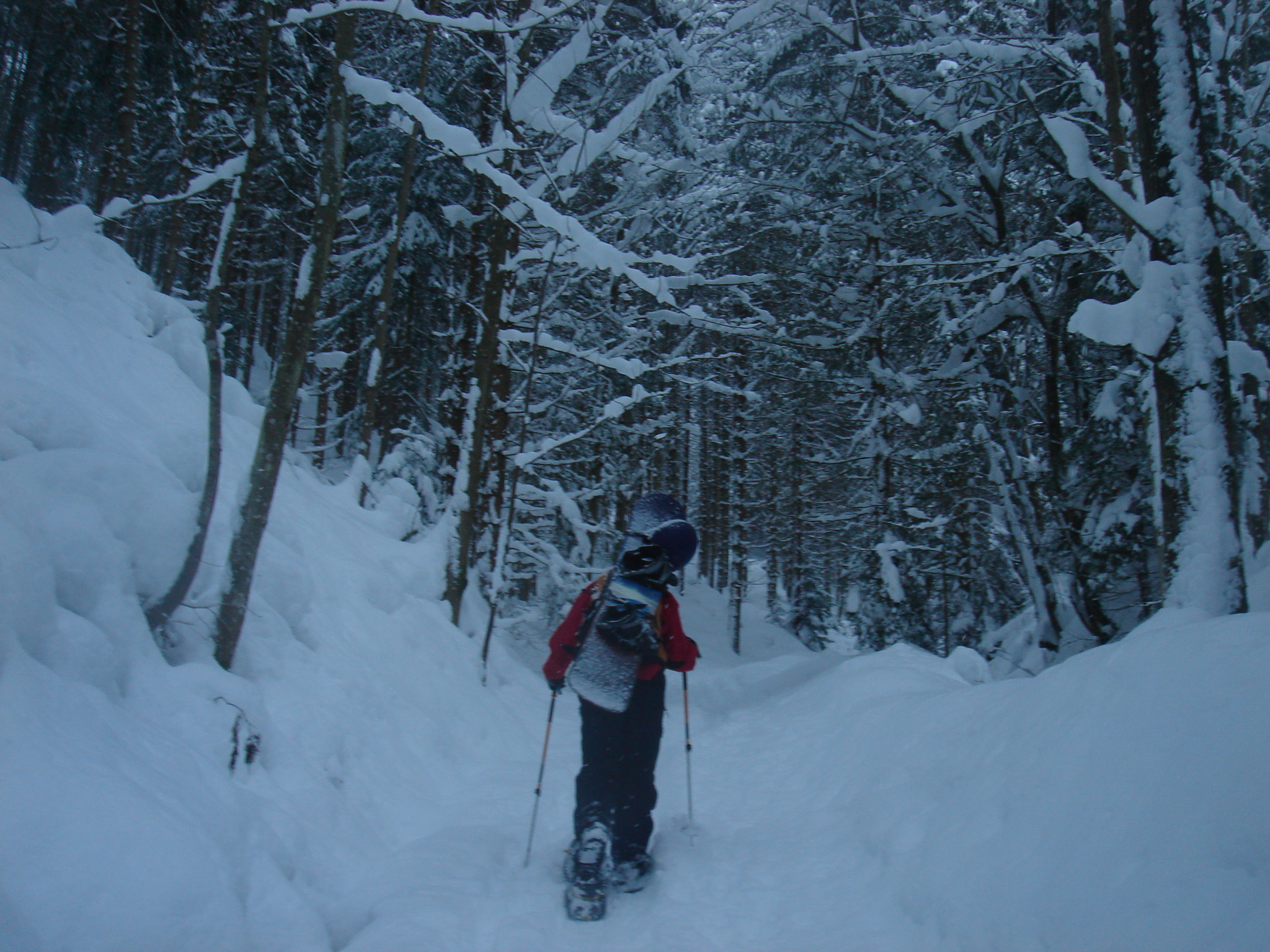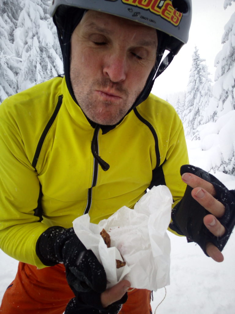 Ein paar sichere Skitouren gibt es in der Steiermark auch bei einer Fünfer-Lawinenwarnstufe. Dazu gehört auch der Kreuzschober bei Mürzzuschlag, eine Tour, die die Einheimischen nur noch unter der Woche (und dann ganz früh) gehen, weil sonst der Ansturm zu gross ist. Wir, Ben, Dom und ich wagen es heute. Es schneit, was sonst, das tut es jetzt in der Gegend schon seit einer Woche. Der Parkplatz beim Gehöft im Eichhorntal ist gut geräumt und kostet 2,5 Euro. Die Schneelage auch im Tal ist beachtlich, im Laufe der Tour soll sie deutlich höher werden. Am Parkplatz sind gut 15 Autos, doppelt so viele haben gut Platz und die ersten kommen bereits ins Tal. Talaufwärts geht es neben der Strasse zu einem weiteren Bauern und dann über feine Wiesen weiter. Dazwischen sind ein paar kurze Hohlwege/Forststrassen die bald wieder in recht schmale Wiesenhänge übergehen. Es wirkt wie ein altes Skigebiet, dass sich da Richtung Gipfel zieht. Dazwischen umgehen und überklettern wir zwei umgestürtze Bäume und dann wird es kurz vor der Kaarl-Hütte ein wenig flacher. Der frische Pulverschnee liegt hier deutlich über einem Meter. Die Hütte ist am Wochenende bewirtschaftet und schaut mit den meterlangen Eiszapfen idylisch aus. Wir kriegen heute nichts und so geht es noch hundert Meter bis zum Gipfel und meine Ambitionen zu spuren enden kurz nach der Hütte. Zu viel Schnee, zu steil, zu anstrengend. Es schneit und schneit, dazwischen haben wir sogar kurz mal den blauen Himmel gesehen und immer wieder die Sonne hinter den Wolken und jetzt fallen wieder dicke Flocken. Wir machen eine gute Rast bei der Wächte beim Gipfelkreuz: Tee, selbstgemachten Lebkuchen und Müsliriegel und Pocket Coffee. Ein erfahrener Tourengeher stellt ein Kerzerl für einen verstorbenen Skitourenkollegen auf, (ob wir das auch mal füreinander machen werden?) Und dann gehts durch den hüfthohen zerfahrenen Tiefschnee Richtung Tal. Für Dom mit den Schneeschuhen und dem Board endet hier aber die Plagerei nicht. Das Flachstück bei der Kaarlhütte ist mit dem Snowboard heute nicht zu fahren und einmal versunken wird es richtig anstrengend weiterzukommen. Mit den Skiern geht es uns besser. Wir kommen in der Spur und mit Schwung gut voran. Die Wiesen sind super zu fahren, weil der Pulver selbst dort wo er zusammengeschoben ist so weich und fluffig ist. Die Schneequalität bleibt bis unten bestens. Ben und ich graben noch ein Schneeprofil und bewundern fast 50 cm weichen leichten Pulver auf 20 cm gebundenem Schnee, keine verharschten Schichtgrenzen, nur unten gibt es eine auskristalisierte Bodenschicht. Nach fast vier Stunden sind wir wieder wohlbehalten am Parkplatz.