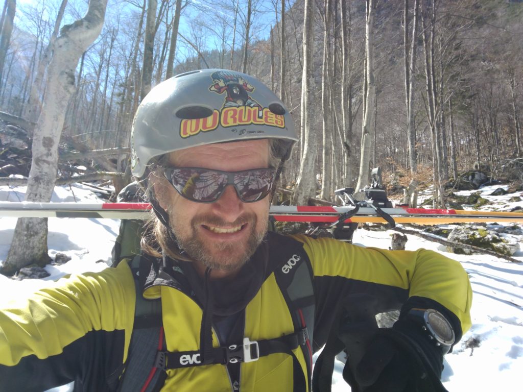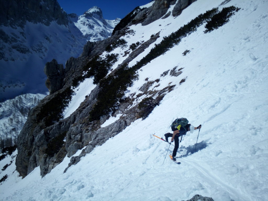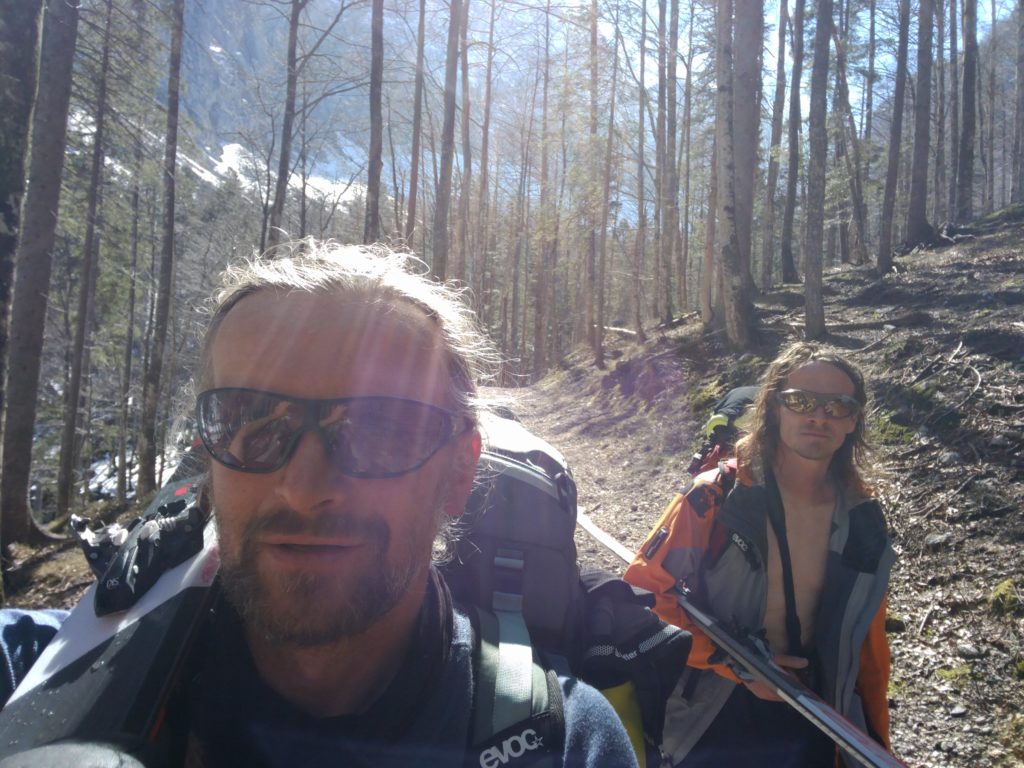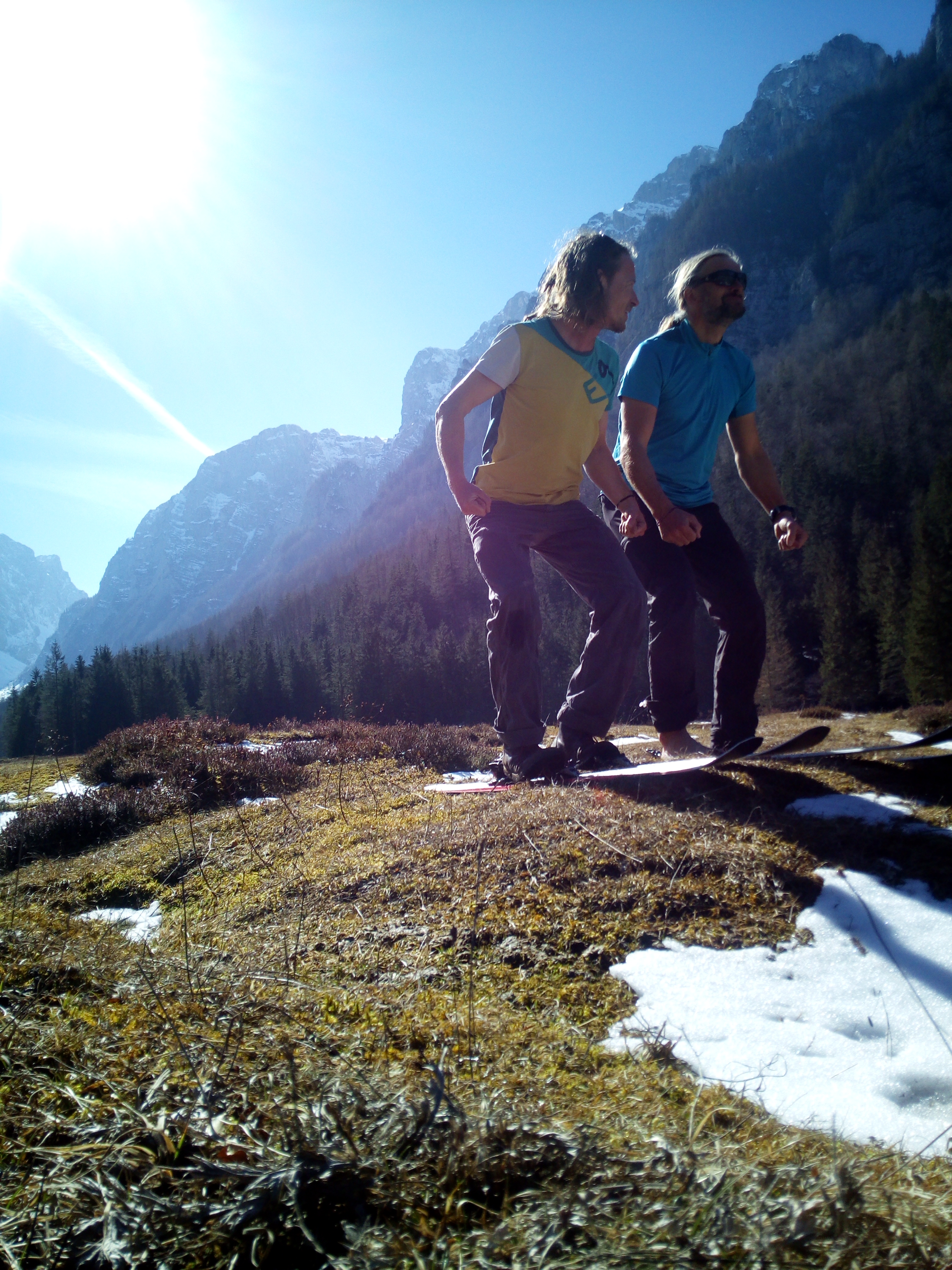 Am vierten und letzten Tag versuchten wir noch mit Steigeisen und Pickel den Triglav und stiegen die ersten hundert Höhenmeter am Klettersteig auf. An der einer Flanke, in der das Stahlseil eingeschneit und die ersten Felsen zu überwinden waren, kehrten wir um. Zu ungewohnt, zu unsicher das Gehen mit Steigeisen am Feld, zu Unklar ob der Pickel im dünnen Eis hält oder nicht. Nach dem Abstieg zurück zur Hütte packten wir um und fuhren über die gestrige Aufstiegsspur durch die 38 Grad steile und noch immer unverspurte Flanke hinunter Richtung Krma Tal. Nach der zweiten Steilstufe legen wir in der Prgarca (einer weiteren unbewirtschafteten Hütte) noch eine letzte Suppenpause aus, weil unsere Füße von der langen Abfahrt schon ordendlich weich waren. Für ein paar Slowenen gab es noch Kaffee und dann ging es die zweiten 900 Höhenmeter zum Parkplatz. An zwei Stellen war Skitragen angesagt und beim letzten Parkplatz war dann die Skifahrerei zu Ende. Vor dort wurde Ben von den drei Slowenen dann mit hinaus zum Auto genommen, auf den sechs verbleibenden Kilometern war in den vier Tagen der Frühling eingekehrt.