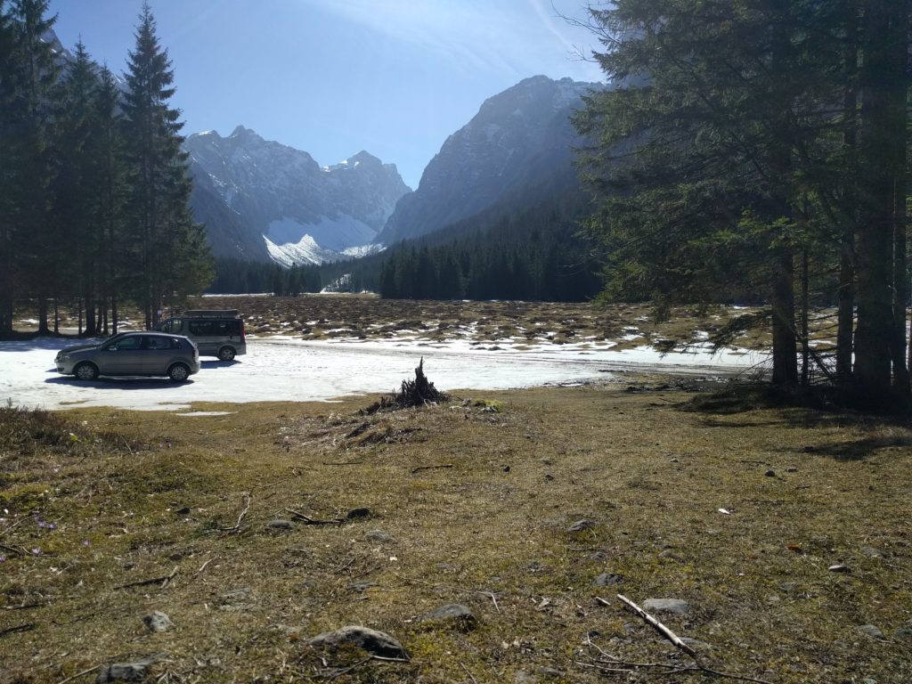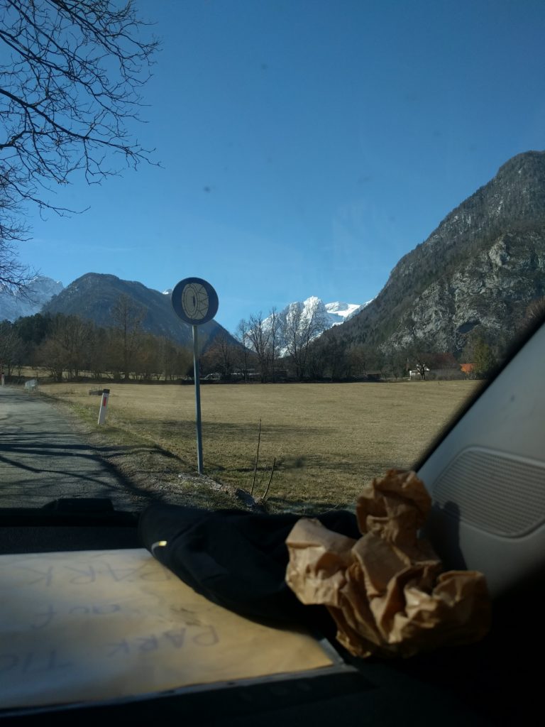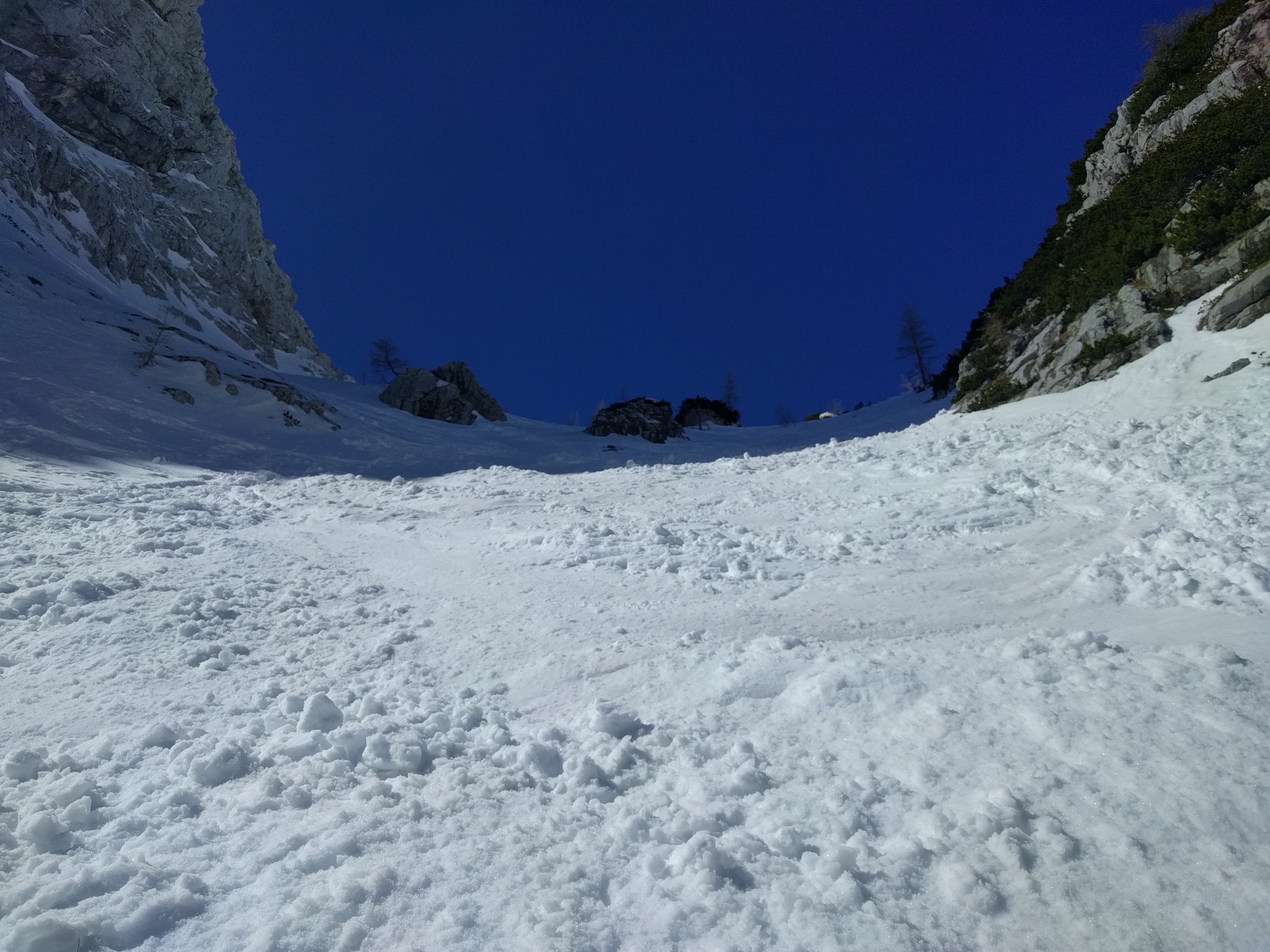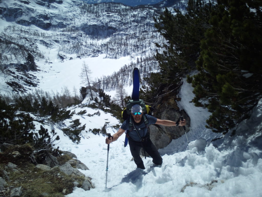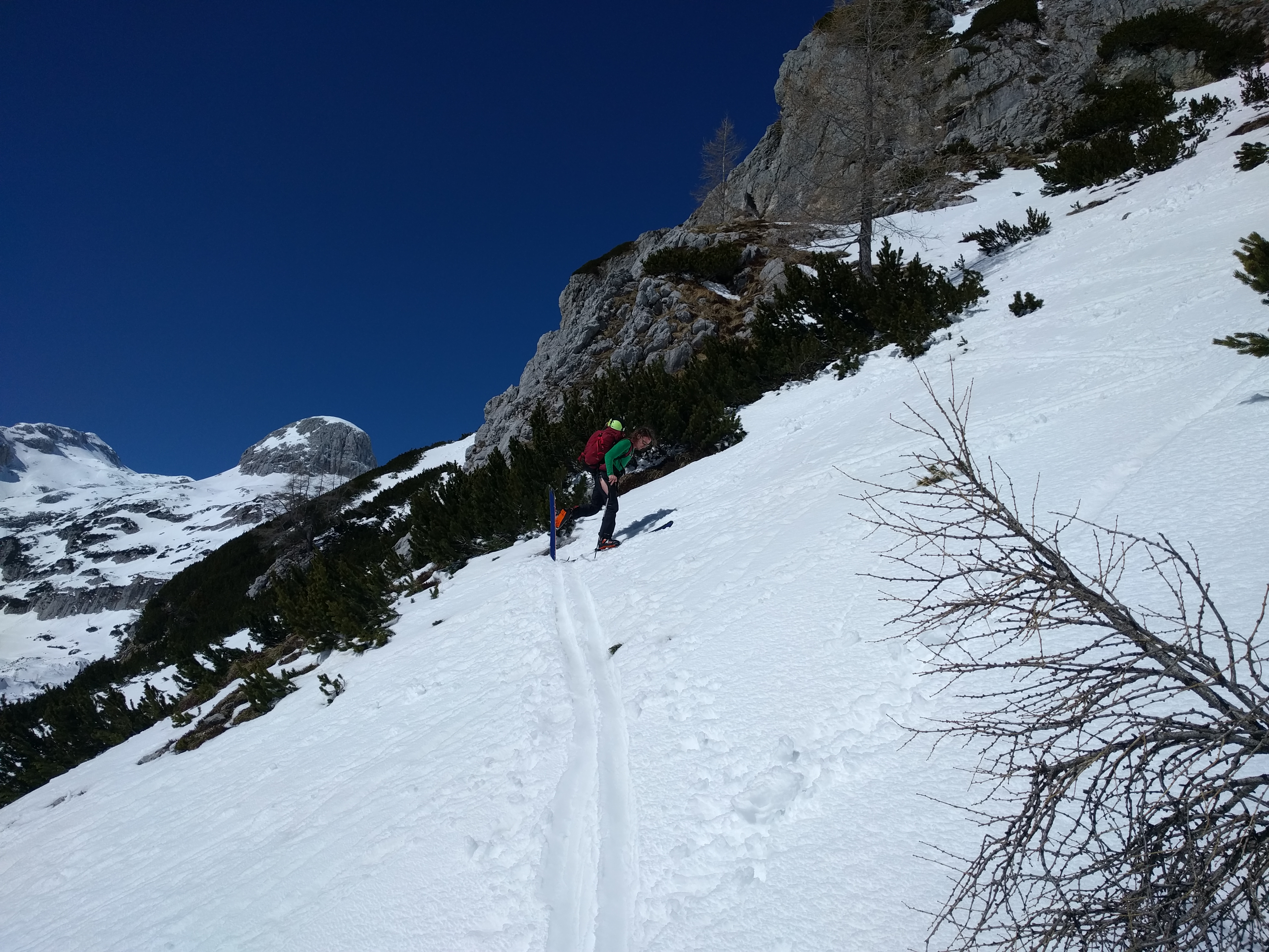 Am vierten und letzten Tag versuchten wir noch mit Steigeisen und Pickel den Triglav und stiegen die ersten hundert Höhenmeter am Klettersteig auf. An der einer Flanke, in der das Stahlseil eingeschneit und die ersten Felsen zu überwinden waren, kehrten wir um. Zu ungewohnt, zu unsicher das Gehen mit Steigeisen am Feld, zu Unklar ob der Pickel im dünnen Eis hält oder nicht. Nach dem Abstieg zurück zur Hütte packten wir um und fuhren über die gestrige Aufstiegsspur durch die 38 Grad steile und noch immer unverspurte Flanke hinunter Richtung Krma Tal. Nach der zweiten Steilstufe legen wir in der Prgarca (einer weiteren unbewirtschafteten Hütte) noch eine letzte Suppenpause aus, weil unsere Füße von der langen Abfahrt schon ordendlich weich waren. Für ein paar Slowenen gab es noch Kaffee und dann ging es die zweiten 900 Höhenmeter zum Parkplatz. An zwei Stellen war Skitragen angesagt und beim letzten Parkplatz war dann die Skifahrerei zu Ende. Vor dort wurde Ben von den drei Slowenen dann mit hinaus zum Auto genommen, auf den sechs verbleibenden Kilometern war in den vier Tagen der Frühling eingekehrt.