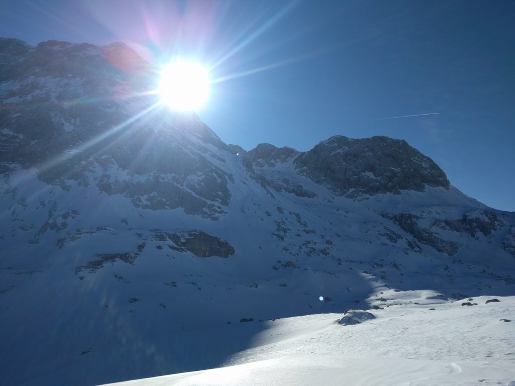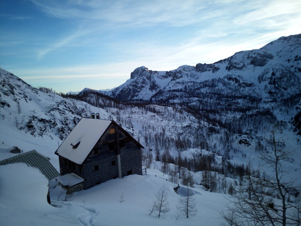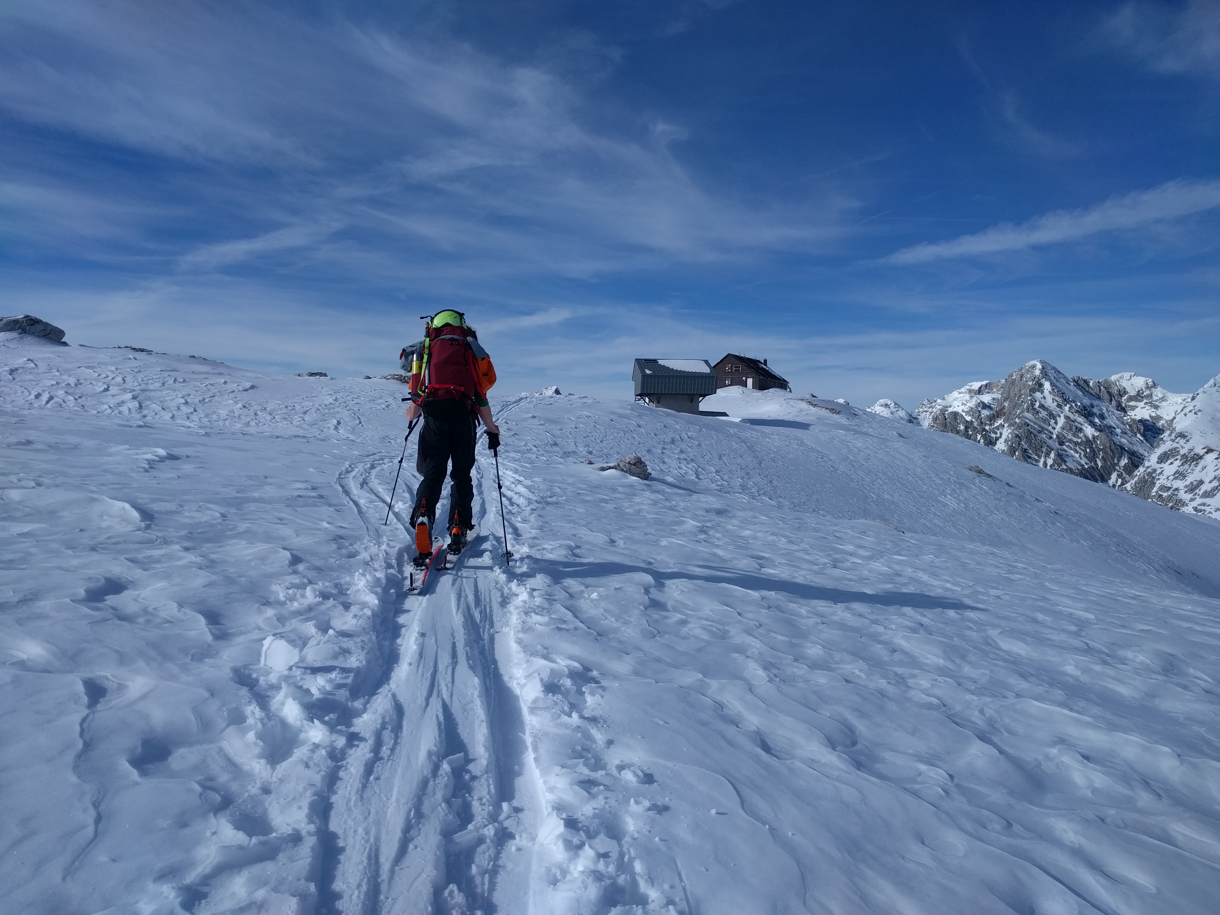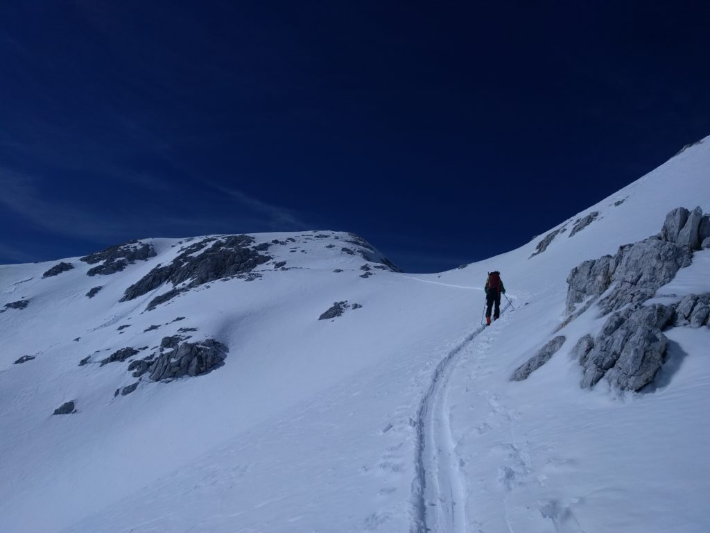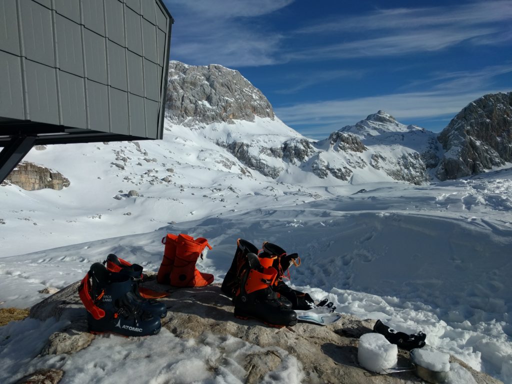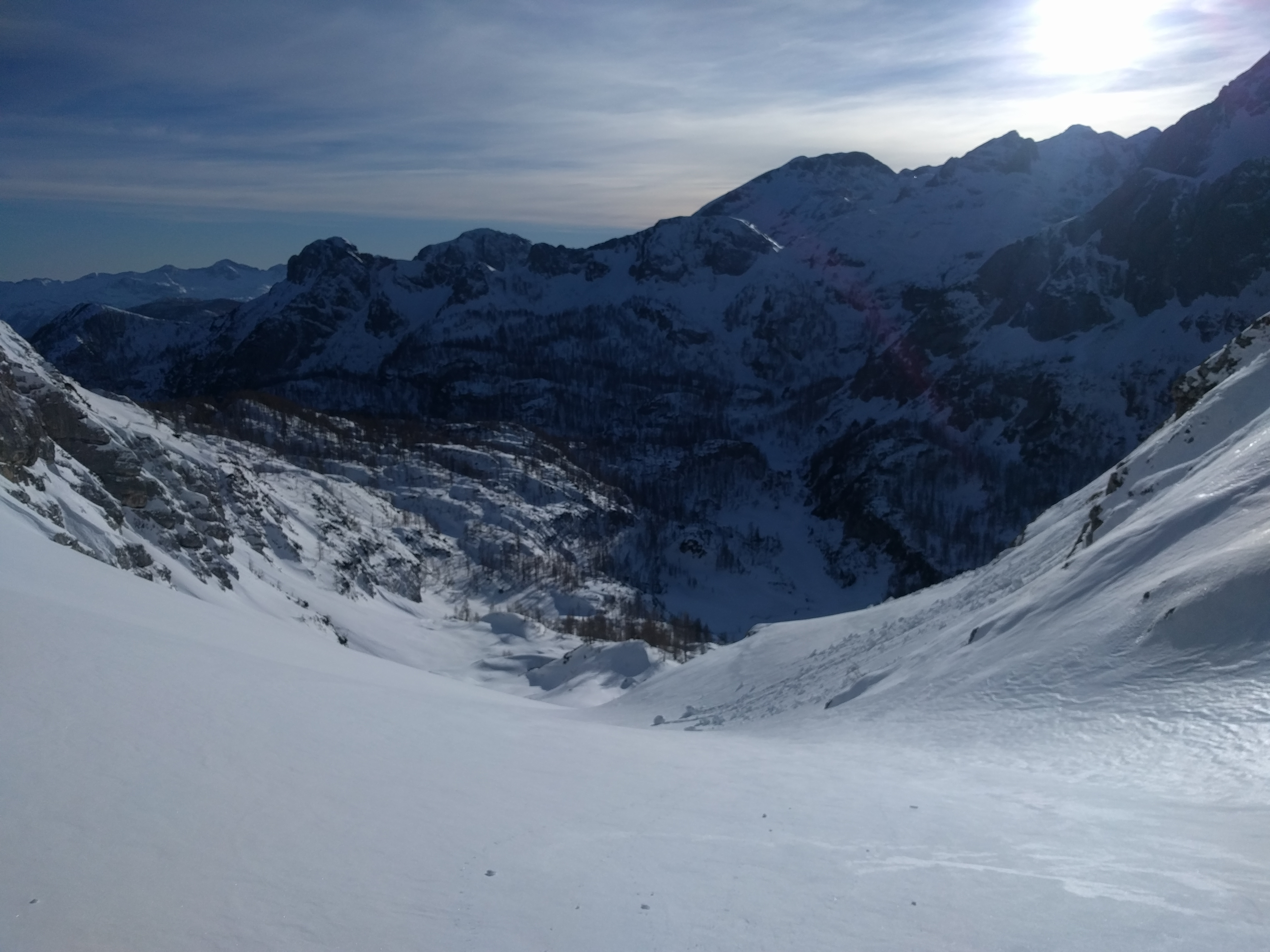 Ben und ich sind am erst Donnerstag in Graz gestartet und zu Mittag ging es im verschneiten Krma Tal los. Unser Parkplatz war einige Kilometer vor unserem geplanten (letzten) Parkplatz, weil die tiefe Spurrillen und der frische Schnee eine Weiterfahrt verunmöglichten. Die ersten drei Stunden stiegen wir im Talboden hinauf und dann verengte sich das Tal. Nach Norden stieg es steil zum Triglav hin und wir orientierten uns Richtung Westen zum Bojinska Vratca, der Scharte die uns zum ersten Winterraum in der Vodnikov Dom bringen sollte. Der Anstieg war im Gegensatz zu dem auf den Trigalv unverspurt. Mit den 15 Kilo Gepäck, dem jetzt steiler werdenden Anstieg und dem Neuschnee, der auf der Nordseite noch perfekt konserviert war, wurde der Anstieg auf die 1986 Meter hohe Scharte ganz schön anstrengend. Wegen dem Triebschnee orientierten wir uns auf die verharschte Südseite und kraxelten die letzten Meter wieder mal mit den Skiern am Rücken hinauf. Der erste Blick hinaus auf die Julischen Alpen war beeindruckend und überwältigend. Die Abfahrt hinunter zu Hütte hingegen gestaltete sich im Plattenpulver übel. Der schwere Rucksack erschwert das Abfahren enorm und bremst das Vergnügen. Die erste Nacht war kalt aber ok. Ich hatte meine Ersatzsocken im Auto ausgestreut, was mir anfänglich feuchte Füße bescherte und nach vier Tagen mehr Geruch anlegte als geplant.