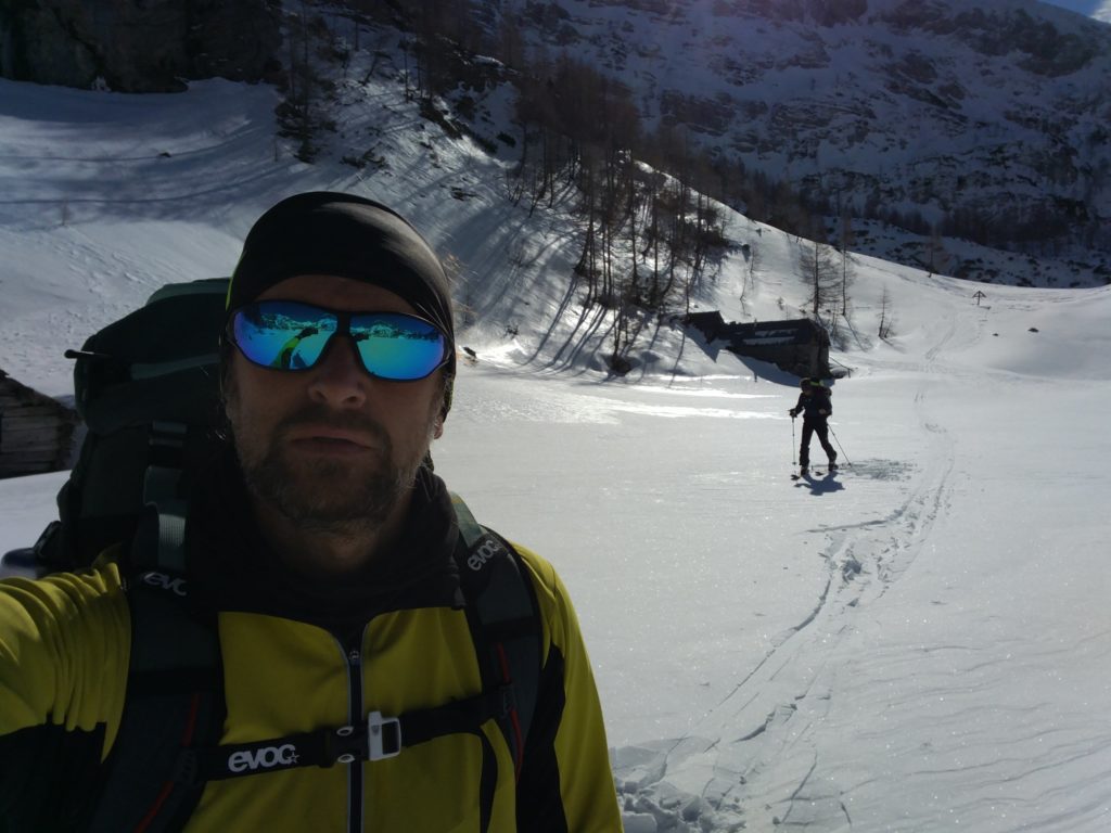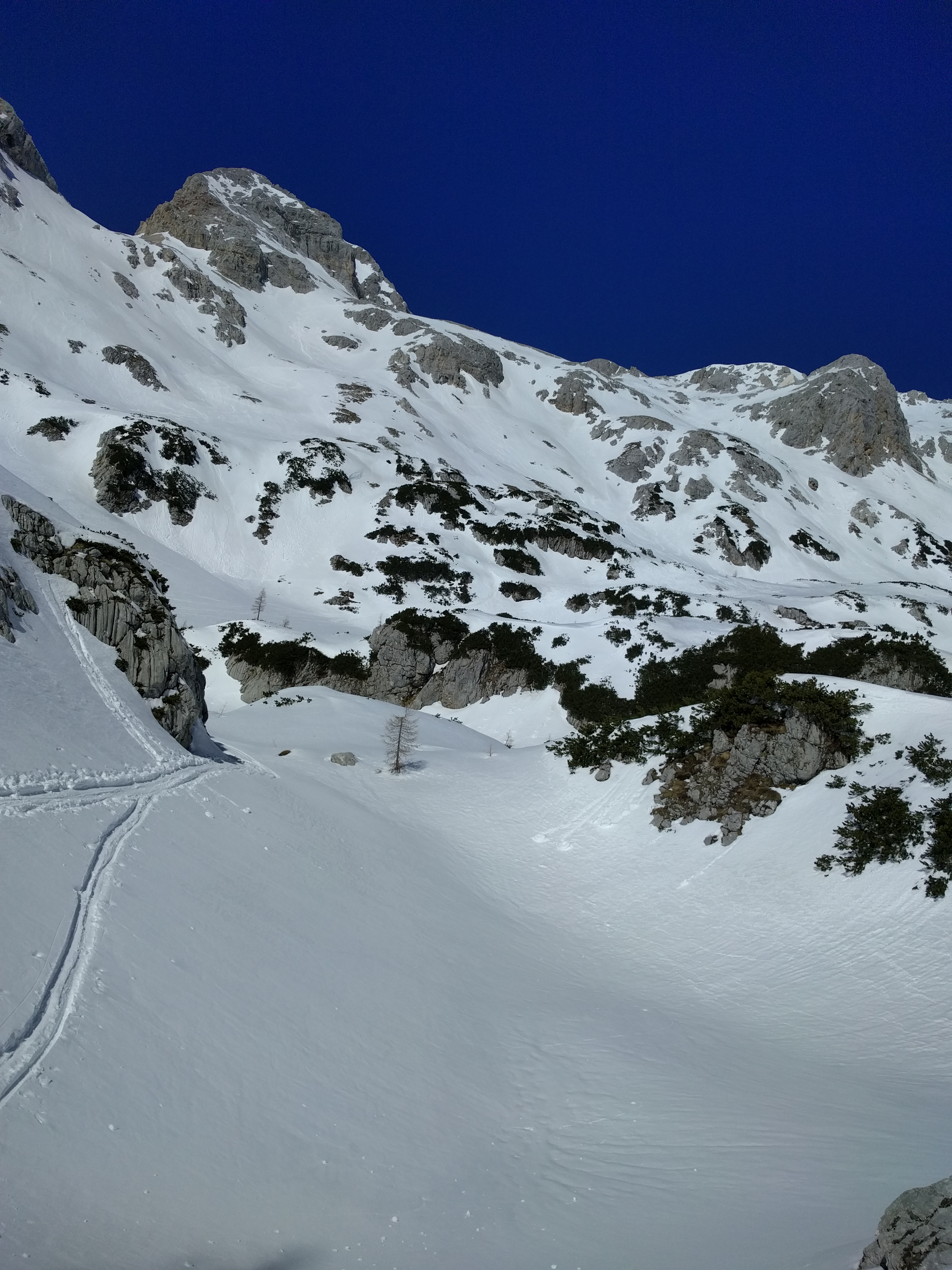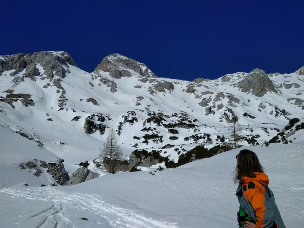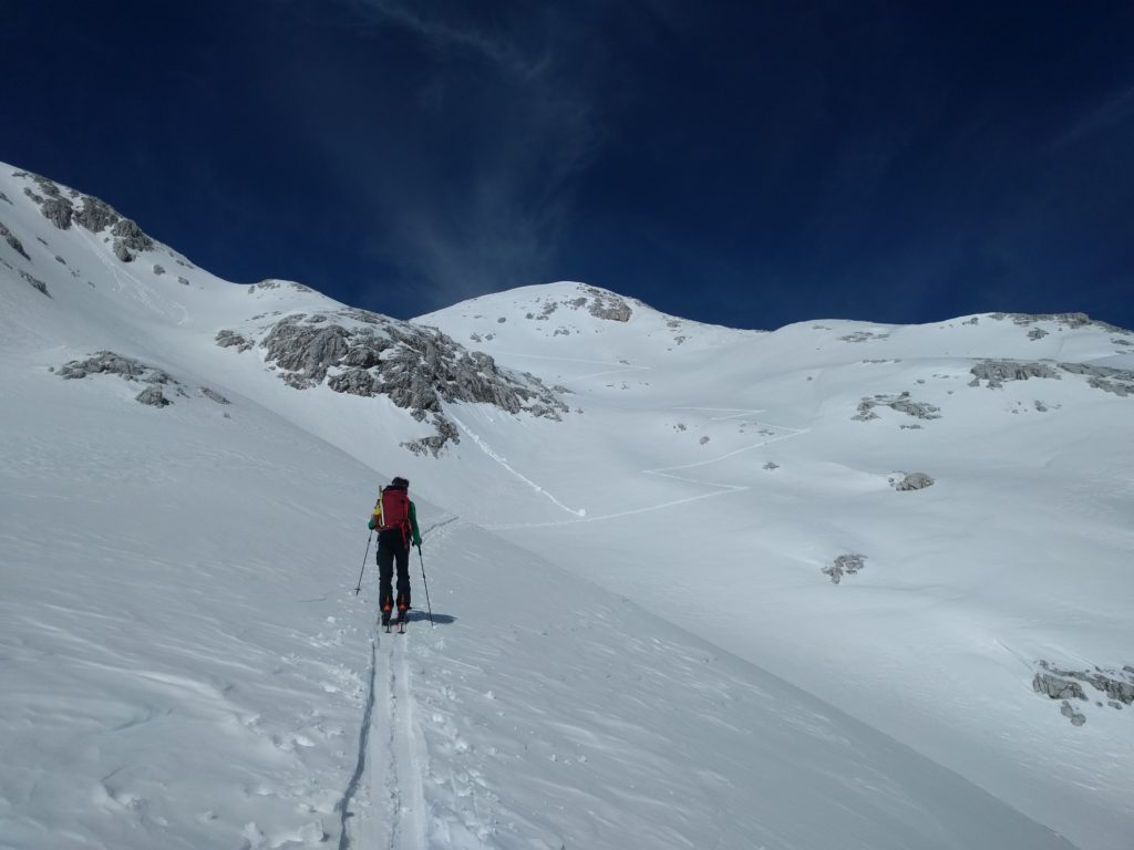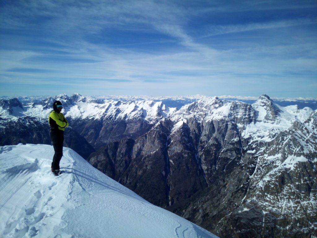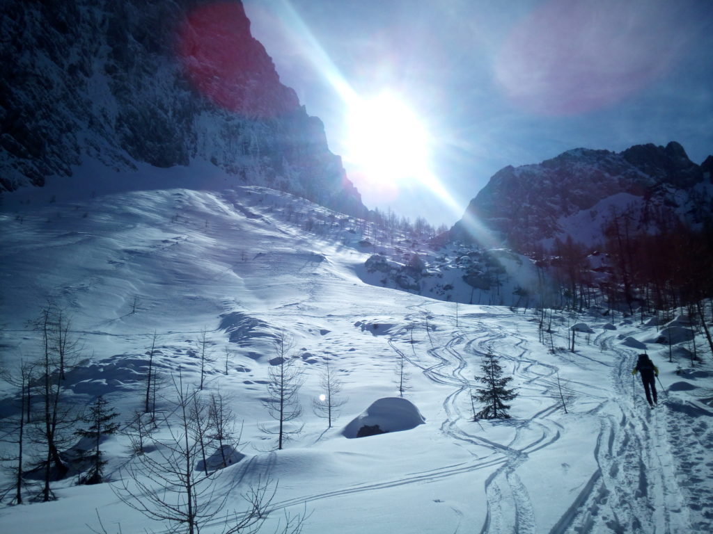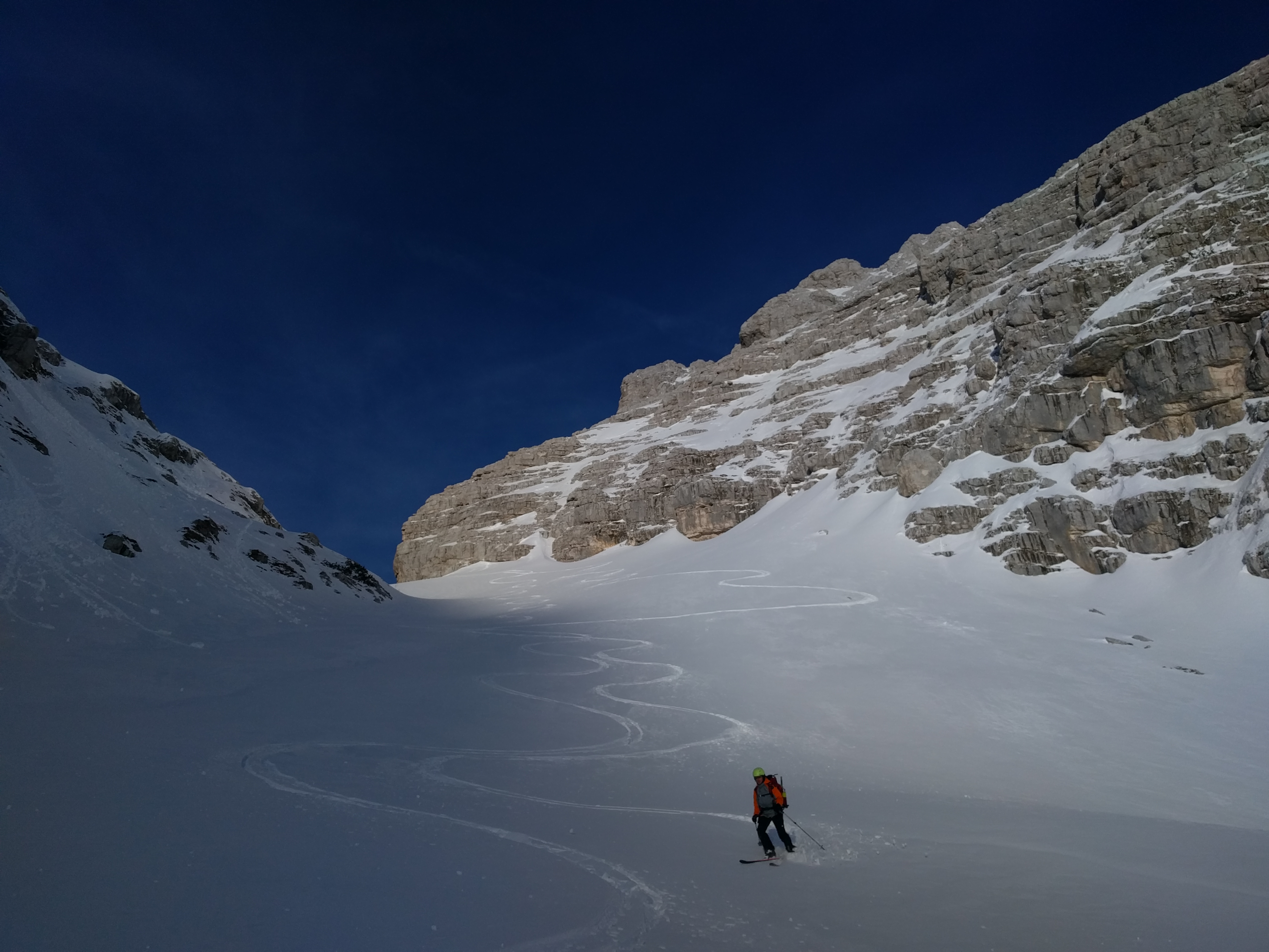 Ben und ich sind am erst Donnerstag in Graz gestartet und zu Mittag ging es im verschneiten Krma Tal los. Unser Parkplatz war einige Kilometer vor unserem geplanten (letzten) Parkplatz, weil die tiefe Spurrillen und der frische Schnee eine Weiterfahrt verunmöglichten. Die ersten drei Stunden stiegen wir im Talboden hinauf und dann verengte sich das Tal. Nach Norden stieg es steil zum Triglav hin und wir orientierten uns Richtung Westen zum Bojinska Vratca, der Scharte die uns zum ersten Winterraum in der Vodnikov Dom bringen sollte. Der Anstieg war im Gegensatz zu dem auf den Trigalv unverspurt. Mit den 15 Kilo Gepäck, dem jetzt steiler werdenden Anstieg und dem Neuschnee, der auf der Nordseite noch perfekt konserviert war, wurde der Anstieg auf die 1986 Meter hohe Scharte ganz schön anstrengend. Wegen dem Triebschnee orientierten wir uns auf die verharschte Südseite und kraxelten die letzten Meter wieder mal mit den Skiern am Rücken hinauf. Der erste Blick hinaus auf die Julischen Alpen war beeindruckend und überwältigend. Die Abfahrt hinunter zu Hütte hingegen gestaltete sich im Plattenpulver übel. Der schwere Rucksack erschwert das Abfahren enorm und bremst das Vergnügen. Die erste Nacht war kalt aber ok. Ich hatte meine Ersatzsocken im Auto ausgestreut, was mir anfänglich feuchte Füße bescherte und nach vier Tagen mehr Geruch anlegte als geplant.