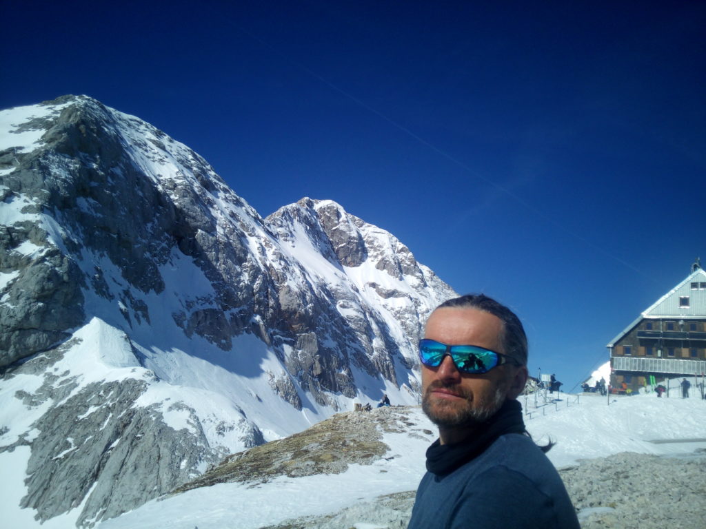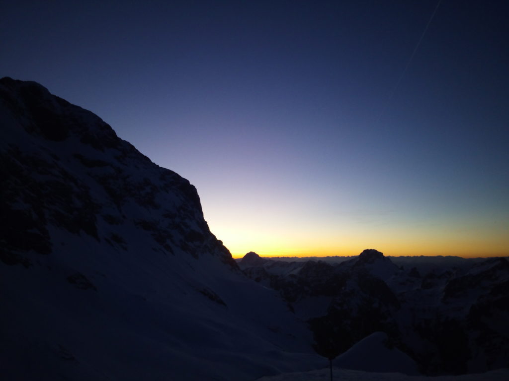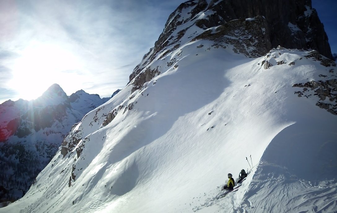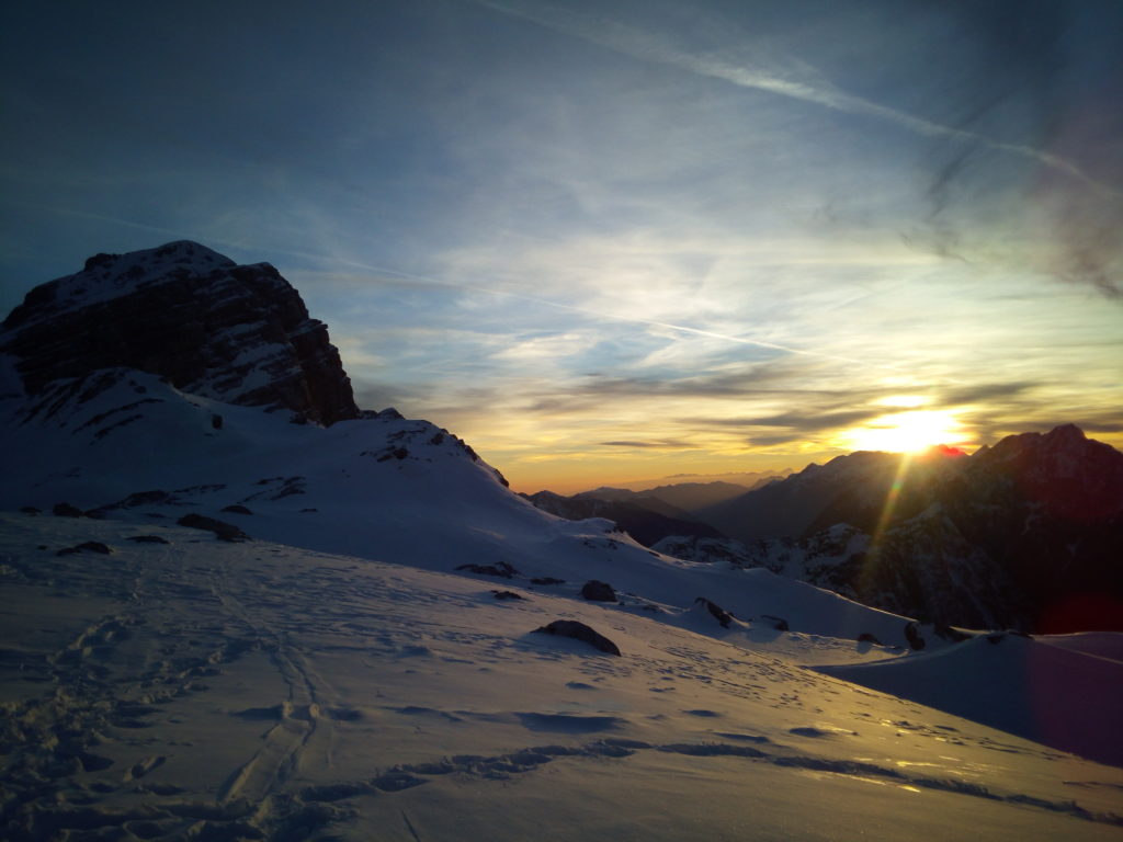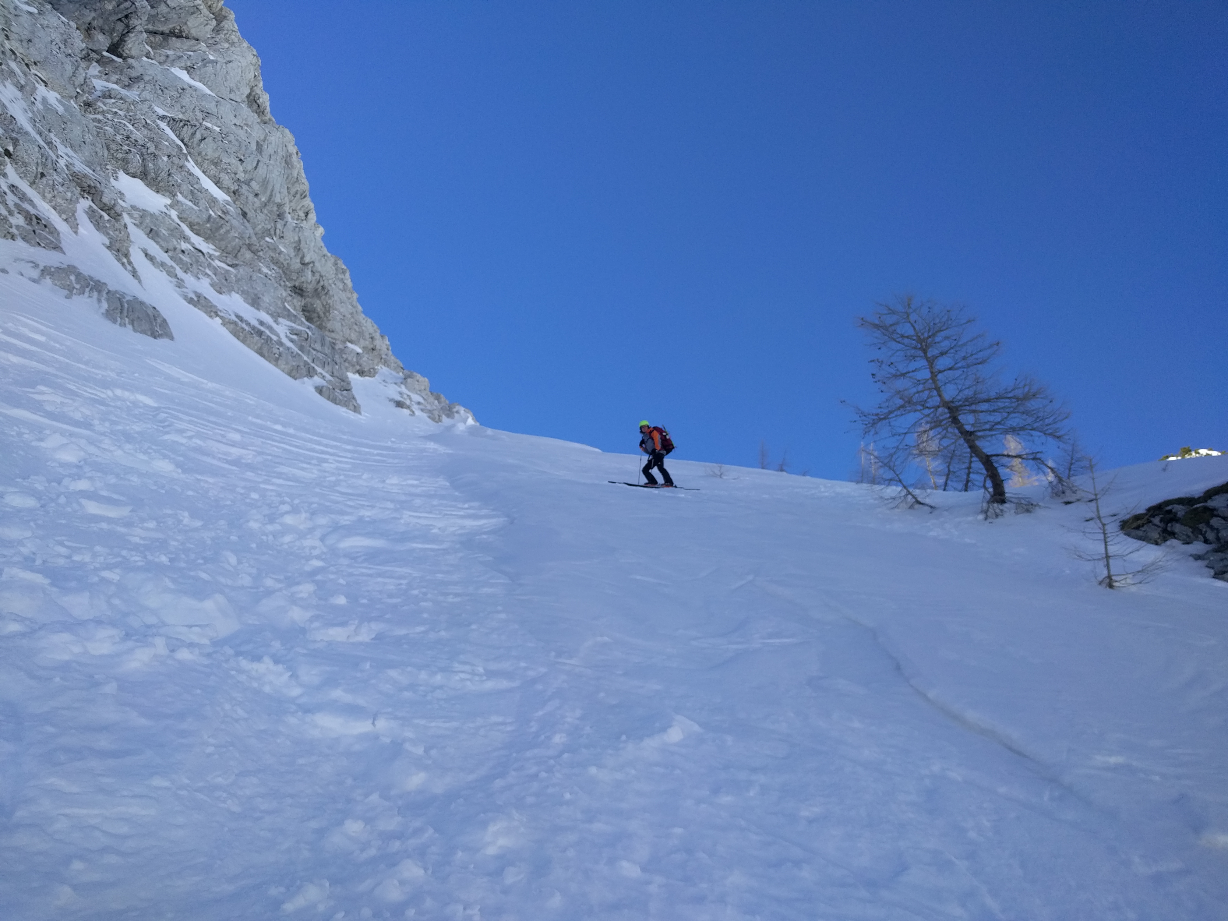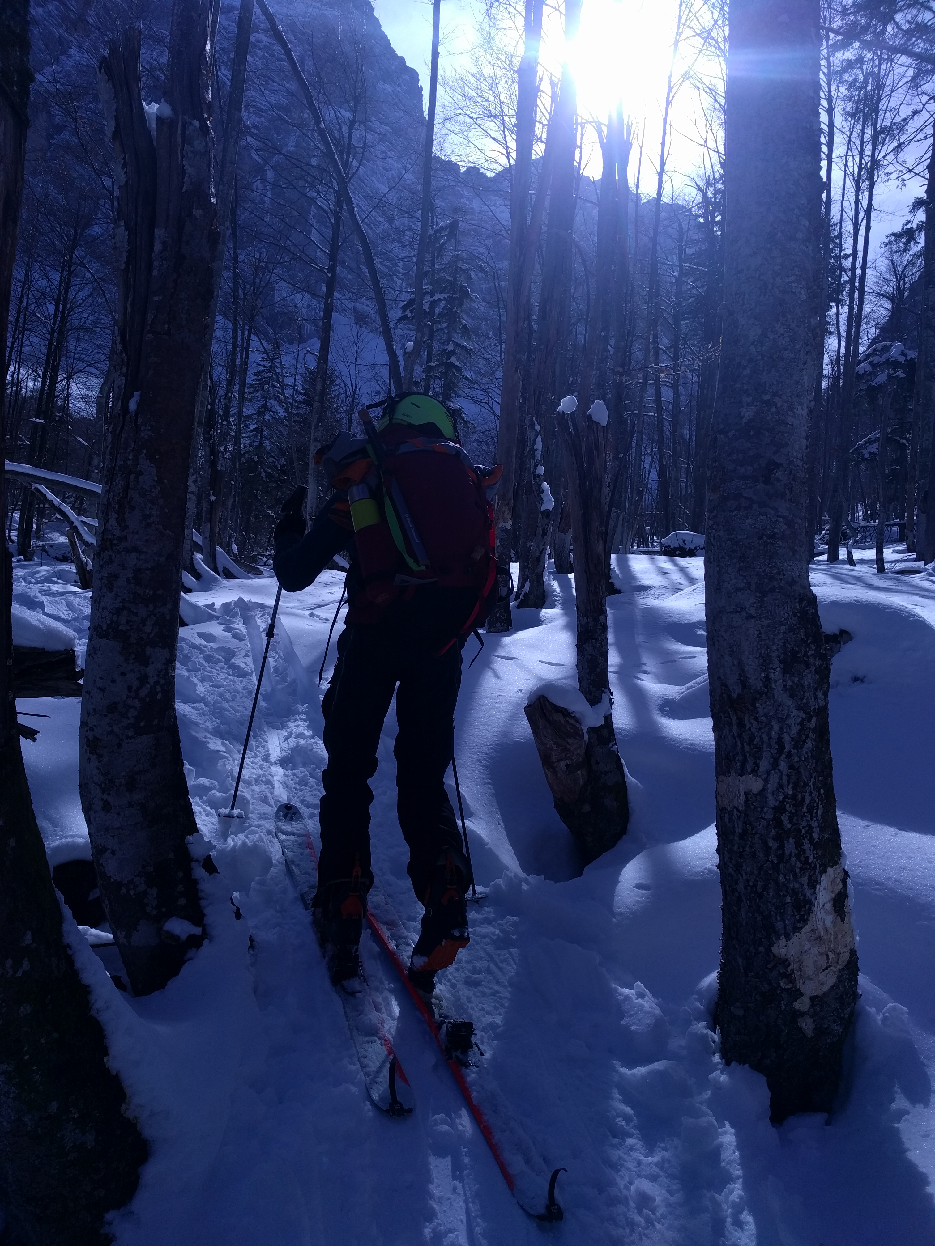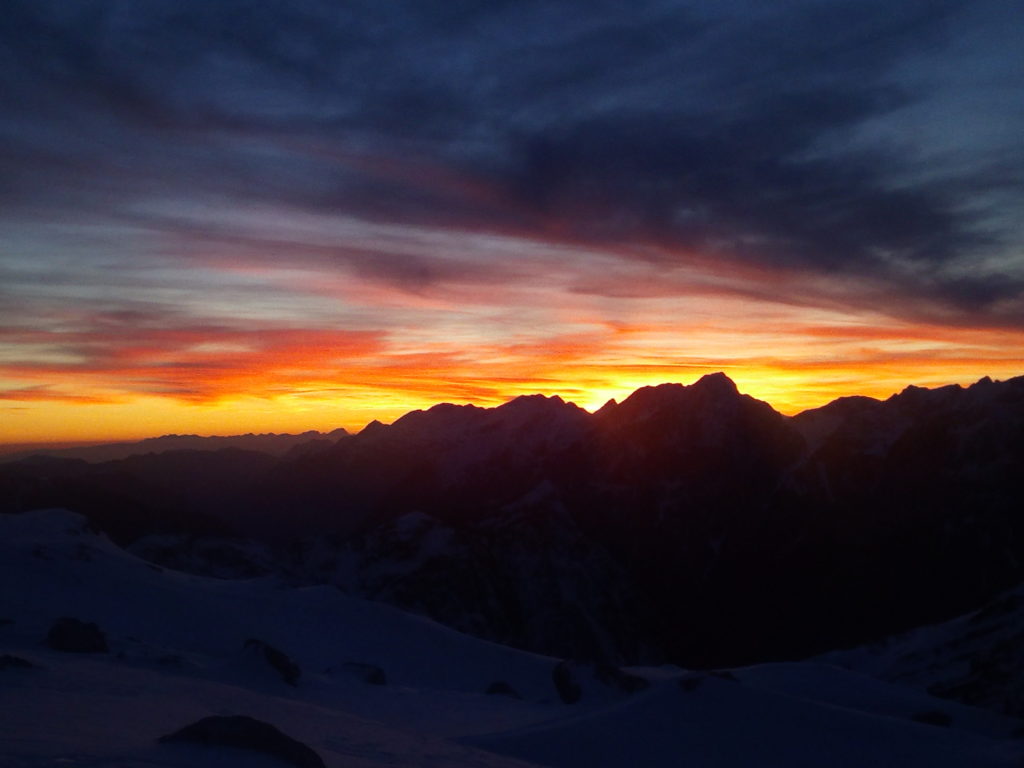 Ben und ich sind am erst Donnerstag in Graz gestartet und zu Mittag ging es im verschneiten Krma Tal los. Unser Parkplatz war einige Kilometer vor unserem geplanten (letzten) Parkplatz, weil die tiefe Spurrillen und der frische Schnee eine Weiterfahrt verunmöglichten. Die ersten drei Stunden stiegen wir im Talboden hinauf und dann verengte sich das Tal. Nach Norden stieg es steil zum Triglav hin und wir orientierten uns Richtung Westen zum Bojinska Vratca, der Scharte die uns zum ersten Winterraum in der Vodnikov Dom bringen sollte. Der Anstieg war im Gegensatz zu dem auf den Trigalv unverspurt. Mit den 15 Kilo Gepäck, dem jetzt steiler werdenden Anstieg und dem Neuschnee, der auf der Nordseite noch perfekt konserviert war, wurde der Anstieg auf die 1986 Meter hohe Scharte ganz schön anstrengend. Wegen dem Triebschnee orientierten wir uns auf die verharschte Südseite und kraxelten die letzten Meter wieder mal mit den Skiern am Rücken hinauf. Der erste Blick hinaus auf die Julischen Alpen war beeindruckend und überwältigend. Die Abfahrt hinunter zu Hütte hingegen gestaltete sich im Plattenpulver übel. Der schwere Rucksack erschwert das Abfahren enorm und bremst das Vergnügen. Die erste Nacht war kalt aber ok. Ich hatte meine Ersatzsocken im Auto ausgestreut, was mir anfänglich feuchte Füße bescherte und nach vier Tagen mehr Geruch anlegte als geplant.