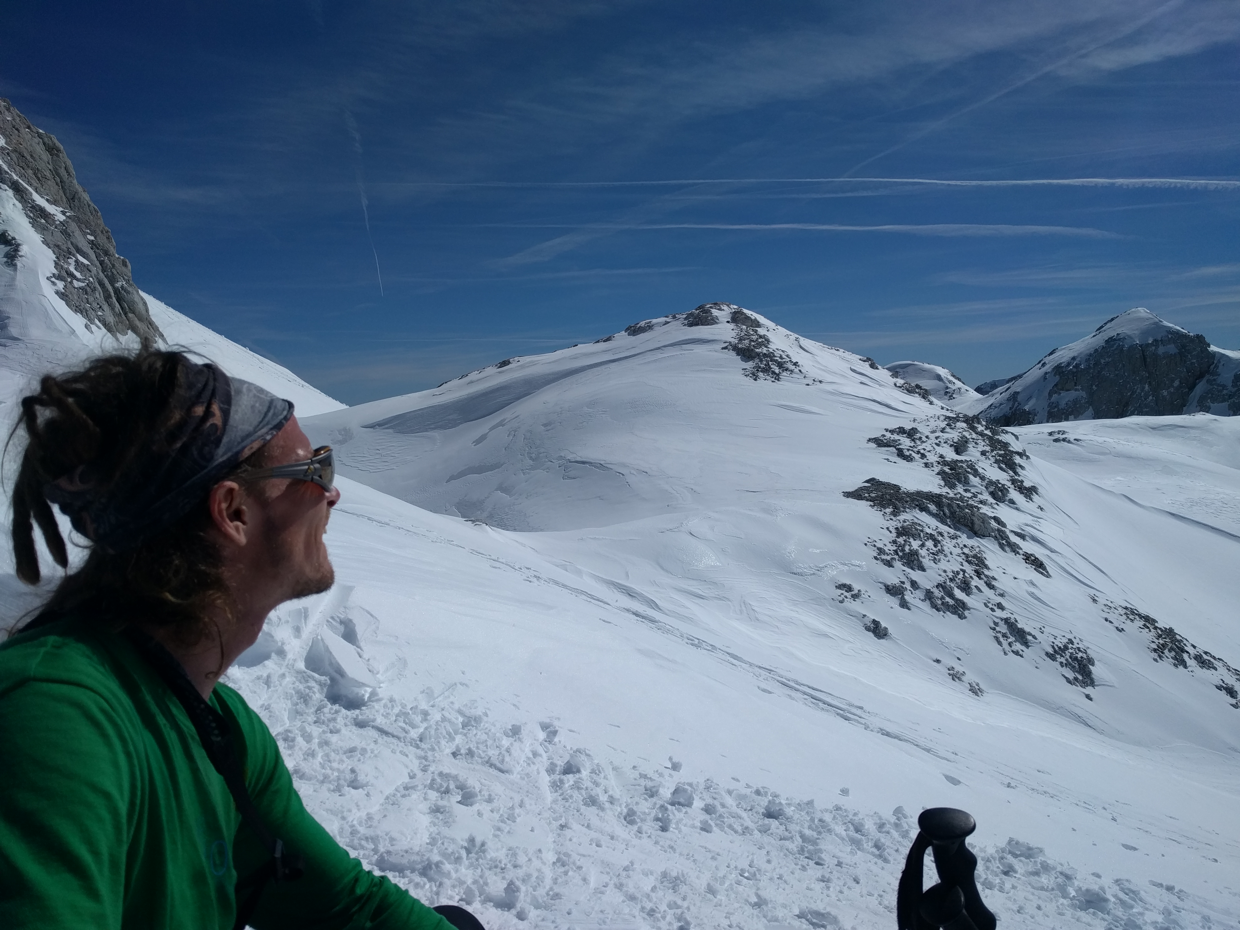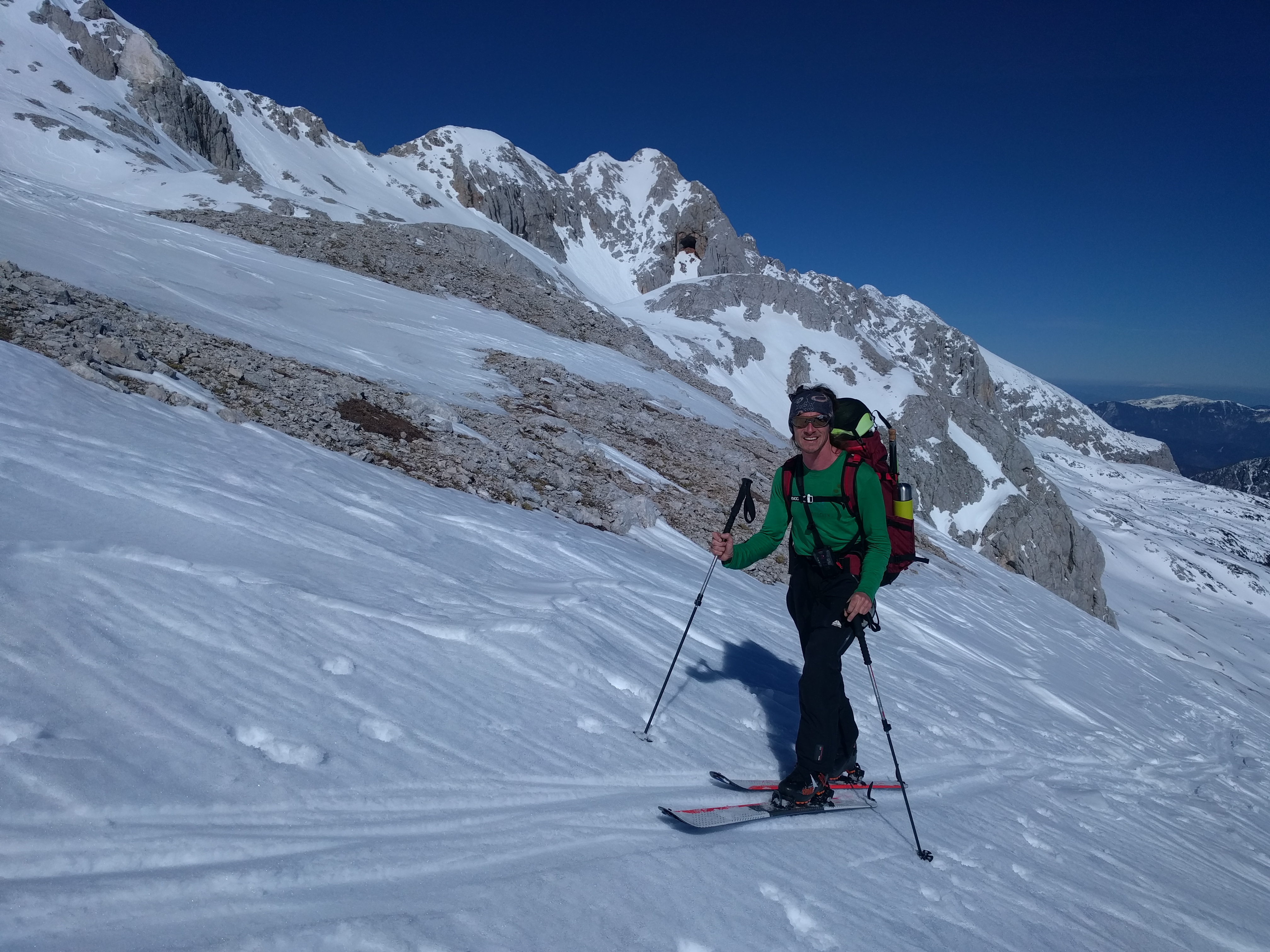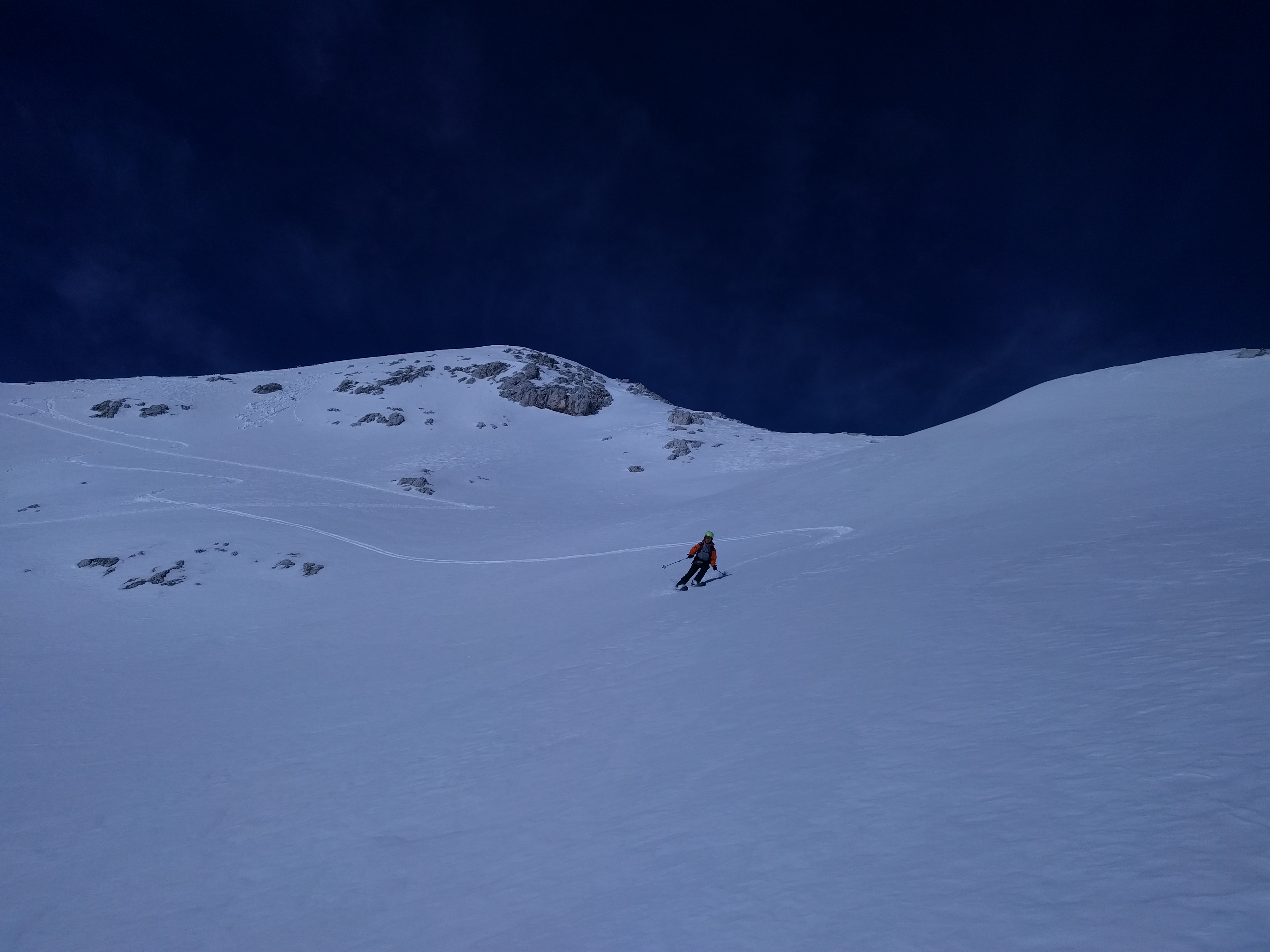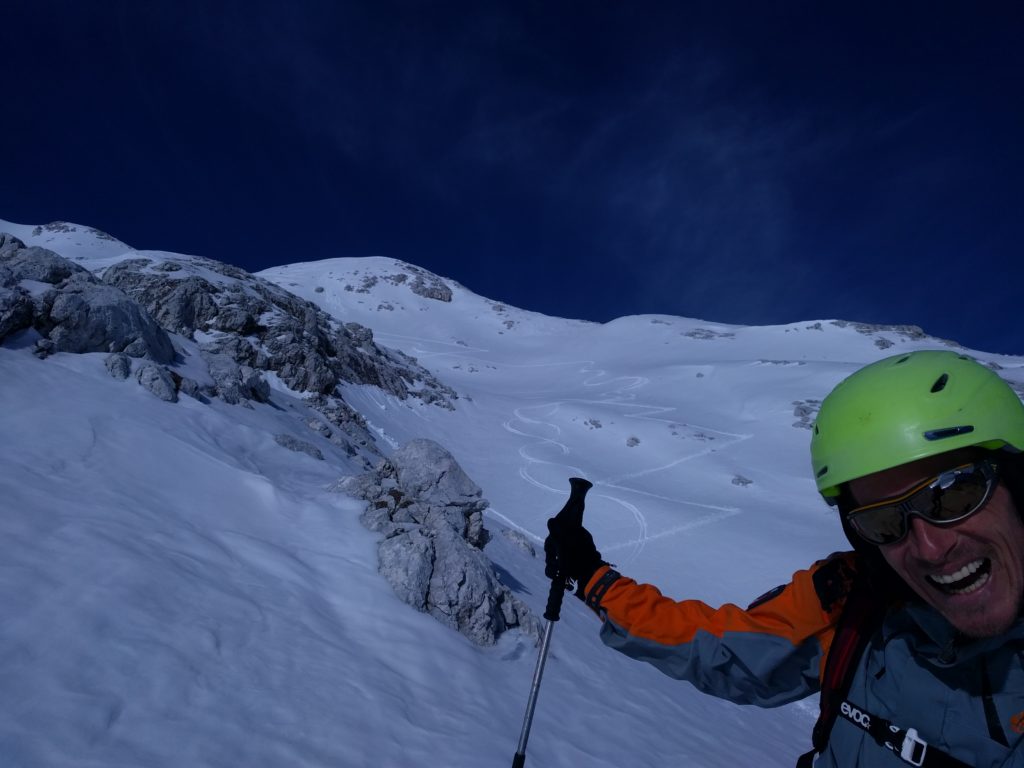 Am zweiten Tag ging es von Vodnikov Dom durch Veljo Polje die Velska Dolinas hinauf zur Hribarice-Scharte südöstlich des Zob Kanjavec zum Kanjavec. Eine wesentliche Erkenntnis verfestigte sich an diesem Tag, nämlich, dass die Hangneigungskarte des Alpenvereinaktiv in Slowenien teilweise bis zu zehn Grad unter den gemessenen und tatsächlichen Neigungen liegt. Eine Tatsache die bei Neuschnee sicherheitstechnisch einiges unmöglich macht, was vielleicht gut geplant war. Am Fuß des Kanjavec legten wir ein Materialdepot an und „flogen“ um viele Kilo erleichtert dem Gipfel entgegen. Oben war es „GEWALTIG“: kein Wind, eine Fernsicht vom Glockner bis zum Mittelmeer und rundherum steil ins Tal, … Wir wählten die südwestliche Abfahrtspur, die noch guten Firn und Abfahrtsspaß boten. Bei der weitere Abfahrt hinunter zur Prehodavci wurde der Schnee dann immer tiefer und diesmal kamen wir in der Nachmittagssonne bei der Schutzhütte an. Noch in der Sonne kochten wir, sammelten das Wasser aus den Schmelzpfützen, weil wir Gas sparen wollten und trockneten Socken, Leiberl und entspannten. Zum wieder einfach gutem Essen gab es das letzte Bier (danke Ben!). Bis zum Abend füllte sich die Hütte ganz gut, geschlafen haben wir trotzdem gut ;-)