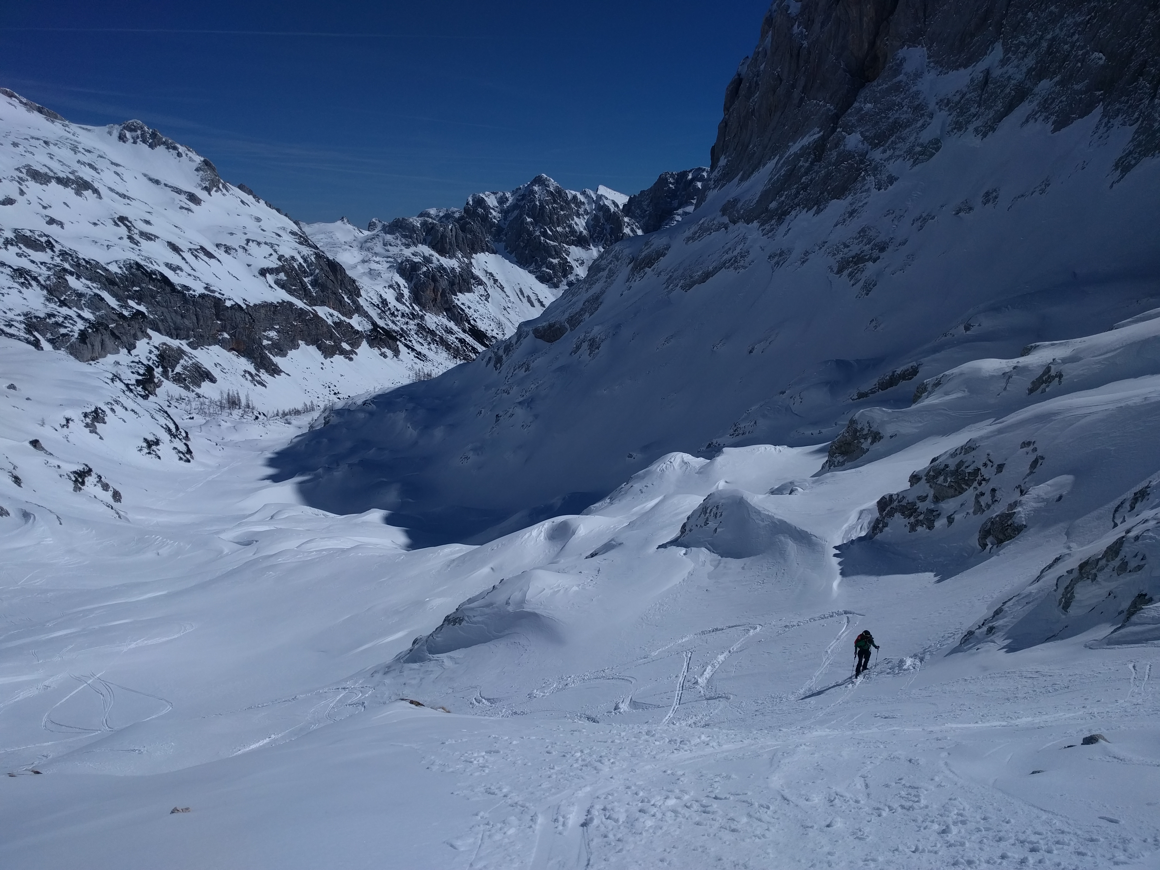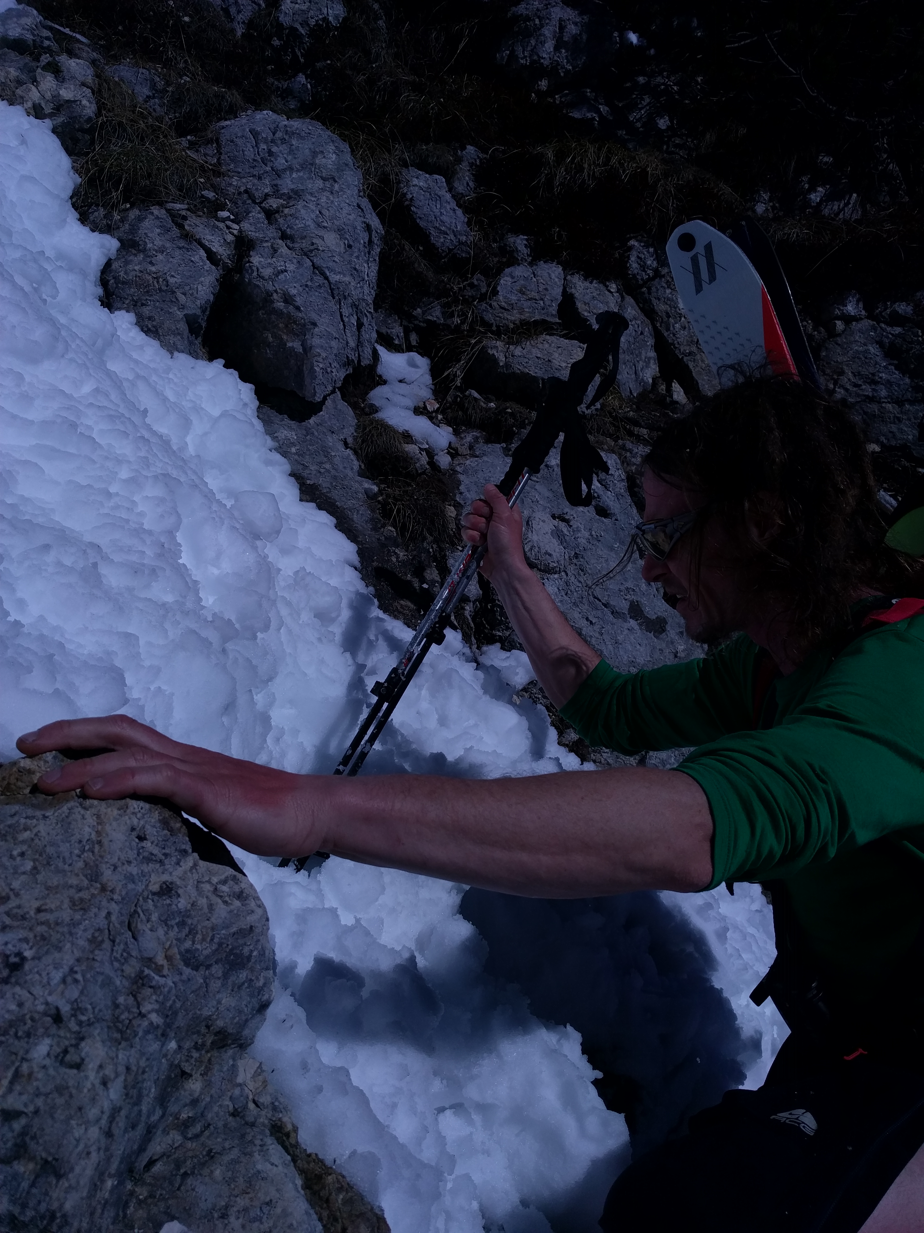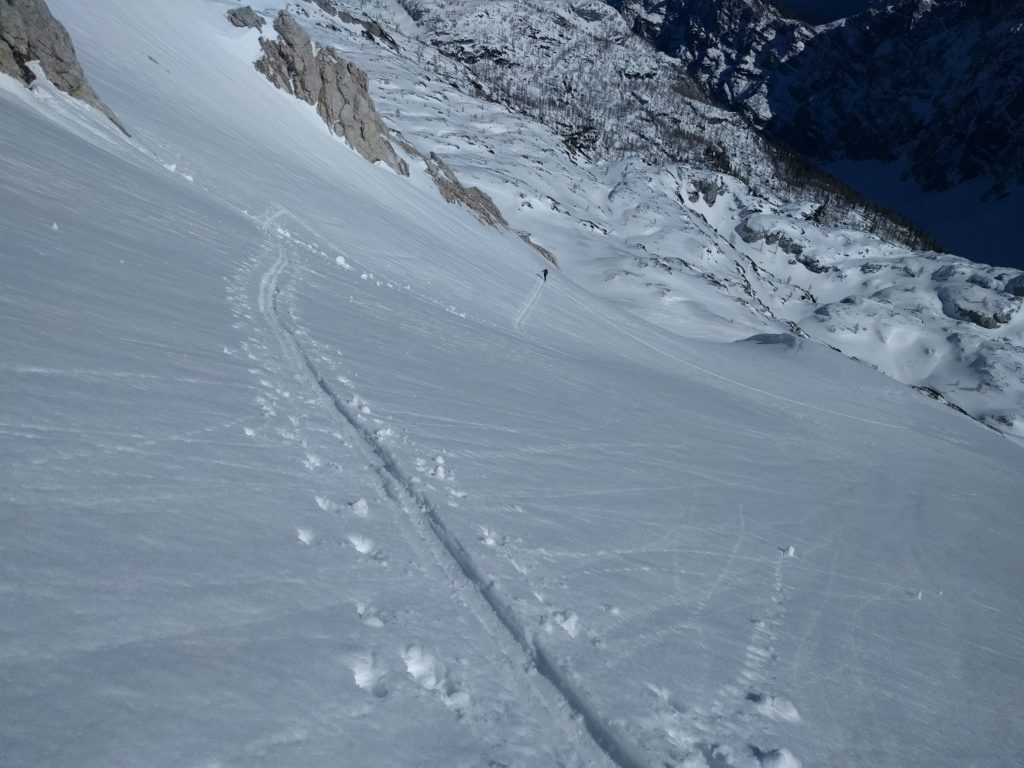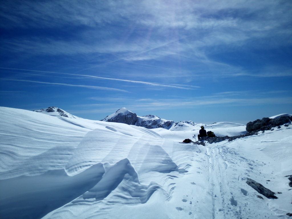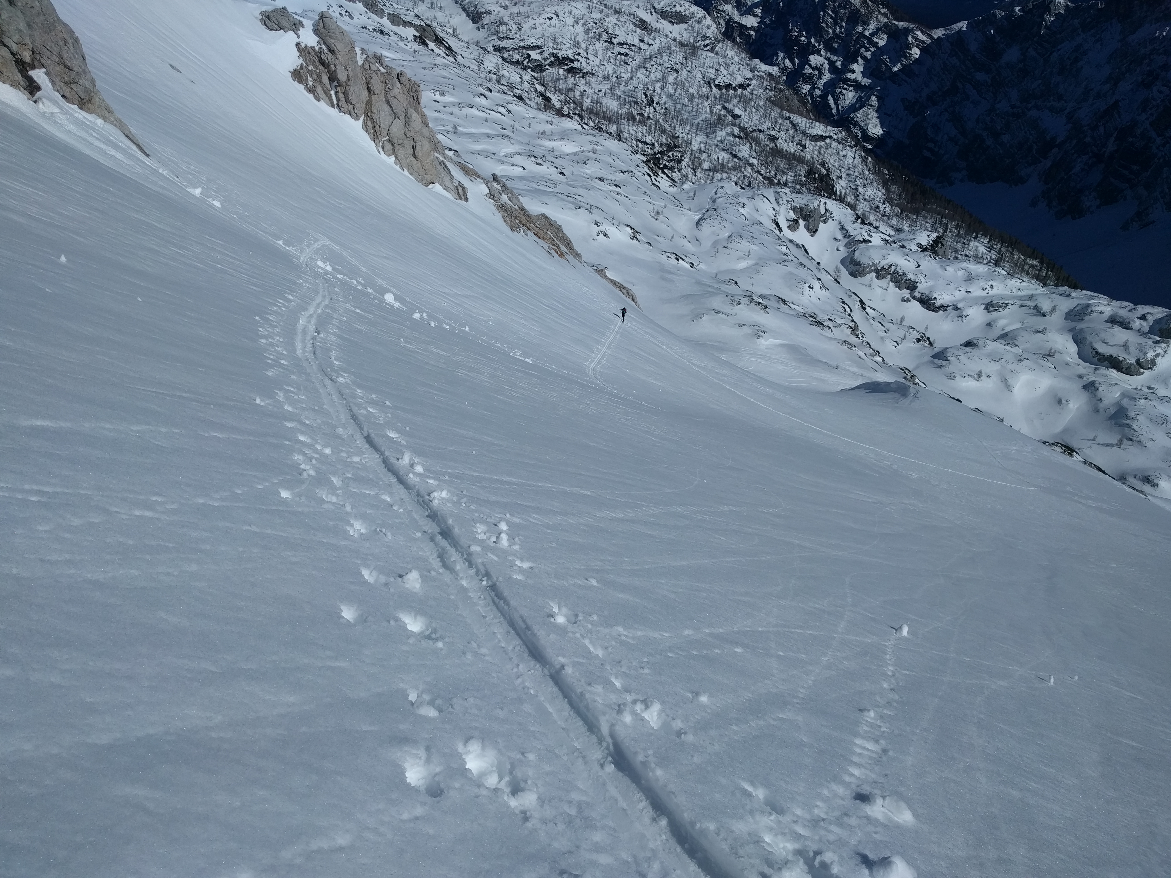 Am zweiten Tag ging es von Vodnikov Dom durch Veljo Polje die Velska Dolinas hinauf zur Hribarice-Scharte südöstlich des Zob Kanjavec zum Kanjavec. Eine wesentliche Erkenntnis verfestigte sich an diesem Tag, nämlich, dass die Hangneigungskarte des Alpenvereinaktiv in Slowenien teilweise bis zu zehn Grad unter den gemessenen und tatsächlichen Neigungen liegt. Eine Tatsache die bei Neuschnee sicherheitstechnisch einiges unmöglich macht, was vielleicht gut geplant war. Am Fuß des Kanjavec legten wir ein Materialdepot an und „flogen“ um viele Kilo erleichtert dem Gipfel entgegen. Oben war es „GEWALTIG“: kein Wind, eine Fernsicht vom Glockner bis zum Mittelmeer und rundherum steil ins Tal, … Wir wählten die südwestliche Abfahrtspur, die noch guten Firn und Abfahrtsspaß boten. Bei der weitere Abfahrt hinunter zur Prehodavci wurde der Schnee dann immer tiefer und diesmal kamen wir in der Nachmittagssonne bei der Schutzhütte an. Noch in der Sonne kochten wir, sammelten das Wasser aus den Schmelzpfützen, weil wir Gas sparen wollten und trockneten Socken, Leiberl und entspannten. Zum wieder einfach gutem Essen gab es das letzte Bier (danke Ben!). Bis zum Abend füllte sich die Hütte ganz gut, geschlafen haben wir trotzdem gut ;-)