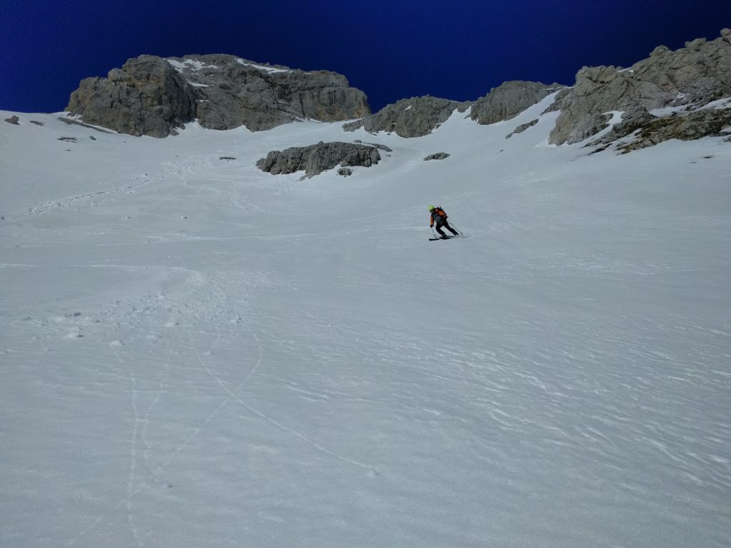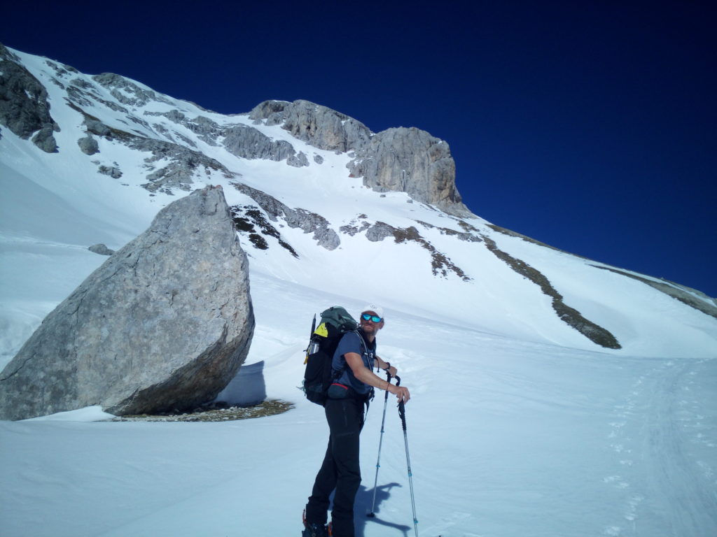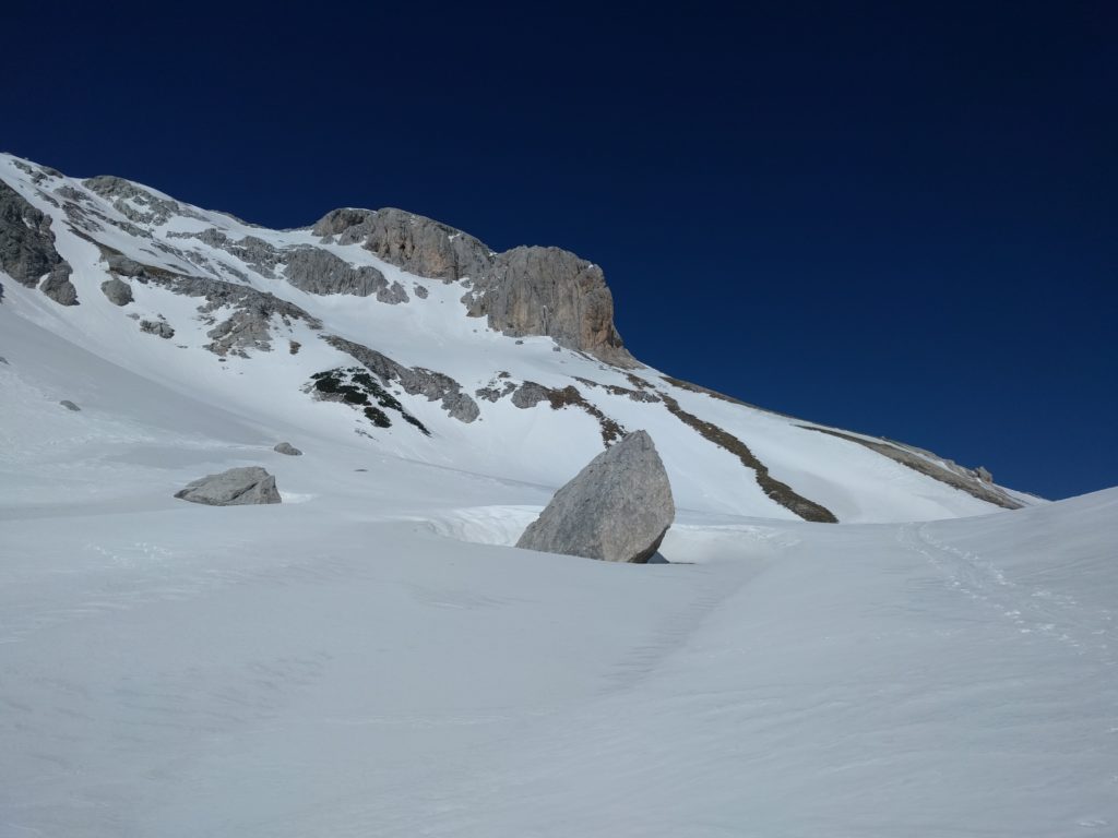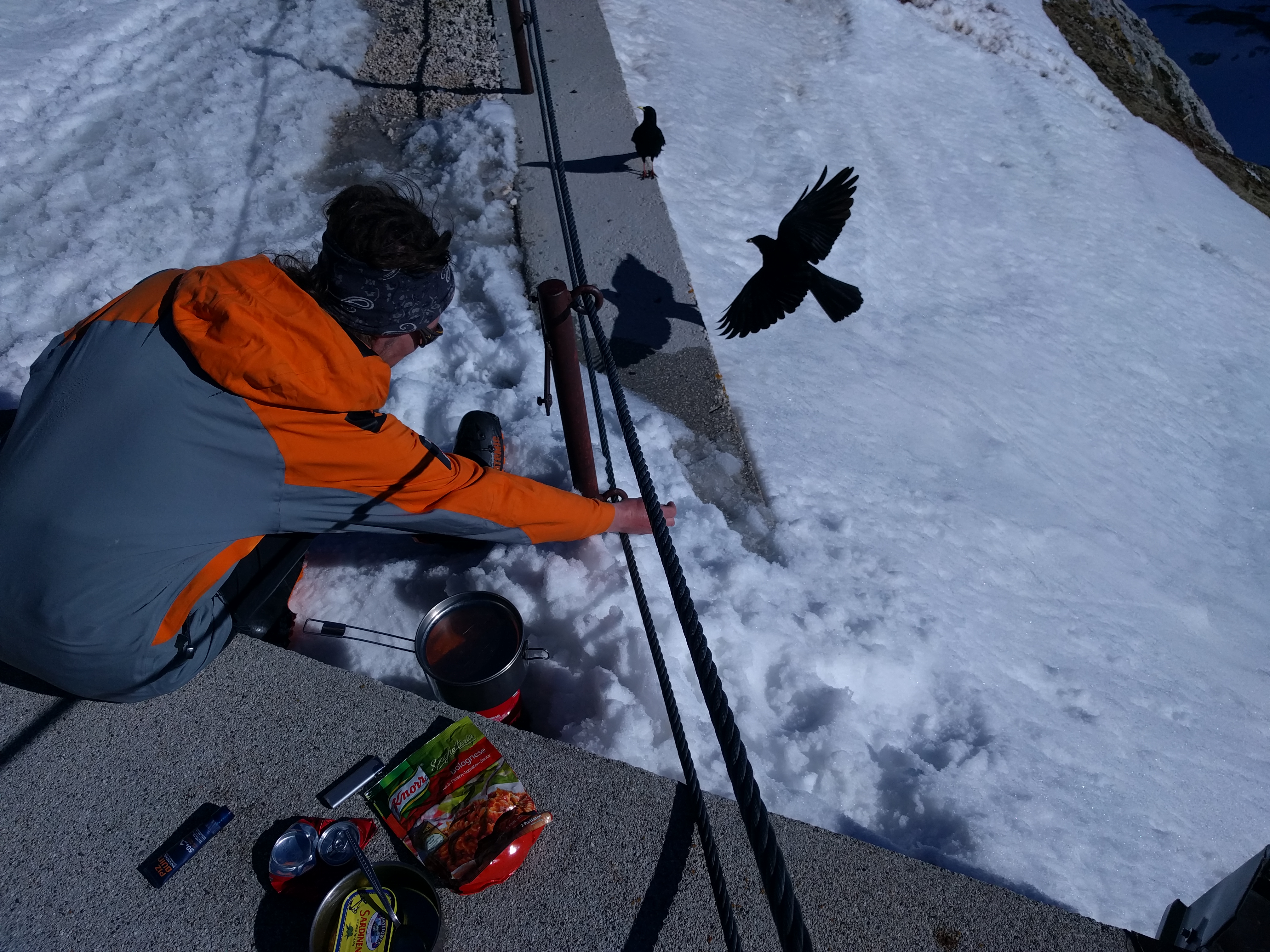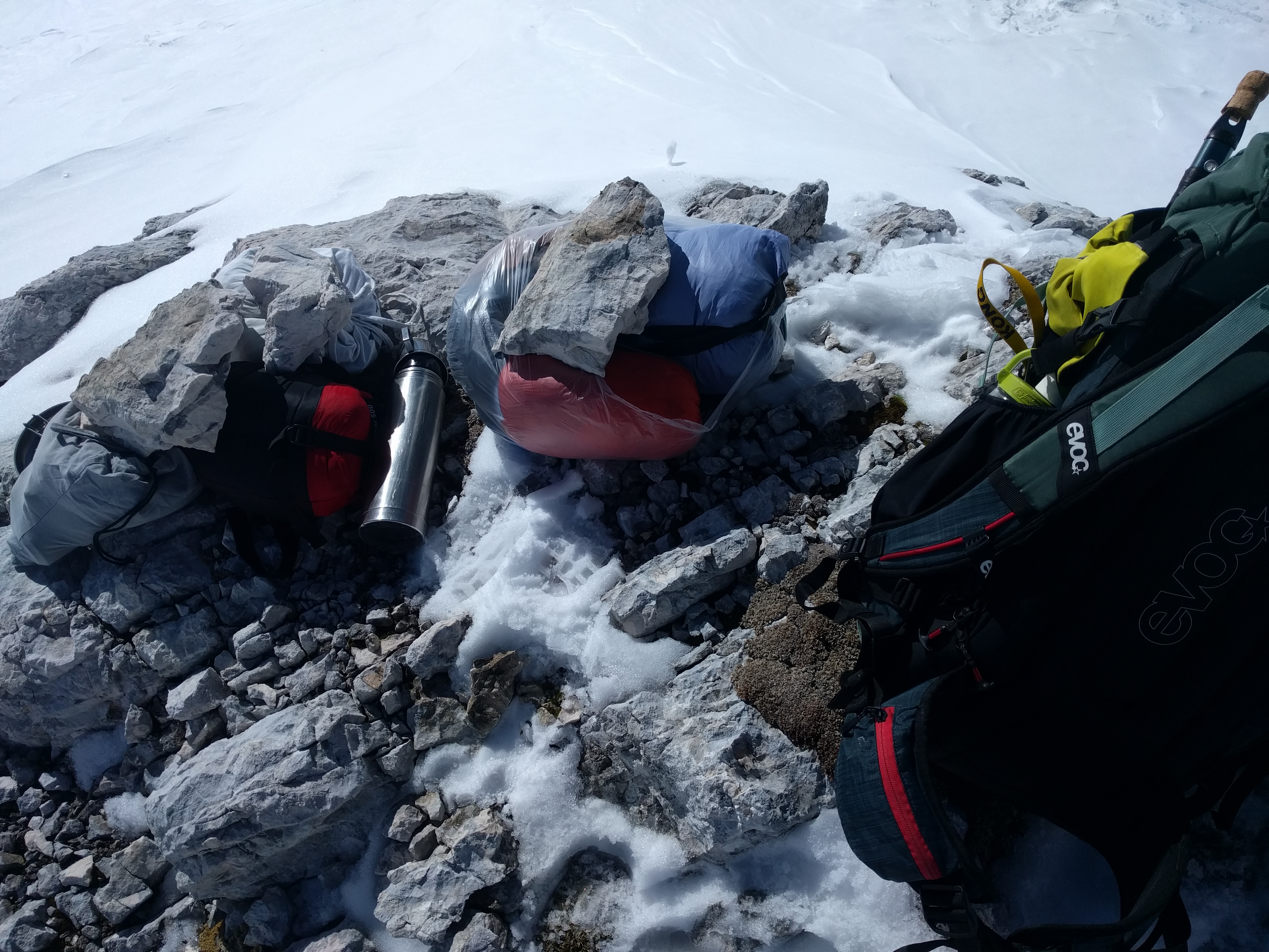 Am zweiten Tag ging es von Vodnikov Dom durch Veljo Polje die Velska Dolinas hinauf zur Hribarice-Scharte südöstlich des Zob Kanjavec zum Kanjavec. Eine wesentliche Erkenntnis verfestigte sich an diesem Tag, nämlich, dass die Hangneigungskarte des Alpenvereinaktiv in Slowenien teilweise bis zu zehn Grad unter den gemessenen und tatsächlichen Neigungen liegt. Eine Tatsache die bei Neuschnee sicherheitstechnisch einiges unmöglich macht, was vielleicht gut geplant war. Am Fuß des Kanjavec legten wir ein Materialdepot an und „flogen“ um viele Kilo erleichtert dem Gipfel entgegen. Oben war es „GEWALTIG“: kein Wind, eine Fernsicht vom Glockner bis zum Mittelmeer und rundherum steil ins Tal, … Wir wählten die südwestliche Abfahrtspur, die noch guten Firn und Abfahrtsspaß boten. Bei der weitere Abfahrt hinunter zur Prehodavci wurde der Schnee dann immer tiefer und diesmal kamen wir in der Nachmittagssonne bei der Schutzhütte an. Noch in der Sonne kochten wir, sammelten das Wasser aus den Schmelzpfützen, weil wir Gas sparen wollten und trockneten Socken, Leiberl und entspannten. Zum wieder einfach gutem Essen gab es das letzte Bier (danke Ben!). Bis zum Abend füllte sich die Hütte ganz gut, geschlafen haben wir trotzdem gut ;-)