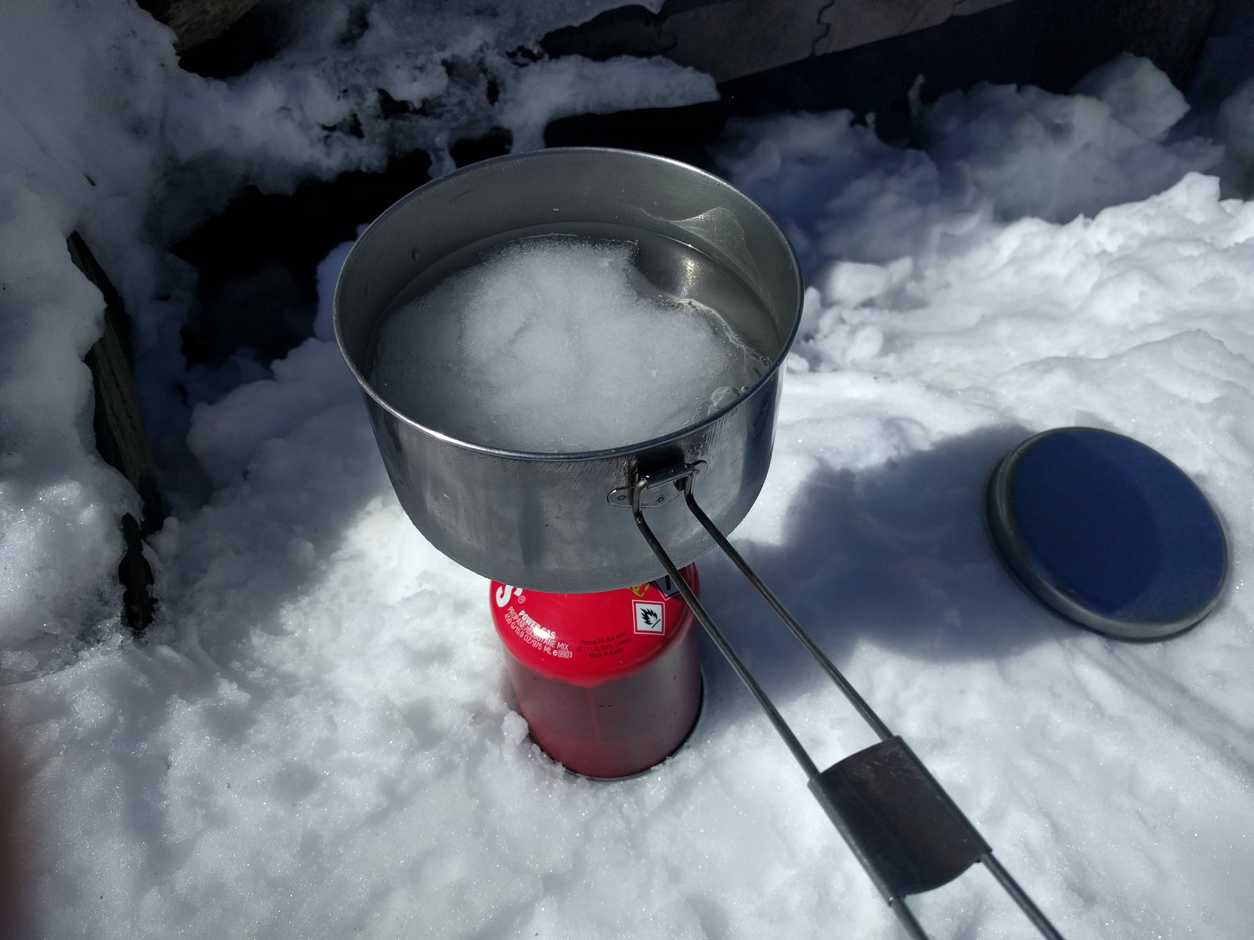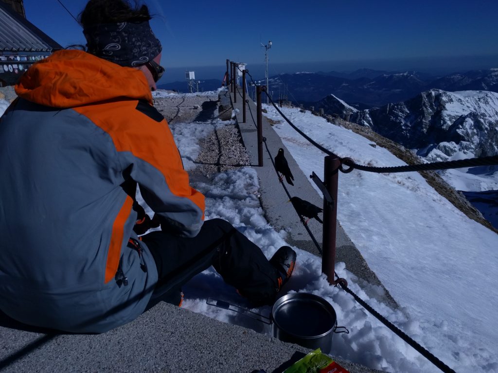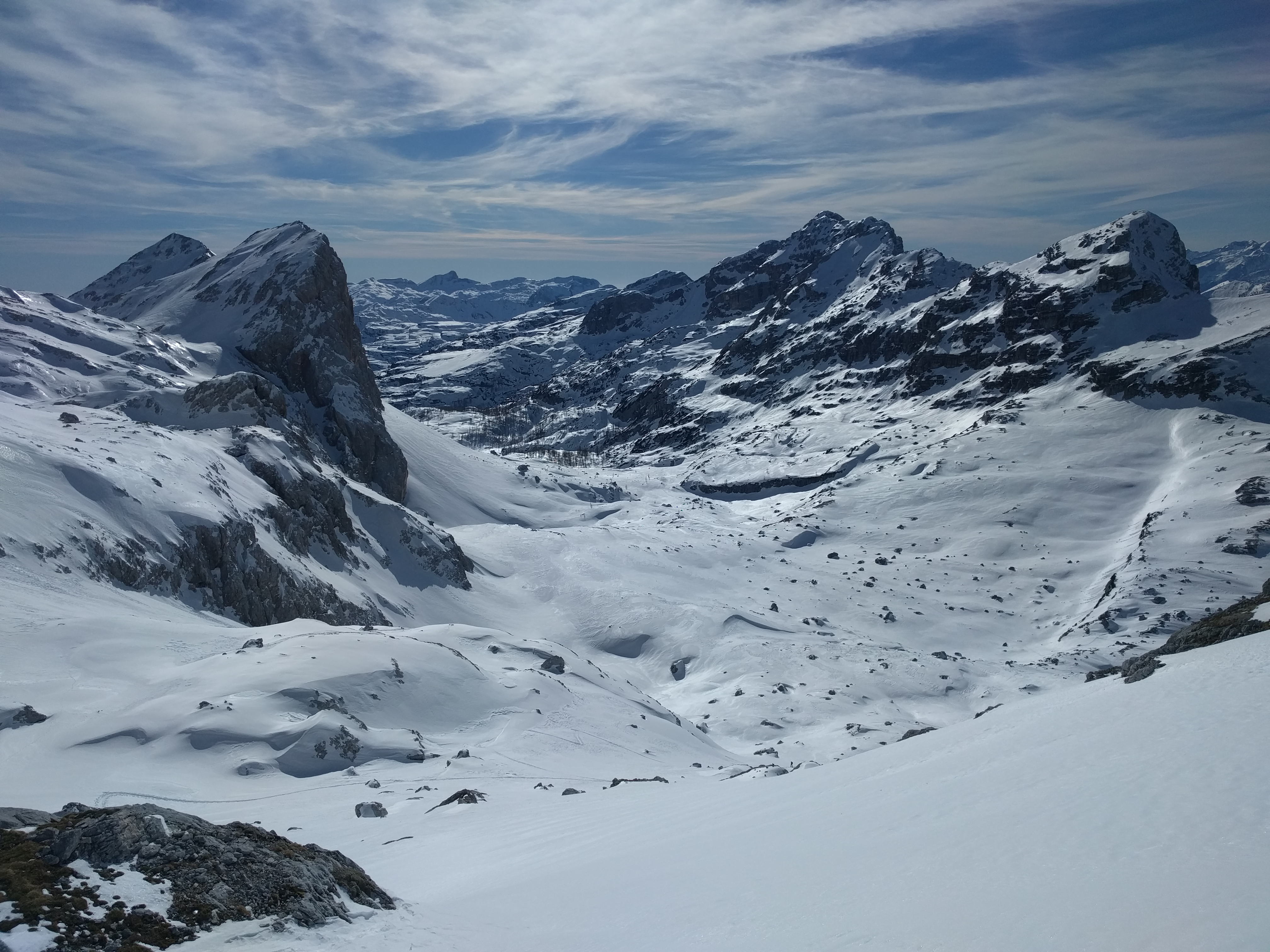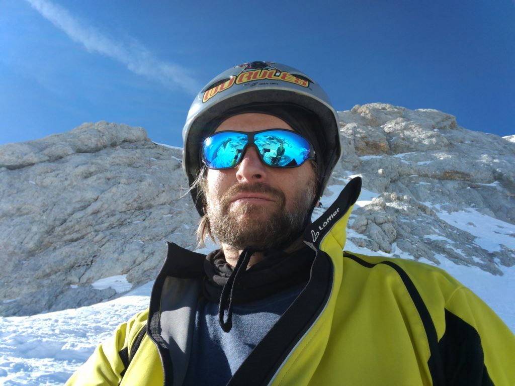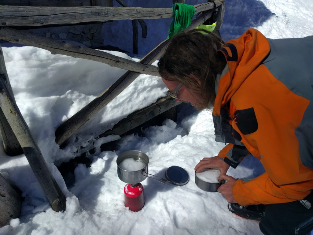 Am zweiten Tag ging es von Vodnikov Dom durch Veljo Polje die Velska Dolinas hinauf zur Hribarice-Scharte südöstlich des Zob Kanjavec zum Kanjavec. Eine wesentliche Erkenntnis verfestigte sich an diesem Tag, nämlich, dass die Hangneigungskarte des Alpenvereinaktiv in Slowenien teilweise bis zu zehn Grad unter den gemessenen und tatsächlichen Neigungen liegt. Eine Tatsache die bei Neuschnee sicherheitstechnisch einiges unmöglich macht, was vielleicht gut geplant war. Am Fuß des Kanjavec legten wir ein Materialdepot an und „flogen“ um viele Kilo erleichtert dem Gipfel entgegen. Oben war es „GEWALTIG“: kein Wind, eine Fernsicht vom Glockner bis zum Mittelmeer und rundherum steil ins Tal, … Wir wählten die südwestliche Abfahrtspur, die noch guten Firn und Abfahrtsspaß boten. Bei der weitere Abfahrt hinunter zur Prehodavci wurde der Schnee dann immer tiefer und diesmal kamen wir in der Nachmittagssonne bei der Schutzhütte an. Noch in der Sonne kochten wir, sammelten das Wasser aus den Schmelzpfützen, weil wir Gas sparen wollten und trockneten Socken, Leiberl und entspannten. Zum wieder einfach gutem Essen gab es das letzte Bier (danke Ben!). Bis zum Abend füllte sich die Hütte ganz gut, geschlafen haben wir trotzdem gut ;-)
