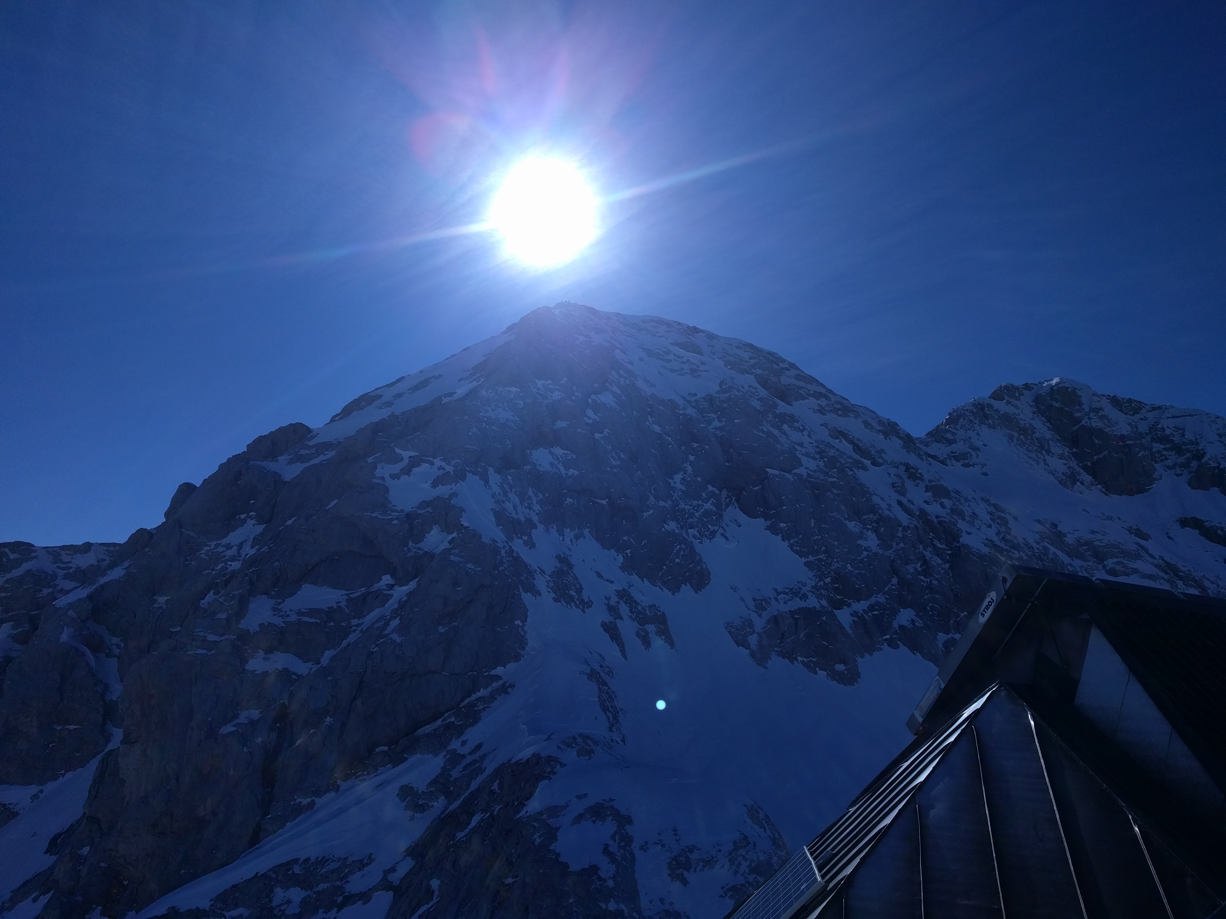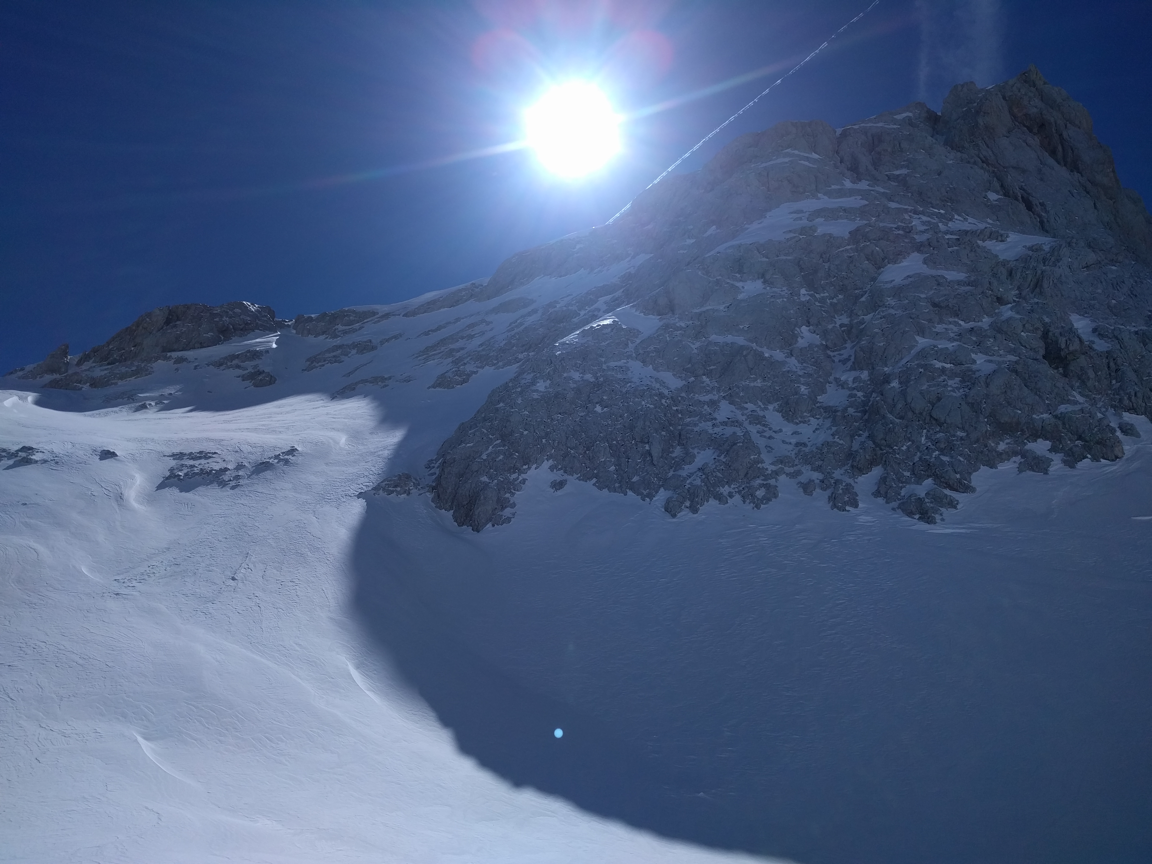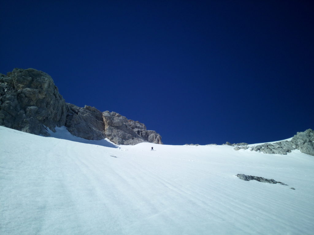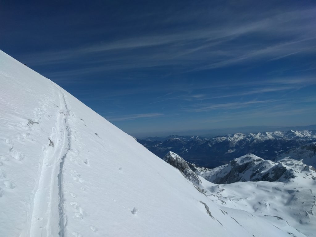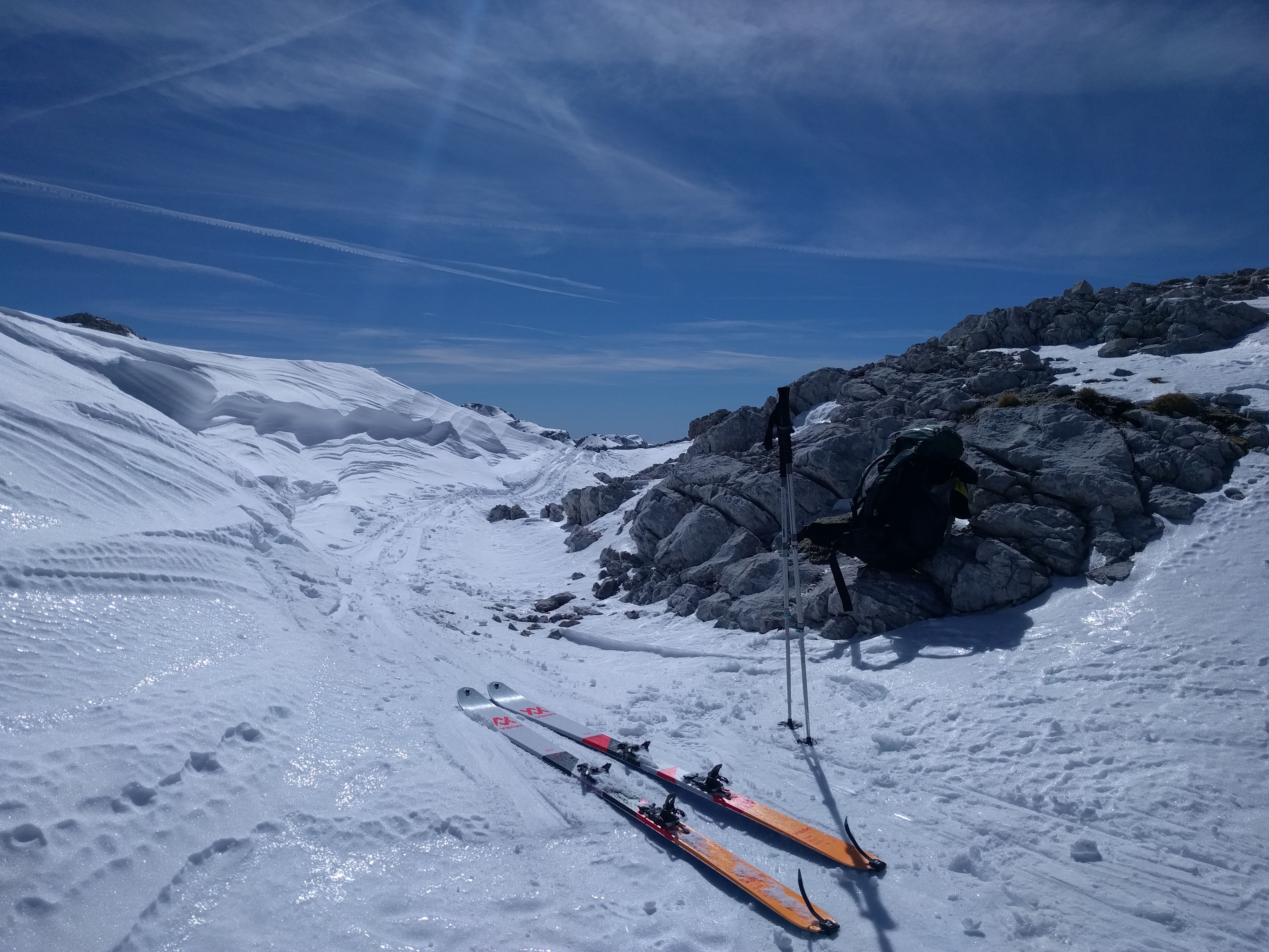Am dritten Tag ging es dann zum Triglav Dom. Die geplante Route über die Südflanke mit einem Zwischenstop auf der unbewirtschafteten Planika Dom Hütte haben wir aufgrund der Sonne und Wärme und dem Umstand, dass sie ungespurt war verworfen. Deshalb sind wir die Route des Vortages wieder aufgestiegen und abgefahren und hatten so ein paar Höhenmeter mehr Abfahrt ins Velo Polje. Der Aufstieg hinauf zum Konjsko Sedlo führt durch sehr steiles Gelände, von unten ist der Weg durch die Latschen und Felsen kaum zu sehen. Der letzte Teil trugen wir die Ski wieder am Ruchsack und waren heilfroh oben auf der Hochfläche gelandet zu sein. Eigendlich wollten wir nicht direkt zum Triglav Dom aber auch der Weg hinauf zum Planika Dom war unverspurt und so folgten wir dem östlichsten Skispuren und waren einigermaßen überrascht als wir gegen vier Uhr vor dem Massenansturm bei der Hütte am Triglav standen. Der Aufstieg führte durch eine unverspurte Firnflanke etwas südöstlich der Normalroute in der wir die Kolonnen hinauf zum Triglav-Haus sehen konnten. Oben kochten wir wieder ein Supperl, tranken das höchste Bier der Tage und genossen noch den Ausblick von der Kredarica. Dann ging es in einen „Doppelzimmer-Kühlschrank“