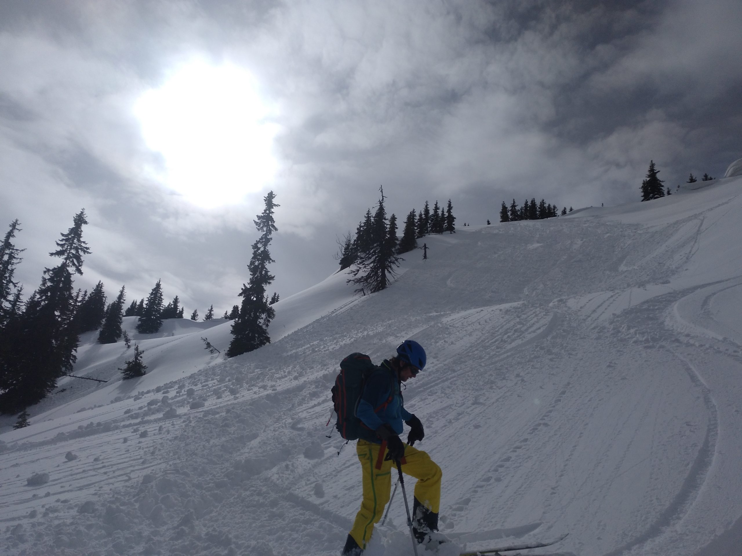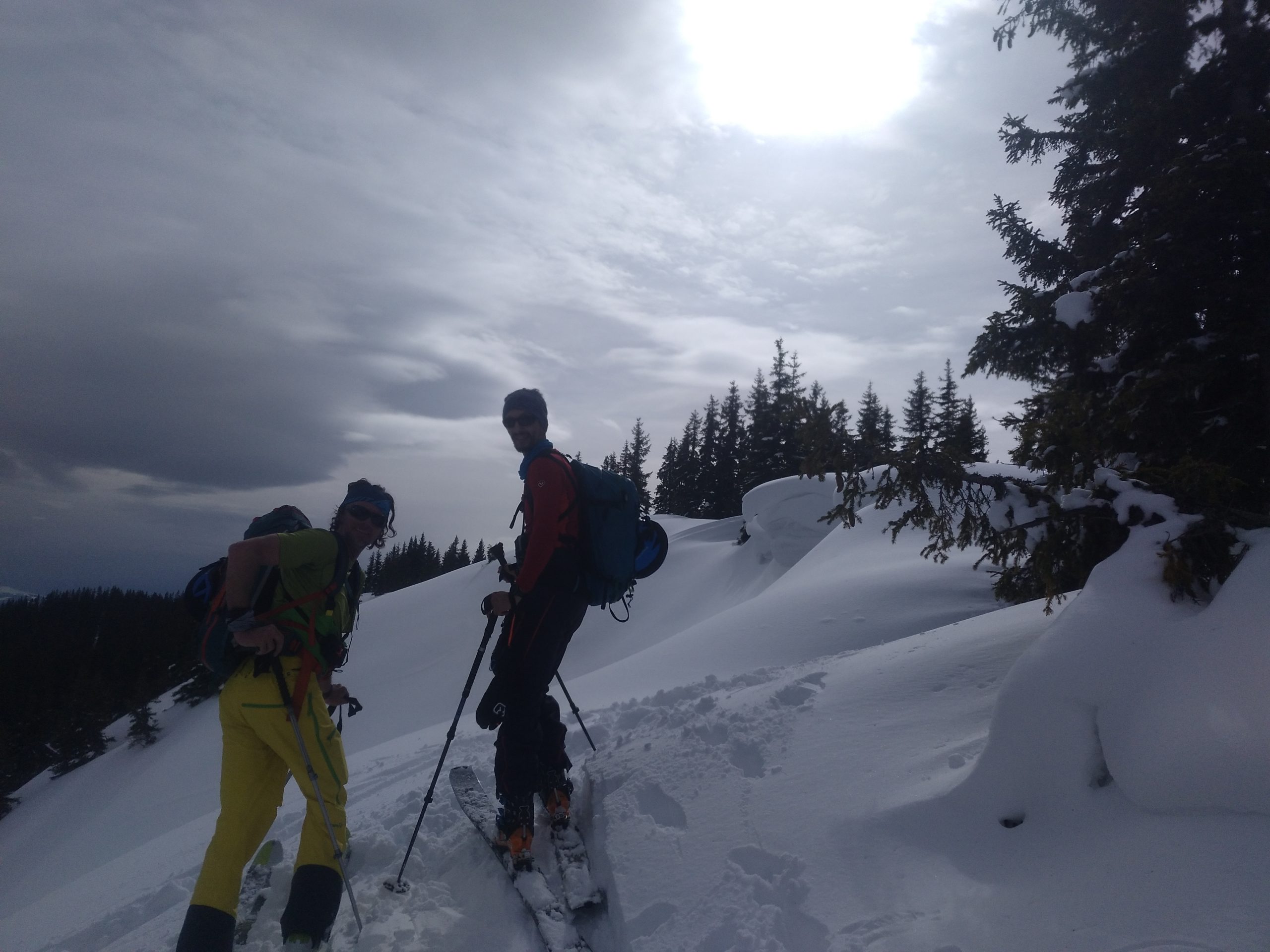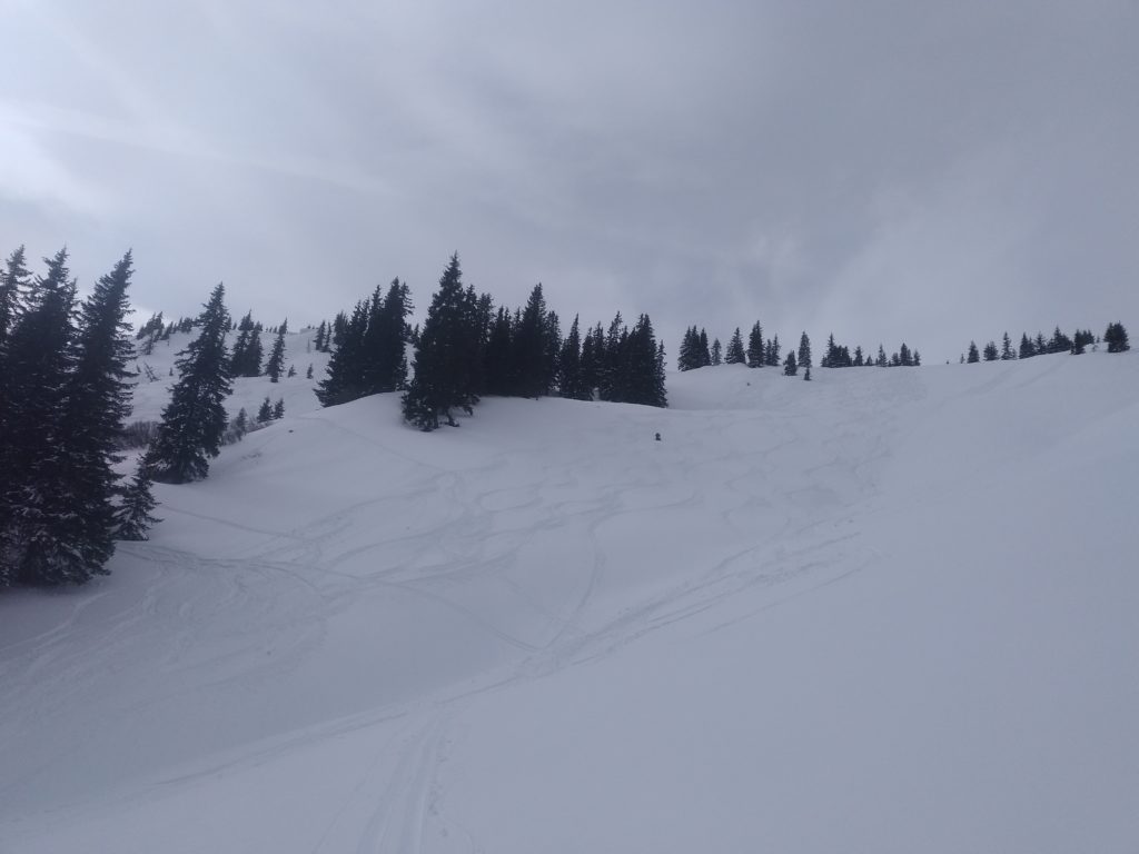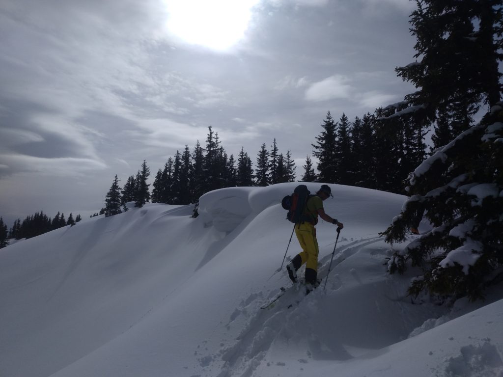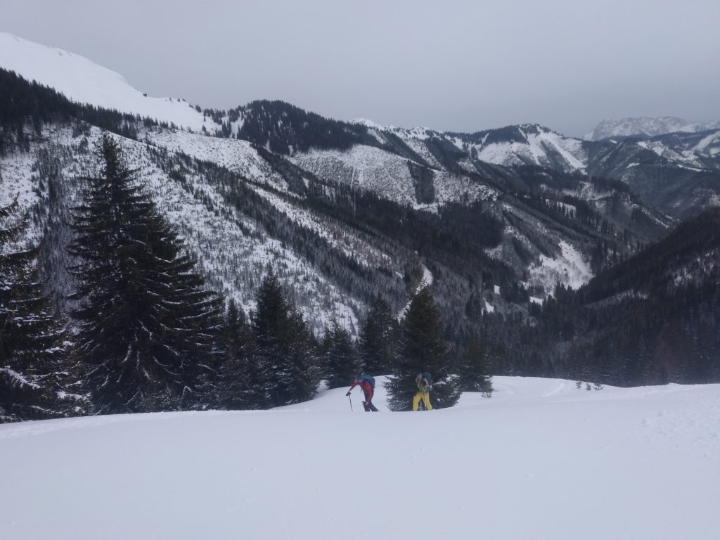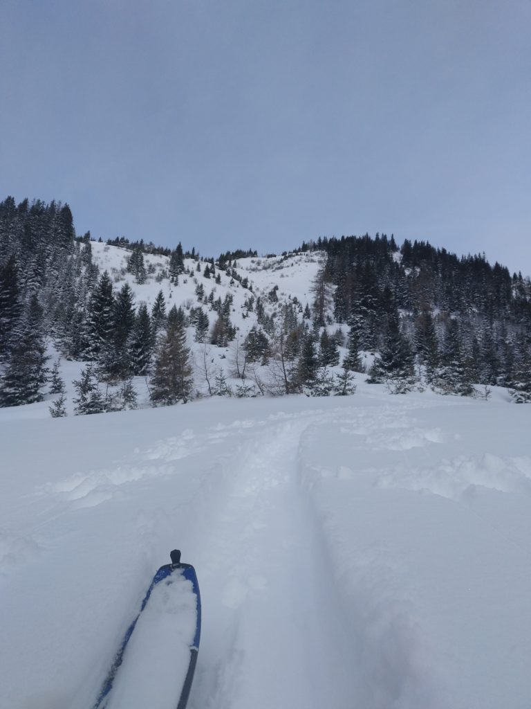 Unten fellen wir gleich nochmal auf und gehen auf die Herberge und auch hier findet sich noch ausreichend freie Fläche um feiner Neuschnee. So fellen wir ein drittes Mal an und steigen abermals hoch um diesmal ganz Südwestlich nach den Wechten abzufahren, weil dort die Sonne, die langsam immer mehr zwischen den Wolken durchlugt, am wenigsten Angriffsfläche bietet und den besten Schnee verspricht. Auch die Abfahrt ist herrlich. Nach der Herberge queren wir bis zu einem weiterem Schlag/Bachbett nach links aus und finden nochmal Pulver bis zur Forststraße.
