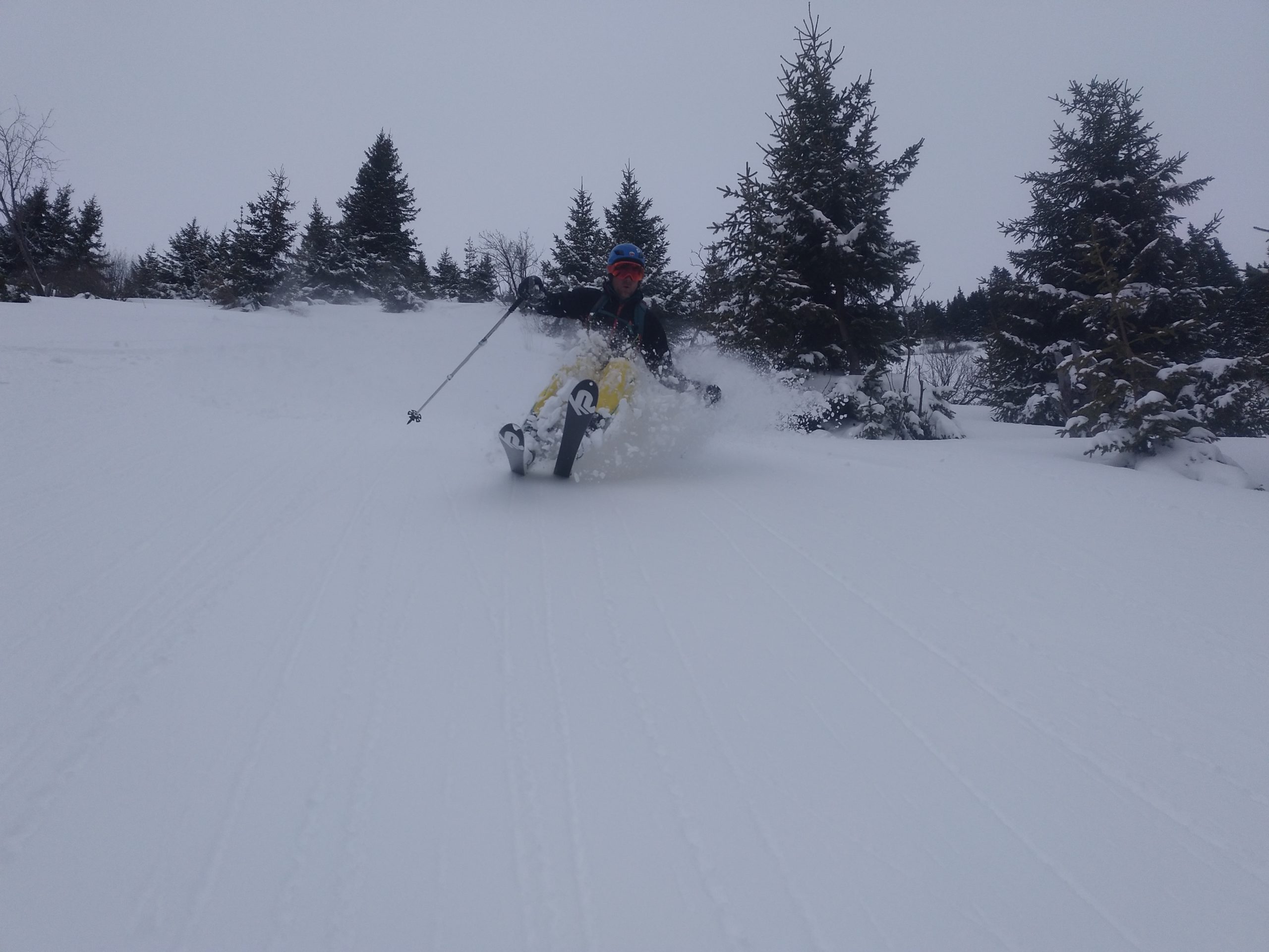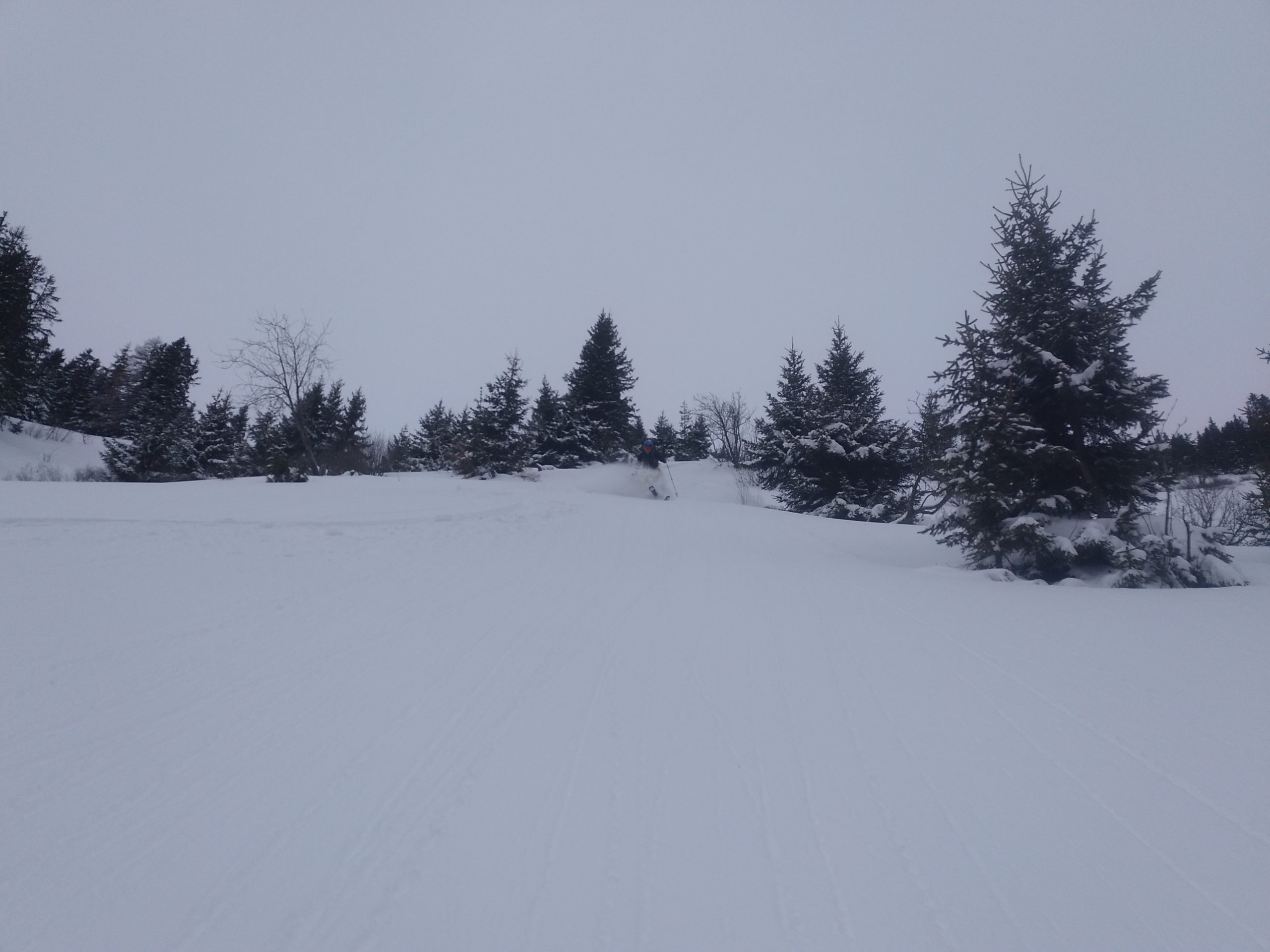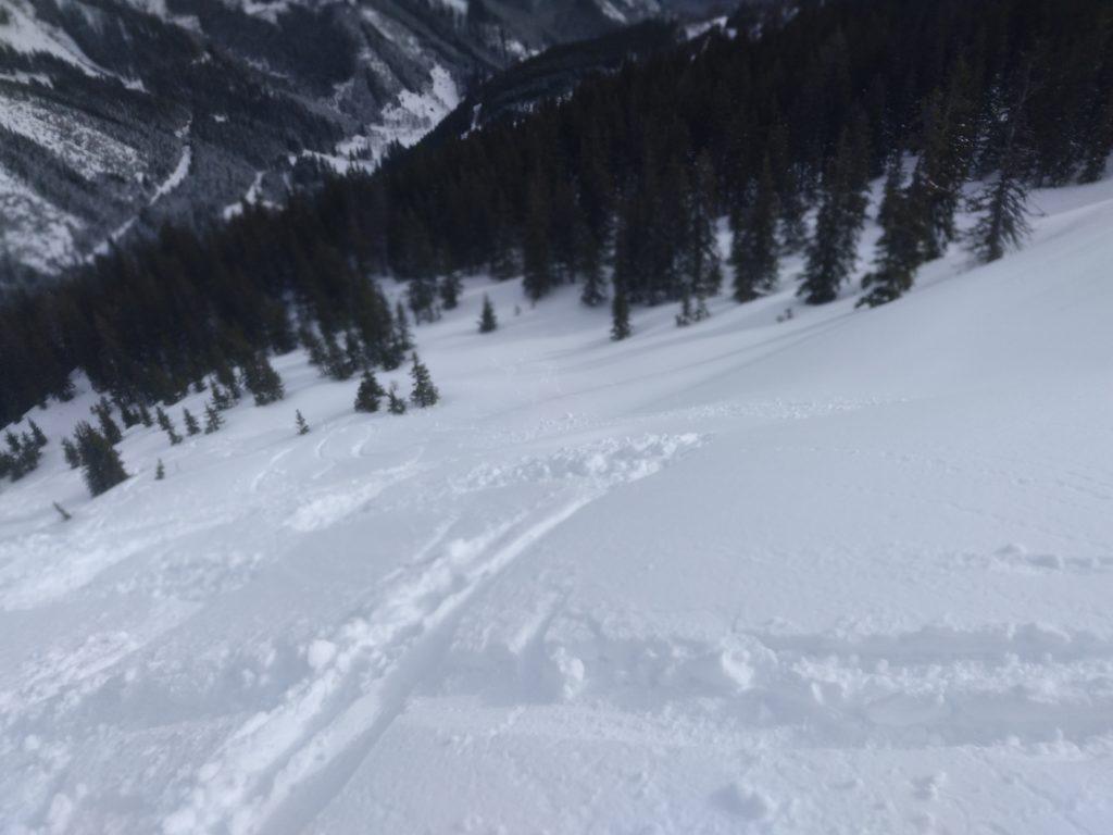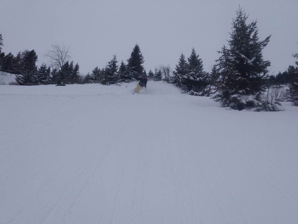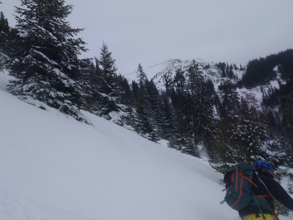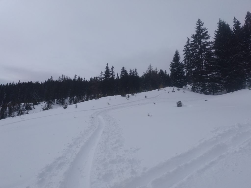Unten fellen wir gleich nochmal auf und gehen auf die Herberge und auch hier findet sich noch ausreichend freie Fläche um feiner Neuschnee. So fellen wir ein drittes Mal an und steigen abermals hoch um diesmal ganz Südwestlich nach den Wechten abzufahren, weil dort die Sonne, die langsam immer mehr zwischen den Wolken durchlugt, am wenigsten Angriffsfläche bietet und den besten Schnee verspricht. Auch die Abfahrt ist herrlich. Nach der Herberge queren wir bis zu einem weiterem Schlag/Bachbett nach links aus und finden nochmal Pulver bis zur Forststraße.
