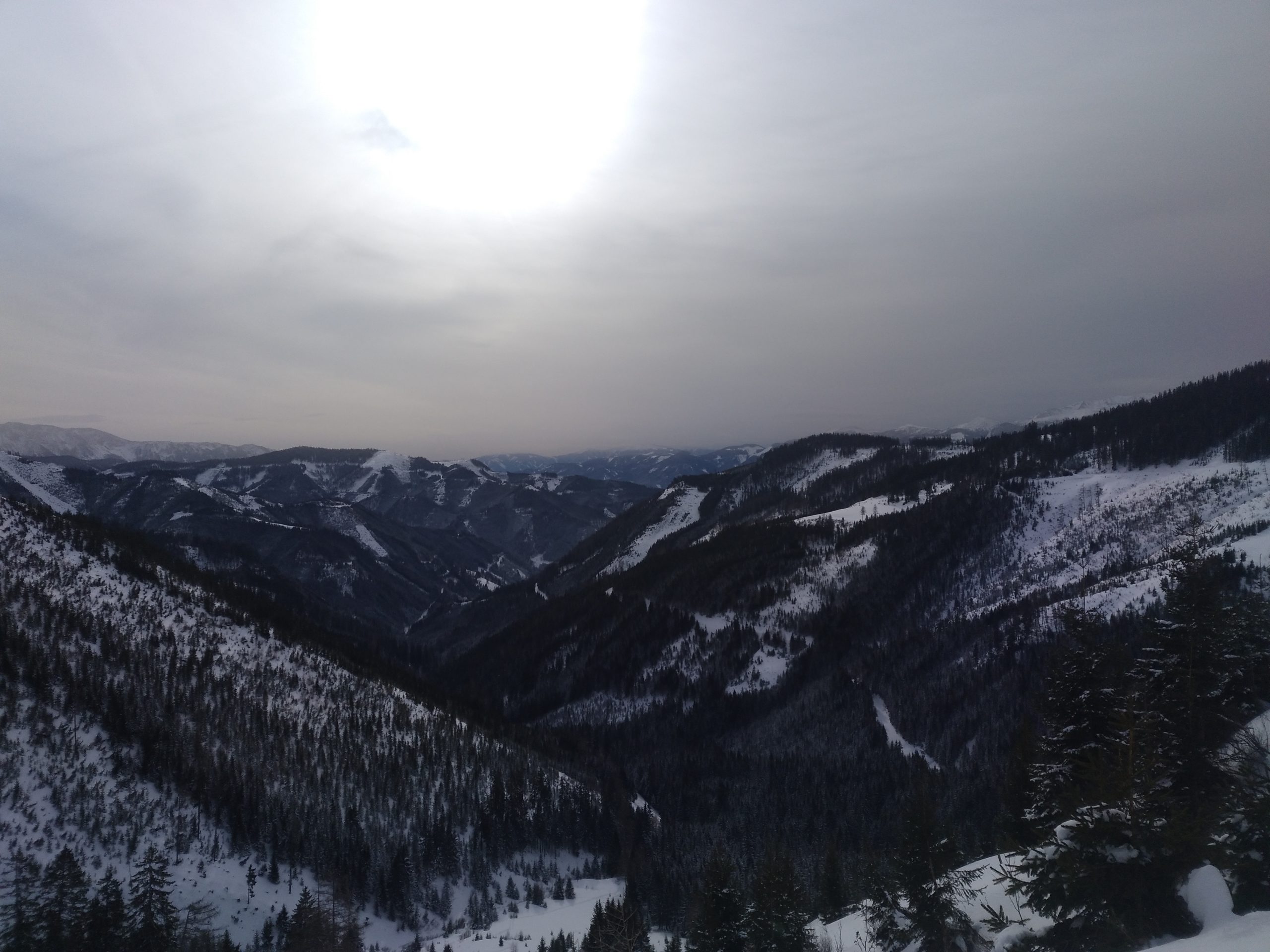 So finden wir auch schon eine Spur direkt hinauf zum Hinkareck. Tief verschneit ist es wieder und der Pulver schaut sehr gut aus. Die Sonne versteckt sich hintere hohen Wolken, was den Schnee noch eine wenig konservieren könnte, bevor er zu feucht und schwer wird. Nach etwas weniger als zwei Stunden stehen wir am Gipfel. Ein kurze Pause mit Jause und dann geht es zurück zur Forststraße. Die Abfahrt ist vom feinsten, zuerst etwas rechts hinein in einen Graben zur Herberge hin, dann wieder fast ganz links den Schlag neben der Auffahrtsspur. Der Schnee ist nicht ganz fluffig aber fährst sich richtig lässig.