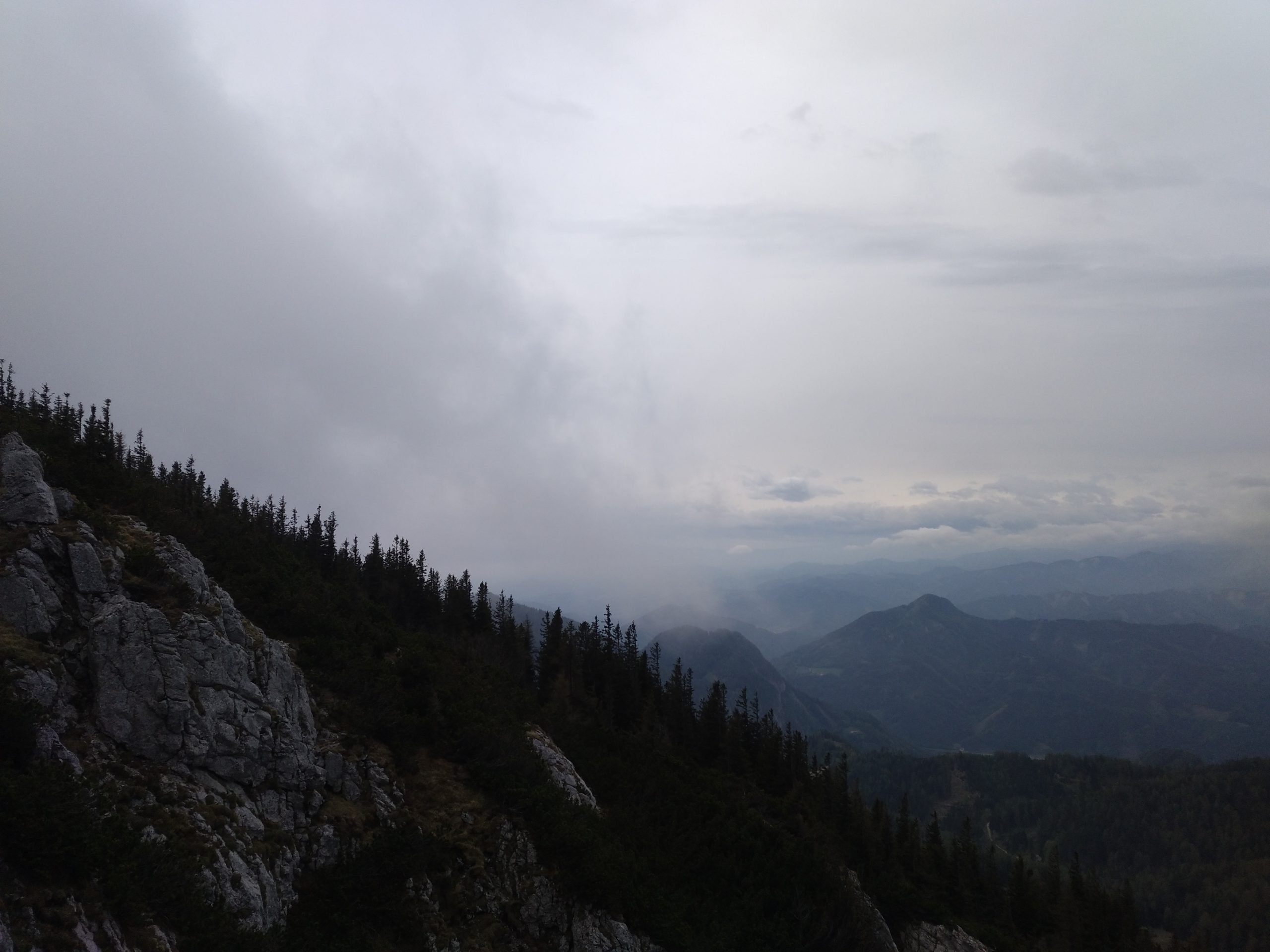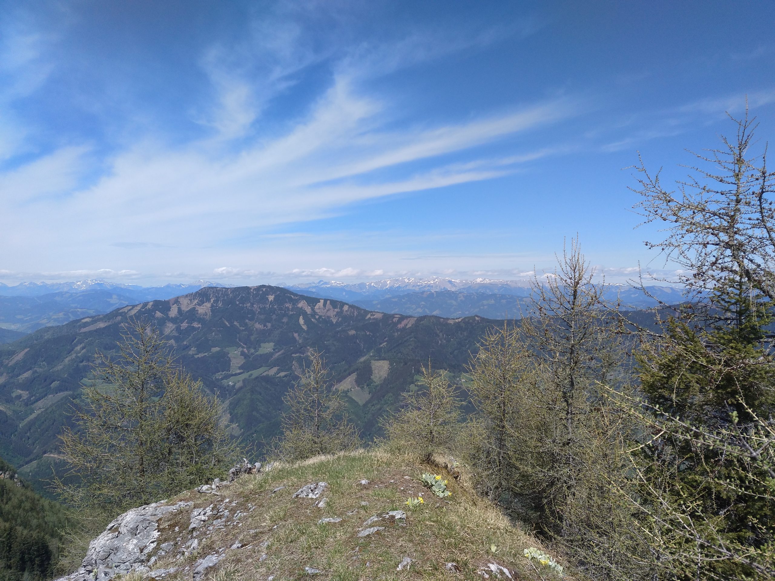 Noch bei herrlichem Sonneschein starten Gerald und ich auf der Teichalm und gehen zum Einnerungskreuz am östlichsten Kammende des Hochlantsch. Im Leiberl ist es gut warm und der Weg am Kamm ist gehenswert. Der Blick ist herrlich, die kleinen „Gipfelwiesen“ laden zum verweilen und die Nordseite ist überall steil. Am Gipfel machen wir im Lee eine kurze Rast und dann steigen wir den Jägersteig hinunter zum Einstieg des Klettersteigs. Der Abstieg ist nicht ganz ohne, rutschig und voller looser Steine. Der Kletterstieg dagegen ist griffig und fein und bald sind wir am Einstieg des Westgrats. Gerald steigt die erste Länge vor und meine ersten Klettermeter fordern mich mental ordendlich. Das wird in der zweiten Länge im Vorsteig deutlich. Mittlerweile hat der Wind aufgerischt und es wir kalt und ein Alpin-Gefühl entsteht. So richtig warm mit dem Klettern werde ich heute aber nicht nur wegen der Temperatur nicht. Inzwischen ziehen die ersten tiefen Wolken durch und das verdichtet das Gebirgsfeeling weiter. Deshalb halten wir uns nicht lange auf. Die Ausstiegslänge sucht Gerald den Weg durch die Latschen und die letzten Meter hinauf zum Weg führen ebenfalls durchs Unterholz. Nach der Kletterei geht es zackig zurück zum Auto. Der Jokl ist zu also wählen wir die kurze Variante über den Gipfel.