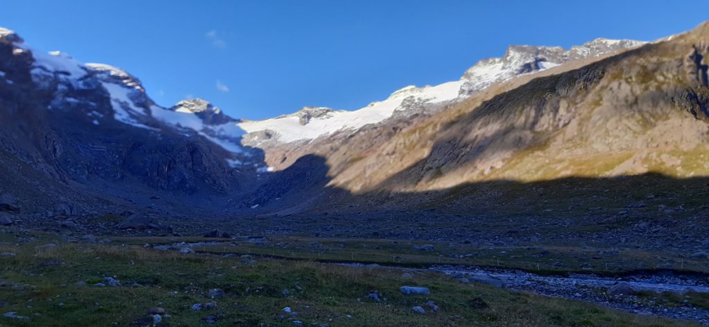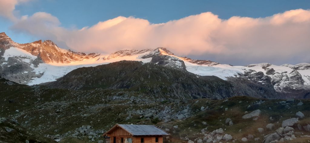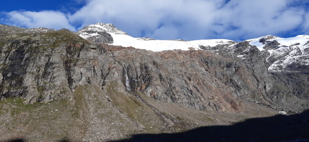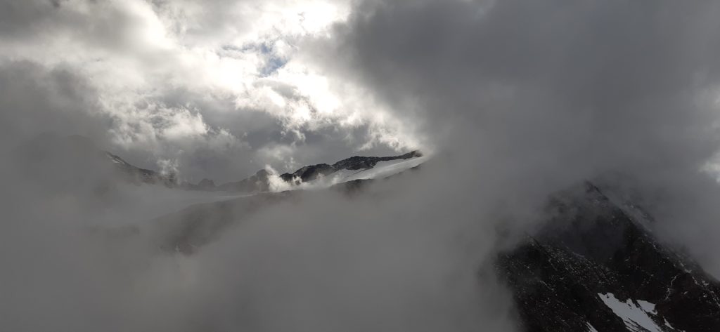 Anfang September kann es für eine Hochtour schon recht spät sein. Am Wochenende davor hat es bis auf 2500 Meter herunter geschneit und als Wolfi, Gerald und ich am Mittwoch nach dem eineinhalbstündigen und leichtem, weil gepäcksbefreitem Zustieg auf der Essener und Rostock Hütte ankommen, sehen wir rundherum viel weiss. Nach dem wir unsere Rucksäcke aus der Matrialseilbahn geholt haben geht es noch auf das Rostocker Eck. Das tosende Rauschen des Wasser ist ein ständiger Begleiter um die Hütte und erst auf den Gipfelgrat wird es zu einem leisen Murmeln. Der Weg hinauf aufs Eck ist so eine audible Reise den in den tiefen Wolken ist nicht viel zu sehen. Die Wolken reissen auch oben nicht so ganz auf, dazwischen zeigen sich aber immer wieder ein paar Berge, Gletscher und Felsen. Die ersten Blicke sind beeindruckend, die schroffen Felsen, das bizarre Eis rundherum und die Tiefblicke in die zerfurchte Gletscherlandschaft mit endlichen Schutt- und Schotterhalden sind gewaltig. Der Abstieg erfolgt über die Aufstiegsroute und meandriert über die steile Flanke hinunter. Wir schauen hinunter auf den Almwellness des Simonisees und schon der erste Abend auf der Hütte wird ein bißchen länger als gedacht.