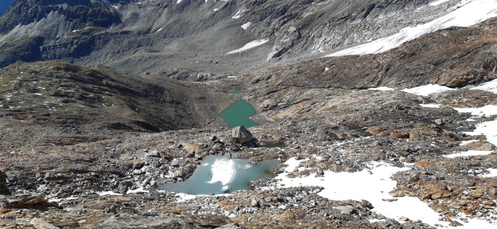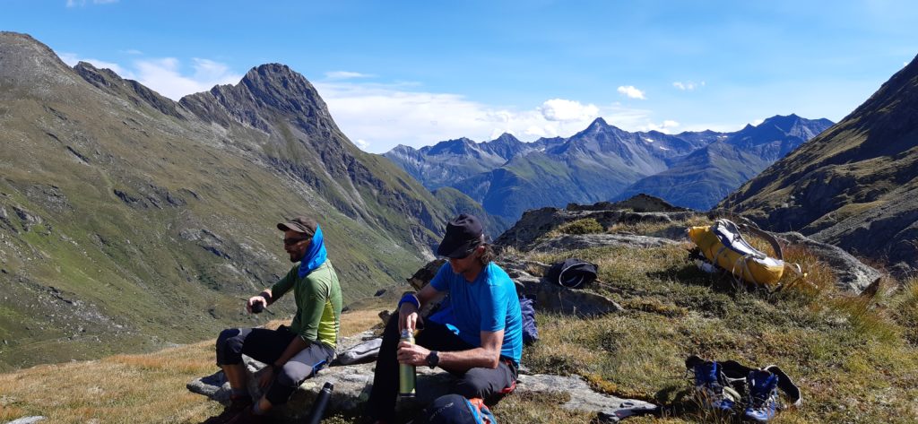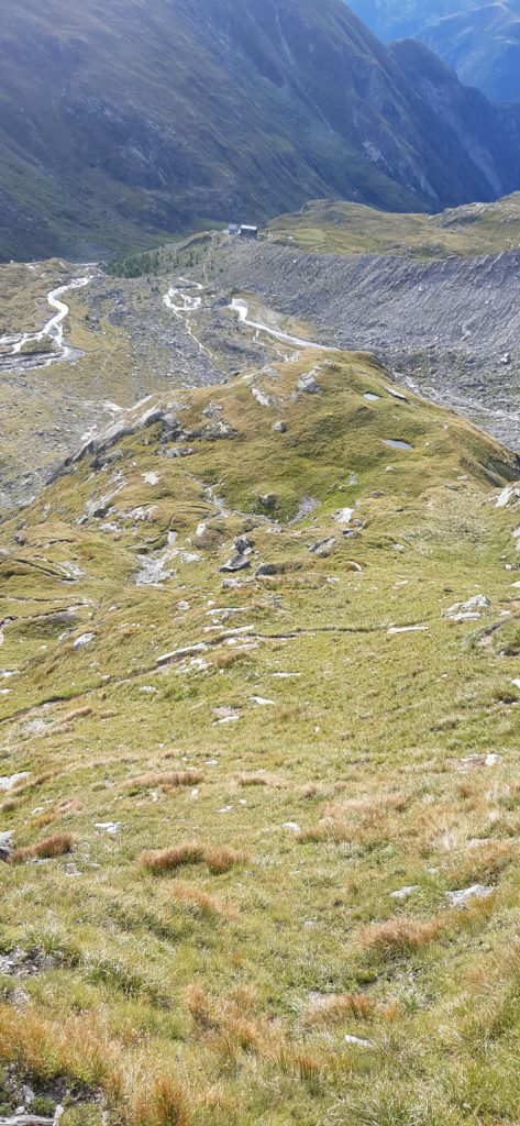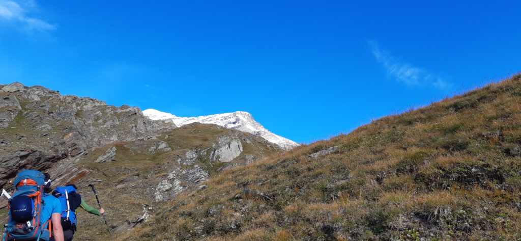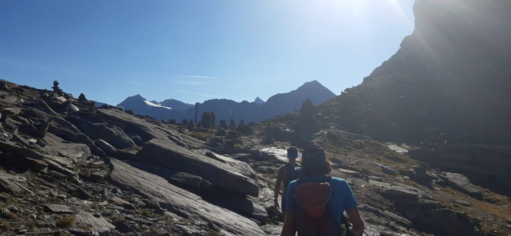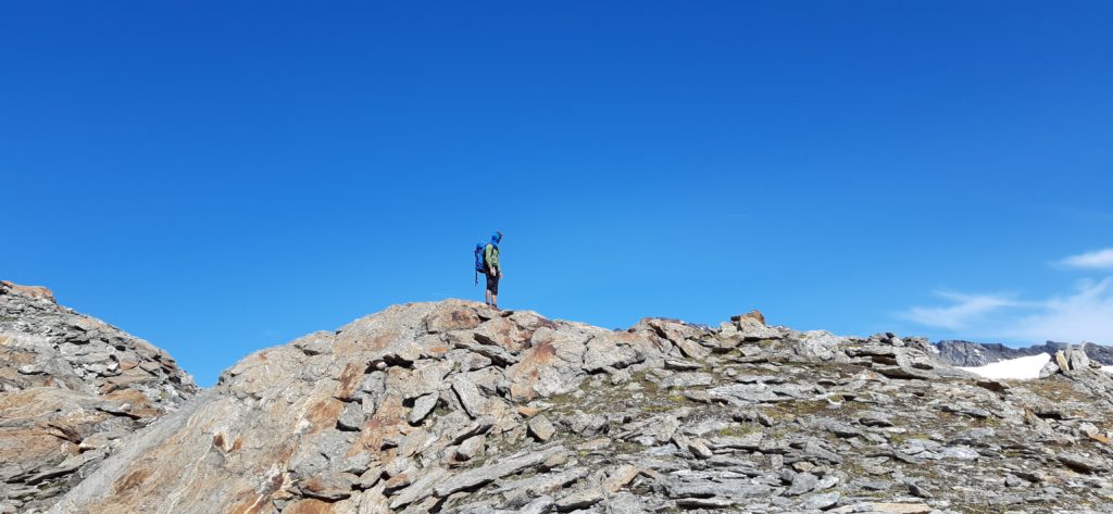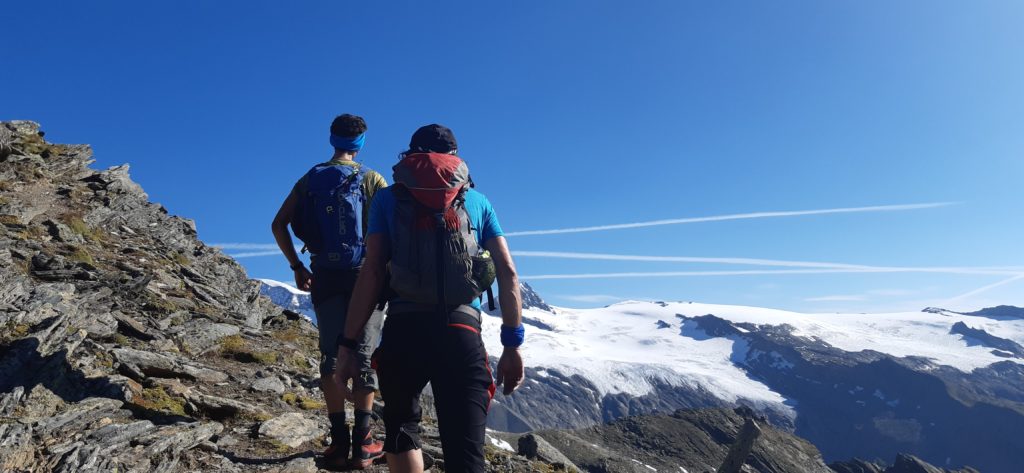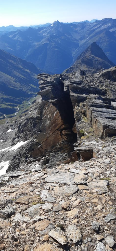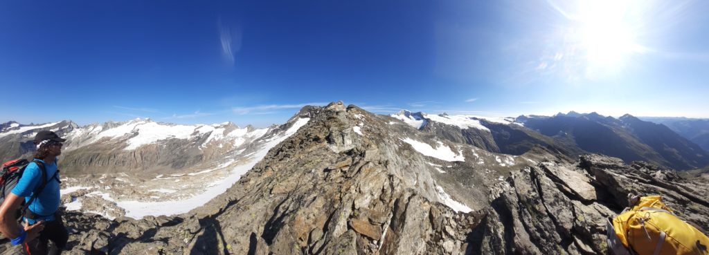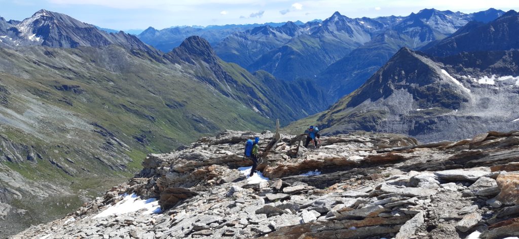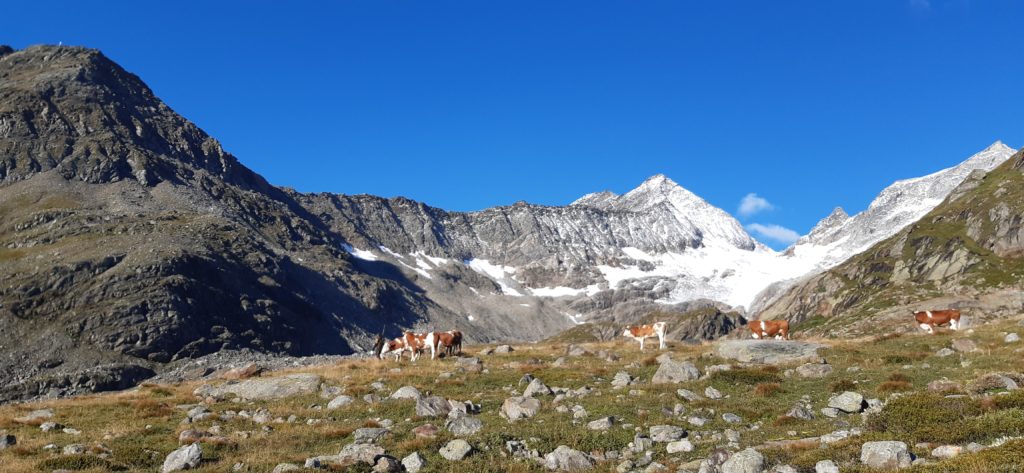 Zu guter Letzt wollen wir noch auf den Happ, den südlichen, weil der grosse Happ soll ein Schuthaufen sein. Die ersten eineinhalb Stunden hinauf zum Türmljoch ist für einige von uns, wegen der Altlasten von gestern und den mitleriweile vielen Höhenmetern in den Beinen recht mühsam. Der Aufstieg bis zum Grat ist einfach und dann geht es einige Meter ausgesetzt und in einfacher Kletterei hinauf zum Gipfel. Der Ausblick von dieser Seite des Tals ist besonderns beeindruckend und wie gestern reicht der Blick vom Grossglockner bis zu den Dolomiten. Am Abstieg helfen wir dem Senner noch mit dem treiben seiner Kühe.
