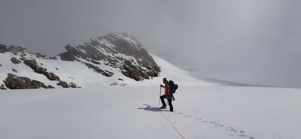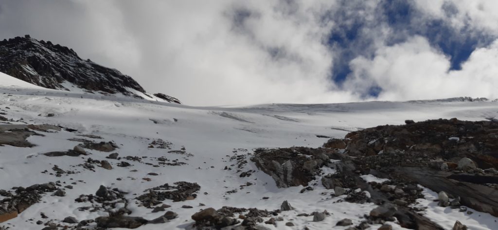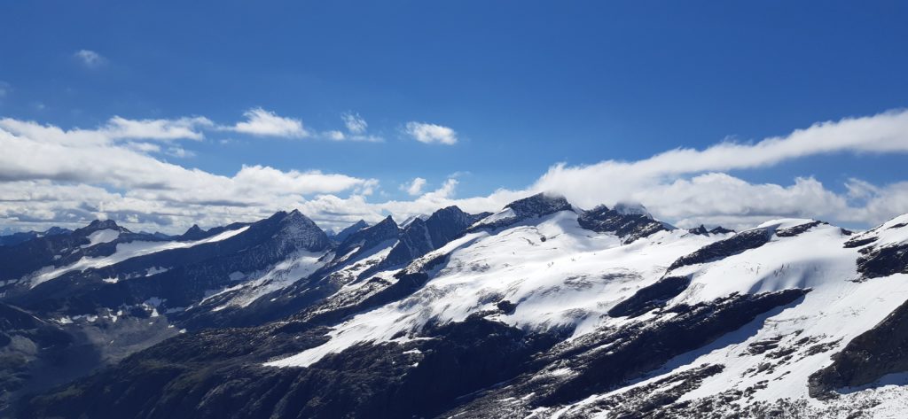 Am zweite Tag starten wir um acht ins Tal hinein Richtung Grosser Geiger. Die Rucksäcke sind mit der vollen Hochtourenausrüstung schwer und der Weg aus dem Talboden hinauf zum Gletscher führt fast weglos durch gewaltige Geröllmassen, abgeschliffene Granitplatten und viel Wasser. Ach ja und da liegt Neuschnee, zwischen den Steinen, auf den Platten und auf dem Altschnee der mit der Höhe immer größere Felder bildet. Nach drei Stunden stehen wir am Gletscher und suchen den Weg hinauf zum Gipfelaufbau. Der Rucksack ist jetzt leichter. Helm, Klettergurt, Steigeisen, Seil, … haben wir angelegt und eingebunden. Trotzdem wird es nicht leichter, denn die Neuschneeauflage macht das Gehen am Gletscher zu einen hochkonzentrierten Angelegenheit und mit jedem Höhenmeter wird die Schneehöhe und damit Intensität des Stapfens grösser. Knapp unter dreitausend Meter übernimmt Gerald die Führung von Wolfgang und nach fünf Stunden haben wir den Gipfelaufbau erreicht. Der Klettereinstieg ist herausfordernt weil steil und brüchig, dann wird der Weg zum Gipfel leichter, denn über den Schnee geht es die steile Flanke hinauf. Die Rast haben wir schon vor dem Gipfelaufbau gemacht so geniessen wir das Panorama und den ersten Spannungsabfall nach dem emotional herauffordernden Aufstieg. Der Grossvenediger im Nordosten, das Obersulzenbachkees bis hinunter zur türkischen Zeltstadt, nur der Grossglockner bleibt heute hinter den Wolken versteckt. Der Abstieg ist dann deutlichen einfacher und schneller. Am Gletscher haben wir unsere sichere Spur und die entdeckten Spalten sind eben schon gefunden. Nach zehneinhalb Stunden sind wir wieder auf der Hütte. Ich bin die letzten Meter barfuss gegangen, weil ich mir die schmerzenden Füsse wegen der ungewohnt engen Schuhe, unbedingt in das eiskalte Bachwasser stecken wollte. Das Essen und der Gerstensaft schmecken sehr gut und der Abend endet nach der Hüttenruhe die hier nicht um zehn ist.