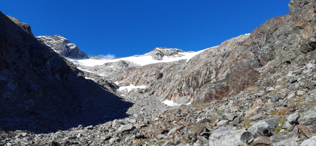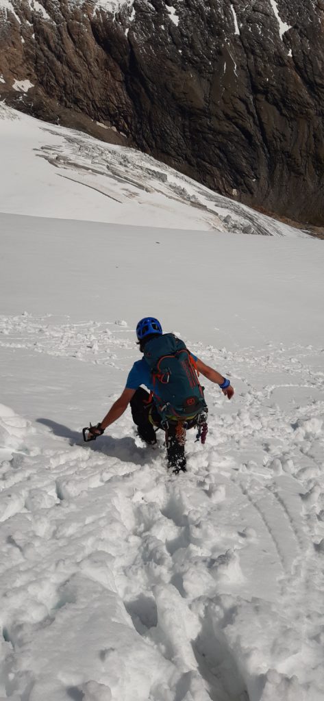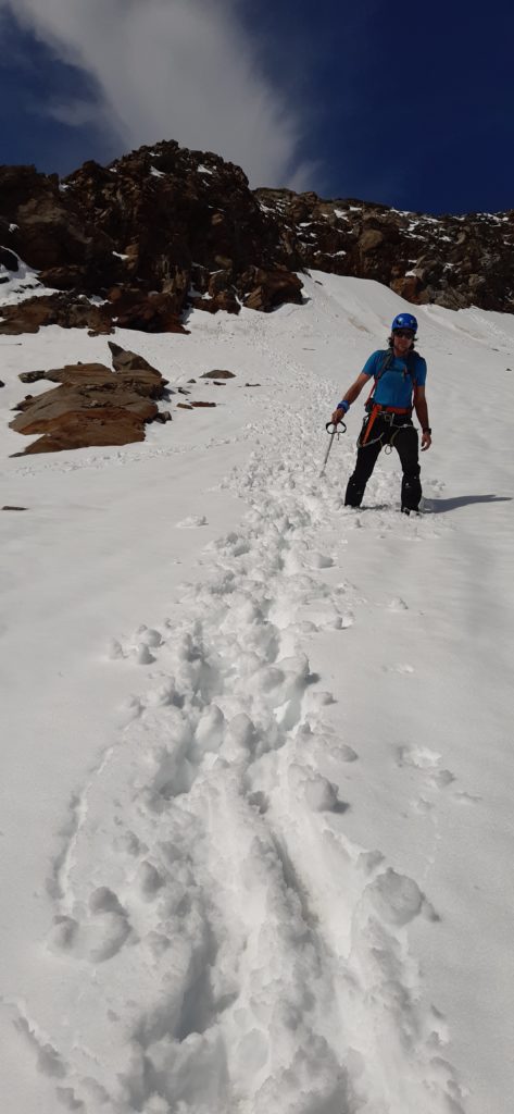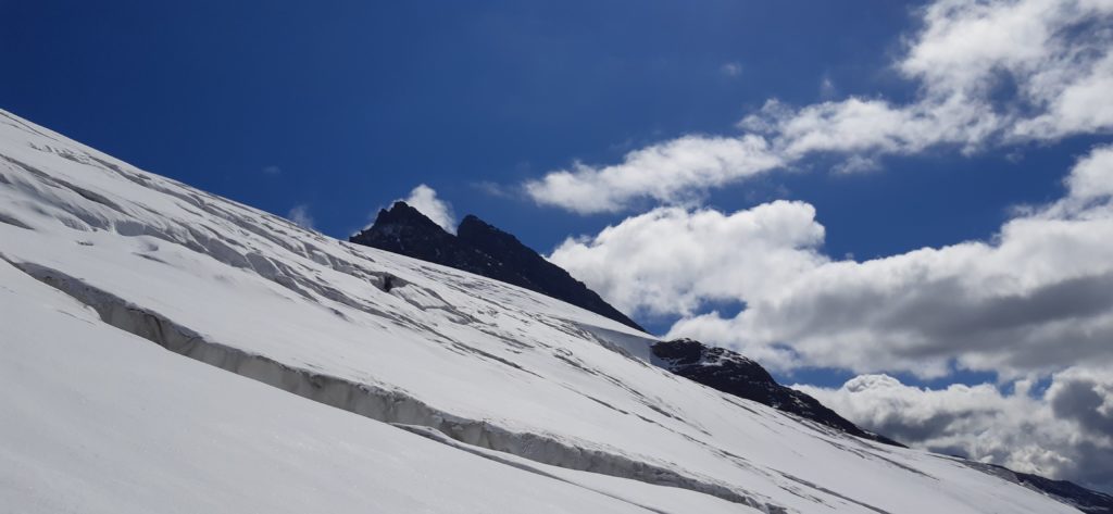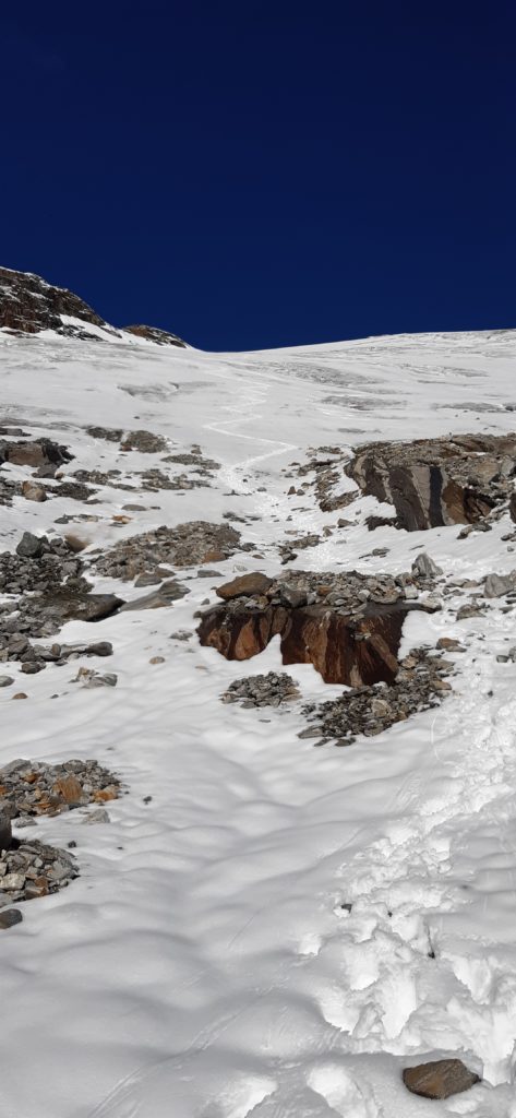 Am dritten Tag wollen wir auf die östlilche Simonispitze. Der Weg hinauf ist diesmal kürzer dafür steigt er schon nach zwanzig Minuten nach der Hütte steil den Grasberg im Nordwesten hinauf. Perfekt schlängelt sich der Pfad hinauf und von Anfang an ist es warm und die Wolken verziehen sich mehr und mehr. Diesmal führt uns ein Weg bis zum Gletscherfeld vor den Felsen. Auch diesmal haben wir die gesamten Hochtourenausrüstung mit und am Weg überlegen wir mehrfach ob wir nicht das schwere Zeug liegen lassen. Aber es kommt alles mit und so stapfen wir wieder am Gletscher, diesmal ohne Seil, weil der Teil des Gletschers völlig spaltenfrei ist. Die logische Kletterlinie macht durch den Neuschnee, der auf den flachen Bänkerls, die durch den Felsen hinaufführen, liegt, keinen sicheren und guten Eindruck. So wenden wir uns weiter Richtung Norden und suchen einen geiegnete Kletterstelle, an der wir auch trotz Randkluft gut zum Felsen kommen. Nach hundert Meter drehen wir um weil die Flanken zu steil und die Neuschneeauflage immer weicher wird. Am Rückweg inspizieren wir weitere Varianten, aber alles was gut zum Steigen aussieht ist mit Neuschnee bedeckt und der Rest zu steil oder zu brüchig. Wir überlegen hin und denken her entscheiden uns dann für den Abbrucht und machen uns nach einer Jause und Rast auf den Weg ins Tal. Auf dem Weg nach unten begünstigen wir auf über 200 Höhenmeter die Schneeschmelze indem wir uns die Kugeln zuschmeissen. Auf einem herrlichen Platzerl am Grasberg rasten wir nochmal und ich halte meine schmerzenden Zehen in die warmen Tümpel.