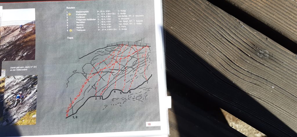 Nachdem am Ende der Tour noch Energie übrig ist versuchen wir uns an den Kletterrouten gleich vor der Hütte und haben unseren Spass an den Reibungsklettereine im Granit. Gewöhnungsbdrüftig sind die Routen allemal und beim nächsten Aufenthalt auf der Essener Rostock Hütte müssen die Kletterpatschen ins Gepäck. Der Hütten-Abend dauert dann bis in die Nacht weil um den Stammtisch eine Völkerverständigung zwischen innerösterreichischen Kulturen und der deutschen Diversizität passiert. Der stuttgarter Anwalt, dessen Sohn auf der Hütte ferial jobt, die Osttiroler Viehhirtin, die im Winter Finanzbuchhalterin ist, reden da mit bekannten Oststeirern und Zillertaler Baupolieren die zum Mineraliensammlen sind. Ich mache die Probezeit für die Wintersaison, wenn die Hütte dann voll ist. In der Früh können sich nicht mehr alle an die Zahl erinnern die auf ihrer Hand steht und das aufstehen fällt schwer.