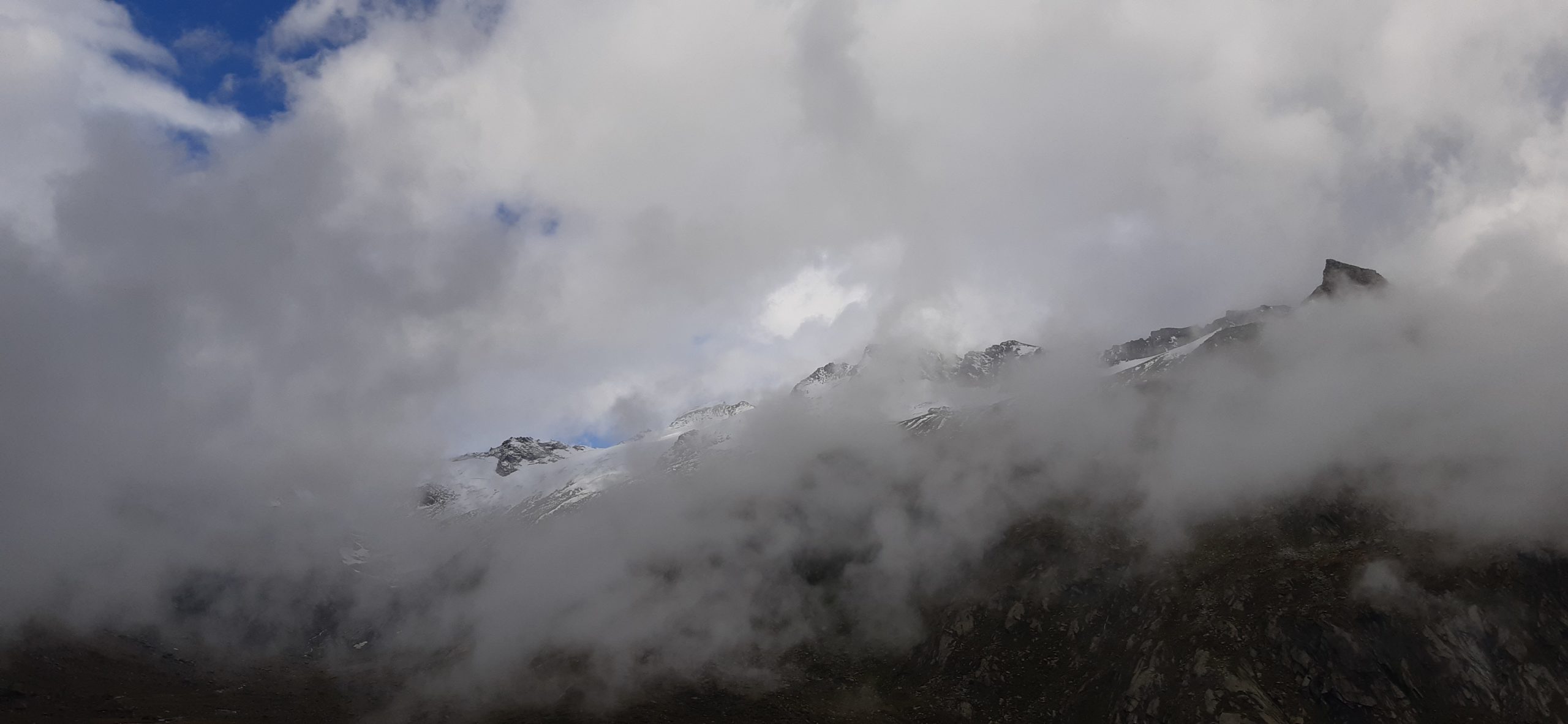 Anfang September kann es für eine Hochtour schon recht spät sein. Am Wochenende davor hat es bis auf 2500 Meter herunter geschneit und als Wolfi, Gerald und ich am Mittwoch nach dem eineinhalbstündigen und leichtem, weil gepäcksbefreitem Zustieg auf der Essener und Rostock Hütte ankommen, sehen wir rundherum viel weiss. Nach dem wir unsere Rucksäcke aus der Matrialseilbahn geholt haben geht es noch auf das Rostocker Eck. Das tosende Rauschen des Wasser ist ein ständiger Begleiter um die Hütte und erst auf den Gipfelgrat wird es zu einem leisen Murmeln. Der Weg hinauf aufs Eck ist so eine audible Reise den in den tiefen Wolken ist nicht viel zu sehen. Die Wolken reissen auch oben nicht so ganz auf, dazwischen zeigen sich aber immer wieder ein paar Berge, Gletscher und Felsen. Die ersten Blicke sind beeindruckend, die schroffen Felsen, das bizarre Eis rundherum und die Tiefblicke in die zerfurchte Gletscherlandschaft mit endlichen Schutt- und Schotterhalden sind gewaltig. Der Abstieg erfolgt über die Aufstiegsroute und meandriert über die steile Flanke hinunter. Wir schauen hinunter auf den Almwellness des Simonisees und schon der erste Abend auf der Hütte wird ein bißchen länger als gedacht.