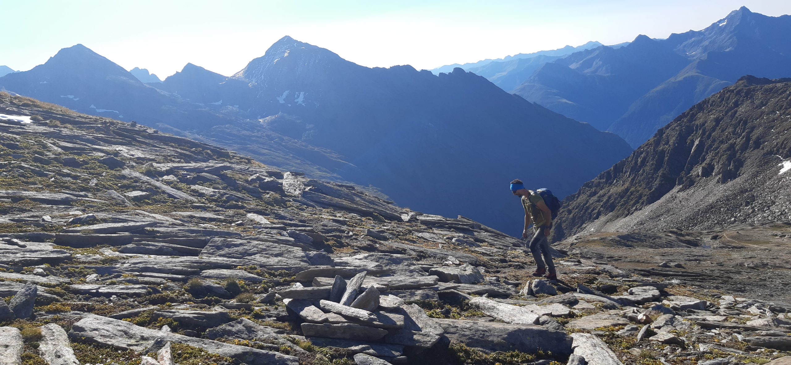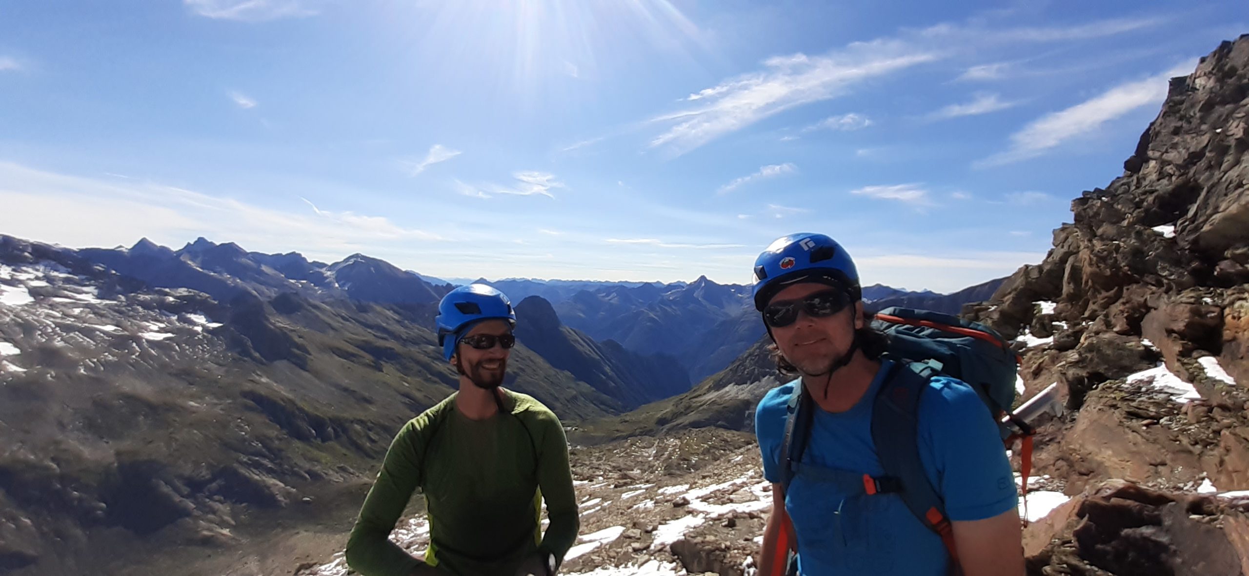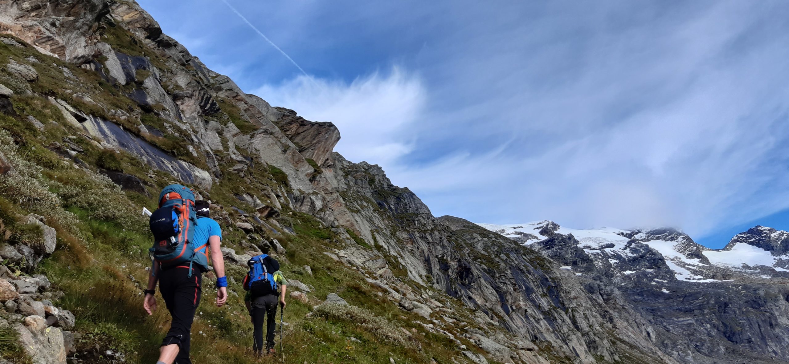 Zu guter Letzt wollen wir noch auf den Happ, den südlichen, weil der grosse Happ soll ein Schuthaufen sein. Die ersten eineinhalb Stunden hinauf zum Türmljoch ist für einige von uns, wegen der Altlasten von gestern und den mitleriweile vielen Höhenmetern in den Beinen recht mühsam. Der Aufstieg bis zum Grat ist einfach und dann geht es einige Meter ausgesetzt und in einfacher Kletterei hinauf zum Gipfel. Der Ausblick von dieser Seite des Tals ist besonderns beeindruckend und wie gestern reicht der Blick vom Grossglockner bis zu den Dolomiten. Am Abstieg helfen wir dem Senner noch mit dem treiben seiner Kühe.