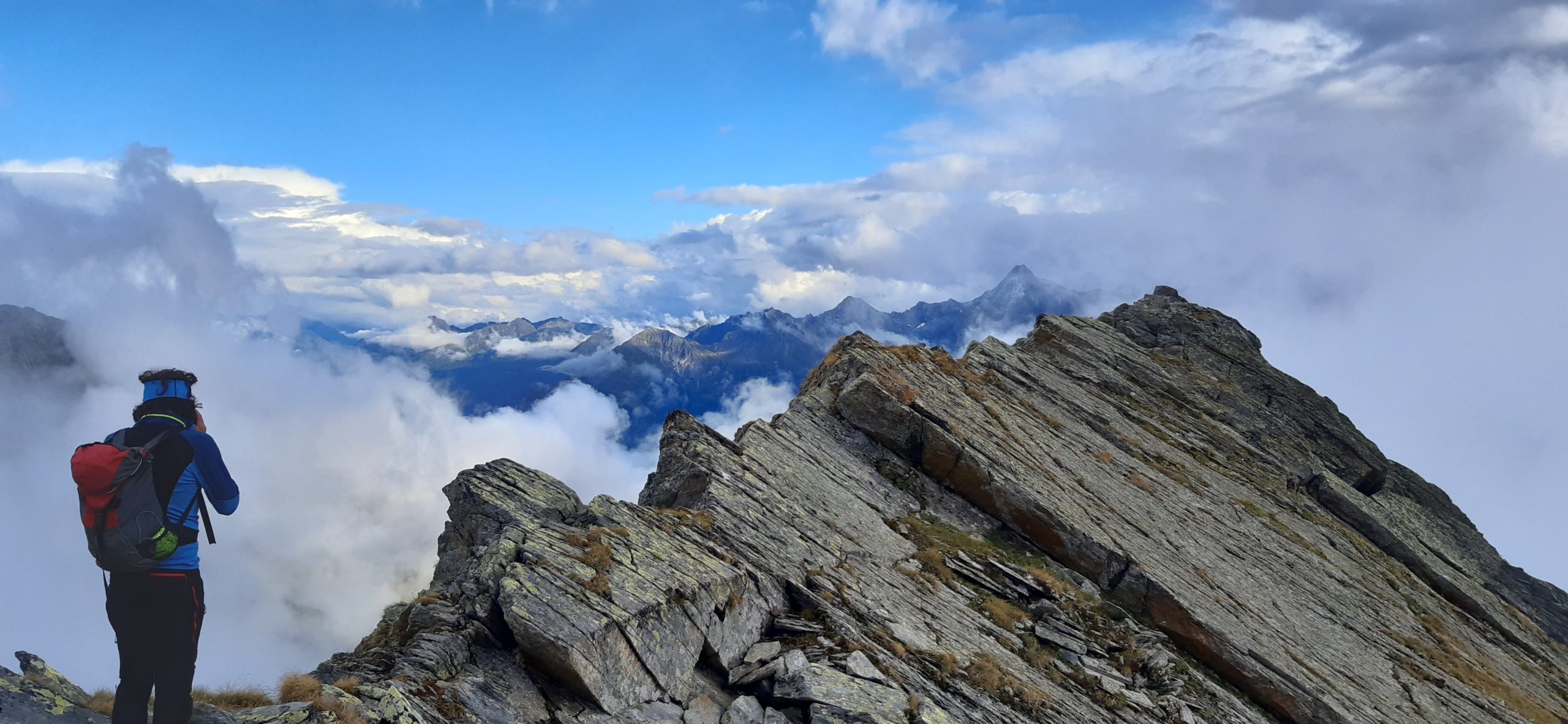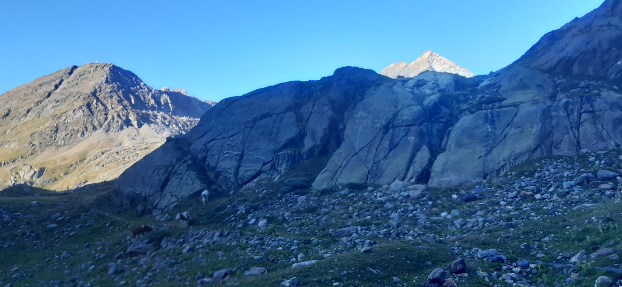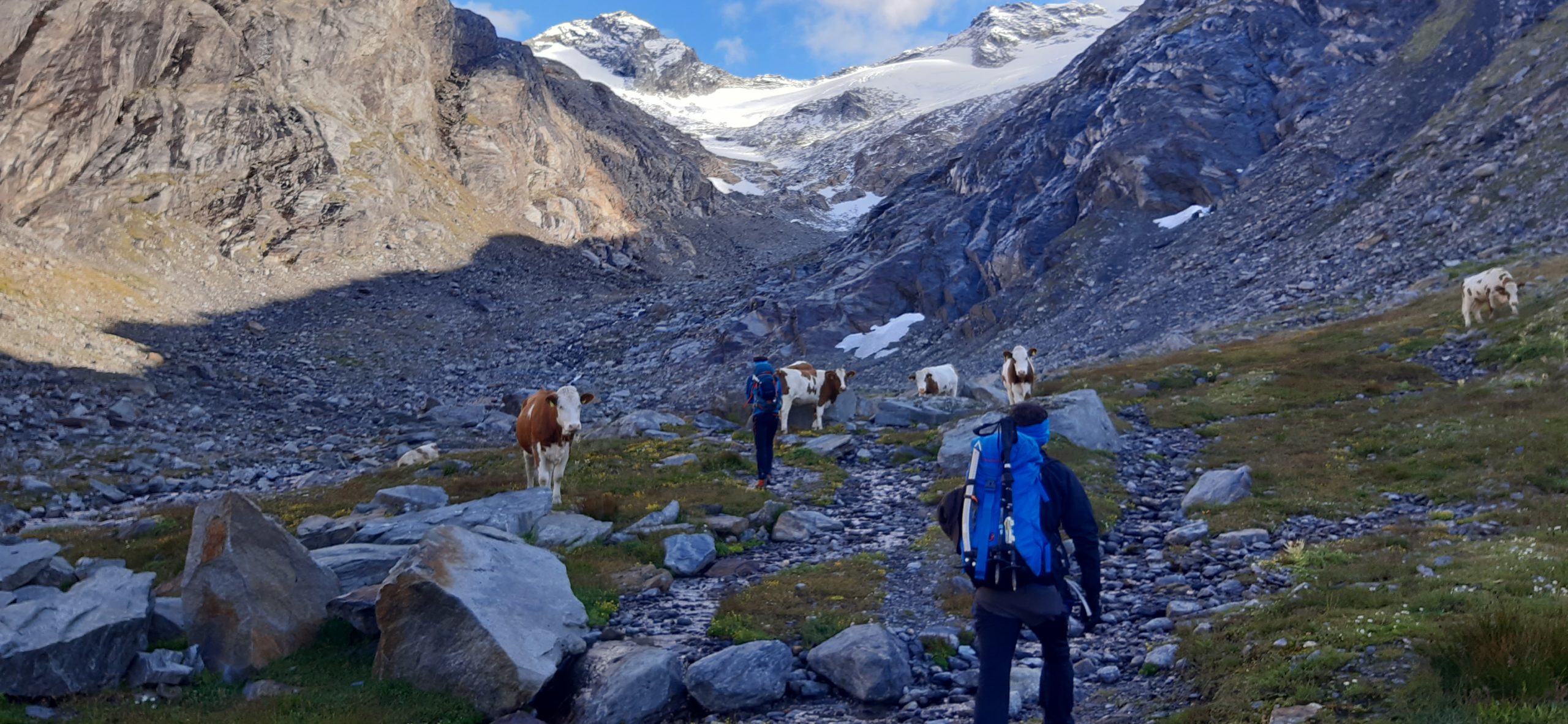 Zu guter Letzt wollen wir noch auf den Happ, den südlichen, weil der grosse Happ soll ein Schuthaufen sein. Die ersten eineinhalb Stunden hinauf zum Türmljoch ist für einige von uns, wegen der Altlasten von gestern und den mitleriweile vielen Höhenmetern in den Beinen recht mühsam. Der Aufstieg bis zum Grat ist einfach und dann geht es einige Meter ausgesetzt und in einfacher Kletterei hinauf zum Gipfel. Der Ausblick von dieser Seite des Tals ist besonderns beeindruckend und wie gestern reicht der Blick vom Grossglockner bis zu den Dolomiten. Am Abstieg helfen wir dem Senner noch mit dem treiben seiner Kühe.