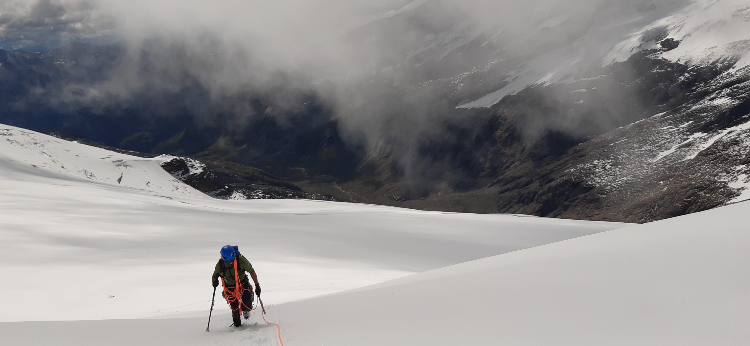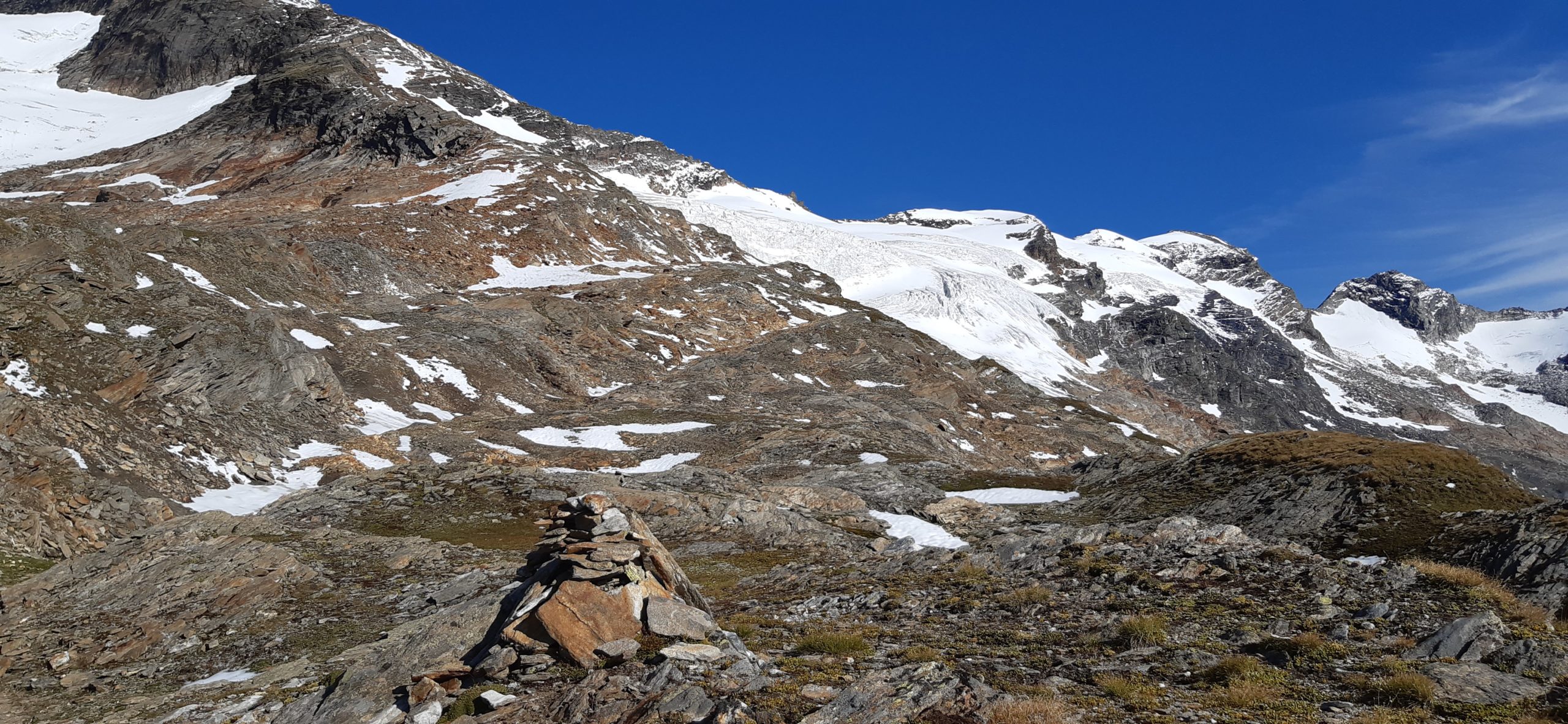 Am zweite Tag starten wir um acht ins Tal hinein Richtung Grosser Geiger. Die Rucksäcke sind mit der vollen Hochtourenausrüstung schwer und der Weg aus dem Talboden hinauf zum Gletscher führt fast weglos durch gewaltige Geröllmassen, abgeschliffene Granitplatten und viel Wasser. Ach ja und da liegt Neuschnee, zwischen den Steinen, auf den Platten und auf dem Altschnee der mit der Höhe immer größere Felder bildet. Nach drei Stunden stehen wir am Gletscher und suchen den Weg hinauf zum Gipfelaufbau. Der Rucksack ist jetzt leichter. Helm, Klettergurt, Steigeisen, Seil, … haben wir angelegt und eingebunden. Trotzdem wird es nicht leichter, denn die Neuschneeauflage macht das Gehen am Gletscher zu einen hochkonzentrierten Angelegenheit und mit jedem Höhenmeter wird die Schneehöhe und damit Intensität des Stapfens grösser. Knapp unter dreitausend Meter übernimmt Gerald die Führung von Wolfgang und nach fünf Stunden haben wir den Gipfelaufbau erreicht. Der Klettereinstieg ist herausfordernt weil steil und brüchig, dann wird der Weg zum Gipfel leichter, denn über den Schnee geht es die steile Flanke hinauf. Die Rast haben wir schon vor dem Gipfelaufbau gemacht so geniessen wir das Panorama und den ersten Spannungsabfall nach dem emotional herauffordernden Aufstieg. Der Grossvenediger im Nordosten, das Obersulzenbachkees bis hinunter zur türkischen Zeltstadt, nur der Grossglockner bleibt heute hinter den Wolken versteckt. Der Abstieg ist dann deutlichen einfacher und schneller. Am Gletscher haben wir unsere sichere Spur und die entdeckten Spalten sind eben schon gefunden. Nach zehneinhalb Stunden sind wir wieder auf der Hütte. Ich bin die letzten Meter barfuss gegangen, weil ich mir die schmerzenden Füsse wegen der ungewohnt engen Schuhe, unbedingt in das eiskalte Bachwasser stecken wollte. Das Essen und der Gerstensaft schmecken sehr gut und der Abend endet nach der Hüttenruhe die hier nicht um zehn ist.