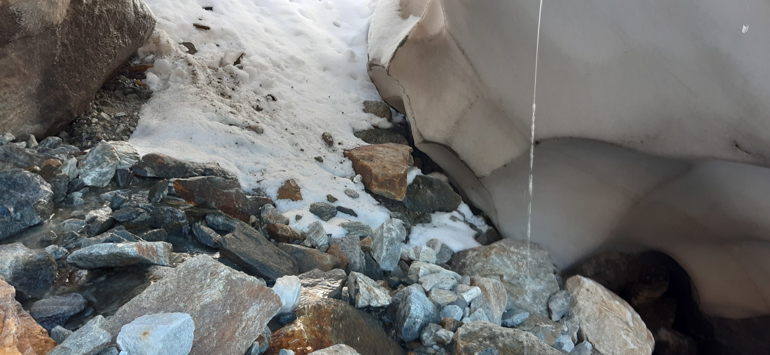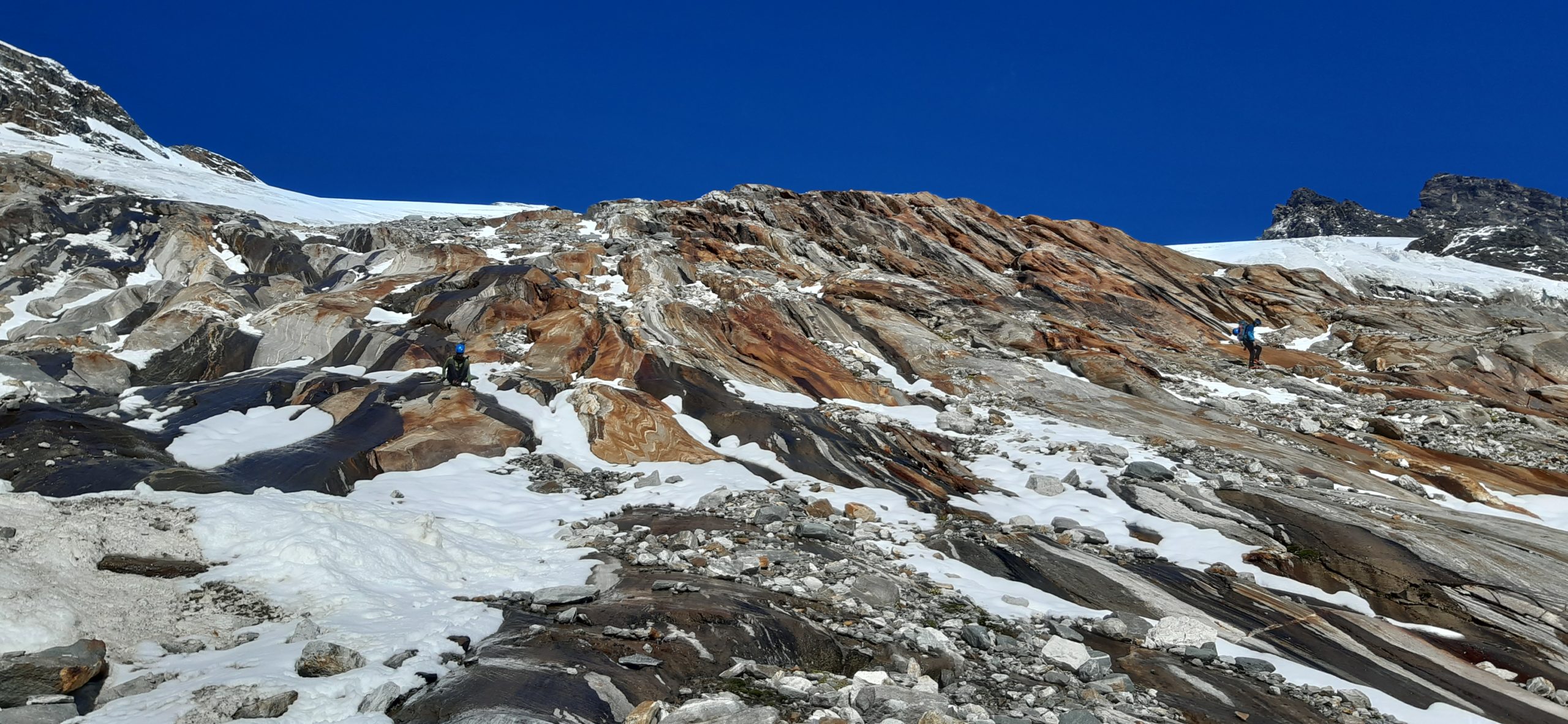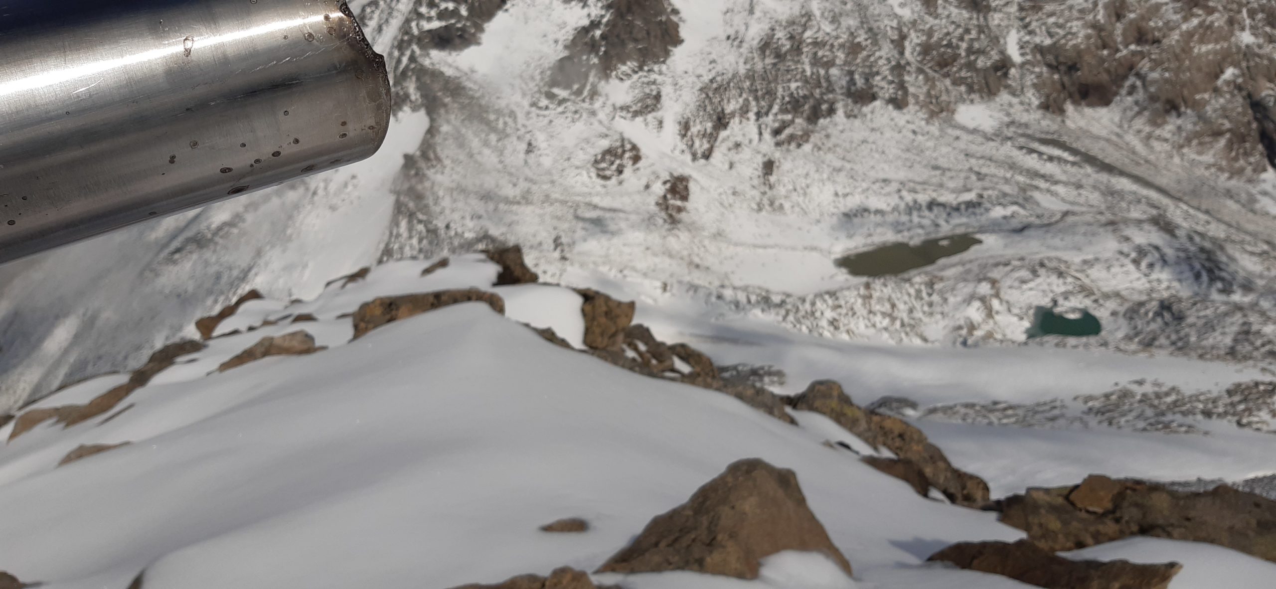 Am dritten Tag wollen wir auf die östlilche Simonispitze. Der Weg hinauf ist diesmal kürzer dafür steigt er schon nach zwanzig Minuten nach der Hütte steil den Grasberg im Nordwesten hinauf. Perfekt schlängelt sich der Pfad hinauf und von Anfang an ist es warm und die Wolken verziehen sich mehr und mehr. Diesmal führt uns ein Weg bis zum Gletscherfeld vor den Felsen. Auch diesmal haben wir die gesamten Hochtourenausrüstung mit und am Weg überlegen wir mehrfach ob wir nicht das schwere Zeug liegen lassen. Aber es kommt alles mit und so stapfen wir wieder am Gletscher, diesmal ohne Seil, weil der Teil des Gletschers völlig spaltenfrei ist. Die logische Kletterlinie macht durch den Neuschnee, der auf den flachen Bänkerls, die durch den Felsen hinaufführen, liegt, keinen sicheren und guten Eindruck. So wenden wir uns weiter Richtung Norden und suchen einen geiegnete Kletterstelle, an der wir auch trotz Randkluft gut zum Felsen kommen. Nach hundert Meter drehen wir um weil die Flanken zu steil und die Neuschneeauflage immer weicher wird. Am Rückweg inspizieren wir weitere Varianten, aber alles was gut zum Steigen aussieht ist mit Neuschnee bedeckt und der Rest zu steil oder zu brüchig. Wir überlegen hin und denken her entscheiden uns dann für den Abbrucht und machen uns nach einer Jause und Rast auf den Weg ins Tal. Auf dem Weg nach unten begünstigen wir auf über 200 Höhenmeter die Schneeschmelze indem wir uns die Kugeln zuschmeissen. Auf einem herrlichen Platzerl am Grasberg rasten wir nochmal und ich halte meine schmerzenden Zehen in die warmen Tümpel.