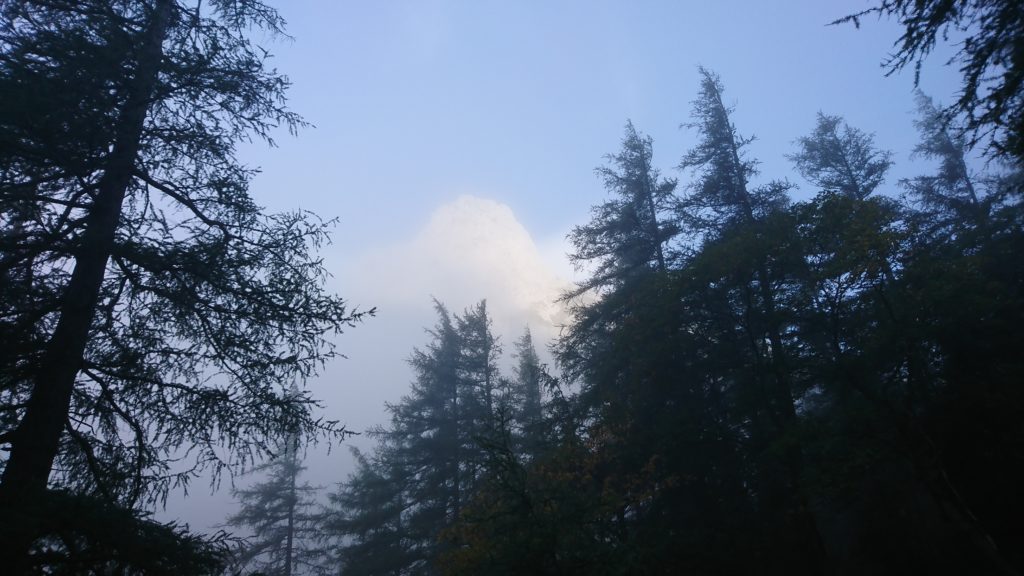 Vom Parkplatz in der Fölz starte ich den erst noch gut fahrbaren Weg zur Alm hinauf. Der Nebel hängt tief, der Weg bleibt breit wird aber so steil, dass ich fast durchgehend schieben muss. Das Ambiente vor der Alm und über dem Nebel ist berauschend. Ein großes Rudel Gämse genießt dieses ebenso. Nach einer ausgiebigen Pause kommt eine feine kurze fahrbare Passage bevor ich vom Fölzsattel etwa 400 Hm auf die Mitteralm trage. Teilweise sind die Latschen sehr eng gepflanzt und ich winde mich durch sie hindurch. Ab genz oben ist alles Gut. Die Ausblicke zur Südwand, die Dullwitz und nach Seewiesen sind atemberaubend. Der Trail Richtung Bürgeralm und Windgrube ist großteils fahrbar, vieles davon auf traumhaften Almboden, mit einem gerölligen Steilstück runter auf die Zlacken. Dort geht es nahe dem Abgrund entlang, von einer Latschen erntenten Dame bekomme ich ein Glückszweigerl in den Ruckssack gesteckt.