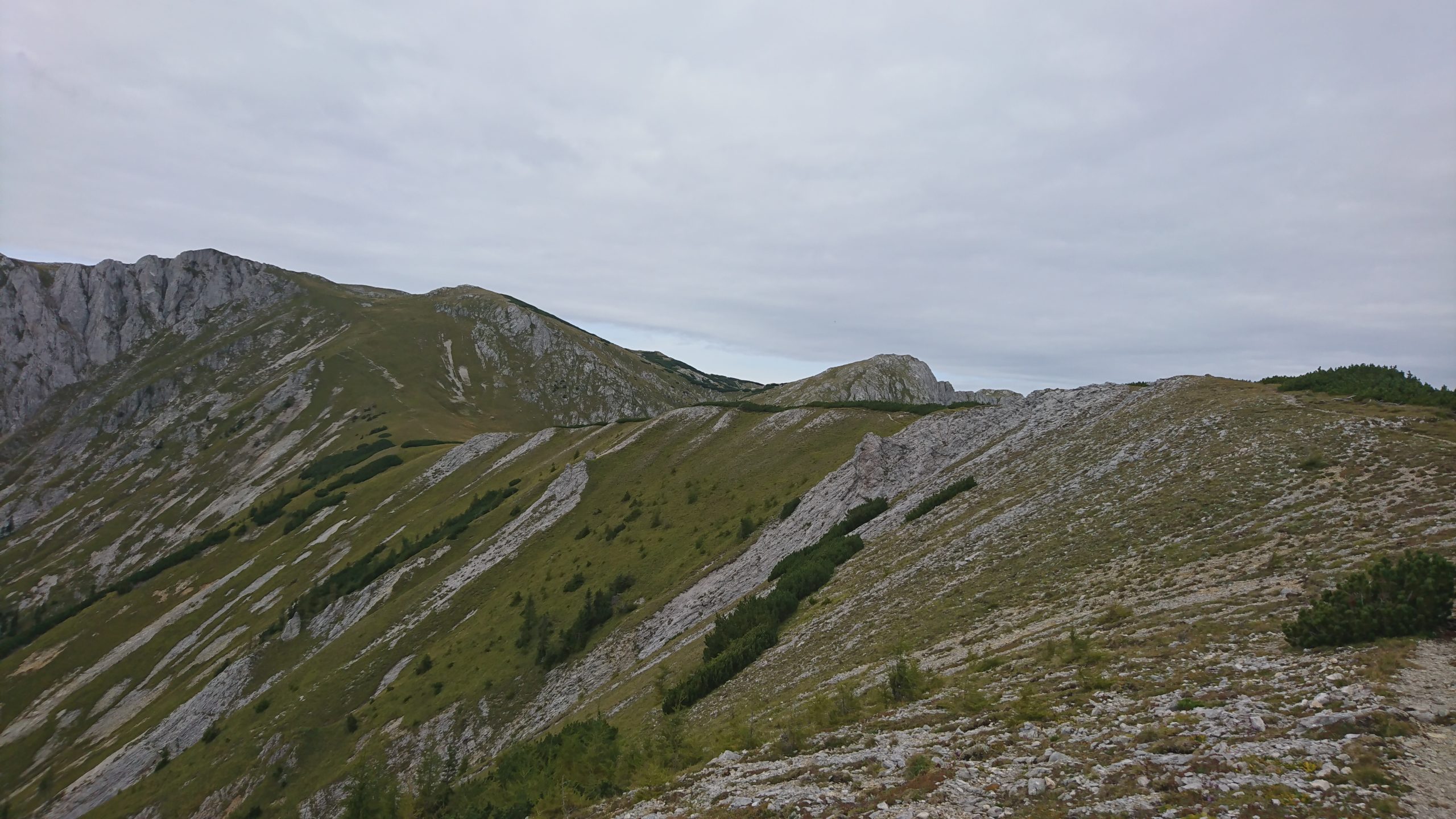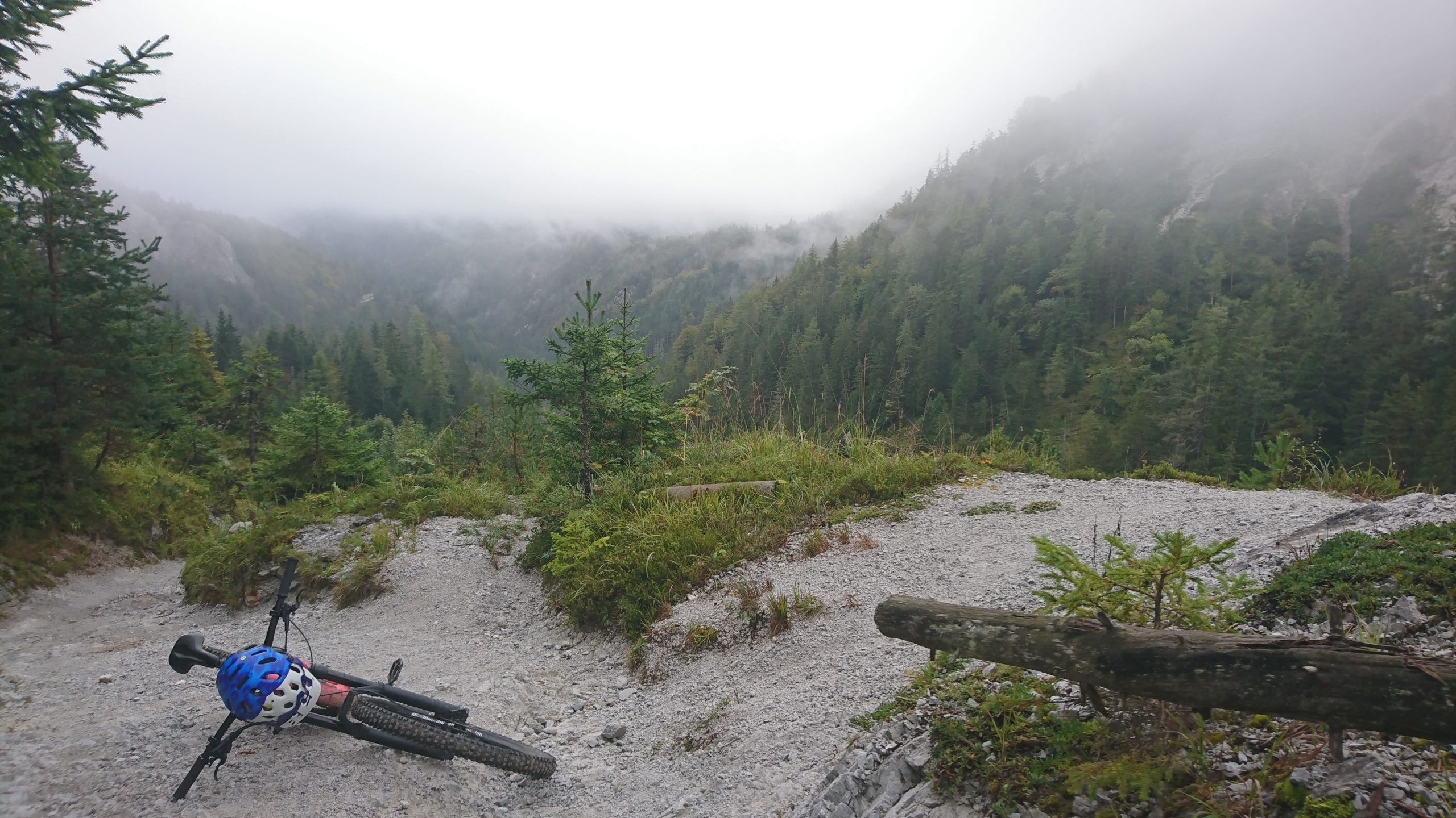 Vom Parkplatz in der Fölz starte ich den erst noch gut fahrbaren Weg zur Alm hinauf. Der Nebel hängt tief, der Weg bleibt breit wird aber so steil, dass ich fast durchgehend schieben muss. Das Ambiente vor der Alm und über dem Nebel ist berauschend. Ein großes Rudel Gämse genießt dieses ebenso. Nach einer ausgiebigen Pause kommt eine feine kurze fahrbare Passage bevor ich vom Fölzsattel etwa 400 Hm auf die Mitteralm trage. Teilweise sind die Latschen sehr eng gepflanzt und ich winde mich durch sie hindurch. Ab genz oben ist alles Gut. Die Ausblicke zur Südwand, die Dullwitz und nach Seewiesen sind atemberaubend. Der Trail Richtung Bürgeralm und Windgrube ist großteils fahrbar, vieles davon auf traumhaften Almboden, mit einem gerölligen Steilstück runter auf die Zlacken. Dort geht es nahe dem Abgrund entlang, von einer Latschen erntenten Dame bekomme ich ein Glückszweigerl in den Ruckssack gesteckt.