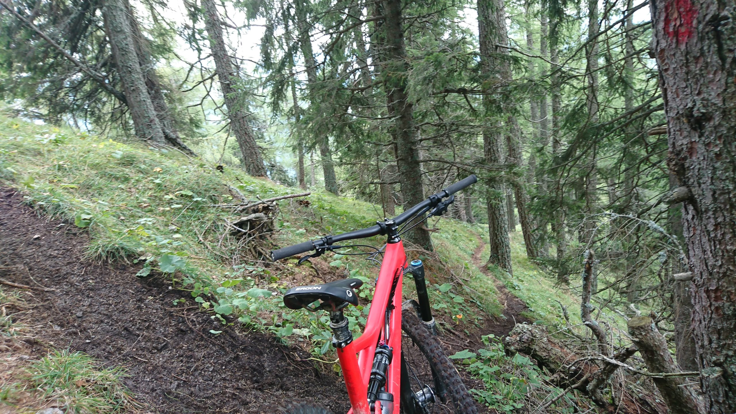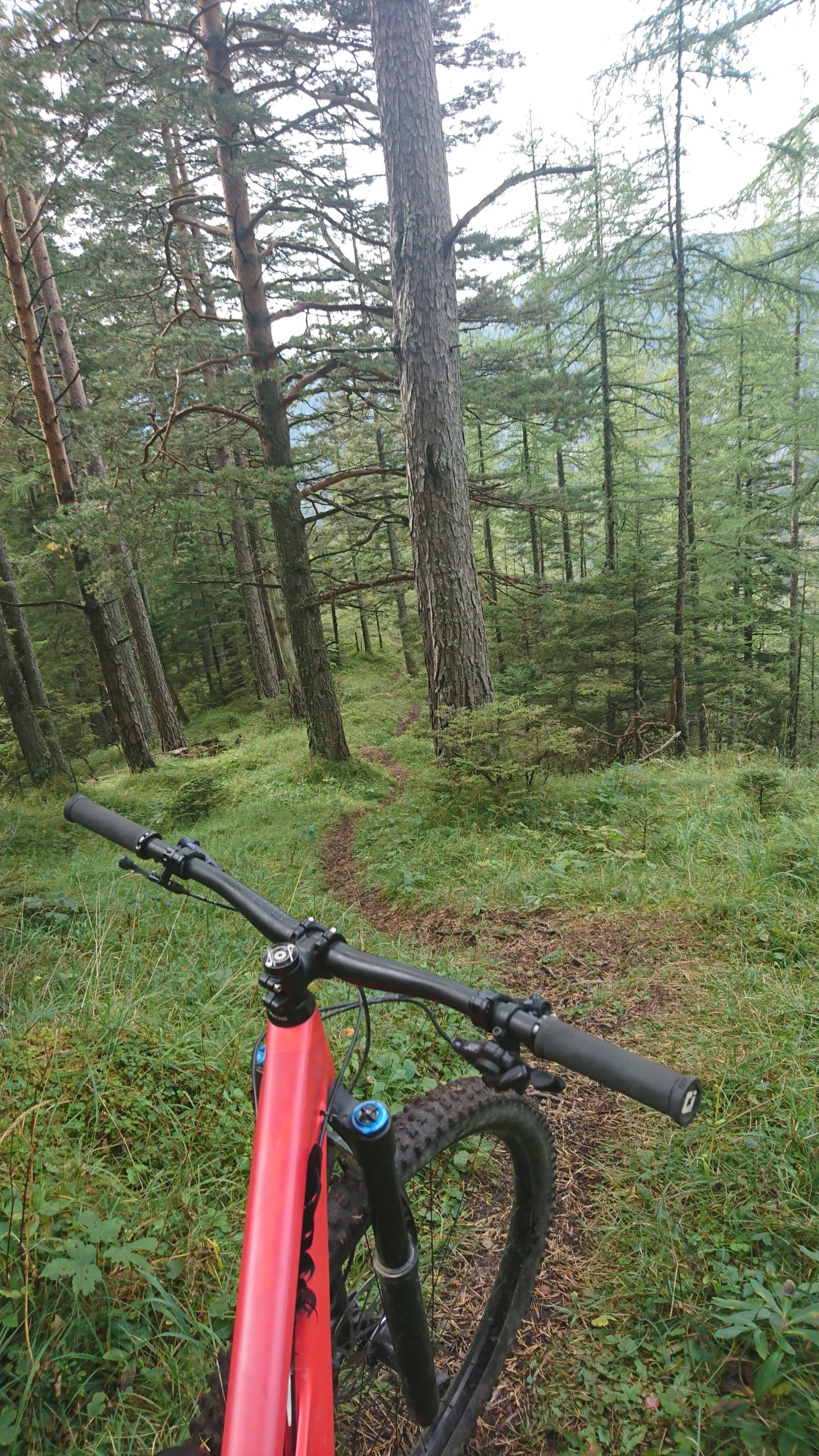 Runter von der Windgrube möchte ich den „Hans Leitner Alpinsteig“. Ich weiß nicht was mich erwartet, nur, dass er als steil charakterisiert ist und erst 1992 erbaut wurde. Nach den ersten hundert Hm bin ich entzückt. Ich glaube, das ist das steilste je von mir gefahrene Abschnitt und das auf griffigstem Waldboden. Viele Lange Abschnitte des 800hm Abstiegs sind gut fahrbar, manche unglaublich flowig und sanft den Rücken entlang, manche auch wahnwitzig steil. Weiter unten reiht sich eine Spitzkehre an die andere an denen ich mit meiner derzeitigen Technik scheitere. Auch längere Abschnitte die ich schieben muss weil doch zu wild sind dabei. Insgesamt jedoch unglaublich lohnend und mehr Single kann ein Trail nicht sein. Wäre nicht der mühsame Aufstieg, ich würde die Runde regelmässig machen bis ich irgendwann alles fahren kann;-)