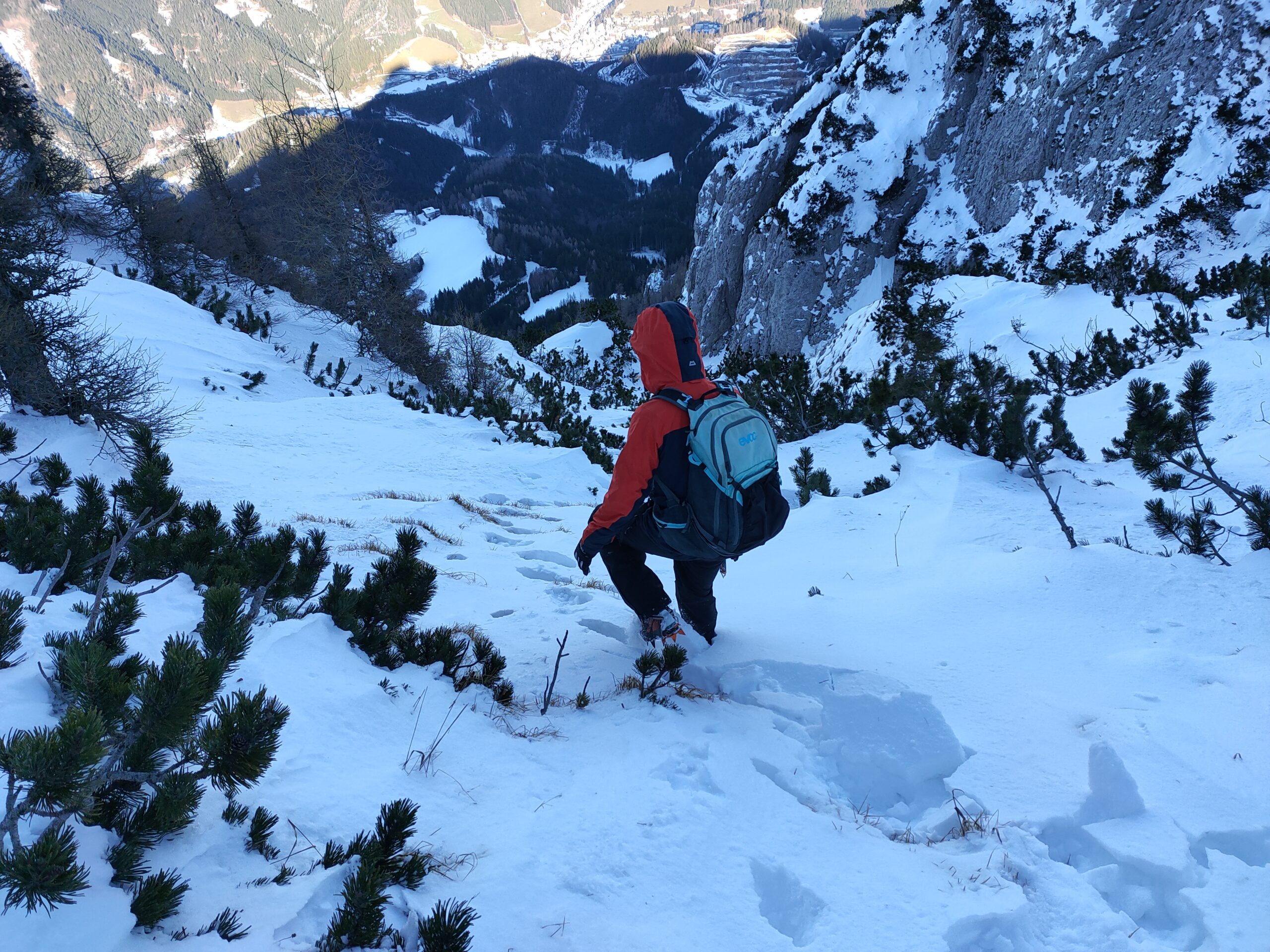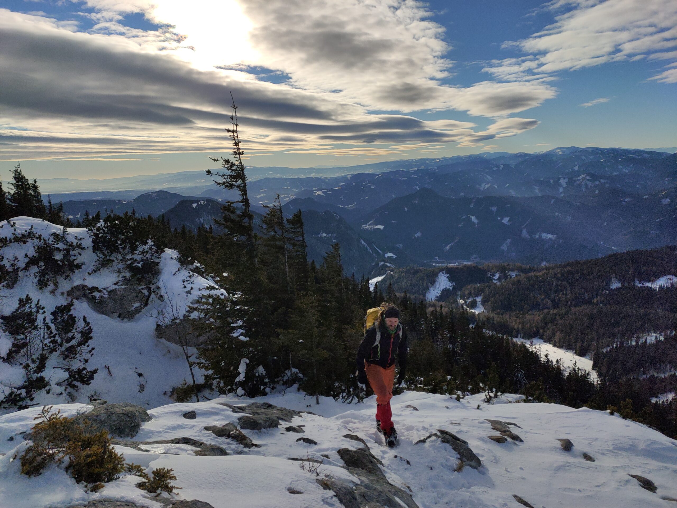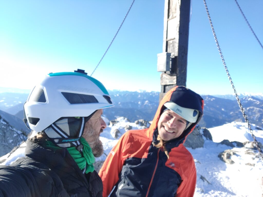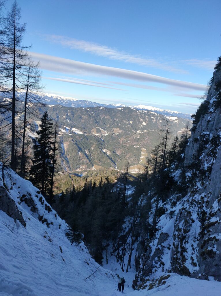 Die Föhnwolken ziehen von Norden herein, als Ben und ich auf der Sonnenseite den Hochlantsch hinaufgehen. Kaum Wind, dafür wunderbares Wintergefühl im Schnee. Oben am Gipfel ist der Wind deutlich weniger als erwartet und wir sind nicht ganz allein. Die Steigeisen hätten wir gleich beim Weggehen anziehen sollen, denn auf dem eisigen Parkplatz am Teichalmsee ist erhöhte Rutschgefahr. Jetzt schnallen wir sie auf die Bergschuhe und steigen den Jägersteig auf der Nordseite hinunter. Die ersten Schritte in das steile Gelände sind gewöhnungsbedürftig. Wir folgen einer einsamen Spur und kurz vor den beiden zu kletternden Stellen kommt uns ein Pärchen entgegen. Wir sind doch nicht allein. Der Wind im oberen Teil ist frisch, der Schnee gut gesetzt und gut zu steigen. Den Übergang zum Klettersteig einstieg verfehle ich fast. Mit Bens Untestützung finde ich zurück auf den rechten Weg nach links. Dann geht es in die Rinne neben dem Klettersteig wieder hinauf. Hier finden wir gute Spuren durch den tiefen Schnee. Der Harschdeckel ist meist nicht tragend und die Spuren erleichtern das Steigen deutlich. Die an der ersten Schlüsselstellen scheitern wir mangels guter Unterlage aus Schnee und Eis und der Fels allein vermittelt einfach nicht genug Trittsicherheit. Über das Klettersteigseil sind wir sicher unterwegs. Dazwischen pfeift immer wieder heftig der kalte Nordwind und dann scheint wieder die Sonne, einfach wunderbar. Auch kurz vor dem Ausstieg ist wieder eine heickle Stelle, die über das Seil gut geht, wir probieren es aber über die Rinne. Mit mehr Schnee und Eis wäre es lässiger, so ist es ein rechtes herumgeschiebe auf wackeligen Zacken. Oben stehen wir wieder in der Sonne und im kalten Wind. Am Rückweg machen wir noch am Kreuz am Ost“Gipfel“ halt. Die Steigeisen lassen wir bis zum Teichalmsee an. Sicher ist sicher und die Kletter und Rutschübungen am Eis des Sees machen nochmal richtig Spass.