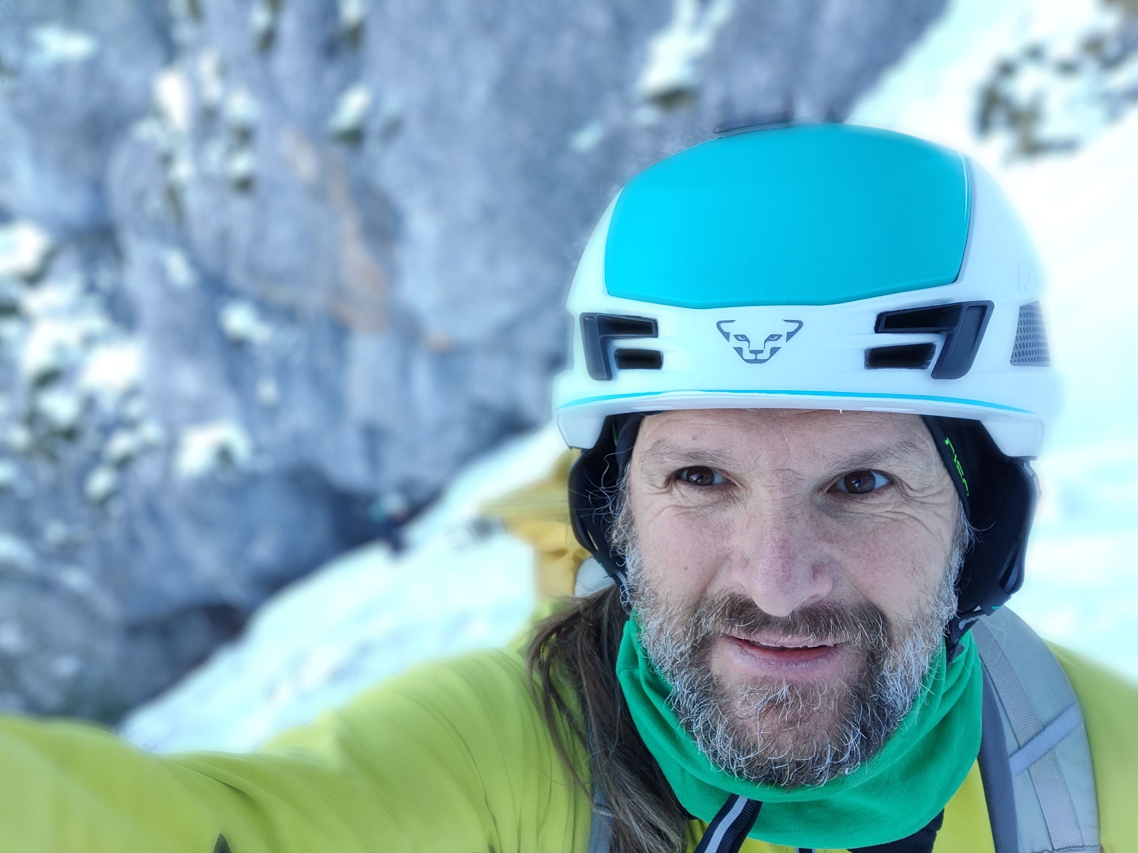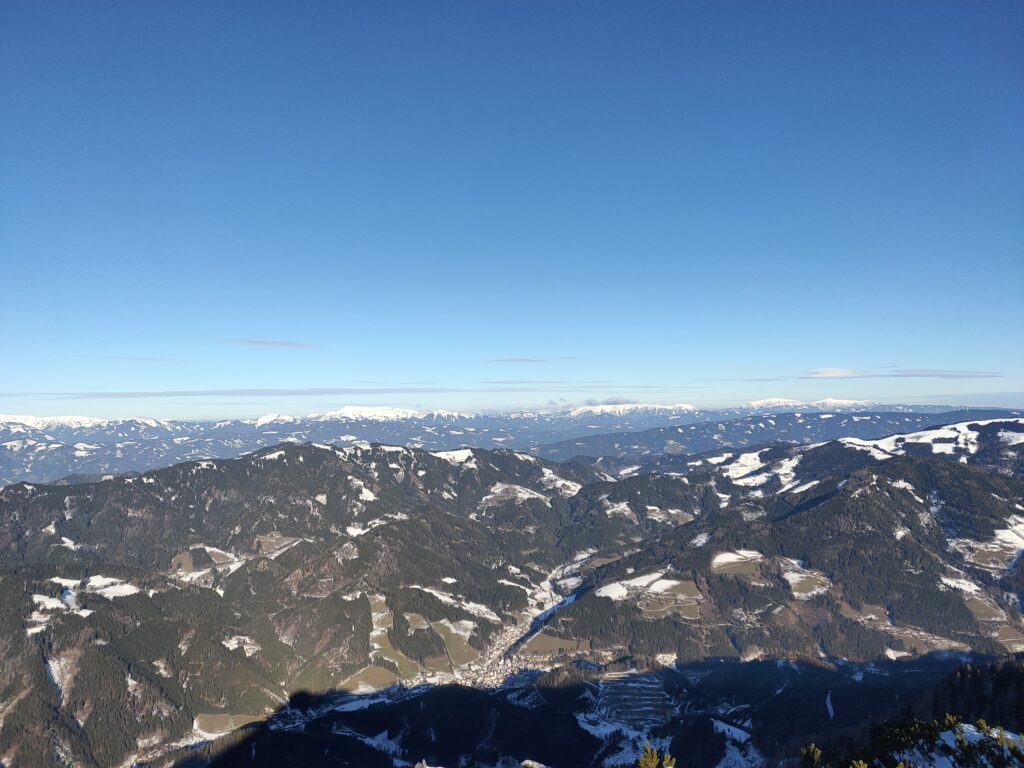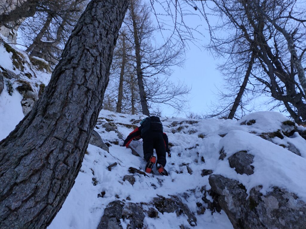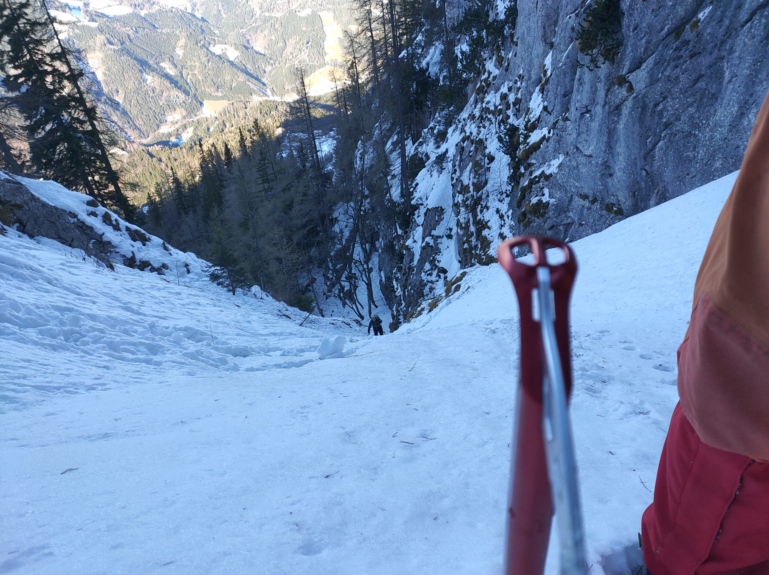 Die Föhnwolken ziehen von Norden herein, als Ben und ich auf der Sonnenseite den Hochlantsch hinaufgehen. Kaum Wind, dafür wunderbares Wintergefühl im Schnee. Oben am Gipfel ist der Wind deutlich weniger als erwartet und wir sind nicht ganz allein. Die Steigeisen hätten wir gleich beim Weggehen anziehen sollen, denn auf dem eisigen Parkplatz am Teichalmsee ist erhöhte Rutschgefahr. Jetzt schnallen wir sie auf die Bergschuhe und steigen den Jägersteig auf der Nordseite hinunter. Die ersten Schritte in das steile Gelände sind gewöhnungsbedürftig. Wir folgen einer einsamen Spur und kurz vor den beiden zu kletternden Stellen kommt uns ein Pärchen entgegen. Wir sind doch nicht allein. Der Wind im oberen Teil ist frisch, der Schnee gut gesetzt und gut zu steigen. Den Übergang zum Klettersteig einstieg verfehle ich fast. Mit Bens Untestützung finde ich zurück auf den rechten Weg nach links. Dann geht es in die Rinne neben dem Klettersteig wieder hinauf. Hier finden wir gute Spuren durch den tiefen Schnee. Der Harschdeckel ist meist nicht tragend und die Spuren erleichtern das Steigen deutlich. Die an der ersten Schlüsselstellen scheitern wir mangels guter Unterlage aus Schnee und Eis und der Fels allein vermittelt einfach nicht genug Trittsicherheit. Über das Klettersteigseil sind wir sicher unterwegs. Dazwischen pfeift immer wieder heftig der kalte Nordwind und dann scheint wieder die Sonne, einfach wunderbar. Auch kurz vor dem Ausstieg ist wieder eine heickle Stelle, die über das Seil gut geht, wir probieren es aber über die Rinne. Mit mehr Schnee und Eis wäre es lässiger, so ist es ein rechtes herumgeschiebe auf wackeligen Zacken. Oben stehen wir wieder in der Sonne und im kalten Wind. Am Rückweg machen wir noch am Kreuz am Ost“Gipfel“ halt. Die Steigeisen lassen wir bis zum Teichalmsee an. Sicher ist sicher und die Kletter und Rutschübungen am Eis des Sees machen nochmal richtig Spass.