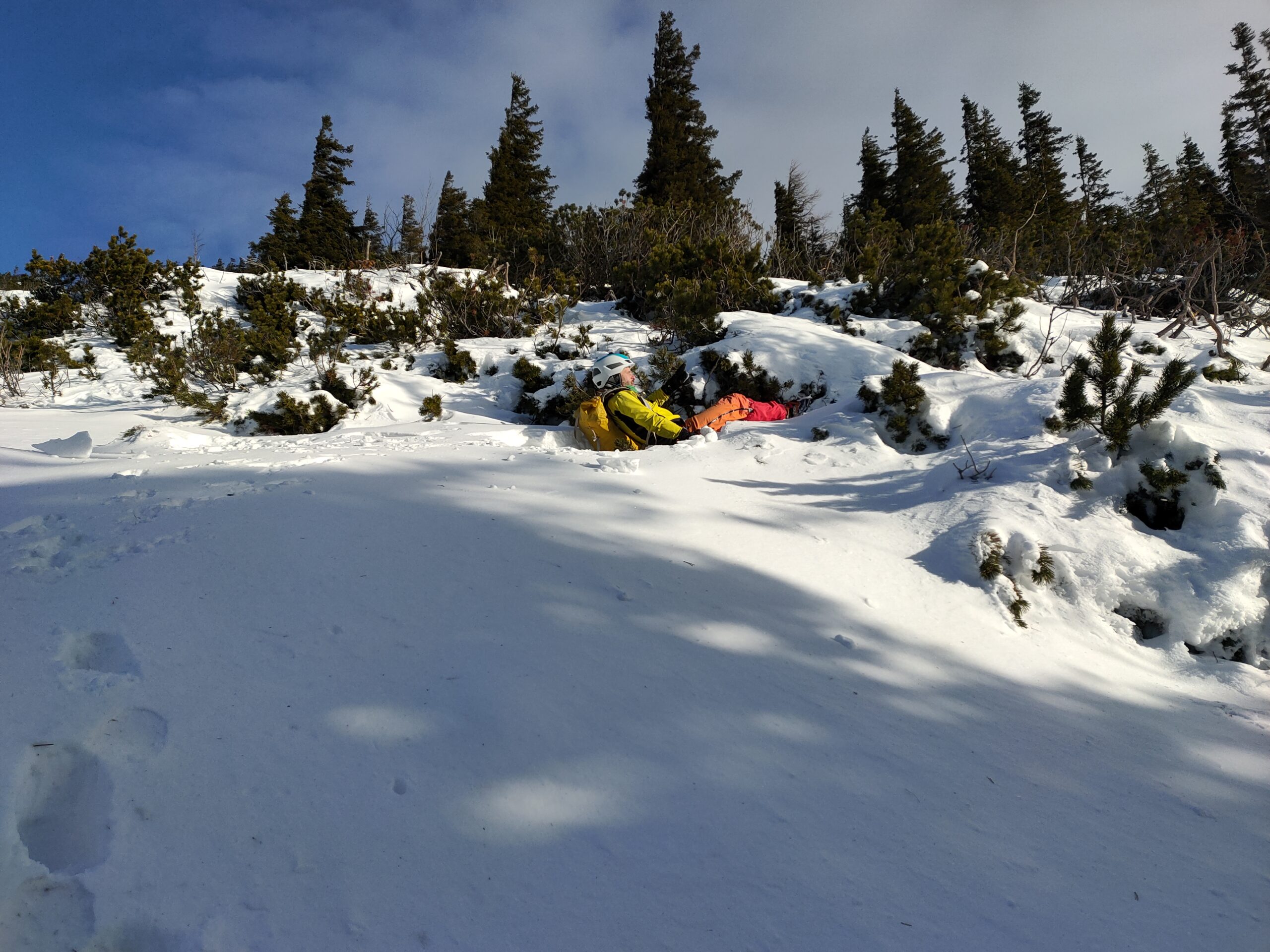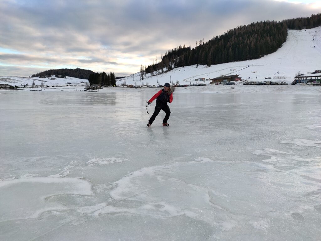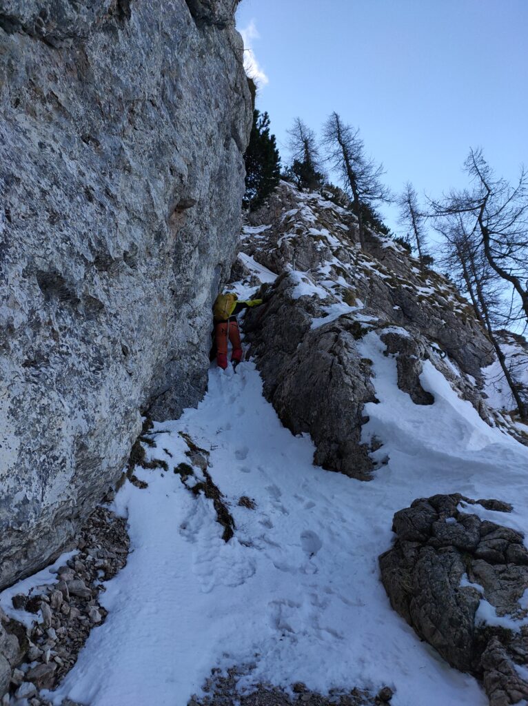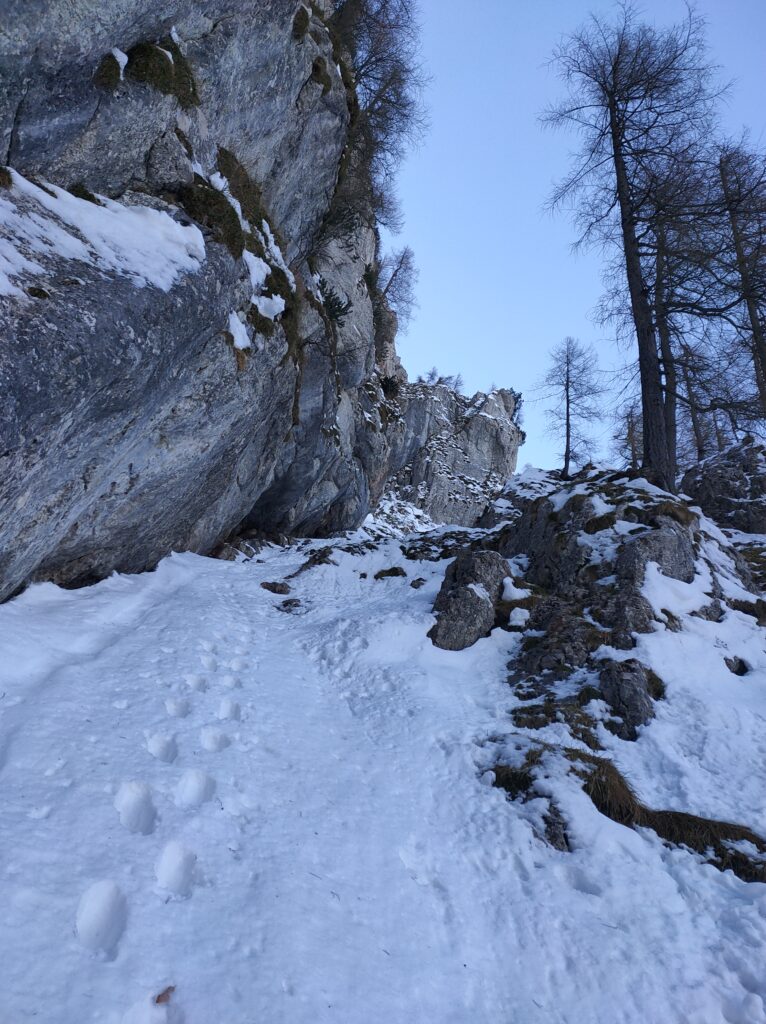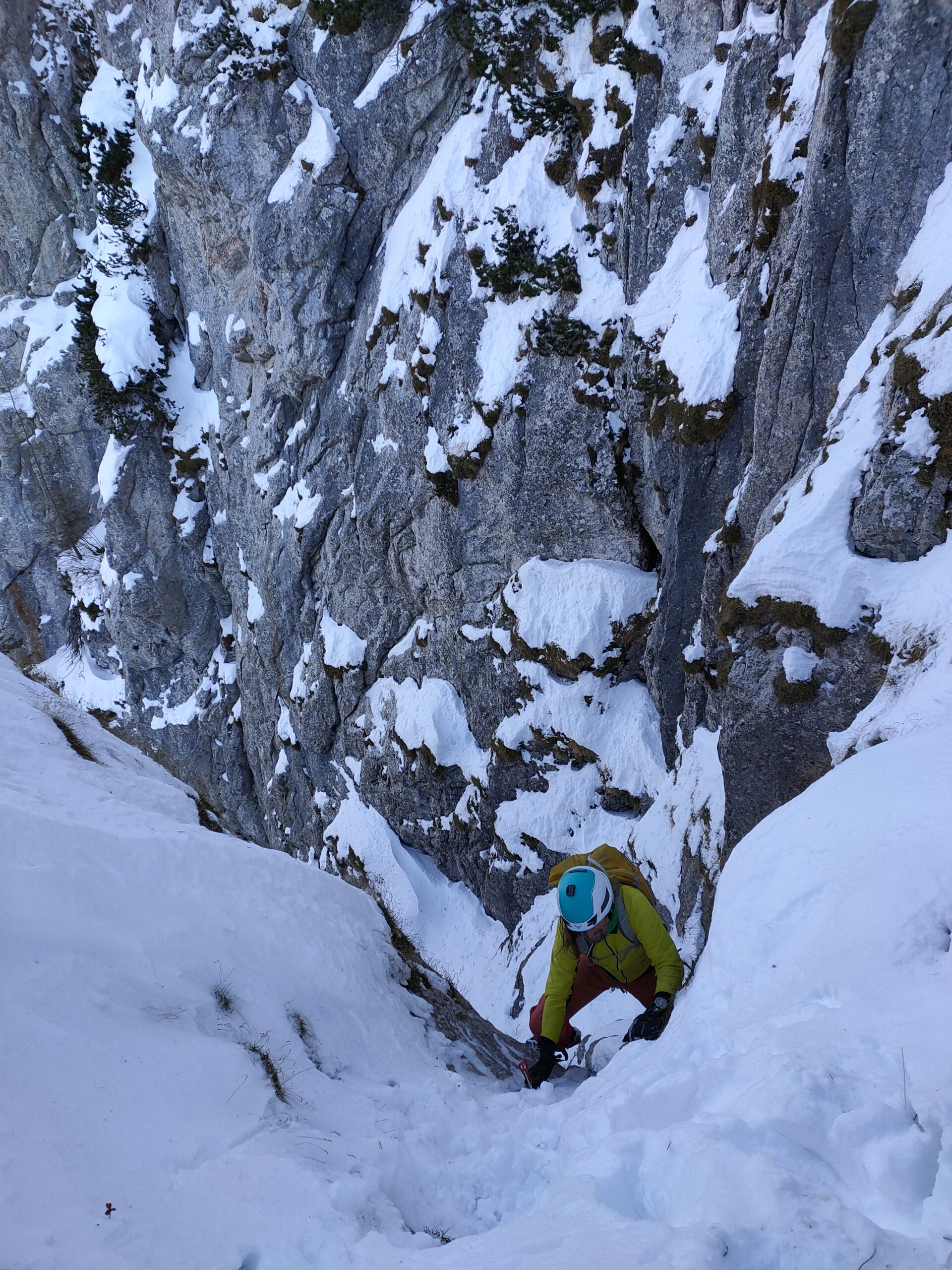 Die Föhnwolken ziehen von Norden herein, als Ben und ich auf der Sonnenseite den Hochlantsch hinaufgehen. Kaum Wind, dafür wunderbares Wintergefühl im Schnee. Oben am Gipfel ist der Wind deutlich weniger als erwartet und wir sind nicht ganz allein. Die Steigeisen hätten wir gleich beim Weggehen anziehen sollen, denn auf dem eisigen Parkplatz am Teichalmsee ist erhöhte Rutschgefahr. Jetzt schnallen wir sie auf die Bergschuhe und steigen den Jägersteig auf der Nordseite hinunter. Die ersten Schritte in das steile Gelände sind gewöhnungsbedürftig. Wir folgen einer einsamen Spur und kurz vor den beiden zu kletternden Stellen kommt uns ein Pärchen entgegen. Wir sind doch nicht allein. Der Wind im oberen Teil ist frisch, der Schnee gut gesetzt und gut zu steigen. Den Übergang zum Klettersteig einstieg verfehle ich fast. Mit Bens Untestützung finde ich zurück auf den rechten Weg nach links. Dann geht es in die Rinne neben dem Klettersteig wieder hinauf. Hier finden wir gute Spuren durch den tiefen Schnee. Der Harschdeckel ist meist nicht tragend und die Spuren erleichtern das Steigen deutlich. Die an der ersten Schlüsselstellen scheitern wir mangels guter Unterlage aus Schnee und Eis und der Fels allein vermittelt einfach nicht genug Trittsicherheit. Über das Klettersteigseil sind wir sicher unterwegs. Dazwischen pfeift immer wieder heftig der kalte Nordwind und dann scheint wieder die Sonne, einfach wunderbar. Auch kurz vor dem Ausstieg ist wieder eine heickle Stelle, die über das Seil gut geht, wir probieren es aber über die Rinne. Mit mehr Schnee und Eis wäre es lässiger, so ist es ein rechtes herumgeschiebe auf wackeligen Zacken. Oben stehen wir wieder in der Sonne und im kalten Wind. Am Rückweg machen wir noch am Kreuz am Ost“Gipfel“ halt. Die Steigeisen lassen wir bis zum Teichalmsee an. Sicher ist sicher und die Kletter und Rutschübungen am Eis des Sees machen nochmal richtig Spass.