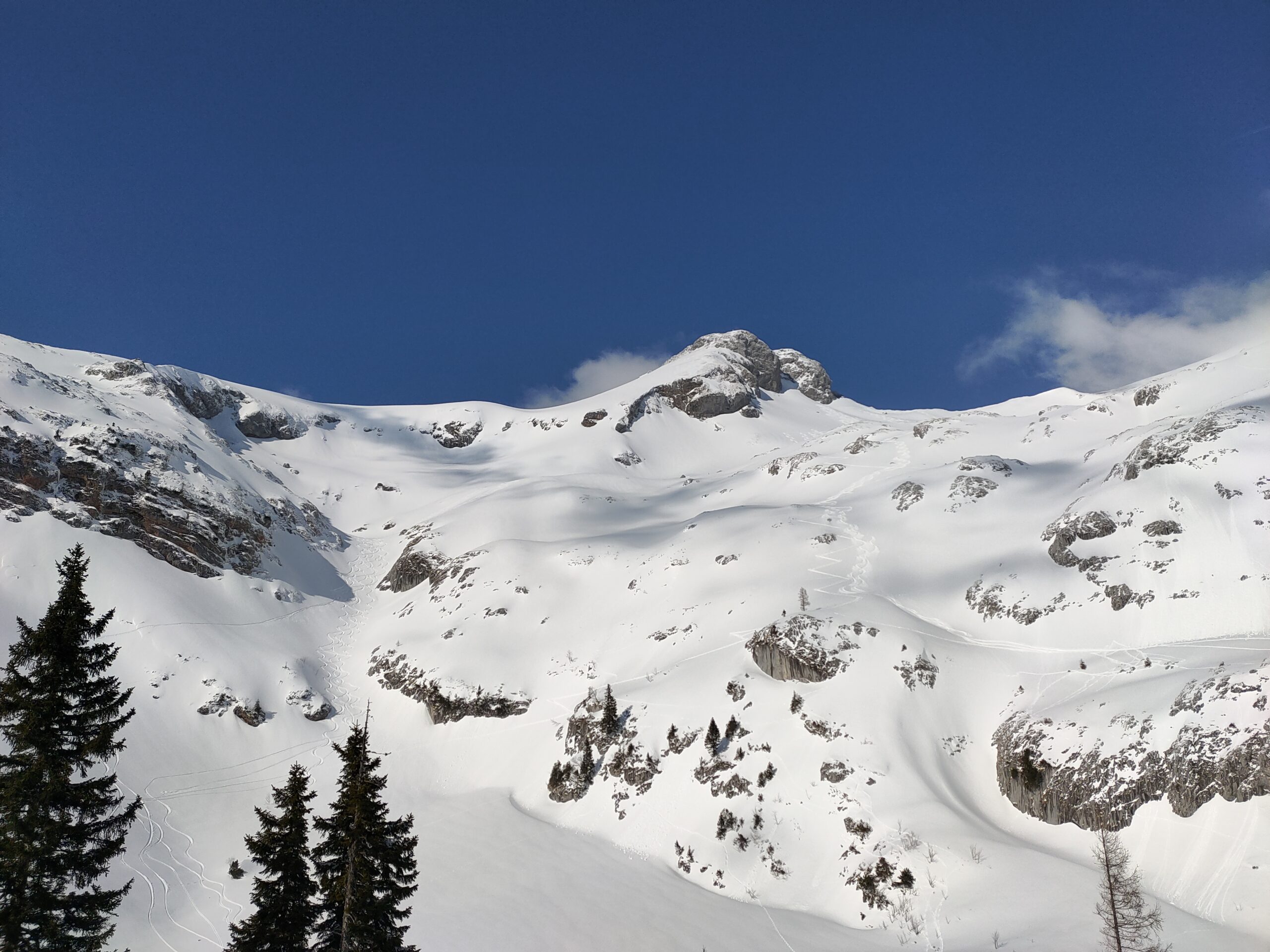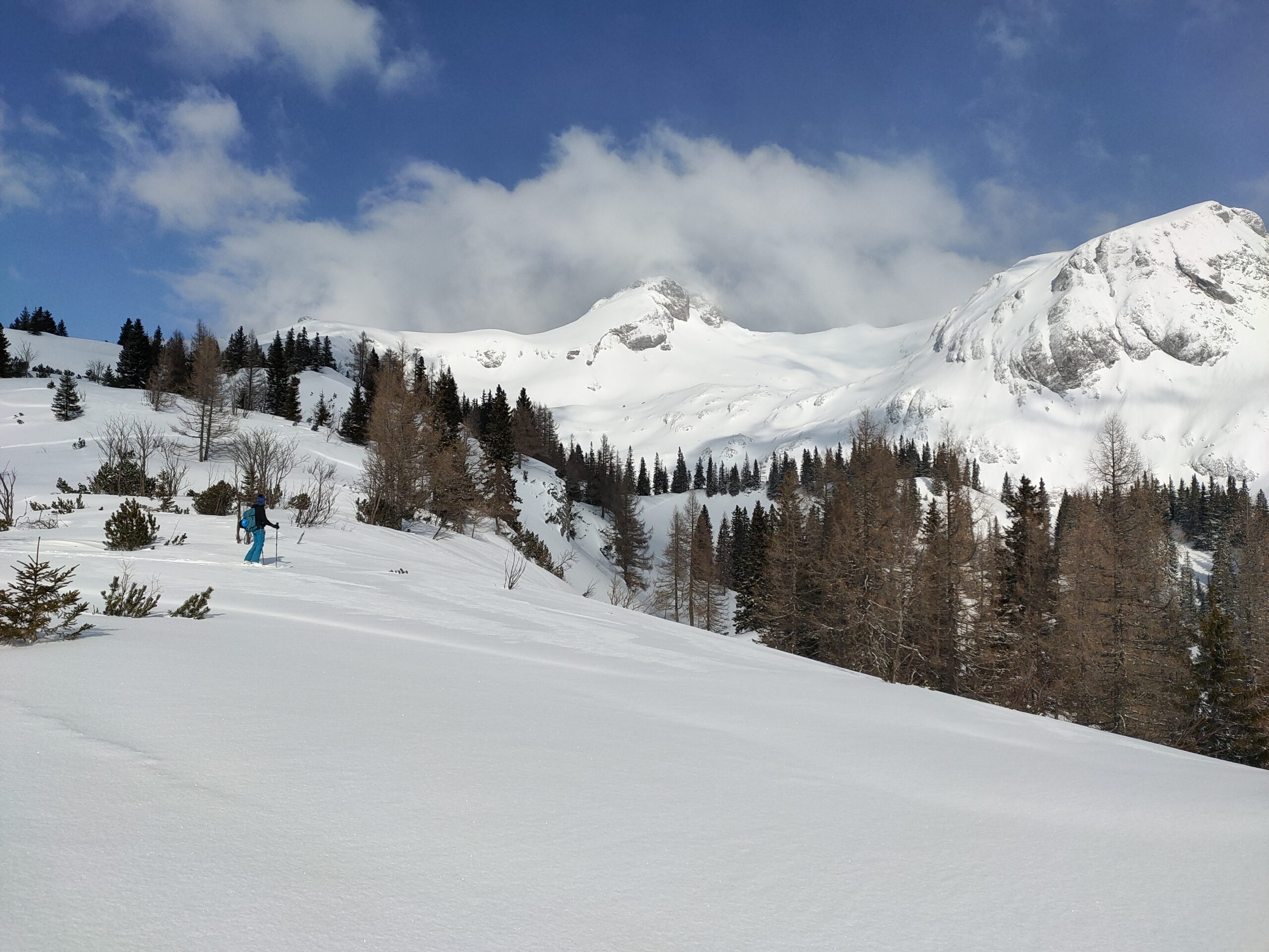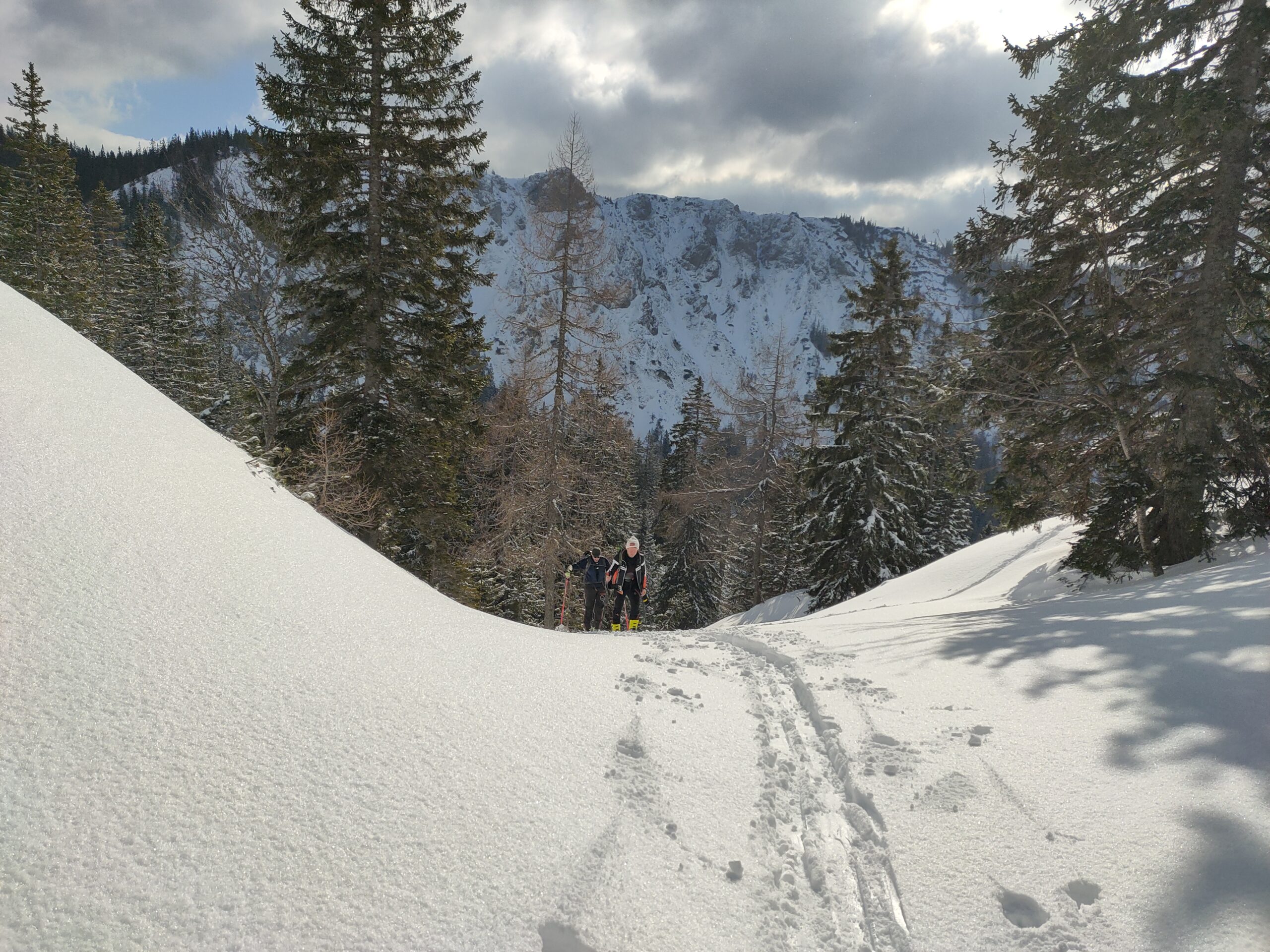 Nach 10 Tagen Skitourenabstinez mit verschiedenen Hintergründen verabreden Stefan, Peter und ich uns in Graz und treffen glücklicherweise aber nicht ganz zufällig Wolfgang am Parkautomaten in Tragöß. Ich habe heute keinen Schraubenschlüssel im Gepäck, Wolfgang hat, meine Tourenski wurden zuletzt von Marie-Theres genutzt, deshalb passen meine Schuhe nicht in die Bindung. Die Schneeketten von Stefans Auto liegen in der der Tiefgarage, geschützt vor Salz, UV-Strahlung und anderen Umwelteinflüssen und die von unserem Auto passen einfach nicht auf die breiten Dickreifen von Stefan´s. Wolfgang hat Platz im Auto und so fahren wir mit ihm die Jassing. Die Russenstraße ist im Angesichts des Krieges in der Ukraine konnotiert. Wir gehen sobald wie möglich auf den Schinderweg, der auch konnotiert ist. Gemütlich wollten wir es angehen. Nur Wolfgang ist schneller. Er wartete am Lawinengang, der ohne Rattrackspur zugeschneit mit Graupel eine Barriere für den Weiterweg darstellt. Trotz Graupel in Kniehöhe geht es mit der darunter verborgenen Spur der Tage vorher gefahrlos drüber und weiter zur Sonnschienhütte. Die Wolken verziehen sich immer mehr, der Schneefall wird zu Glitzerstimmung und das Himmelblau mit Sonnengelb verzückt. Peter und Stefan waren noch nie hier und sind beeindruckt von der Schönheit des Hochplateaus. Wir gehen weiter Richtung Murmelboden und steigen die Steilstufen hinauf zur Polsterkar. Der Schnee ist sicher und Pulver und Stefan und Peter machen Rast und fahren dann mit Treffpunkt Sonnschienalm ab, wärend ich Wolfgang hinterherhechle und er nicht sehr lange oben warten muss. Kurz vor der Scharte hört der Wind auf und es wird kochtopfartig warm, wie damals am Großvenediger. Dann geht es im Superpulver hinunter, aber nicht ganz. Wir müssen nochmal rauf und dann nochmal runter weil es sooo schön ist. Second first lines und dann hinunter in den Schlauch. Das Wetter ist noch besser geworden. Sonne in Blau mit viel frischem Weiß, dazwischen Felsen im Anraum, ein paar Gams sehr dekorativ. Winterwonderland. Zurück auf der Sonnschienalm haben wir gemütlich siebzehnhundert Höhenmeter gemacht und das Bier/Radler schmeckt. Der Wirt ist überfordert von der vollen Gaststube. Bei der Abfahrt in die Jassing sucht Wolfgang jeden Pulvermeter im steilen Wald. Stefan und Peter nicht mehr jeden und ich bin zu fertig um die konnotierte Russenstrasse zu verlassen.
