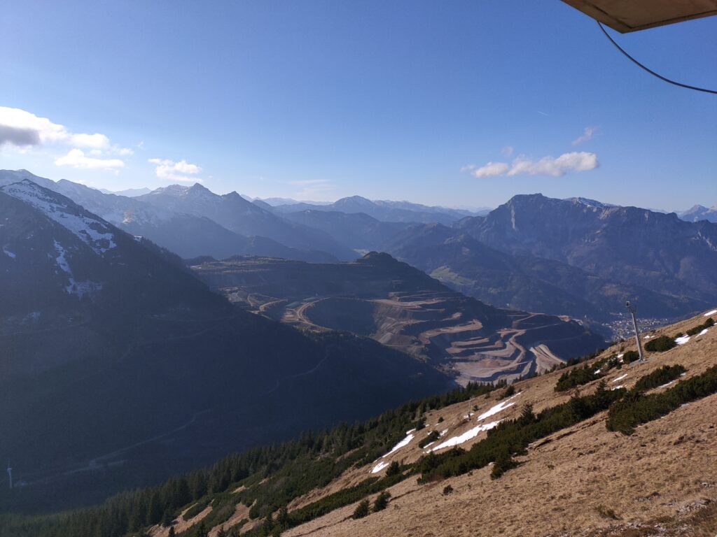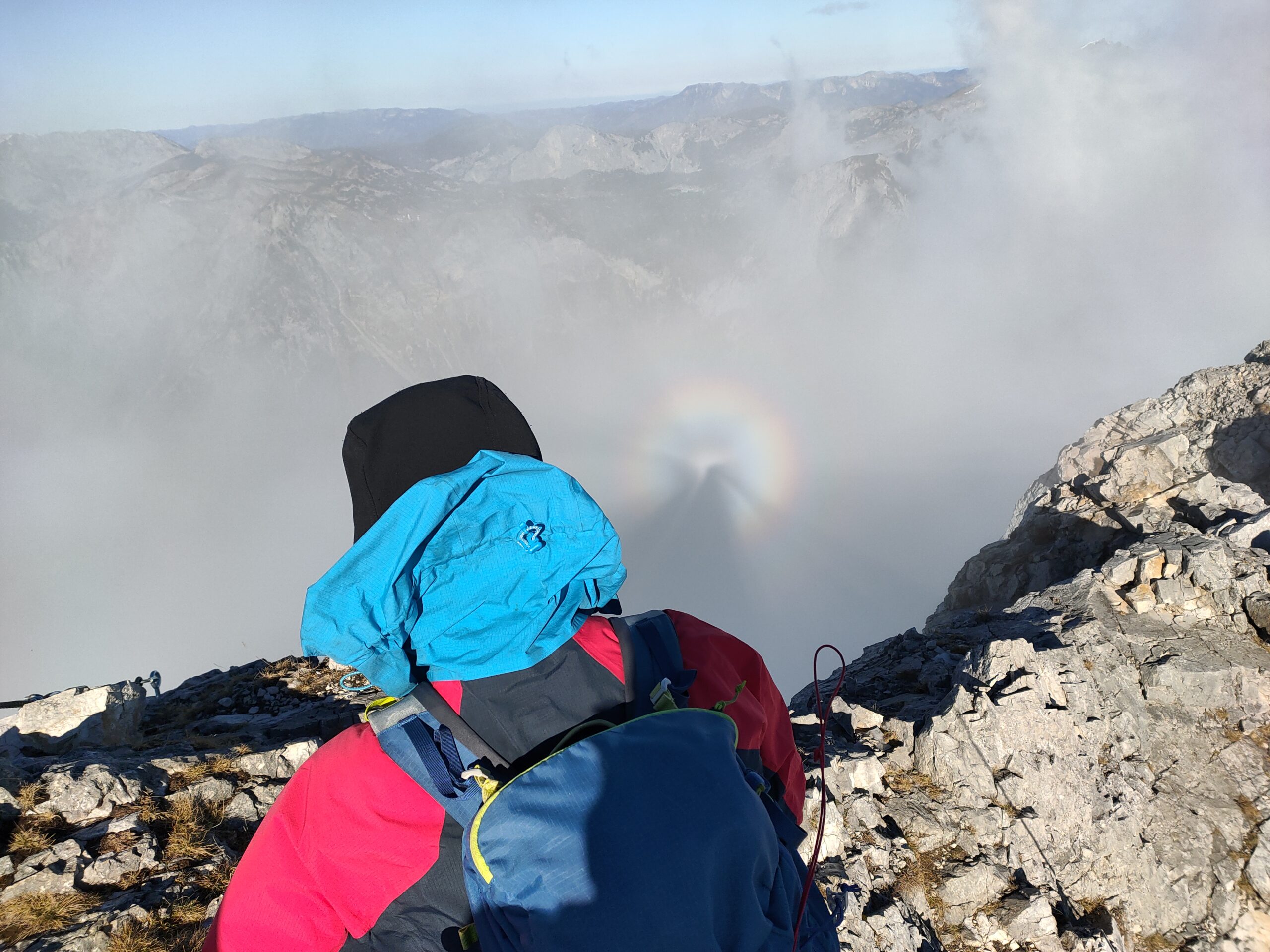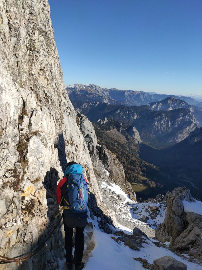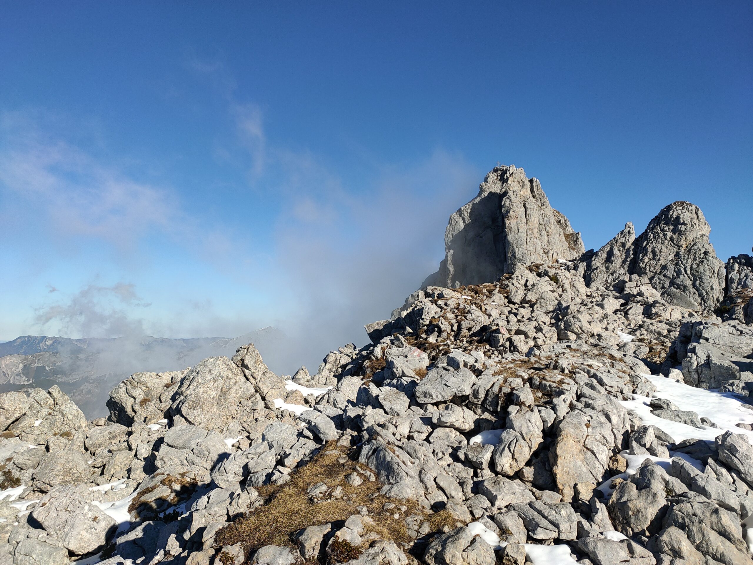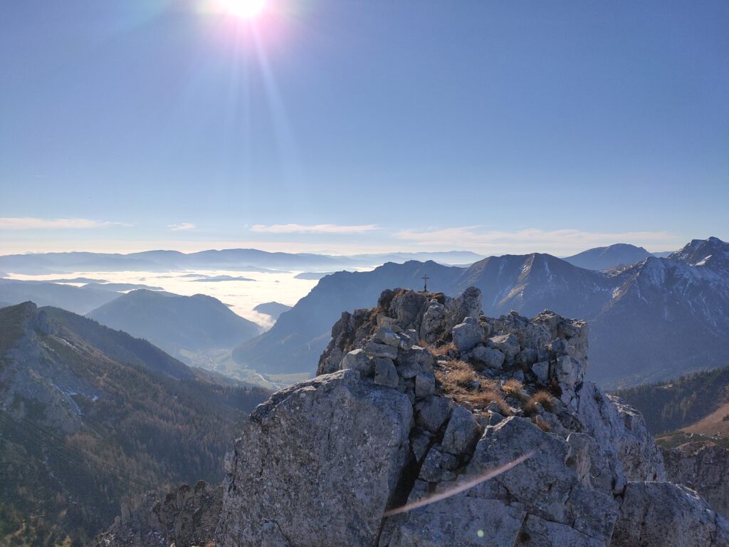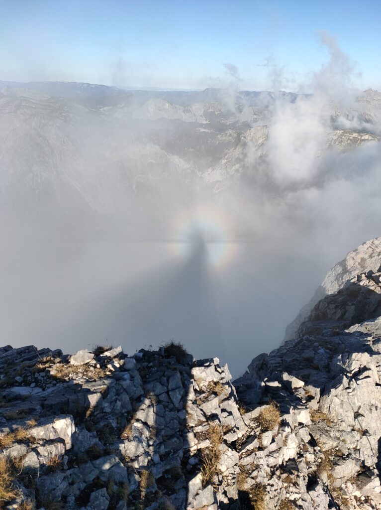 Wolfgang und ich nutzen den herrliche Tag für eine Bergetour vom Präbichl aus. Der Wind pfeift am Sattel und die Wolken und Nebelfetzen bläst es nach Norden über den Pass. Wir sind vorbereitet. Um halb neuen starten wir vom Parkplatz und steigen den Knappensteig hinauf zur Leobnerhütte. Dort helfen wir den Hüttenleuten den Fahnenmast abzubauen und im Gastraum unterzubringen. Dann geht es hinauf in den Hirscheggsattel. Im Sattel bläst wieder heftig der Wind, der erst wieder schwächer wird als wir auf der Nordseite, vorbei am Fledermausgrat aufsteigen. Die Vordernberger Griesmauer lassen wir noch rechts liegen und steigen durch Geröll und Schnee zum Einstieg des Steigs auf die TAC-Spitze. Die erste Querung ist heute durch den harten Schnee rutschig, aber mit dem Sicherungsseil ist es problemlos. Der Rest des Aufstiegs zum Gipfel ist steil aber recht einfach. Das schaut mit Schnee und Eis sicher anders aus. Am Gipfel erwartet uns dann ein herrliches Schauspiel aus Wolken, Wind und Sonnen. Mit der Sonne im Rücken entsteht vor uns ein Regenbogenkreis mit uns als Schatten im Zentrum. Bis hinüber zur Frauenmauer bläst der Wind immer wieder Wolkenfetzen um die Gipfel. Die Berge rundherum sind zum Greifen nah. Wir bleiben nicht lange, schauen uns aber die Skiabfahrten rundherum an, dann geht es weiter zur Vordernberger Griesmauer. Auch da sind wir wieder allein am Gipfel. Mittlerweile steigen noch einige vom Sattel herauf. Nachdem Wolfgang am Gipfel entdeckt, dass der eigentliche Gipfel der Griesmauer einige Meter höher ist, steigen wir auch noch auf diesen. Auf dem Rückweg zum Hirscheggsattel sehen wir eine Dreierseilschaft, die sich beim kalten Südfön den Fledermausgrat hinaufarbeitet und sind froh im Lee abzusteigen. Und weil es so schön ist, nehmen wir auf dem Rückweg noch den Polstergipfel mit.