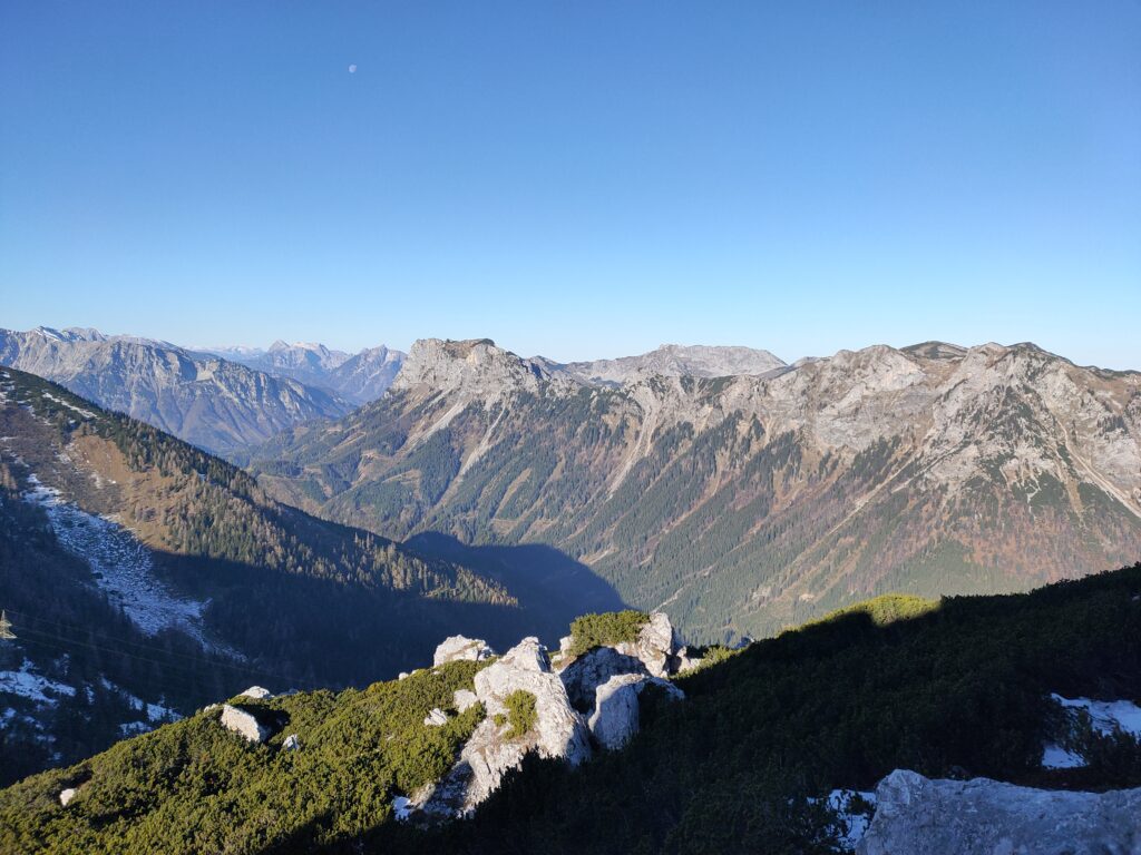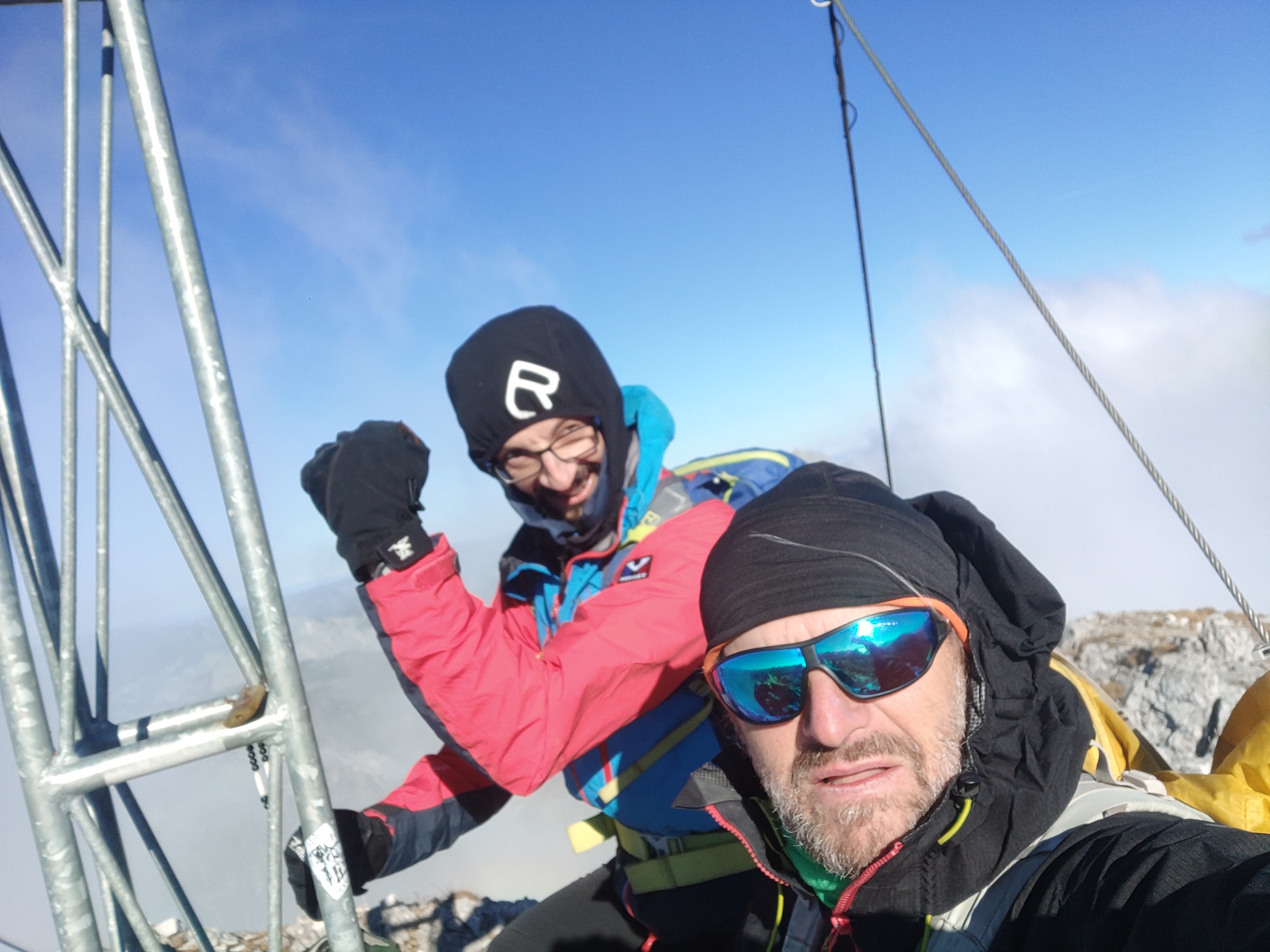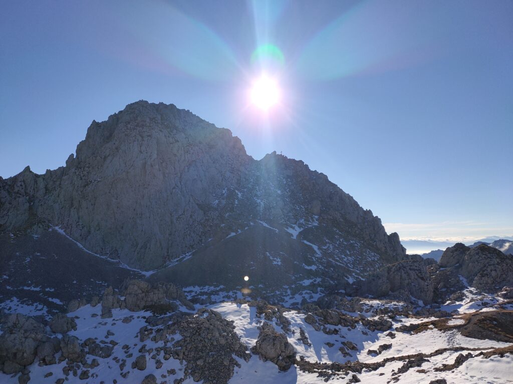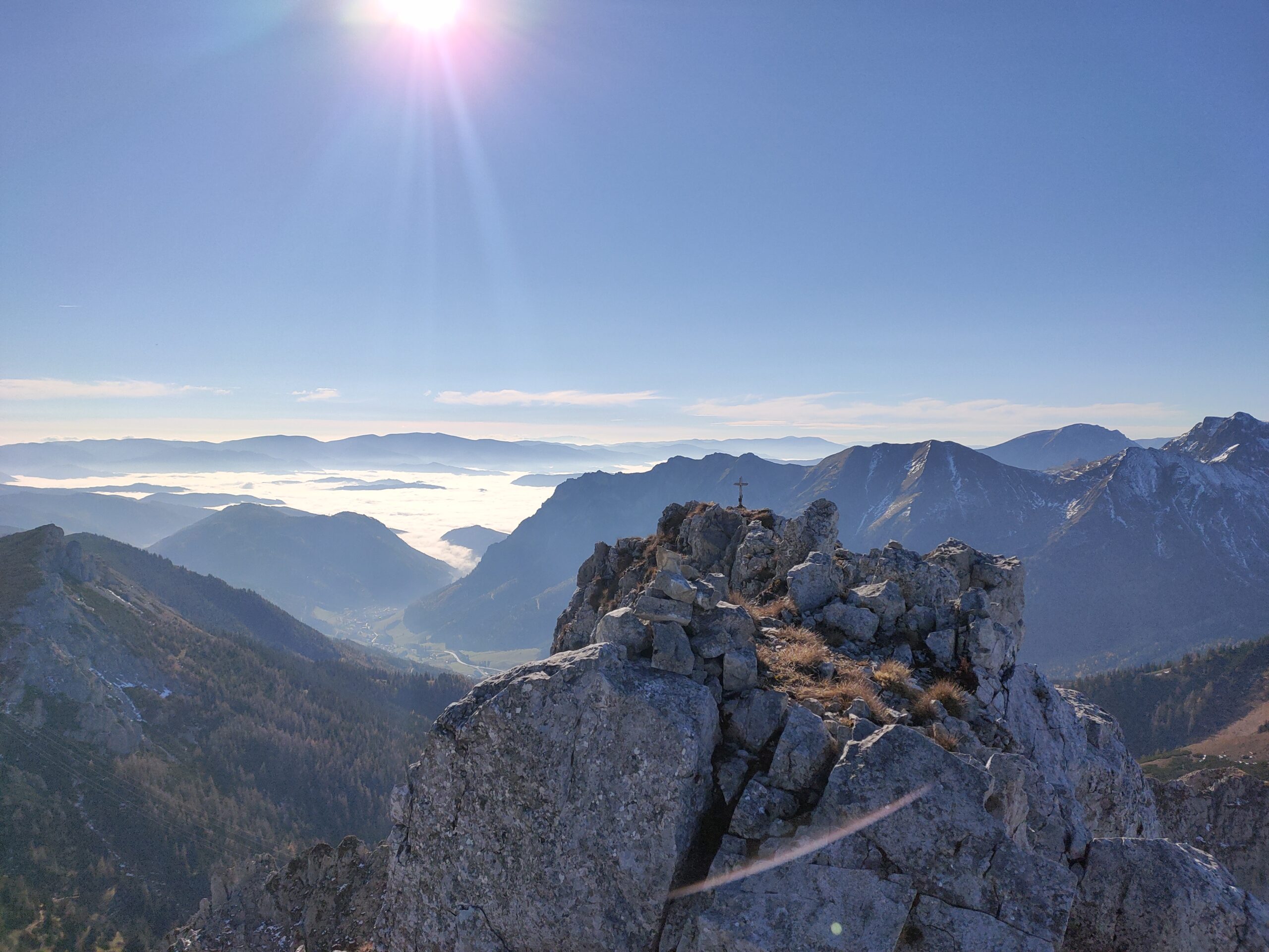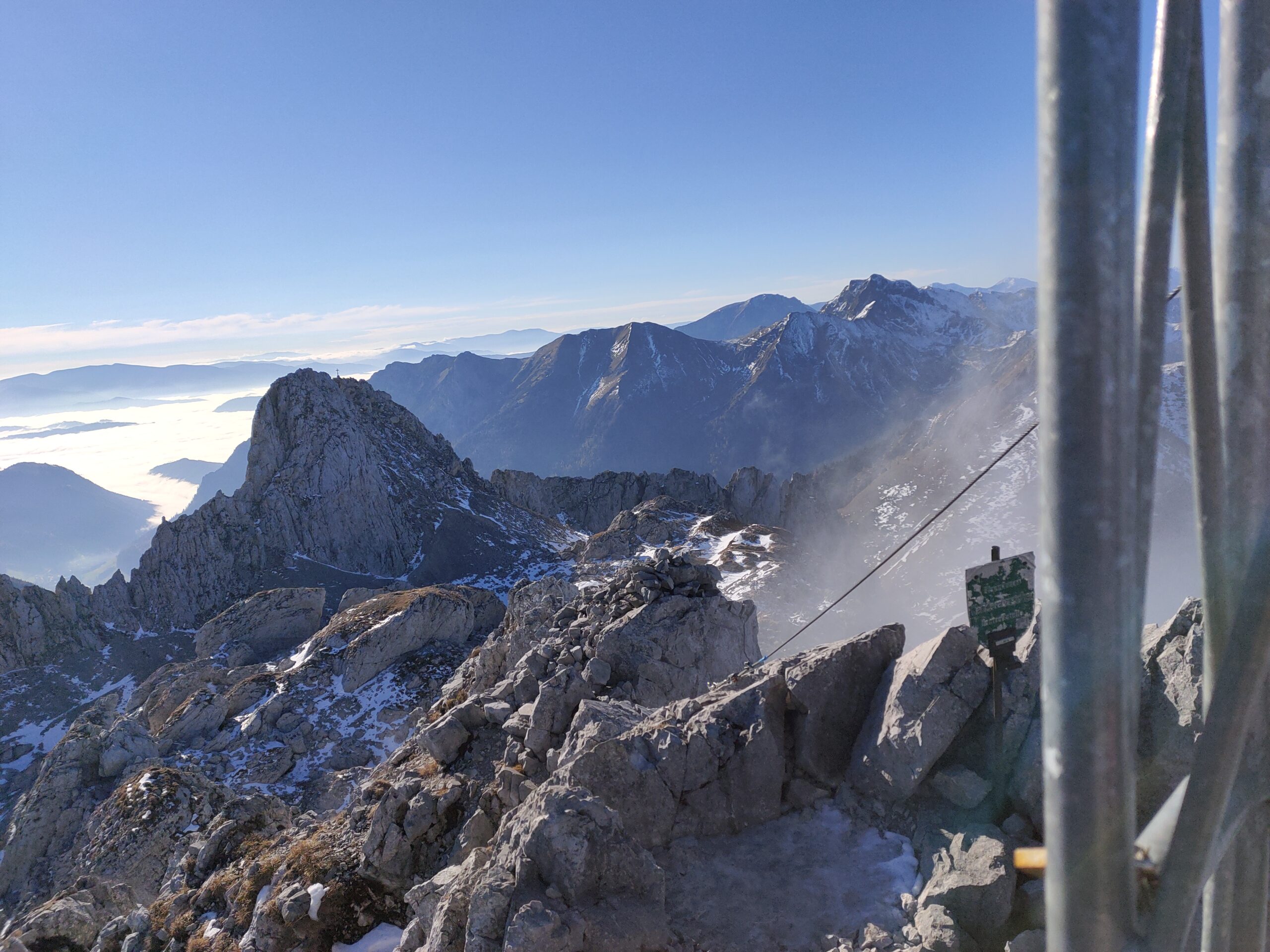Wolfgang und ich nutzen den herrliche Tag für eine Bergetour vom Präbichl aus. Der Wind pfeift am Sattel und die Wolken und Nebelfetzen bläst es nach Norden über den Pass. Wir sind vorbereitet. Um halb neuen starten wir vom Parkplatz und steigen den Knappensteig hinauf zur Leobnerhütte. Dort helfen wir den Hüttenleuten den Fahnenmast abzubauen und im Gastraum unterzubringen. Dann geht es hinauf in den Hirscheggsattel. Im Sattel bläst wieder heftig der Wind, der erst wieder schwächer wird als wir auf der Nordseite, vorbei am Fledermausgrat aufsteigen. Die Vordernberger Griesmauer lassen wir noch rechts liegen und steigen durch Geröll und Schnee zum Einstieg des Steigs auf die TAC-Spitze. Die erste Querung ist heute durch den harten Schnee rutschig, aber mit dem Sicherungsseil ist es problemlos. Der Rest des Aufstiegs zum Gipfel ist steil aber recht einfach. Das schaut mit Schnee und Eis sicher anders aus. Am Gipfel erwartet uns dann ein herrliches Schauspiel aus Wolken, Wind und Sonnen. Mit der Sonne im Rücken entsteht vor uns ein Regenbogenkreis mit uns als Schatten im Zentrum. Bis hinüber zur Frauenmauer bläst der Wind immer wieder Wolkenfetzen um die Gipfel. Die Berge rundherum sind zum Greifen nah. Wir bleiben nicht lange, schauen uns aber die Skiabfahrten rundherum an, dann geht es weiter zur Vordernberger Griesmauer. Auch da sind wir wieder allein am Gipfel. Mittlerweile steigen noch einige vom Sattel herauf. Nachdem Wolfgang am Gipfel entdeckt, dass der eigentliche Gipfel der Griesmauer einige Meter höher ist, steigen wir auch noch auf diesen. Auf dem Rückweg zum Hirscheggsattel sehen wir eine Dreierseilschaft, die sich beim kalten Südfön den Fledermausgrat hinaufarbeitet und sind froh im Lee abzusteigen. Und weil es so schön ist, nehmen wir auf dem Rückweg noch den Polstergipfel mit.